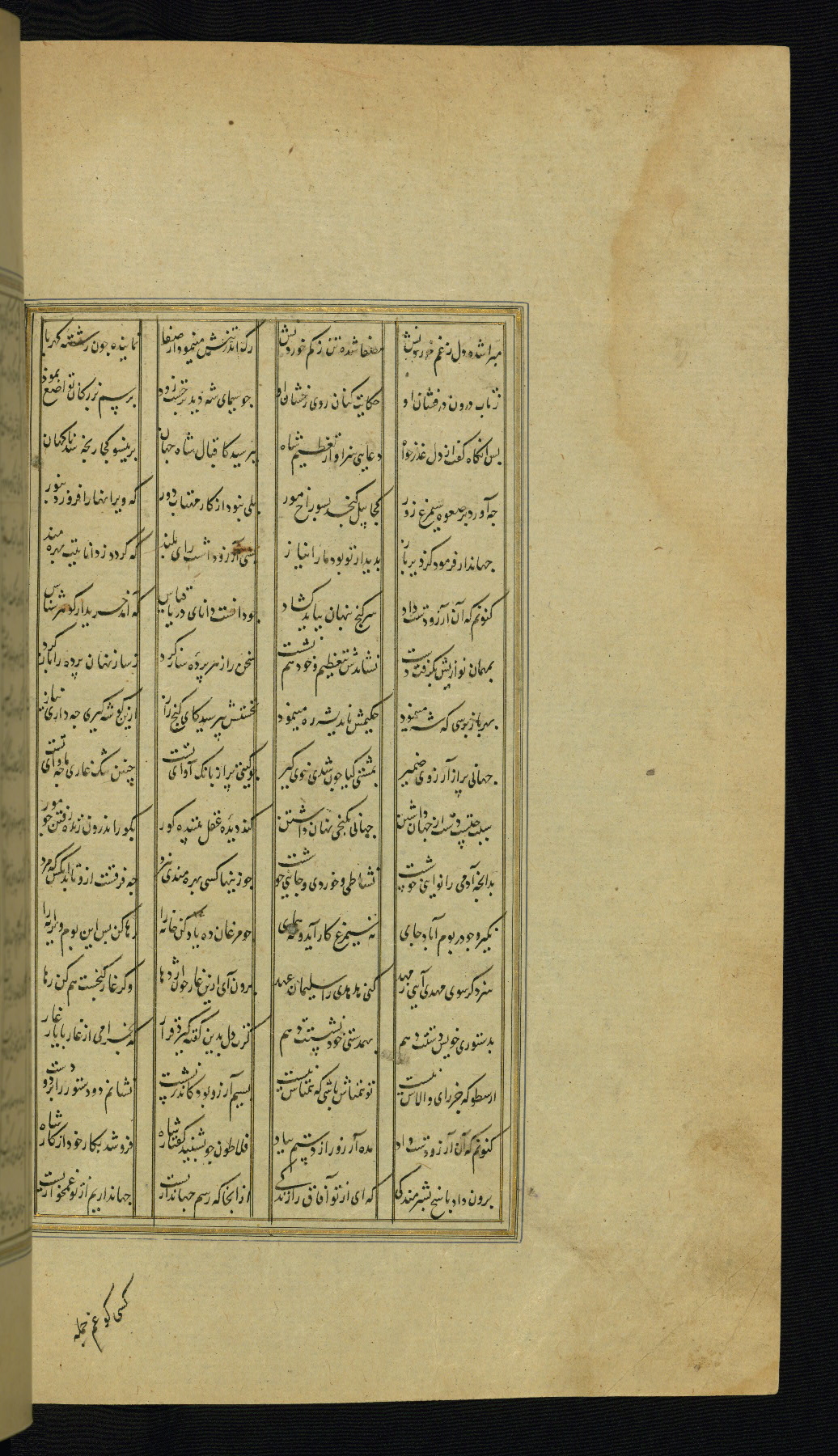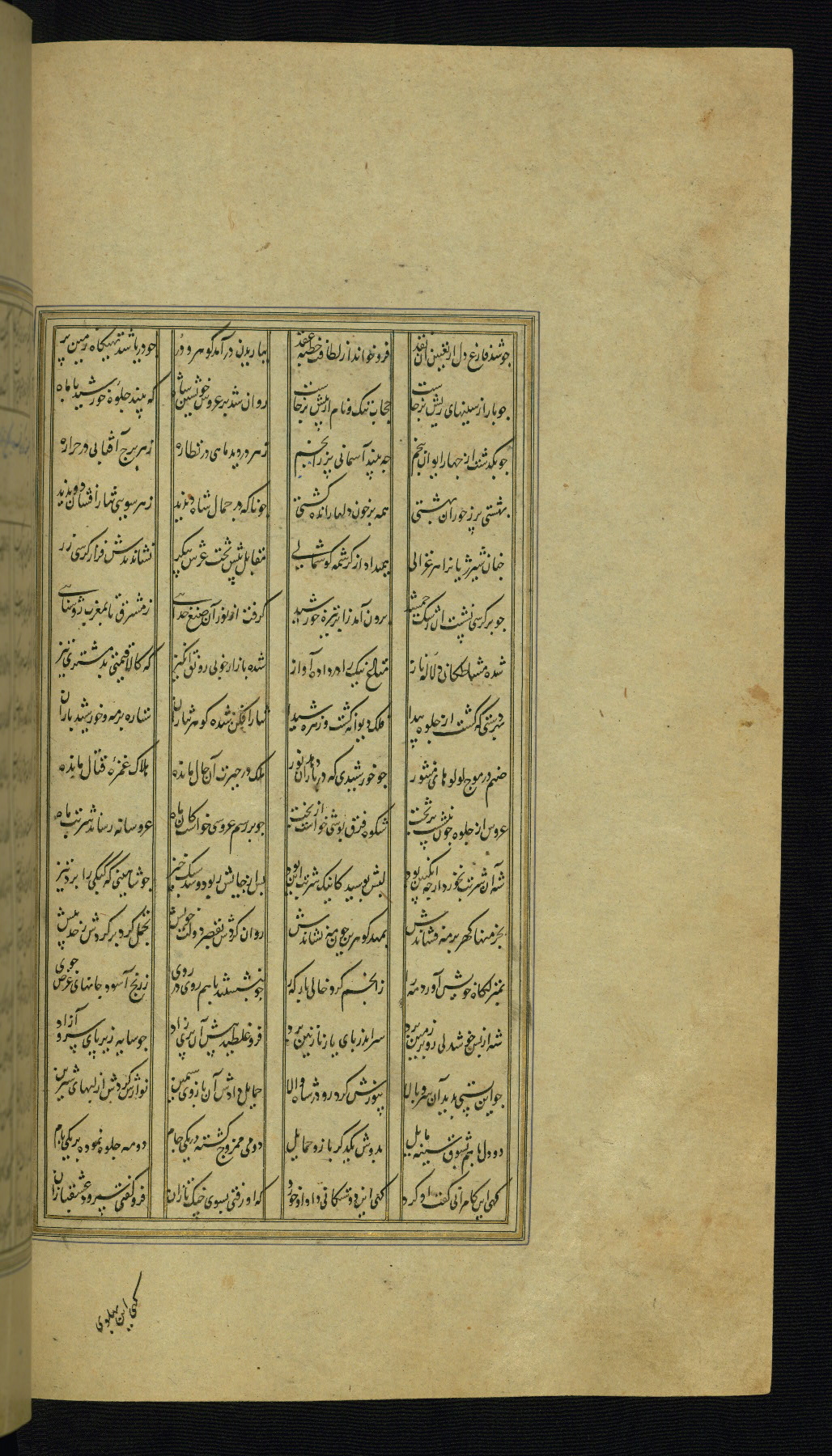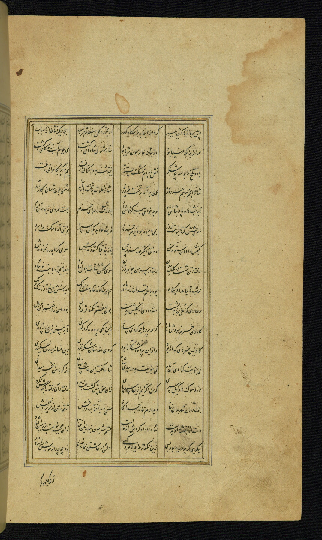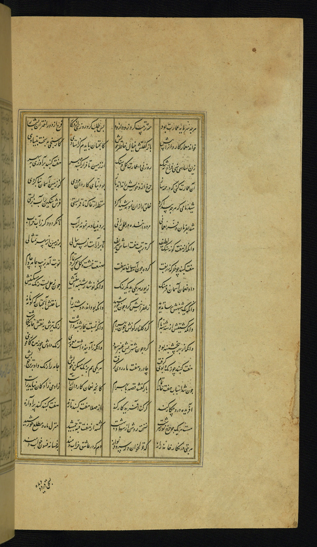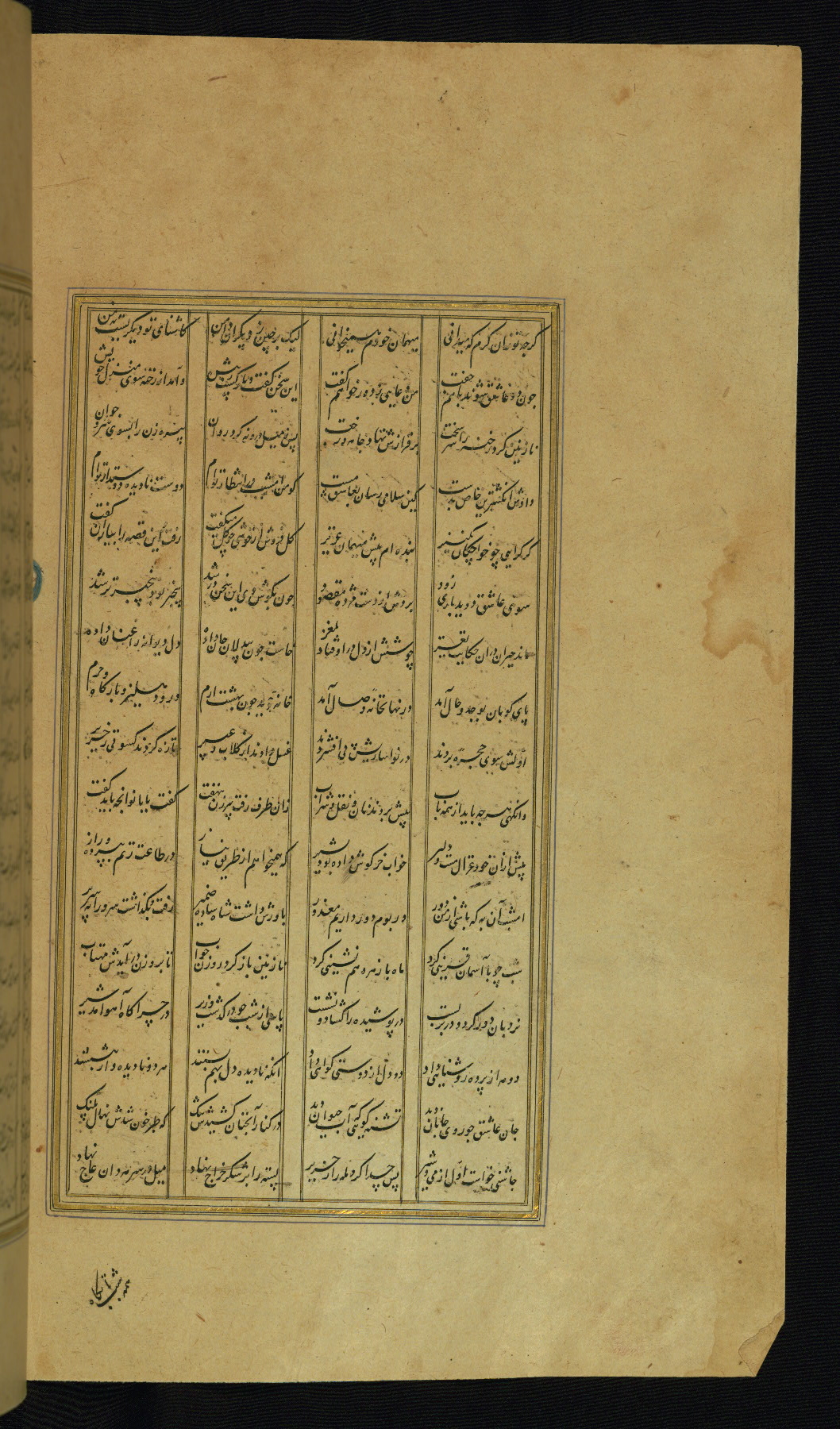 This is an illustrated and illuminated Safavid copy of the Khamsah (quintet) of Amīr Khusraw Dihlavī (d. 725 AH / 1325 CE), written by Pīr Ḥusayn al-Kātib al-Shīrāzī in 935 AH / 1529 CE. The codex opens with a double-page illuminated frontispiece with verses in honor of the poet Mir (Amir) Khusraw (fols. 1b-2a). There are four illuminated incipit pages introducing the individual poems, and thirteen paintings illustrate the text. The lacquer binding, which is not original to the manuscript, has a hunting scene on the upper and lower boards. The lower board is inscribed yā Shāh Najaf (oh, King of Najaf, i.e. ʿAlī) and is dated 1271 AH / 1854 CE.