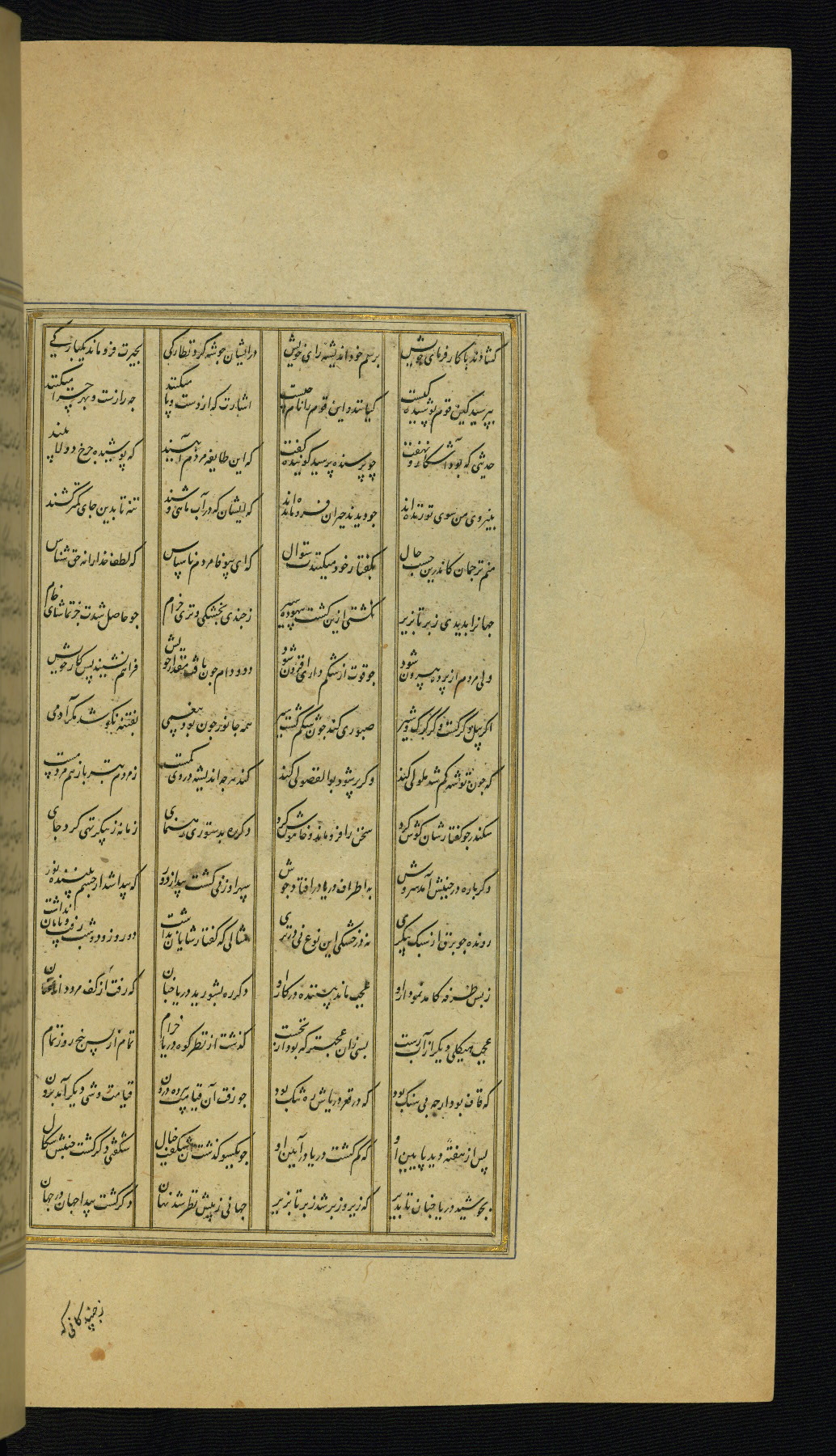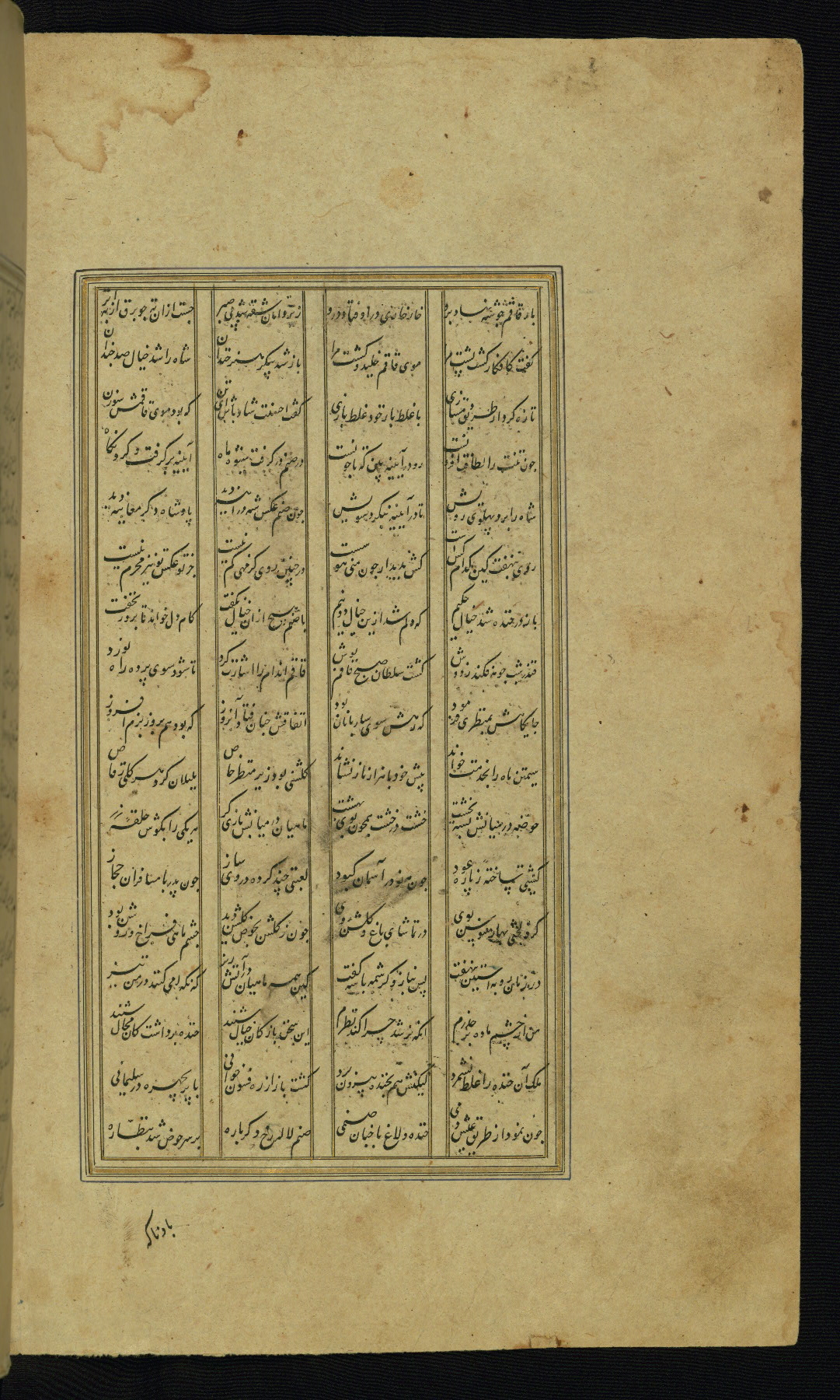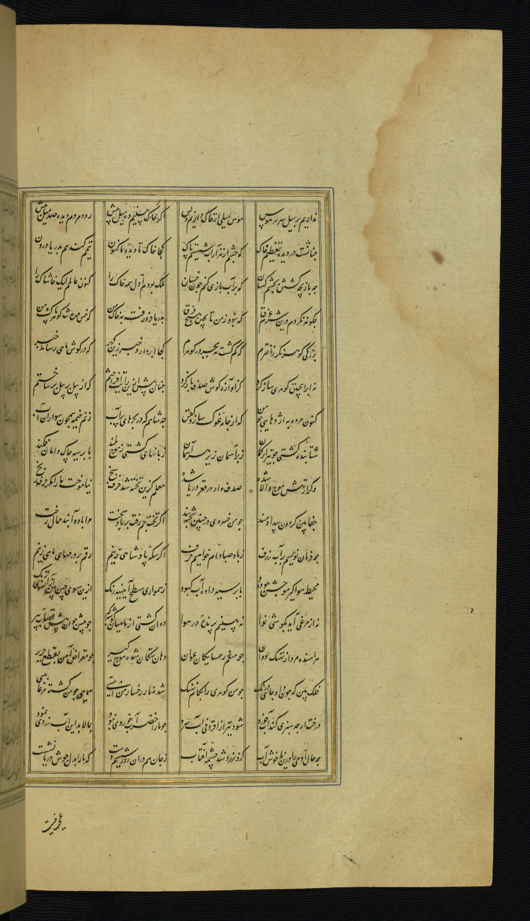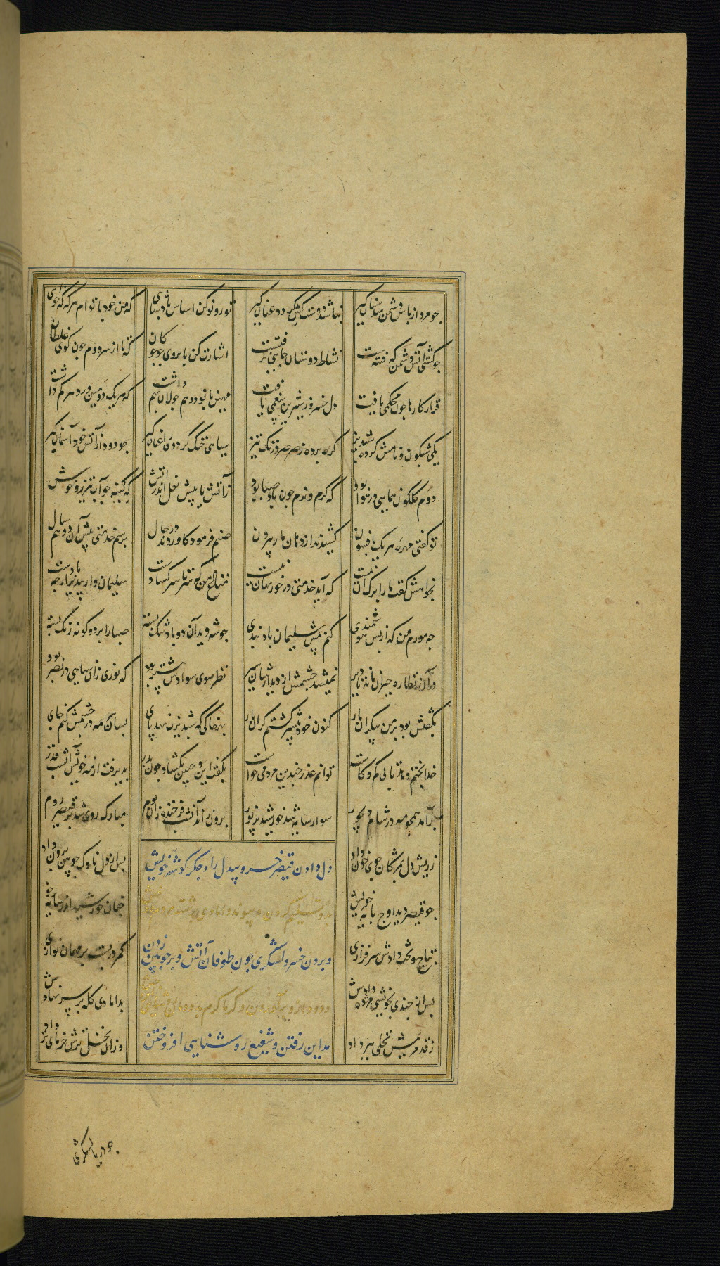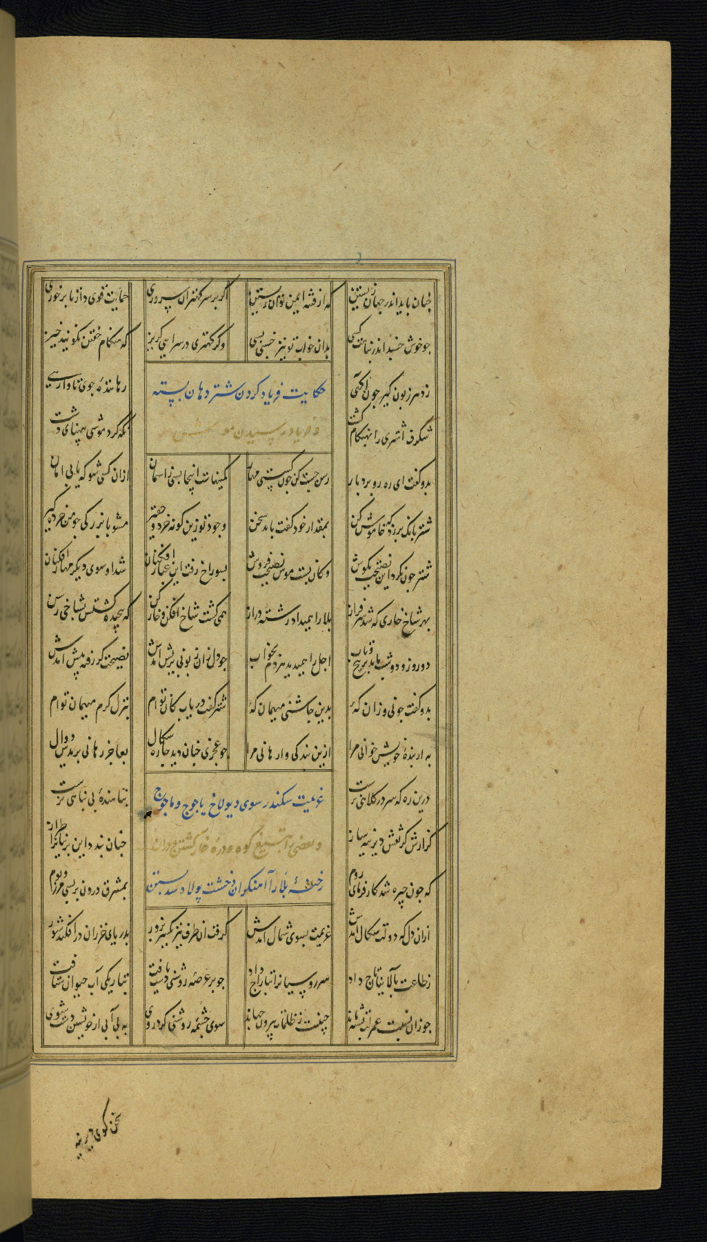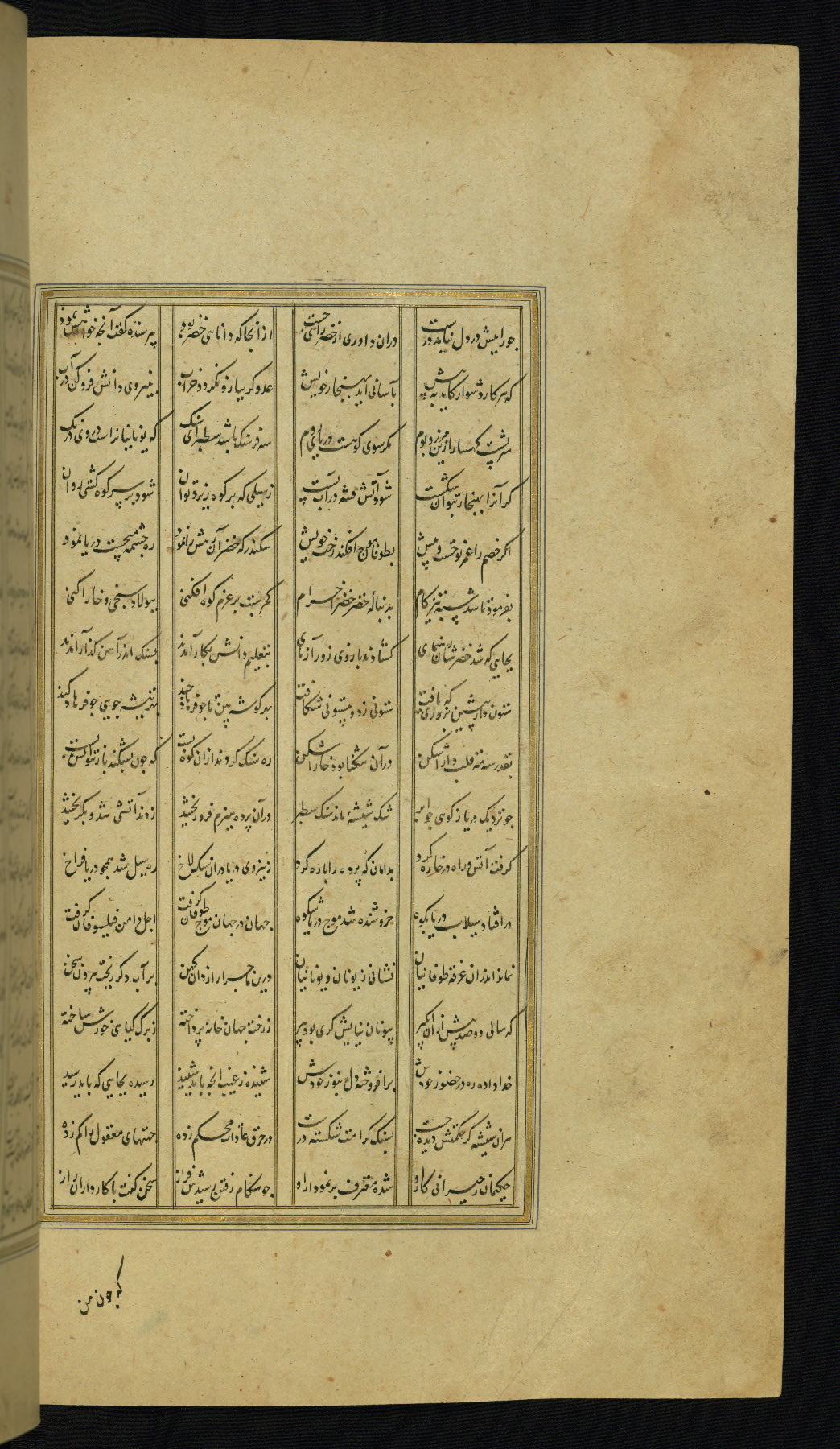 This is an illustrated and illuminated Safavid copy of the Khamsah (quintet) of Amīr Khusraw Dihlavī (d. 725 AH / 1325 CE), written by Pīr Ḥusayn al-Kātib al-Shīrāzī in 935 AH / 1529 CE. The codex opens with a double-page illuminated frontispiece with verses in honor of the poet Mir (Amir) Khusraw (fols. 1b-2a). There are four illuminated incipit pages introducing the individual poems, and thirteen paintings illustrate the text. The lacquer binding, which is not original to the manuscript, has a hunting scene on the upper and lower boards. The lower board is inscribed yā Shāh Najaf (oh, King of Najaf, i.e. ʿAlī) and is dated 1271 AH / 1854 CE.