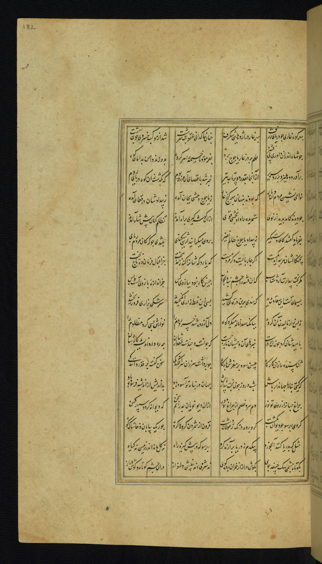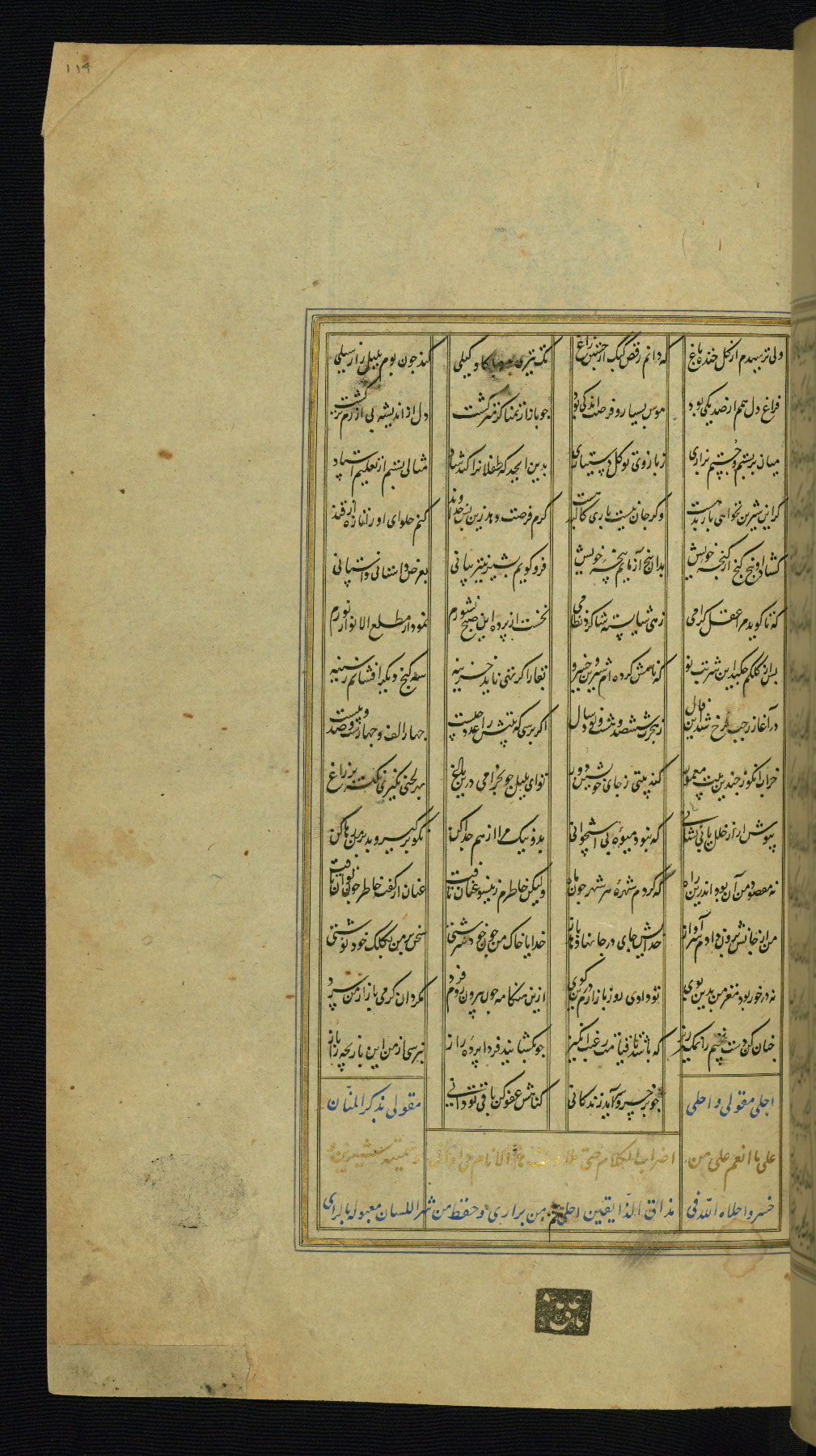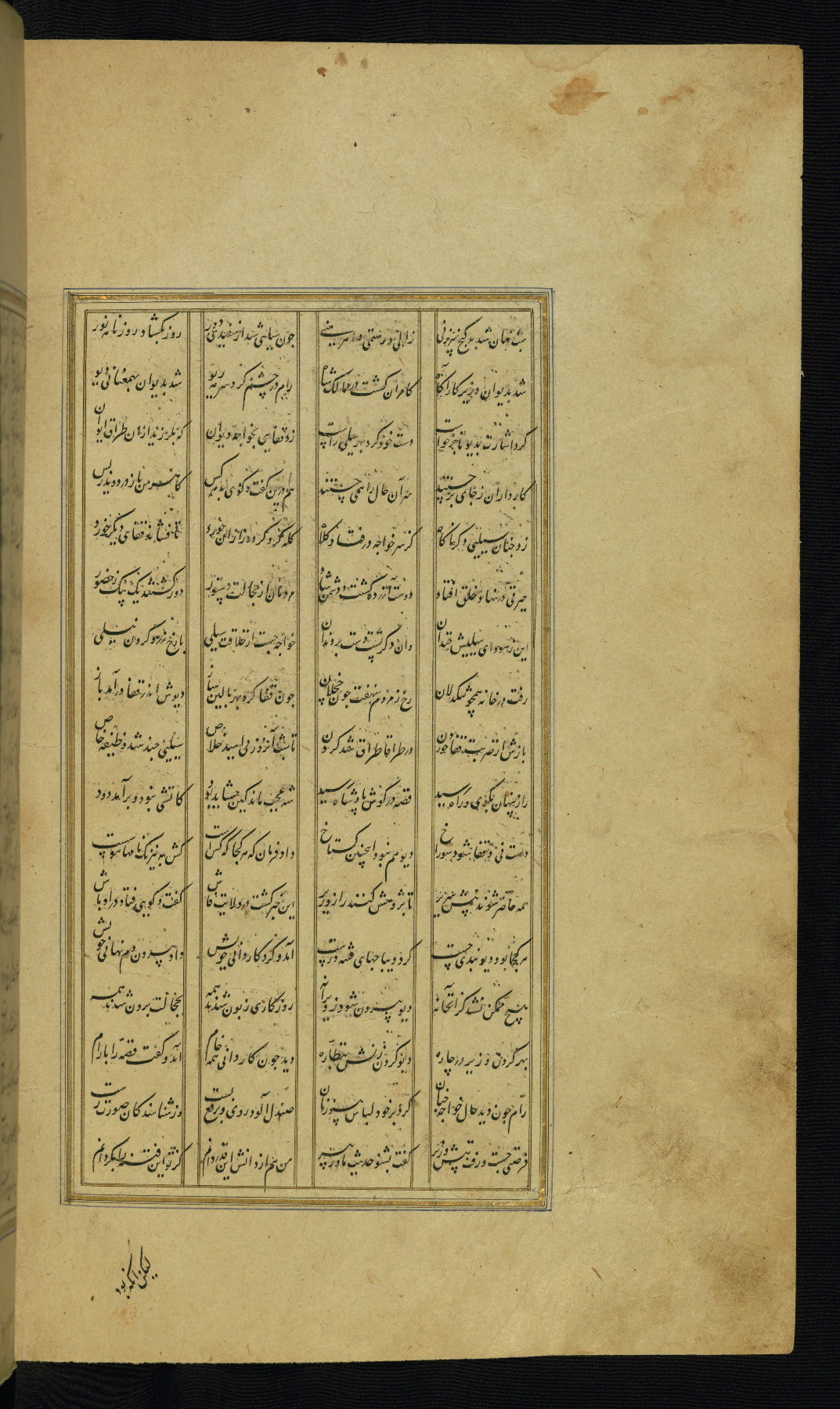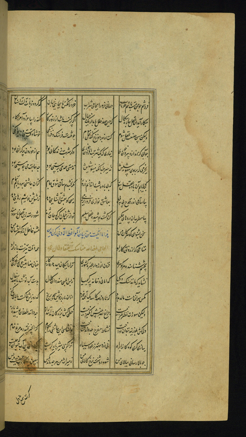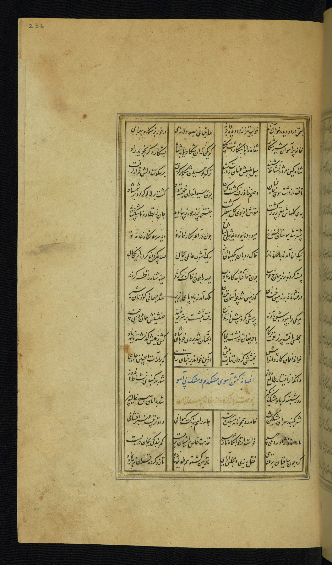This is an illustrated and illuminated Safavid copy of the Khamsah (quintet) of Amīr Khusraw Dihlavī (d. 725 AH / 1325 CE), written by Pīr Ḥusayn al-Kātib al-Shīrāzī in 935 AH / 1529 CE. The codex opens with a double-page illuminated frontispiece with verses in honor of the poet Mir (Amir) Khusraw (fols. 1b-2a). There are four illuminated incipit pages introducing the individual poems, and thirteen paintings illustrate the text. The lacquer binding, which is not original to the manuscript, has a hunting scene on the upper and lower boards. The lower board is inscribed yā Shāh Najaf (oh, King of Najaf, i.e. ʿAlī) and is dated 1271 AH / 1854 CE.