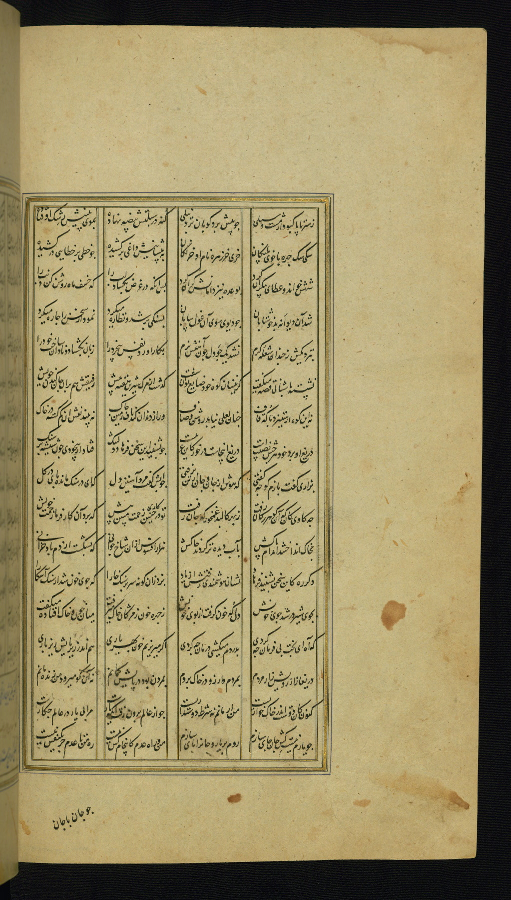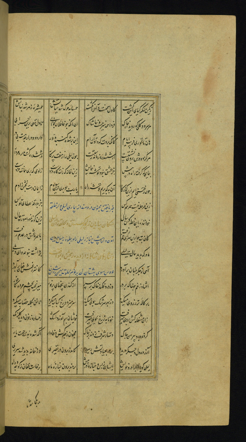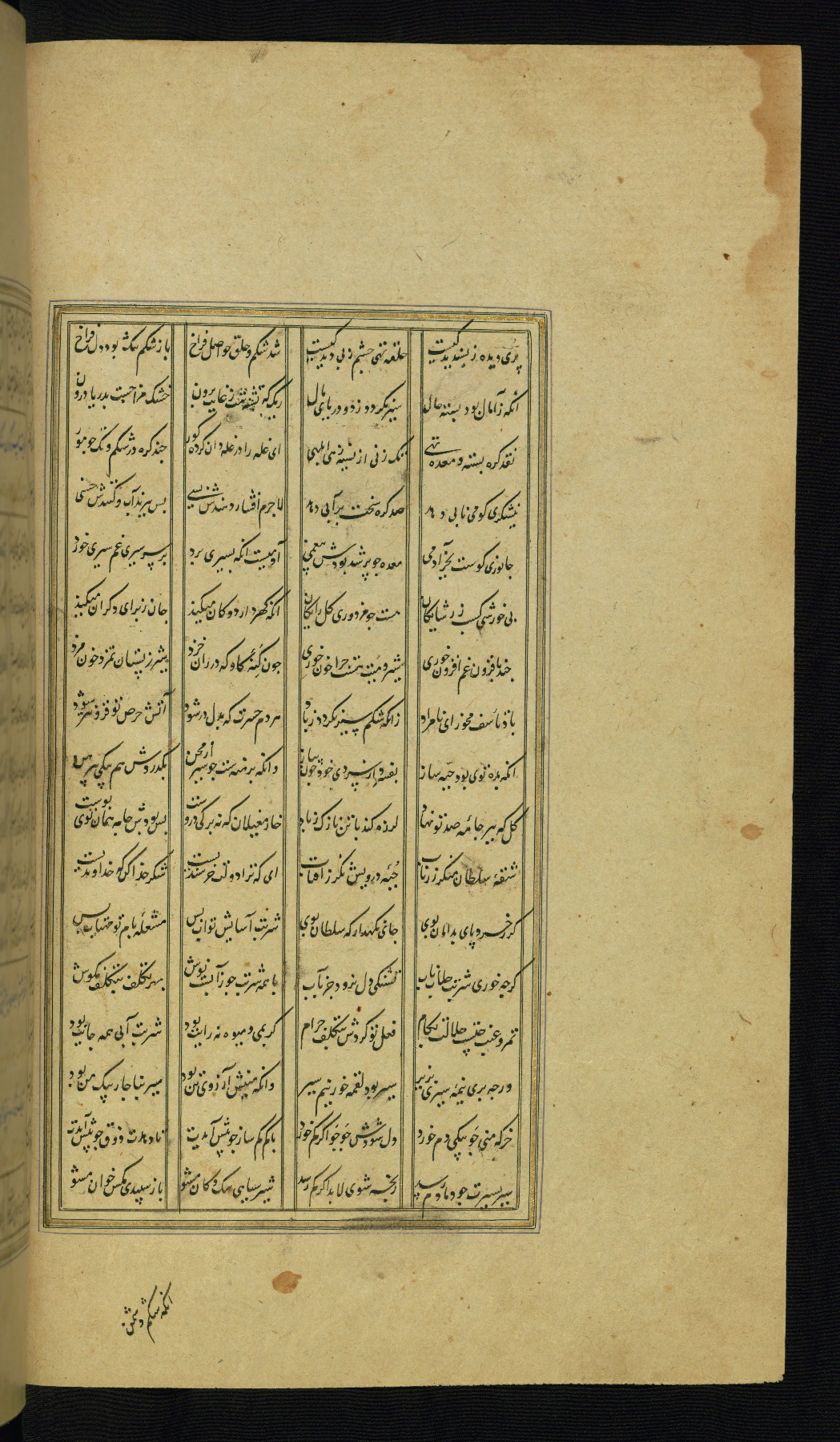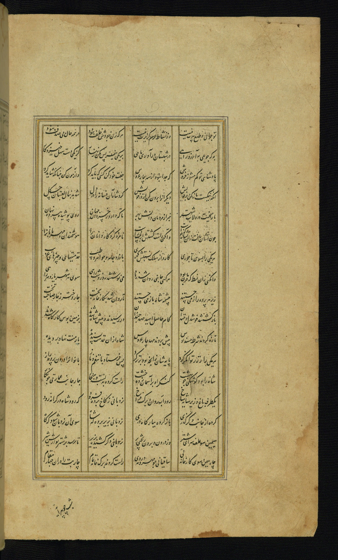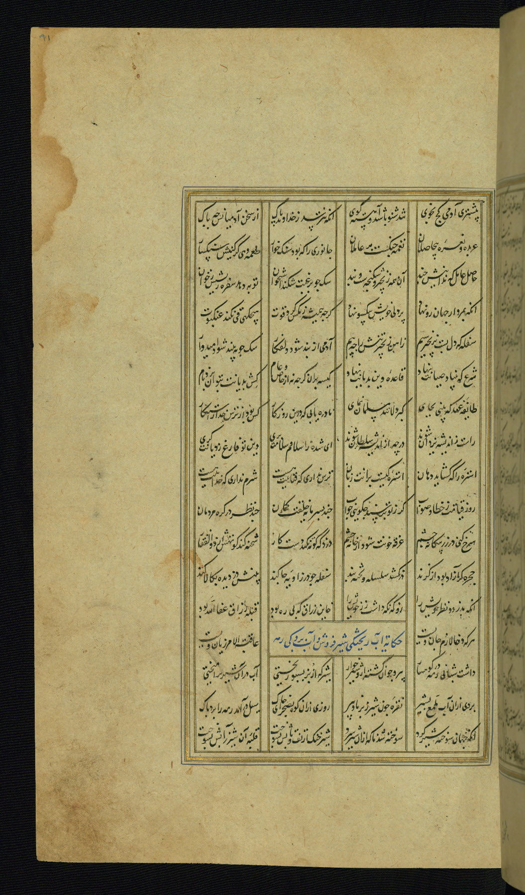 This is an illustrated and illuminated Safavid copy of the Khamsah (quintet) of Amīr Khusraw Dihlavī (d. 725 AH / 1325 CE), written by Pīr Ḥusayn al-Kātib al-Shīrāzī in 935 AH / 1529 CE. The codex opens with a double-page illuminated frontispiece with verses in honor of the poet Mir (Amir) Khusraw (fols. 1b-2a). There are four illuminated incipit pages introducing the individual poems, and thirteen paintings illustrate the text. The lacquer binding, which is not original to the manuscript, has a hunting scene on the upper and lower boards. The lower board is inscribed yā Shāh Najaf (oh, King of Najaf, i.e. ʿAlī) and is dated 1271 AH / 1854 CE.