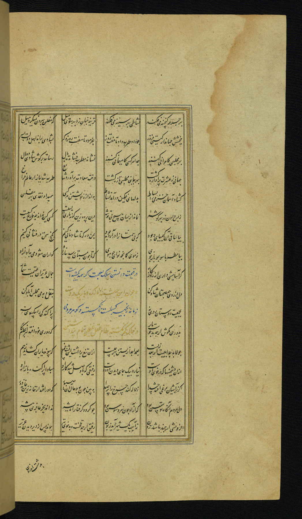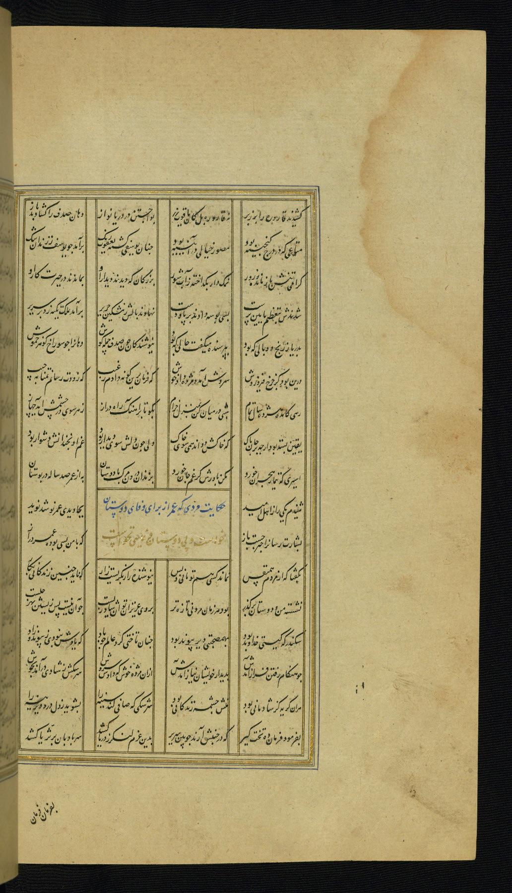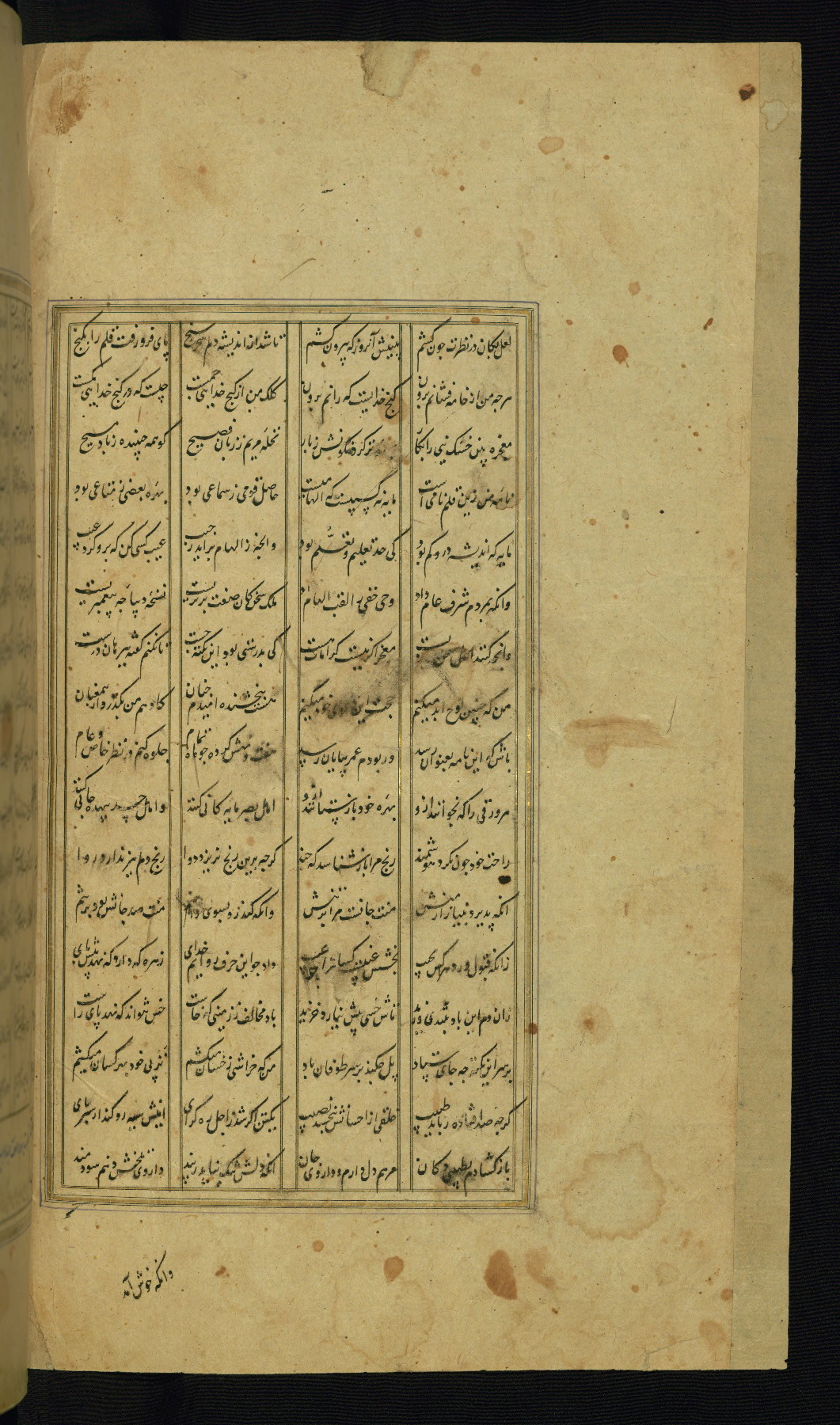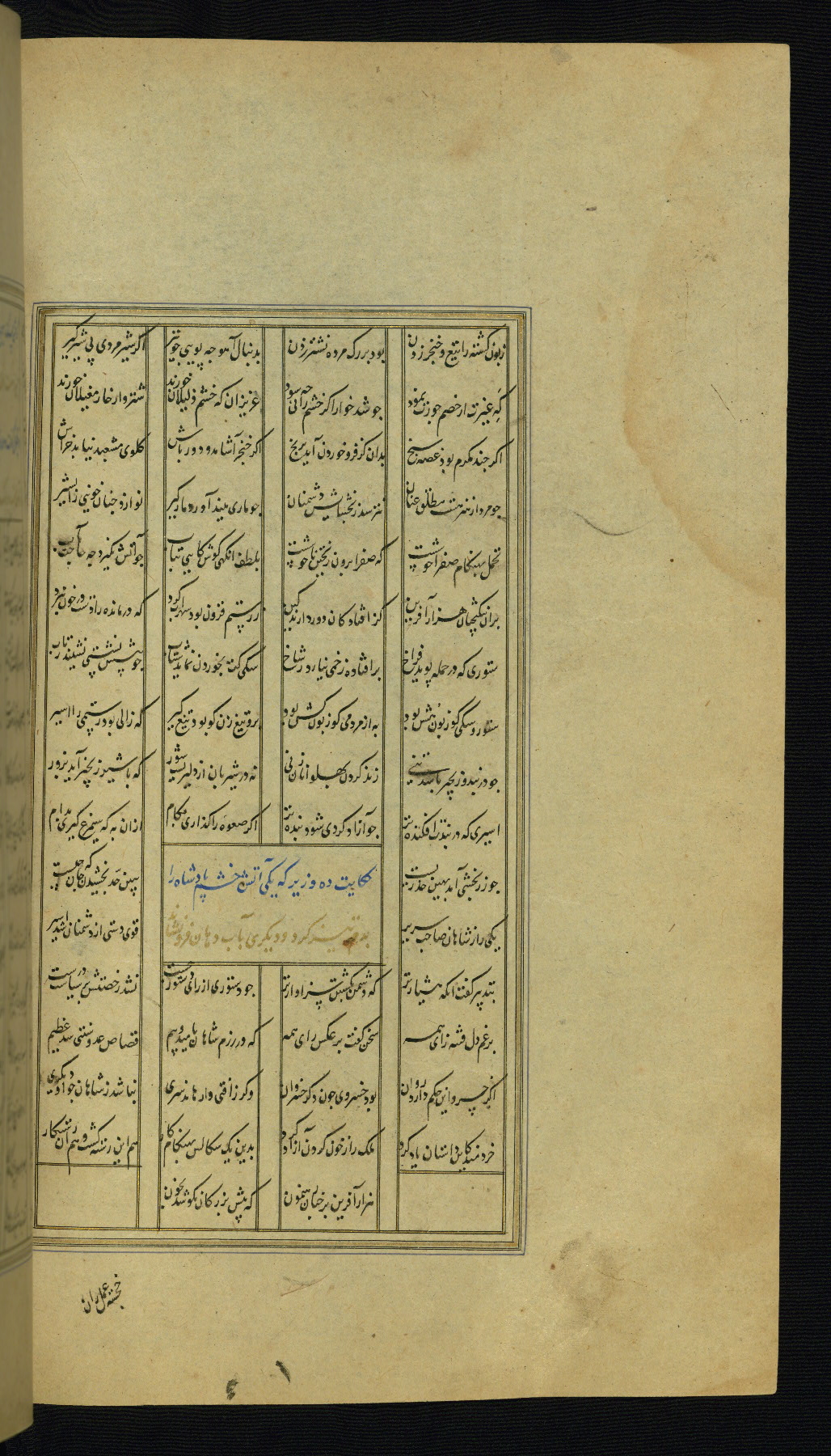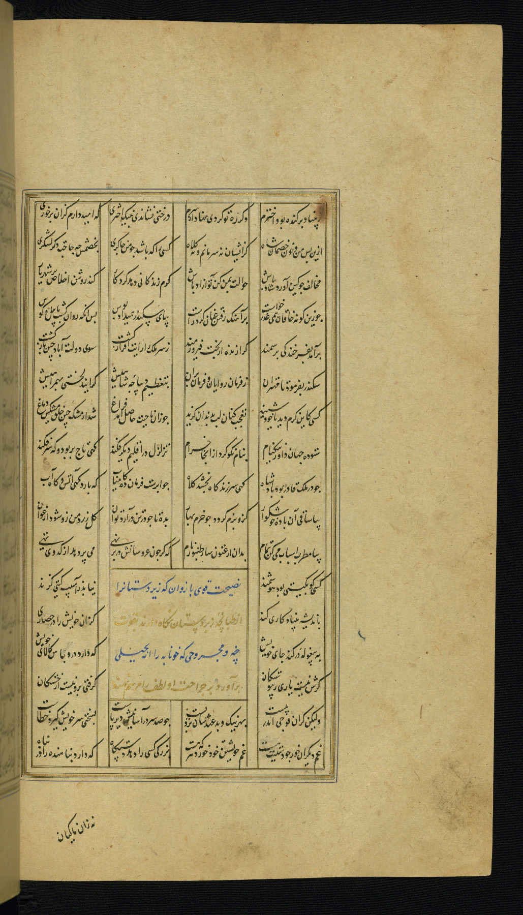 This is an illustrated and illuminated Safavid copy of the Khamsah (quintet) of Amīr Khusraw Dihlavī (d. 725 AH / 1325 CE), written by Pīr Ḥusayn al-Kātib al-Shīrāzī in 935 AH / 1529 CE. The codex opens with a double-page illuminated frontispiece with verses in honor of the poet Mir (Amir) Khusraw (fols. 1b-2a). There are four illuminated incipit pages introducing the individual poems, and thirteen paintings illustrate the text. The lacquer binding, which is not original to the manuscript, has a hunting scene on the upper and lower boards. The lower board is inscribed yā Shāh Najaf (oh, King of Najaf, i.e. ʿAlī) and is dated 1271 AH / 1854 CE.