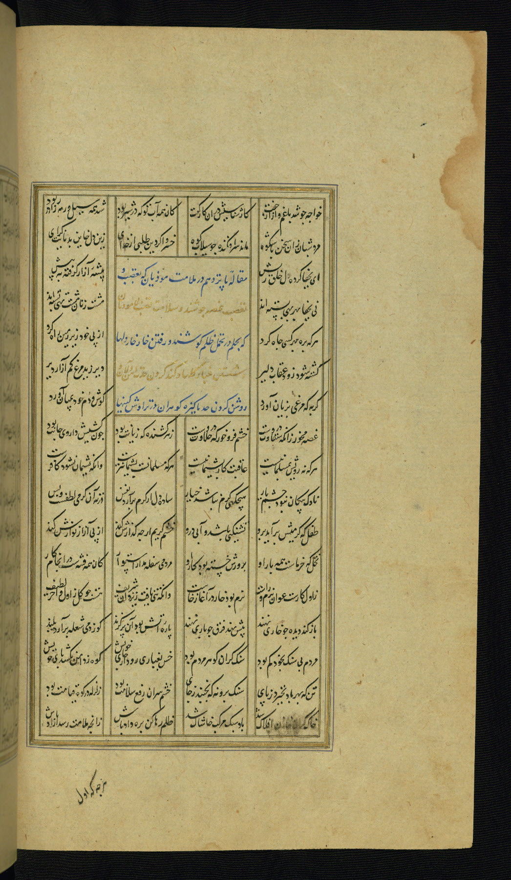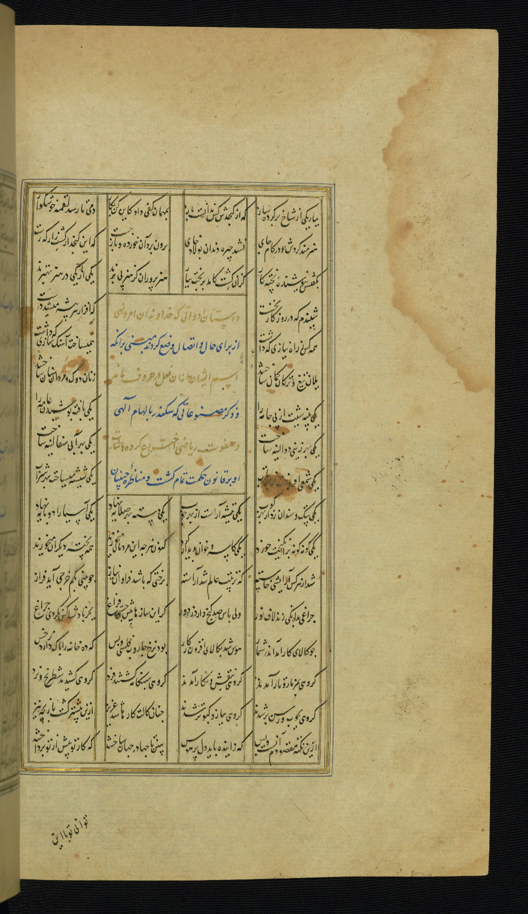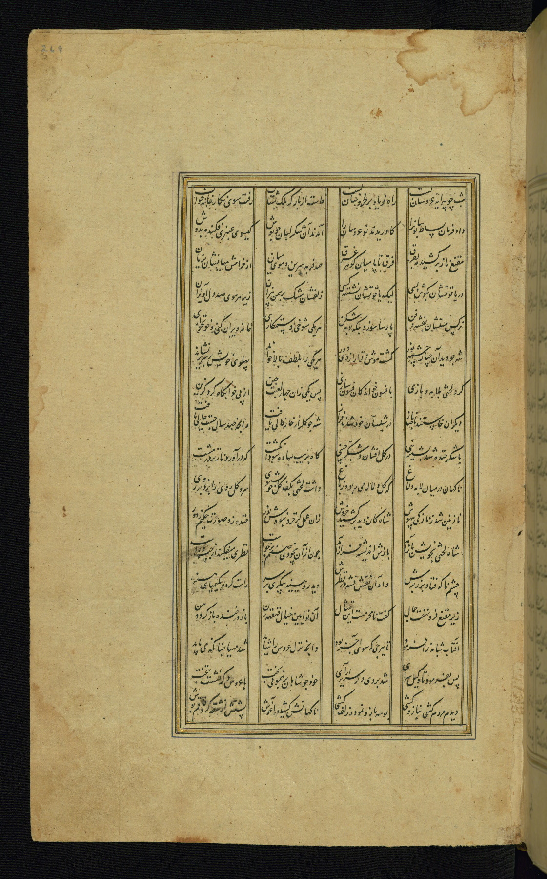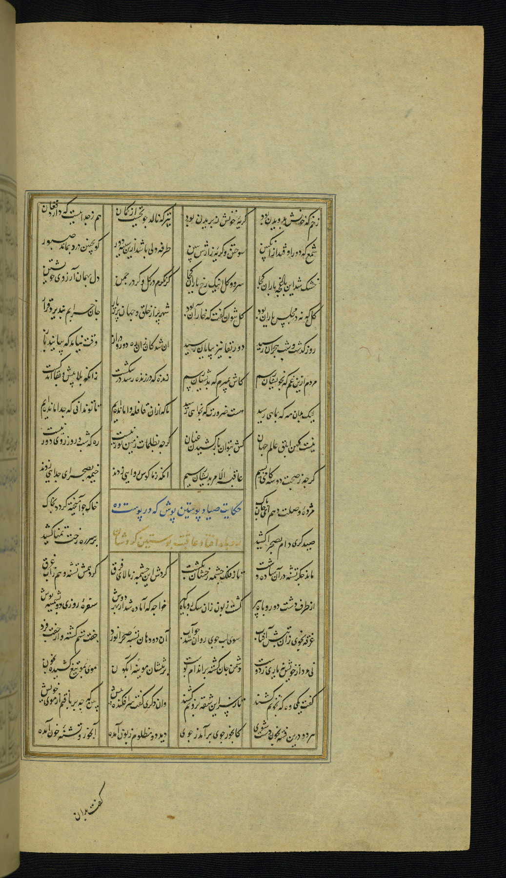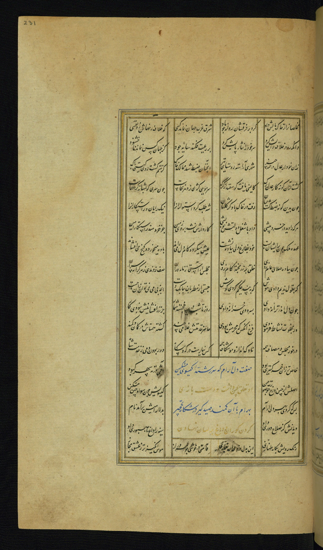 This is an illustrated and illuminated Safavid copy of the Khamsah (quintet) of Amīr Khusraw Dihlavī (d. 725 AH / 1325 CE), written by Pīr Ḥusayn al-Kātib al-Shīrāzī in 935 AH / 1529 CE. The codex opens with a double-page illuminated frontispiece with verses in honor of the poet Mir (Amir) Khusraw (fols. 1b-2a). There are four illuminated incipit pages introducing the individual poems, and thirteen paintings illustrate the text. The lacquer binding, which is not original to the manuscript, has a hunting scene on the upper and lower boards. The lower board is inscribed yā Shāh Najaf (oh, King of Najaf, i.e. ʿAlī) and is dated 1271 AH / 1854 CE.