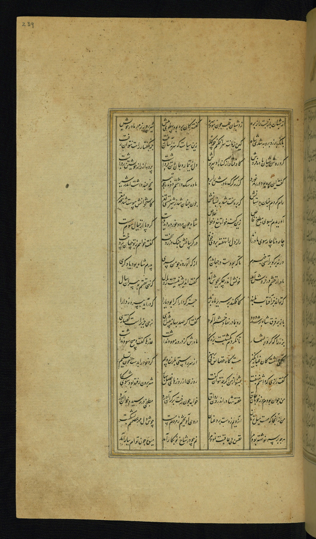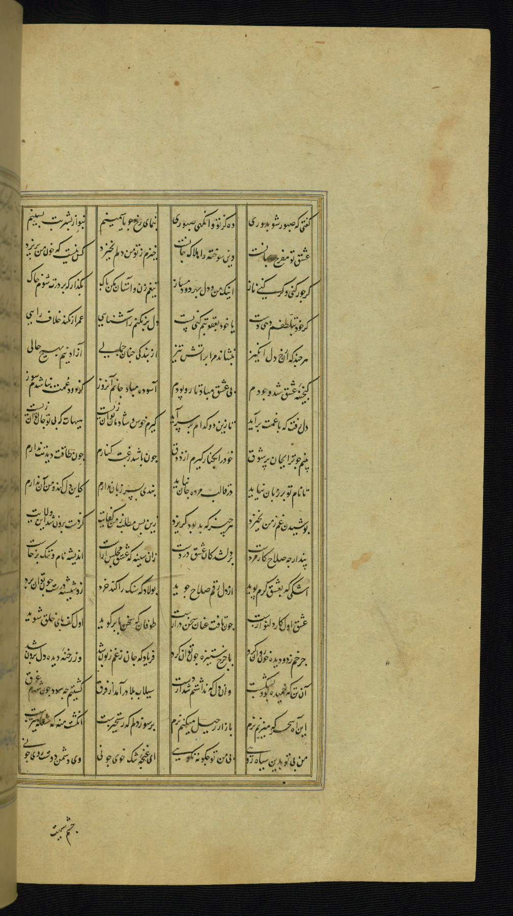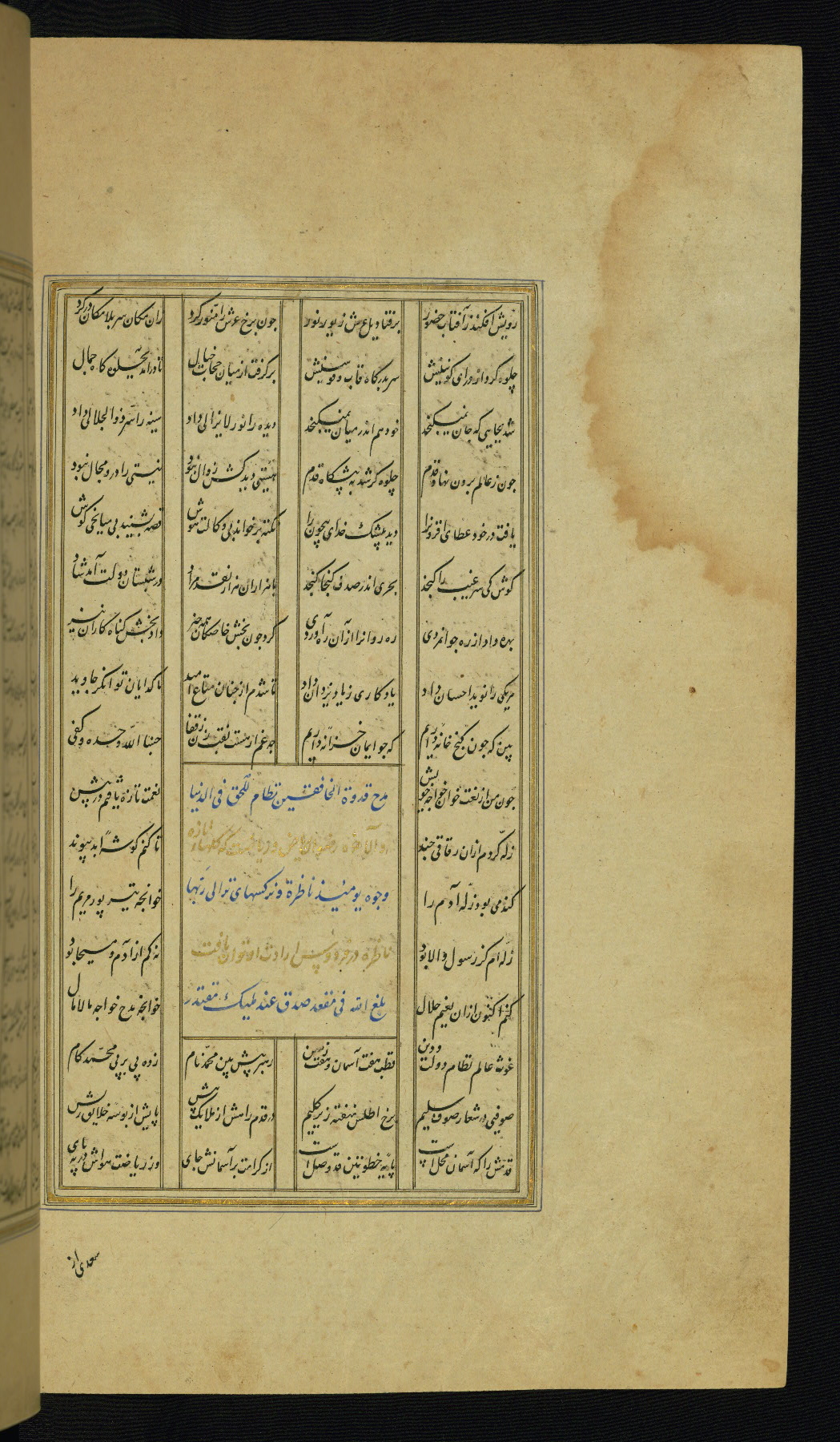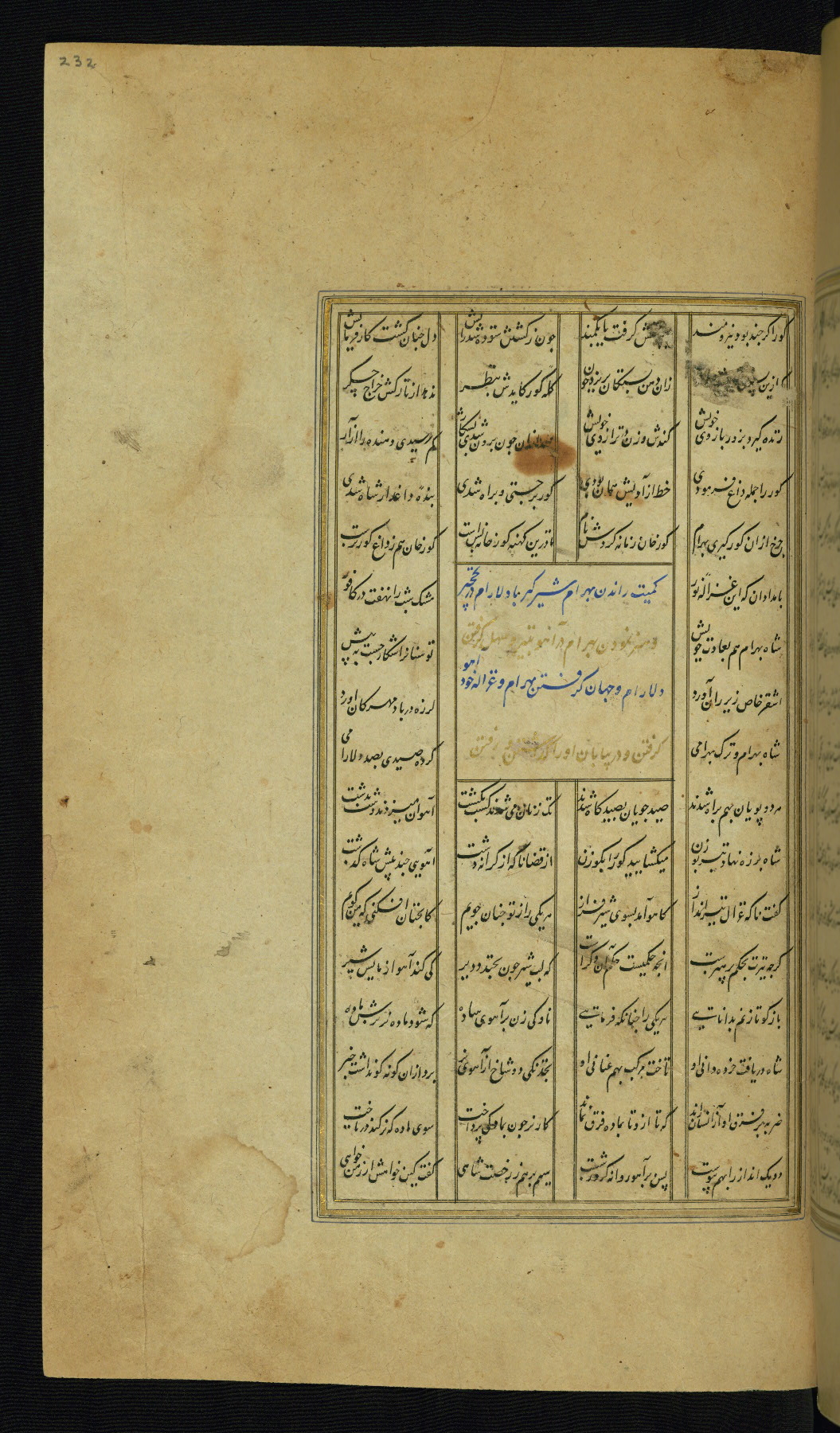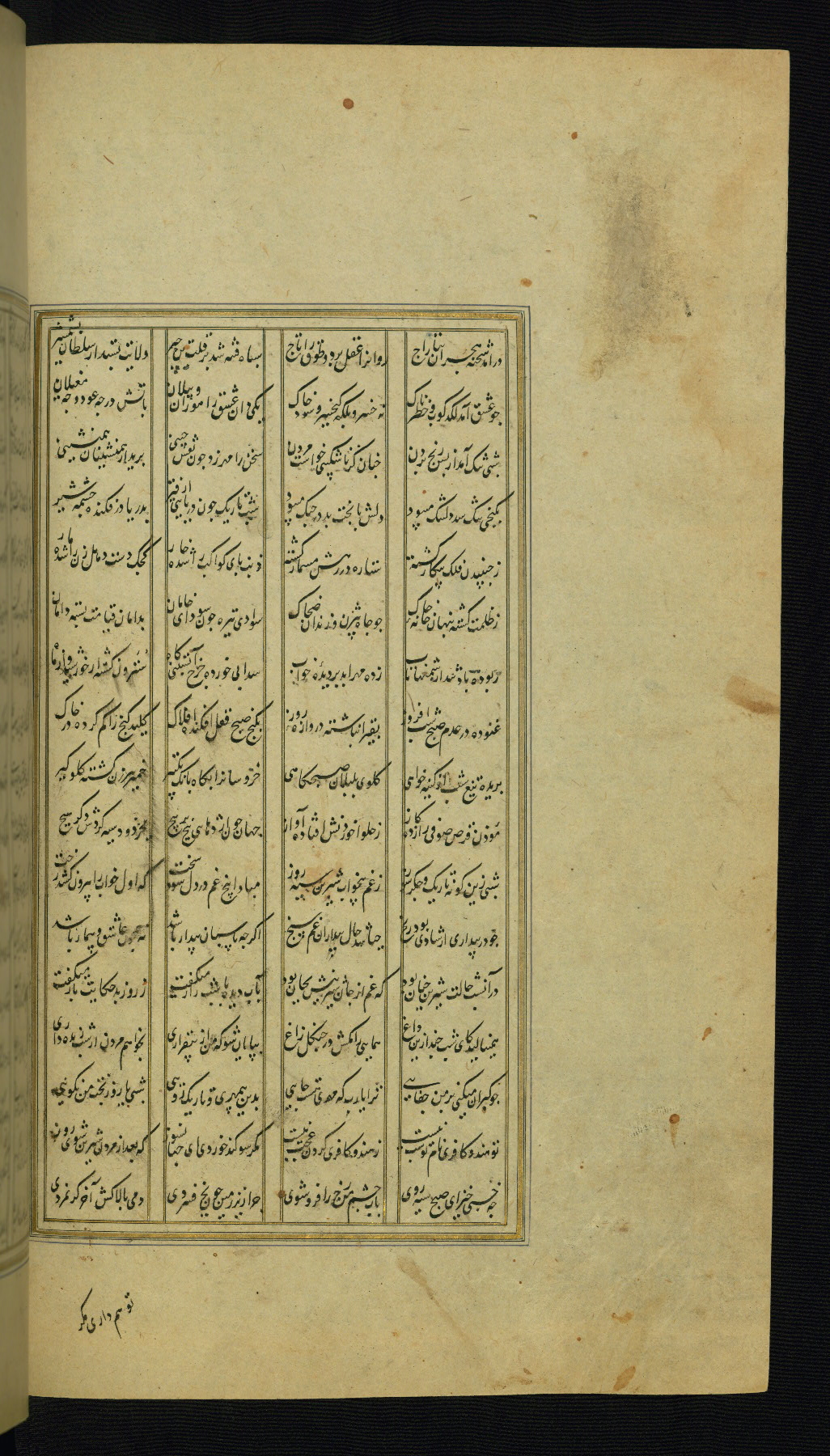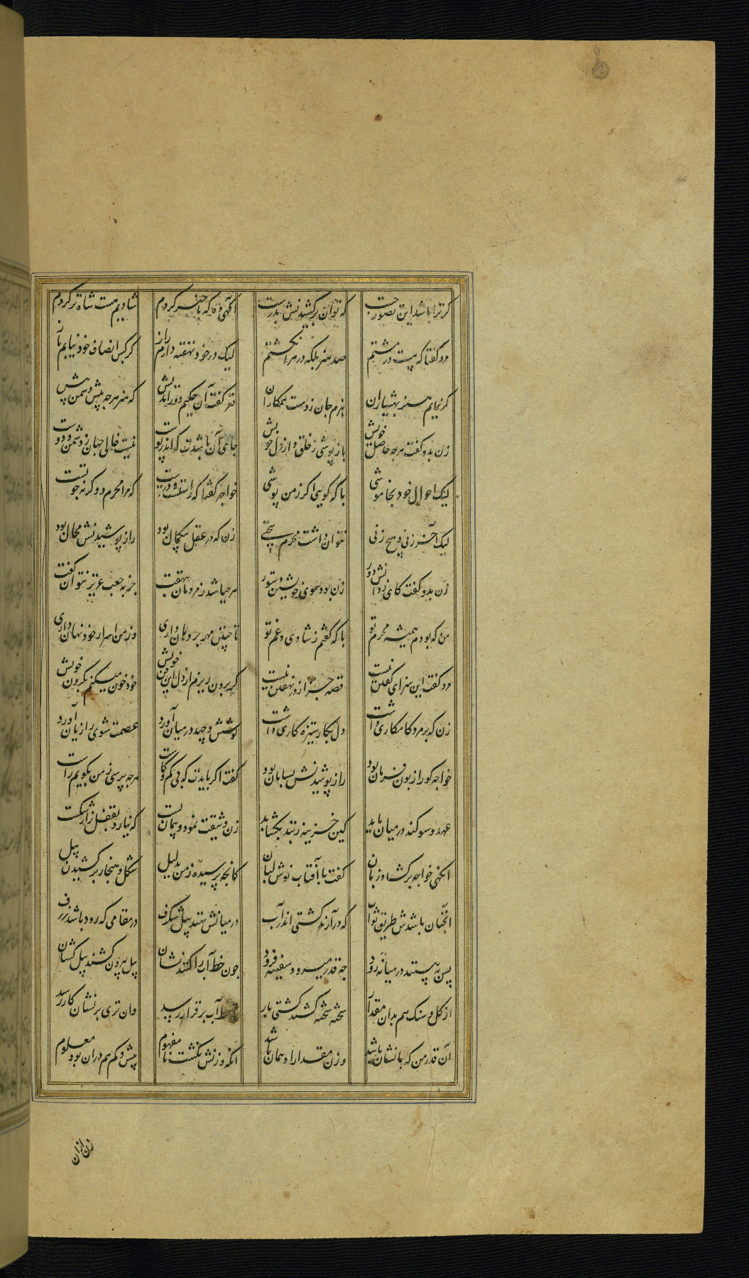This is an illustrated and illuminated Safavid copy of the Khamsah (quintet) of Amīr Khusraw Dihlavī (d. 725 AH / 1325 CE), written by Pīr Ḥusayn al-Kātib al-Shīrāzī in 935 AH / 1529 CE. The codex opens with a double-page illuminated frontispiece with verses in honor of the poet Mir (Amir) Khusraw (fols. 1b-2a). There are four illuminated incipit pages introducing the individual poems, and thirteen paintings illustrate the text. The lacquer binding, which is not original to the manuscript, has a hunting scene on the upper and lower boards. The lower board is inscribed yā Shāh Najaf (oh, King of Najaf, i.e. ʿAlī) and is dated 1271 AH / 1854 CE.