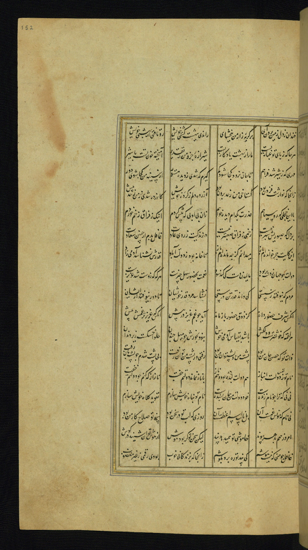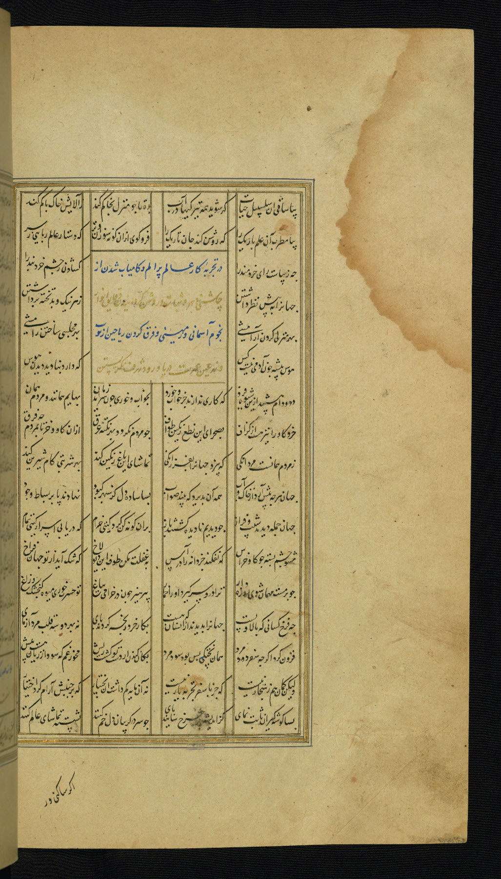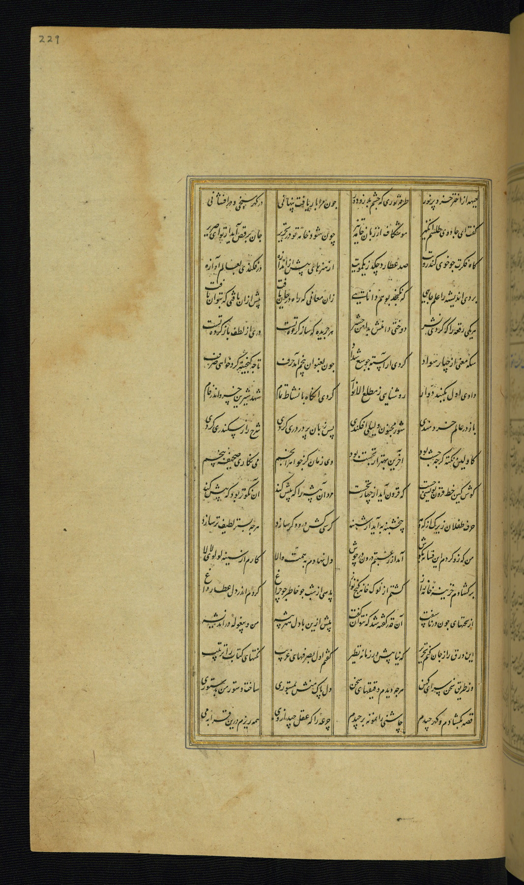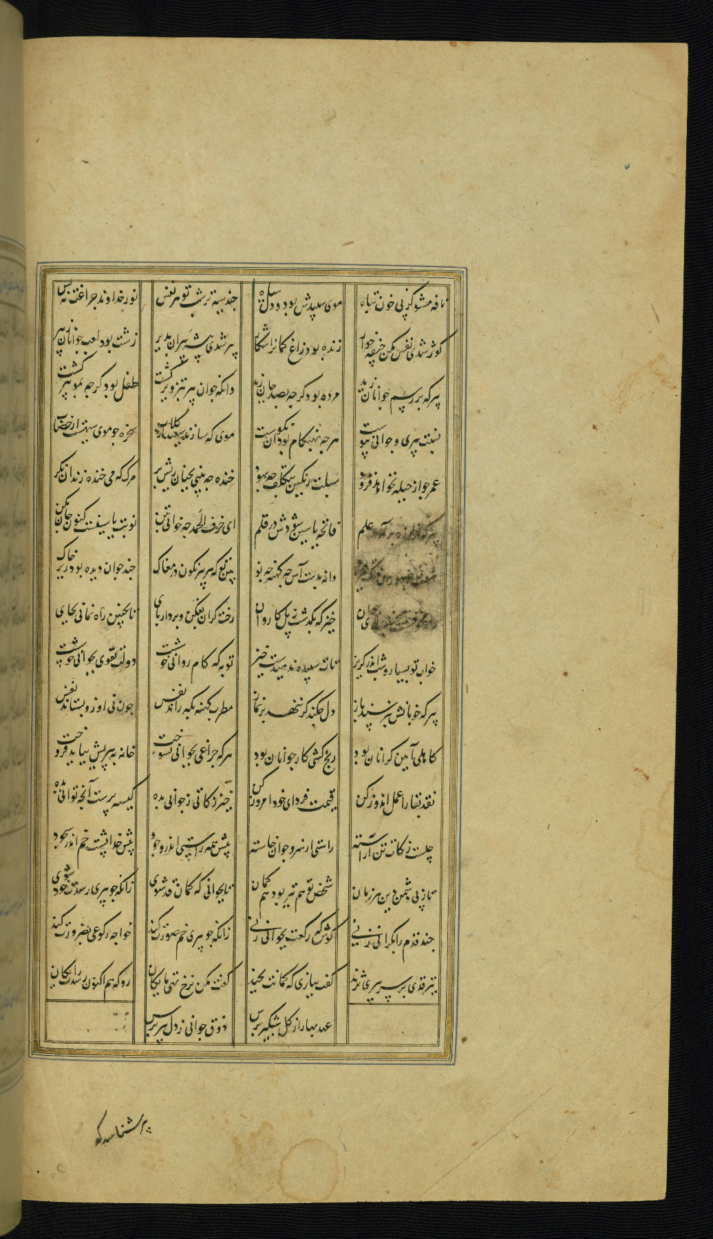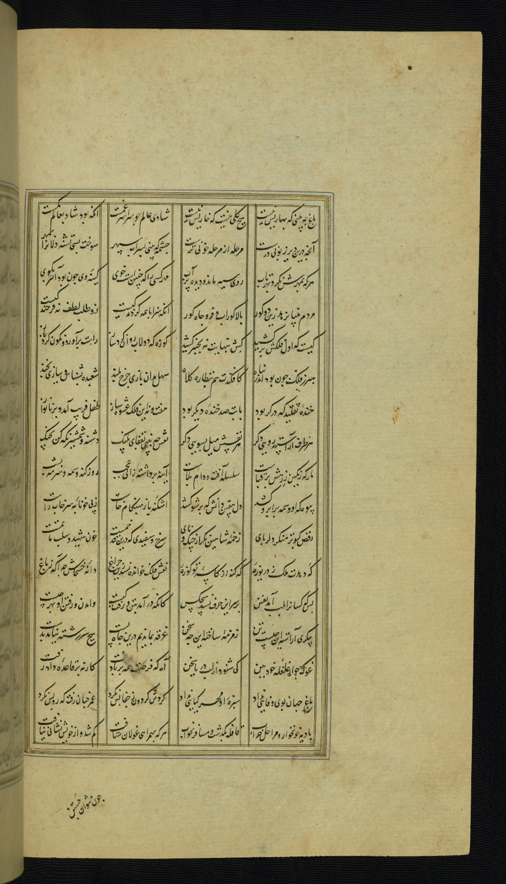 This is an illustrated and illuminated Safavid copy of the Khamsah (quintet) of Amīr Khusraw Dihlavī (d. 725 AH / 1325 CE), written by Pīr Ḥusayn al-Kātib al-Shīrāzī in 935 AH / 1529 CE. The codex opens with a double-page illuminated frontispiece with verses in honor of the poet Mir (Amir) Khusraw (fols. 1b-2a). There are four illuminated incipit pages introducing the individual poems, and thirteen paintings illustrate the text. The lacquer binding, which is not original to the manuscript, has a hunting scene on the upper and lower boards. The lower board is inscribed yā Shāh Najaf (oh, King of Najaf, i.e. ʿAlī) and is dated 1271 AH / 1854 CE.