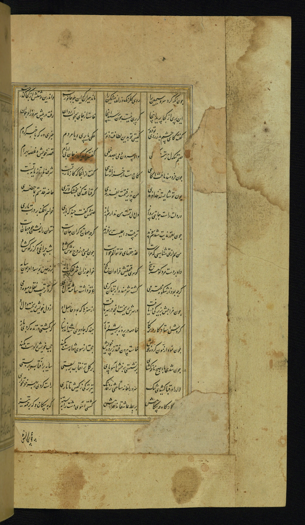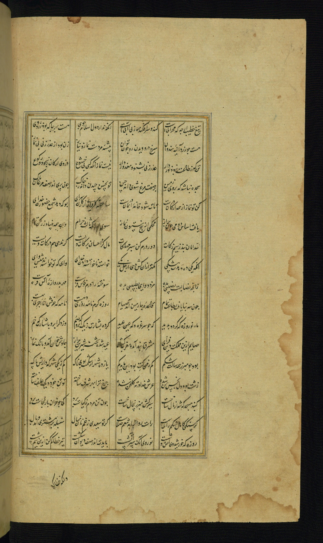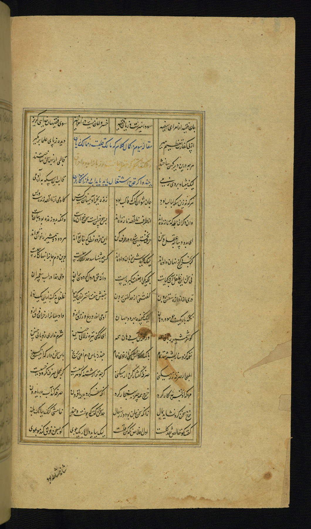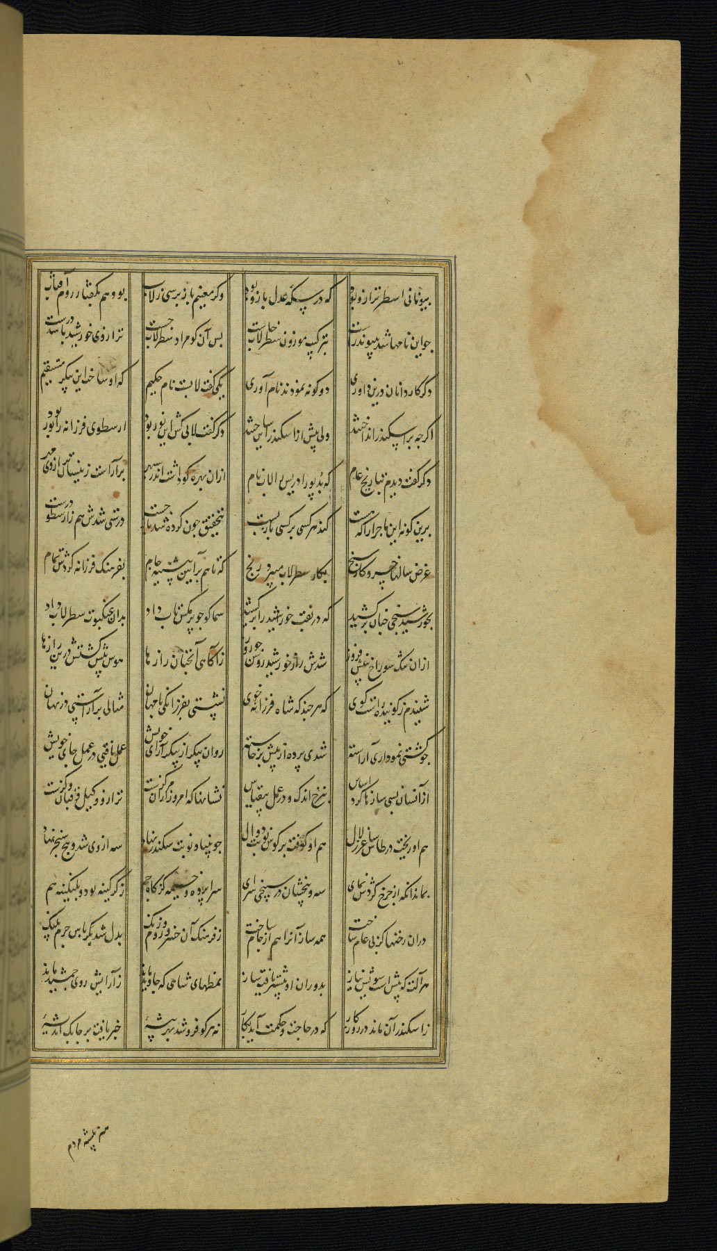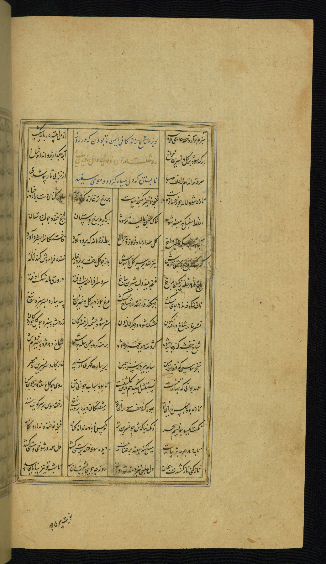 This is an illustrated and illuminated Safavid copy of the Khamsah (quintet) of Amīr Khusraw Dihlavī (d. 725 AH / 1325 CE), written by Pīr Ḥusayn al-Kātib al-Shīrāzī in 935 AH / 1529 CE. The codex opens with a double-page illuminated frontispiece with verses in honor of the poet Mir (Amir) Khusraw (fols. 1b-2a). There are four illuminated incipit pages introducing the individual poems, and thirteen paintings illustrate the text. The lacquer binding, which is not original to the manuscript, has a hunting scene on the upper and lower boards. The lower board is inscribed yā Shāh Najaf (oh, King of Najaf, i.e. ʿAlī) and is dated 1271 AH / 1854 CE.