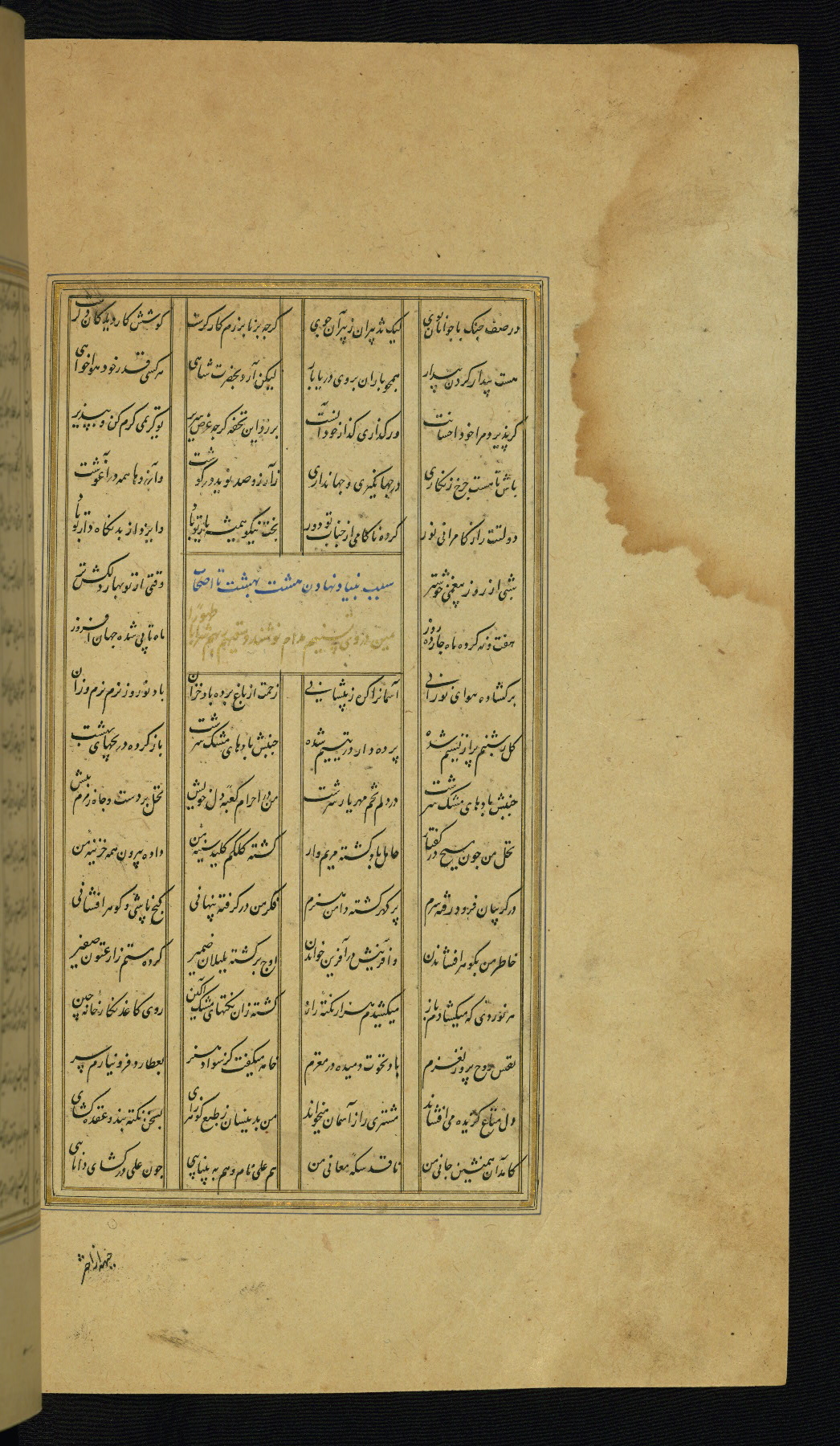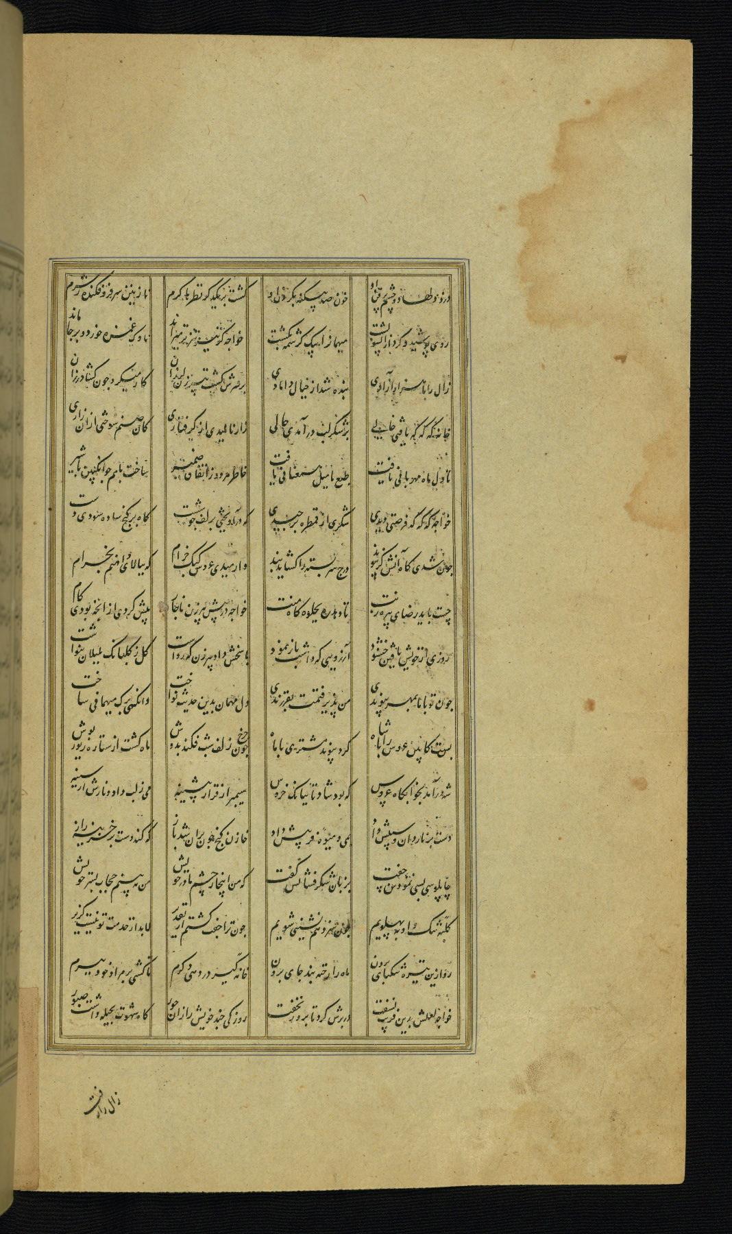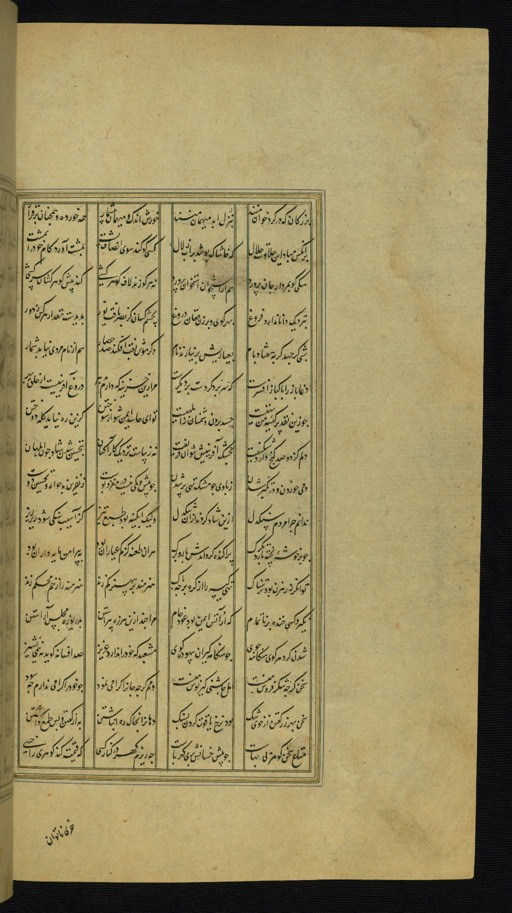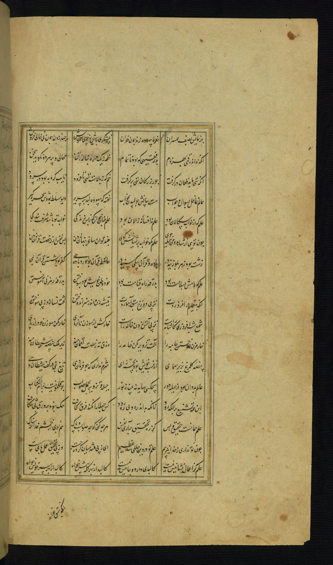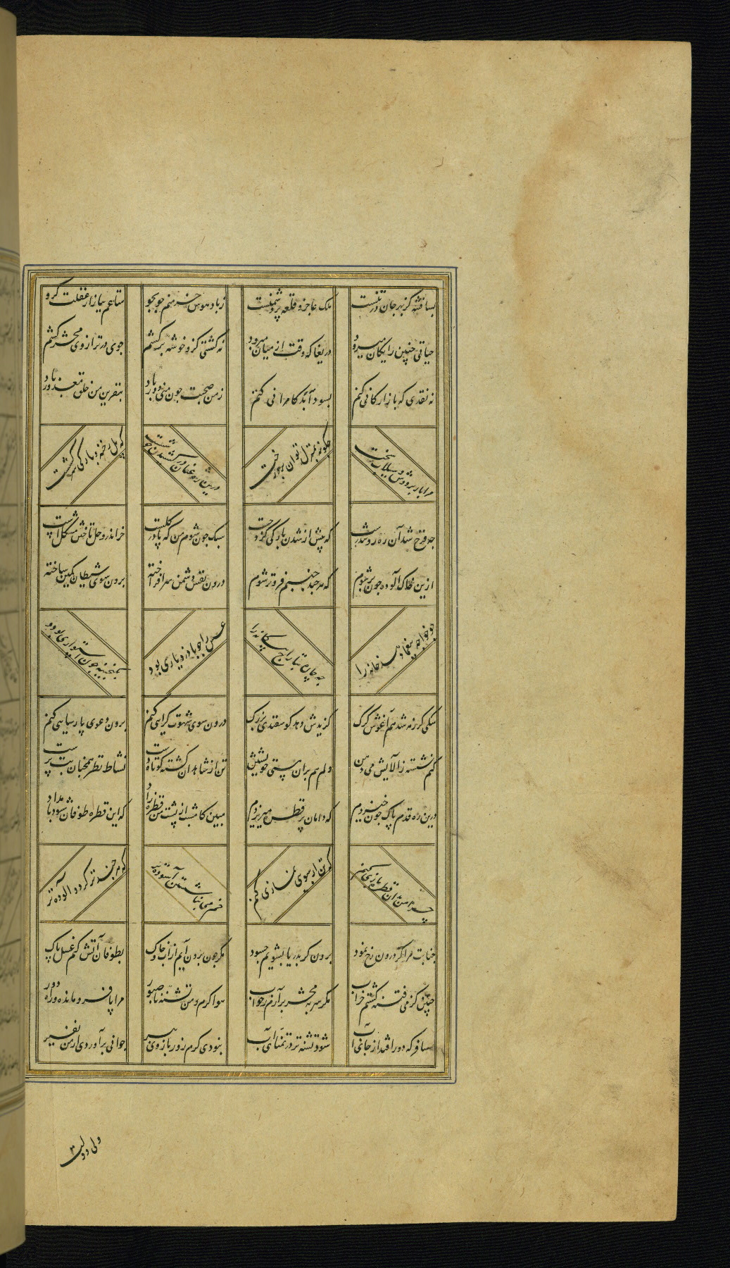 This is an illustrated and illuminated Safavid copy of the Khamsah (quintet) of Amīr Khusraw Dihlavī (d. 725 AH / 1325 CE), written by Pīr Ḥusayn al-Kātib al-Shīrāzī in 935 AH / 1529 CE. The codex opens with a double-page illuminated frontispiece with verses in honor of the poet Mir (Amir) Khusraw (fols. 1b-2a). There are four illuminated incipit pages introducing the individual poems, and thirteen paintings illustrate the text. The lacquer binding, which is not original to the manuscript, has a hunting scene on the upper and lower boards. The lower board is inscribed yā Shāh Najaf (oh, King of Najaf, i.e. ʿAlī) and is dated 1271 AH / 1854 CE.