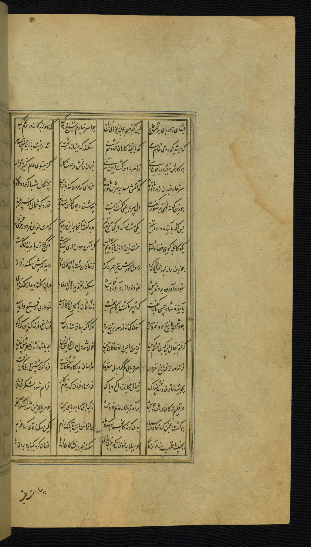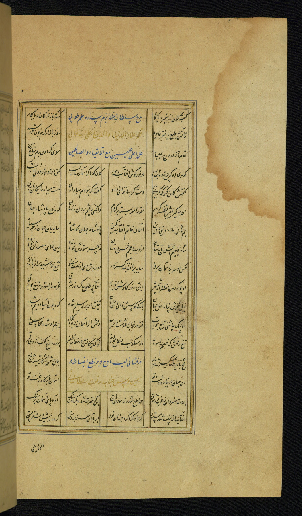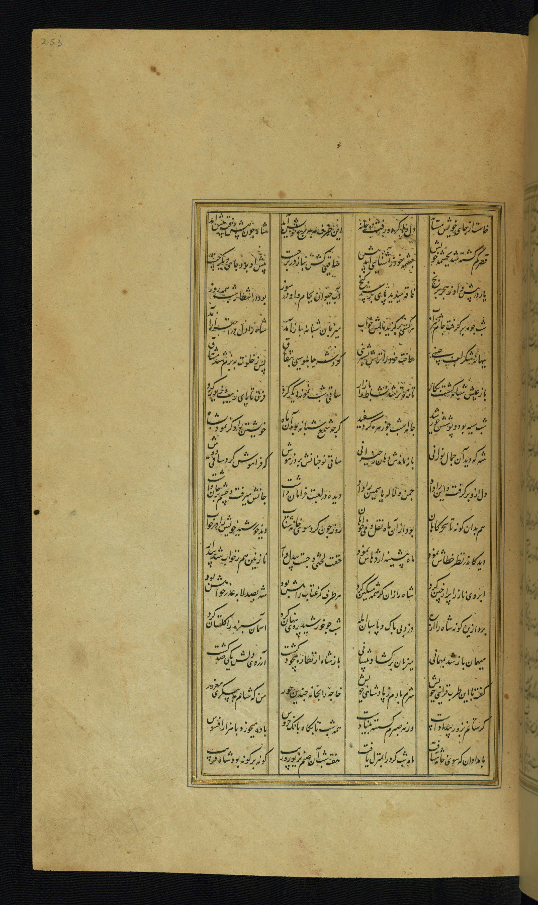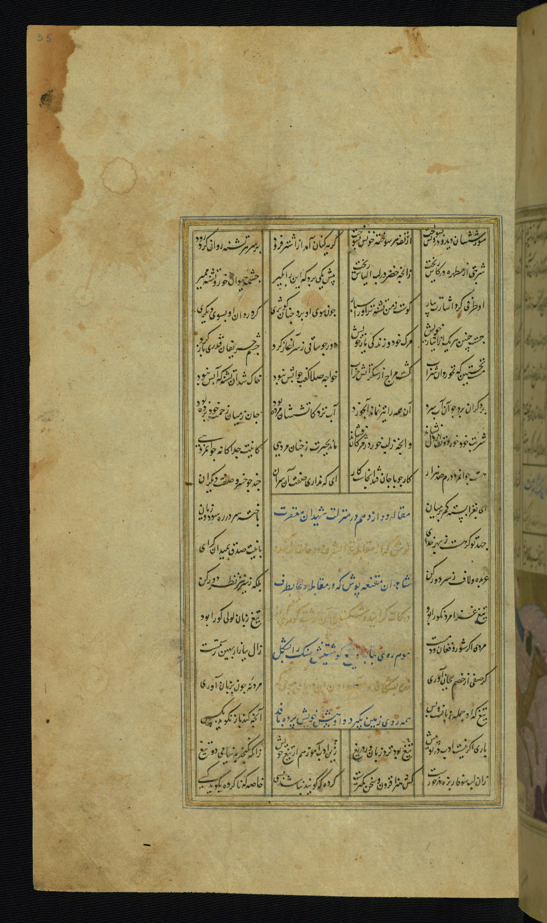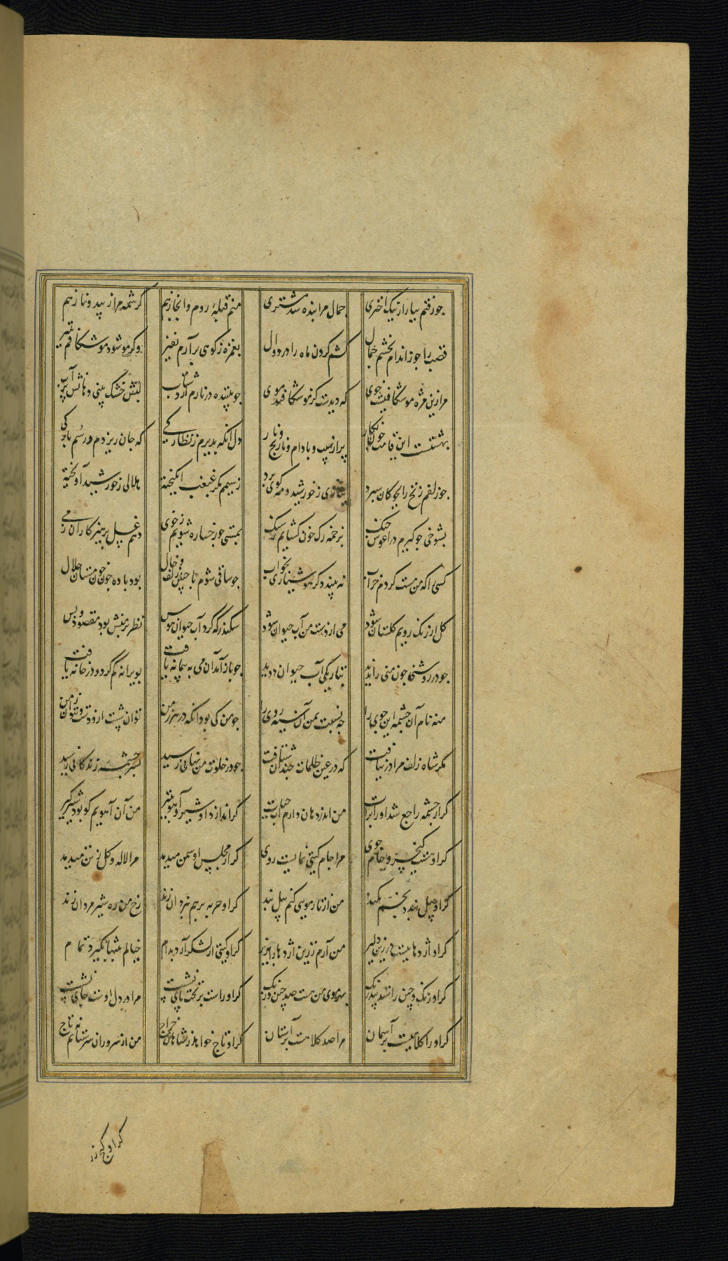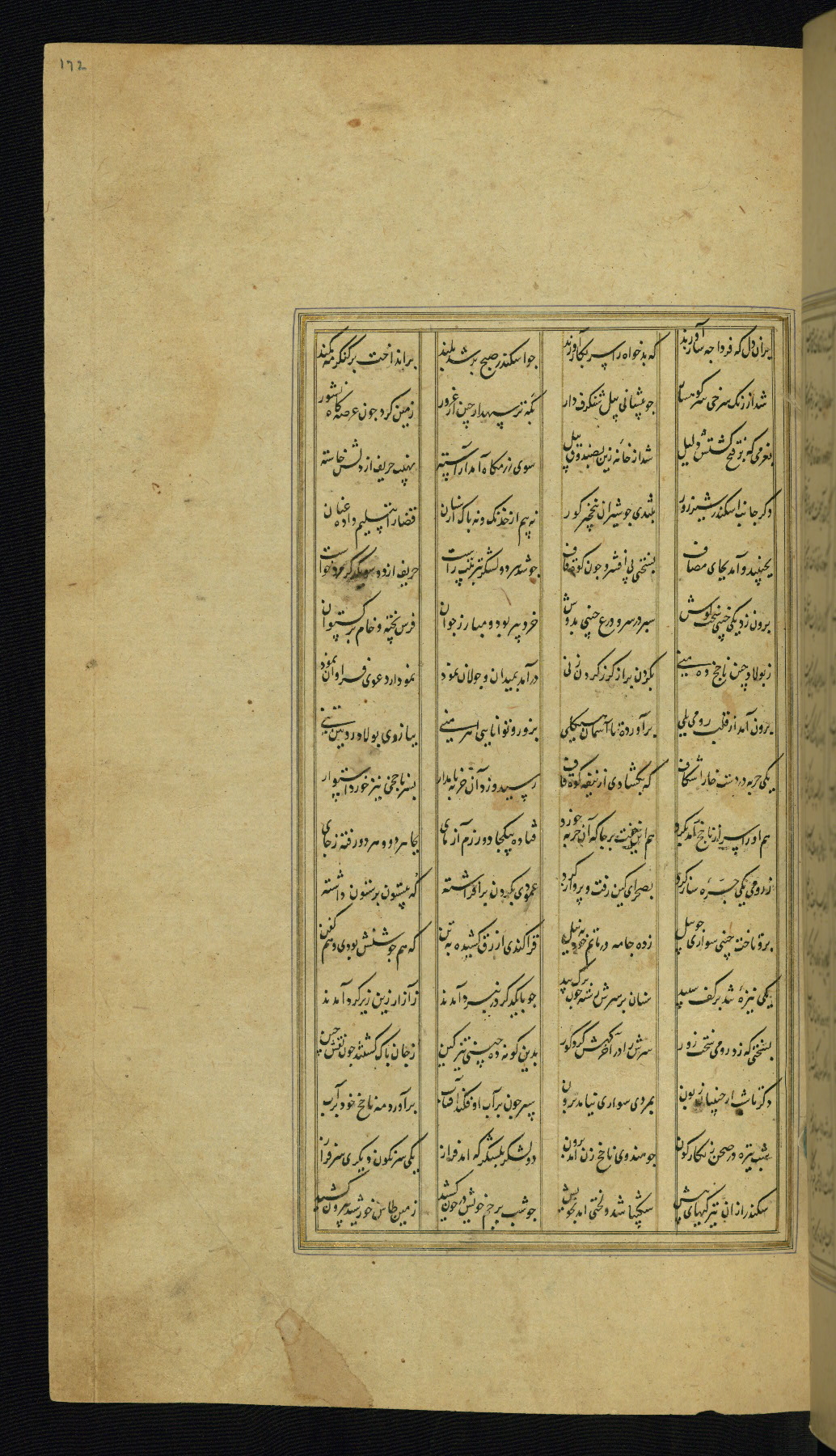 This is an illustrated and illuminated Safavid copy of the Khamsah (quintet) of Amīr Khusraw Dihlavī (d. 725 AH / 1325 CE), written by Pīr Ḥusayn al-Kātib al-Shīrāzī in 935 AH / 1529 CE. The codex opens with a double-page illuminated frontispiece with verses in honor of the poet Mir (Amir) Khusraw (fols. 1b-2a). There are four illuminated incipit pages introducing the individual poems, and thirteen paintings illustrate the text. The lacquer binding, which is not original to the manuscript, has a hunting scene on the upper and lower boards. The lower board is inscribed yā Shāh Najaf (oh, King of Najaf, i.e. ʿAlī) and is dated 1271 AH / 1854 CE.