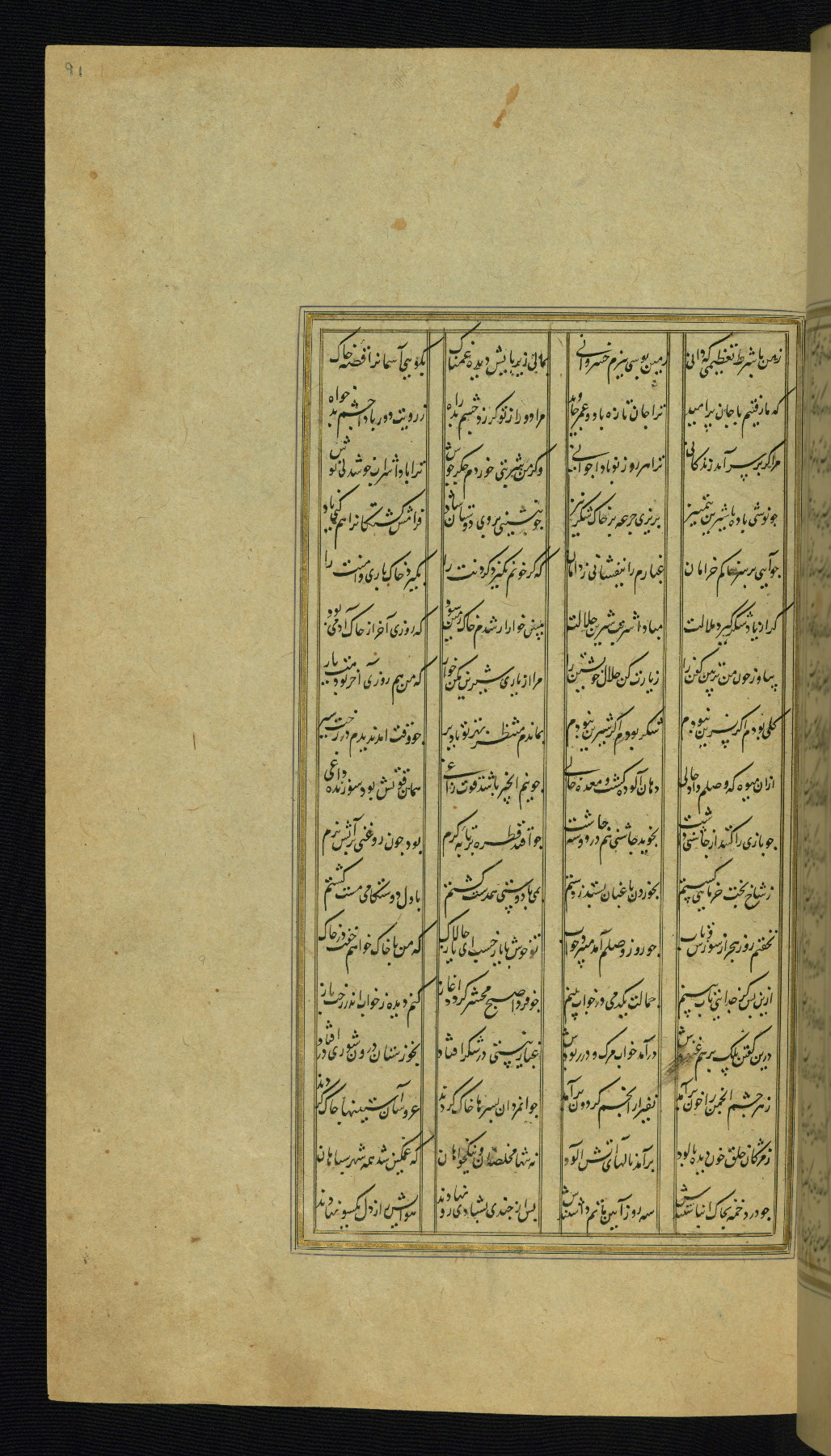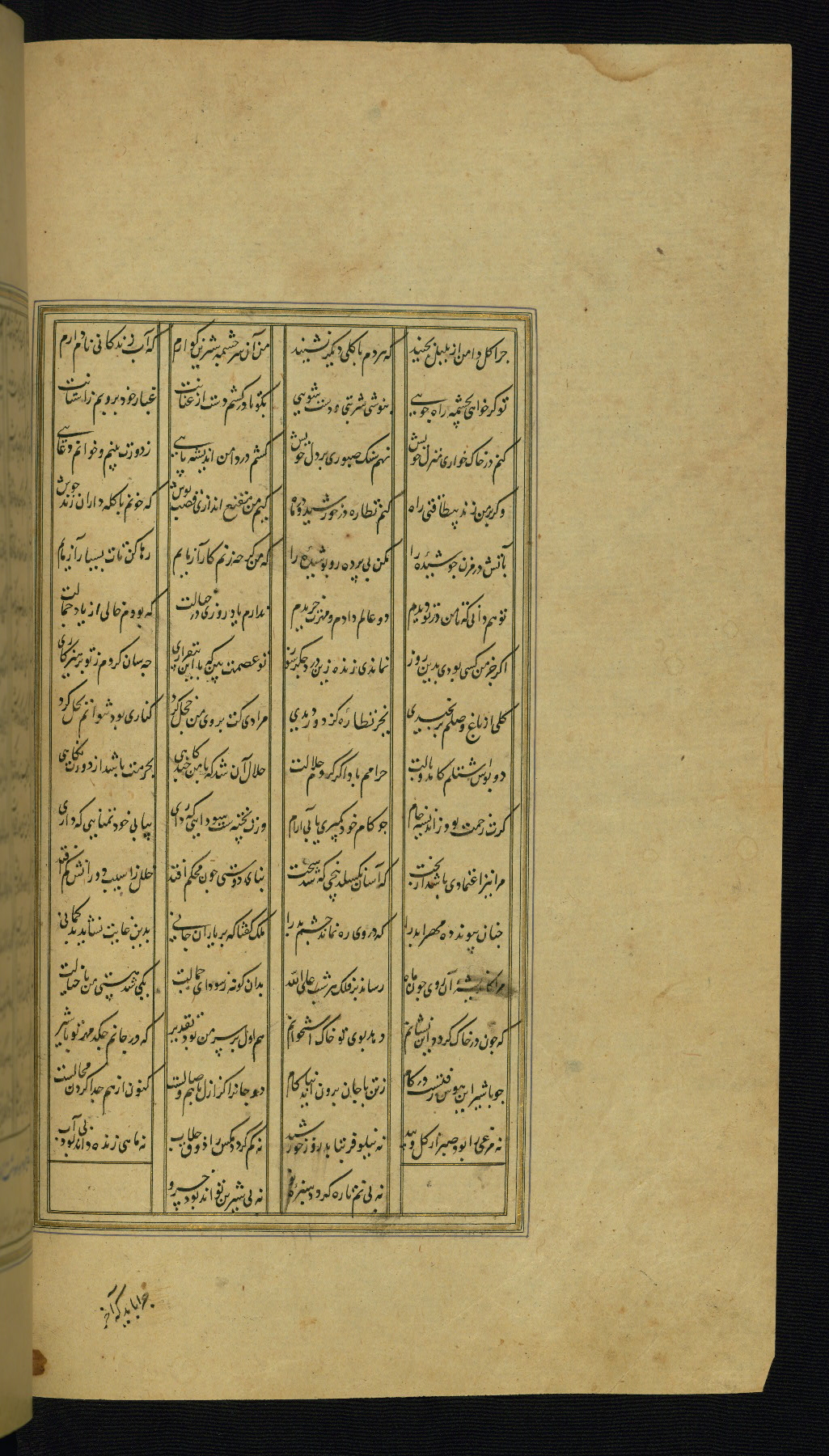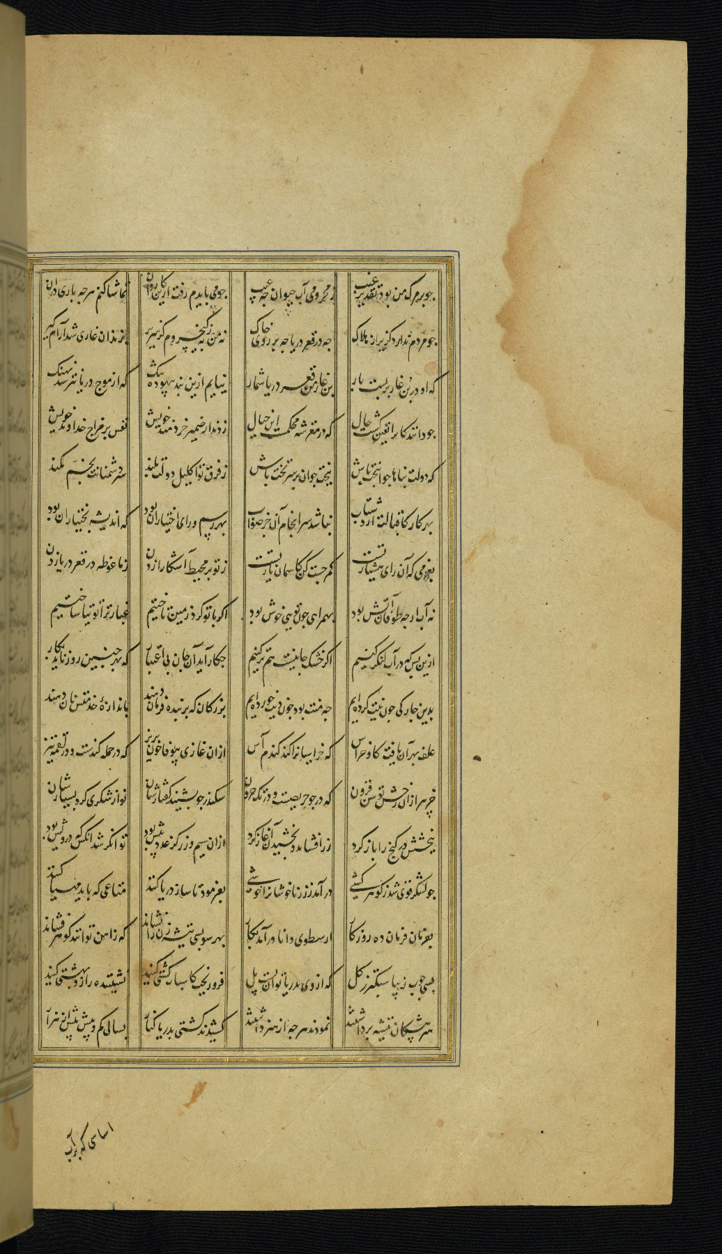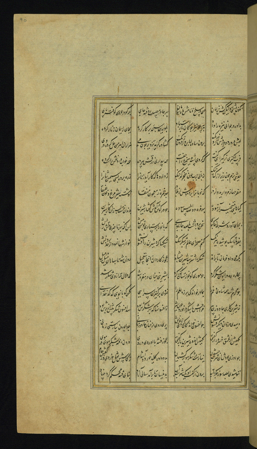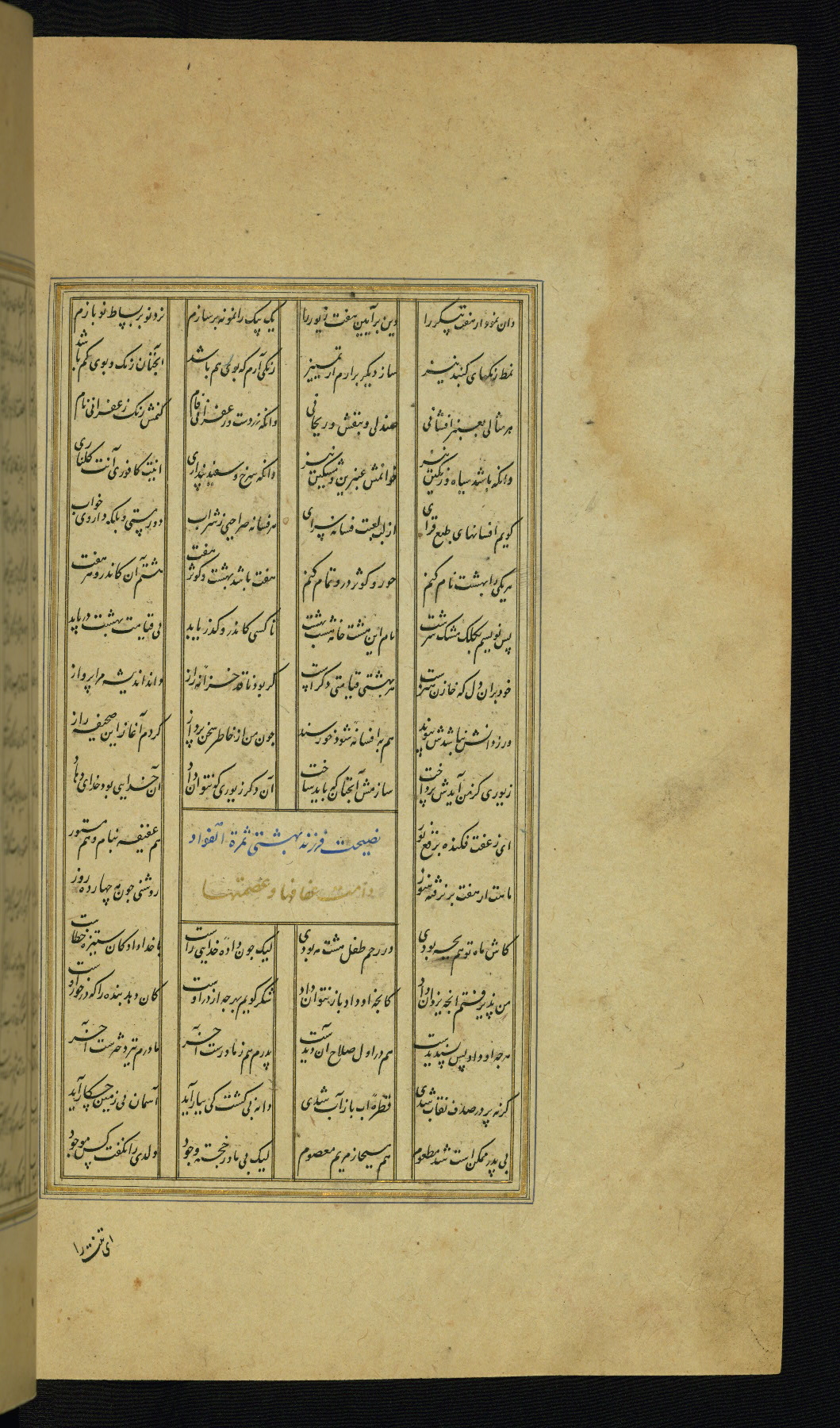 This is an illustrated and illuminated Safavid copy of the Khamsah (quintet) of Amīr Khusraw Dihlavī (d. 725 AH / 1325 CE), written by Pīr Ḥusayn al-Kātib al-Shīrāzī in 935 AH / 1529 CE. The codex opens with a double-page illuminated frontispiece with verses in honor of the poet Mir (Amir) Khusraw (fols. 1b-2a). There are four illuminated incipit pages introducing the individual poems, and thirteen paintings illustrate the text. The lacquer binding, which is not original to the manuscript, has a hunting scene on the upper and lower boards. The lower board is inscribed yā Shāh Najaf (oh, King of Najaf, i.e. ʿAlī) and is dated 1271 AH / 1854 CE.