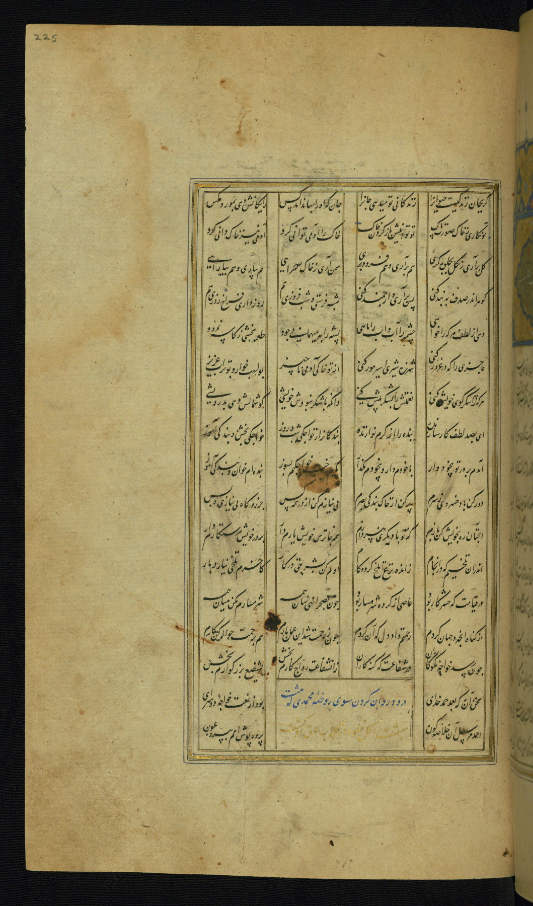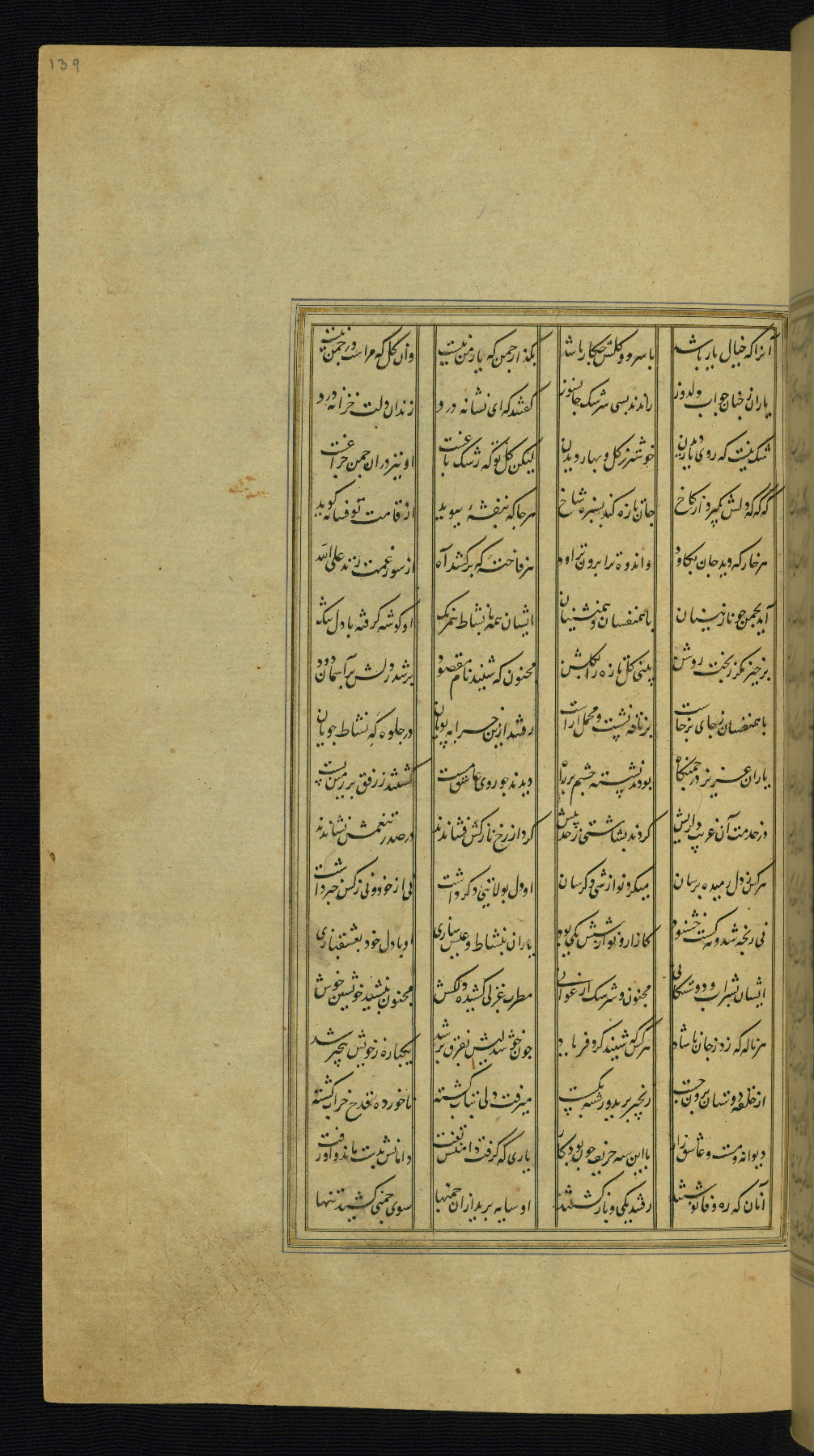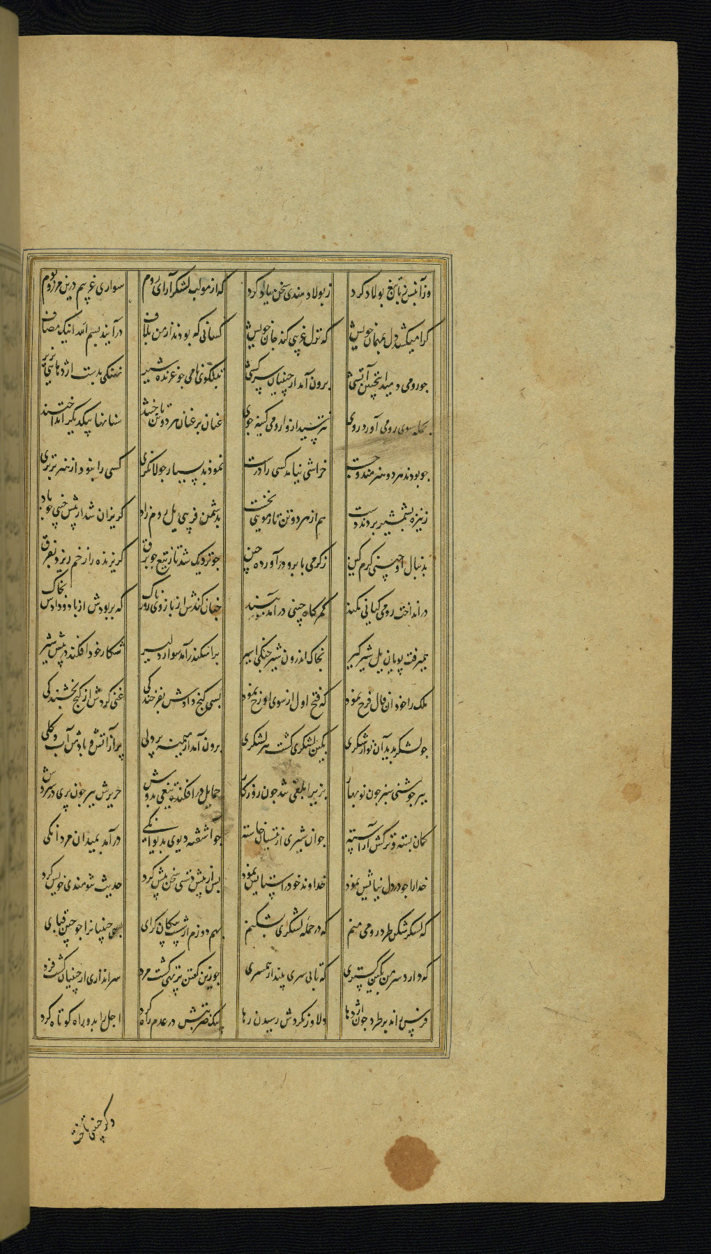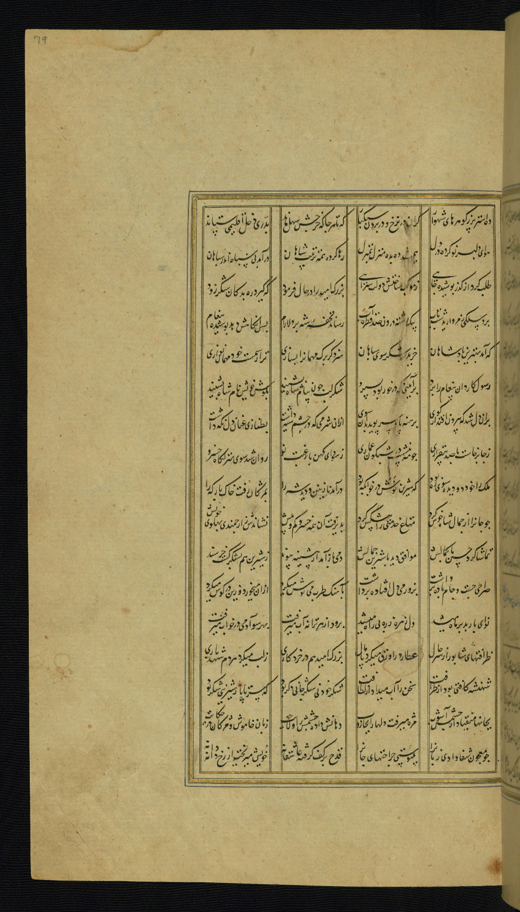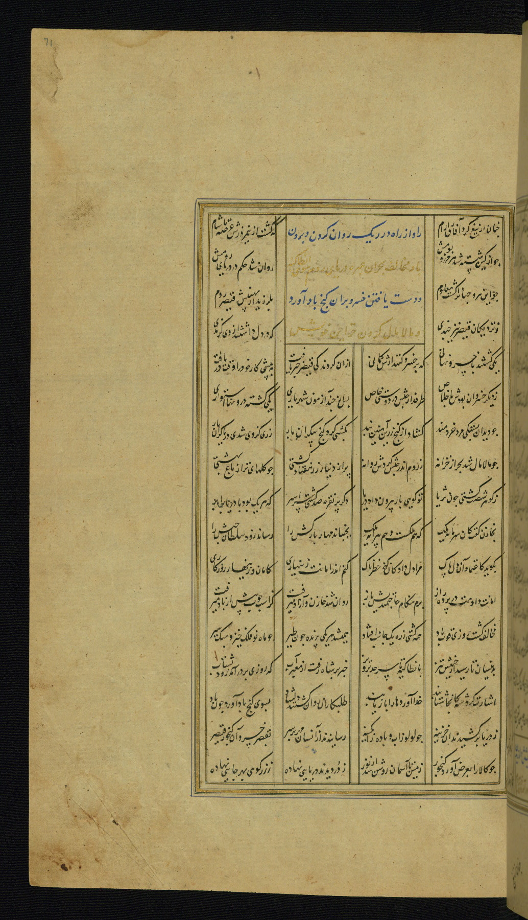 This is an illustrated and illuminated Safavid copy of the Khamsah (quintet) of Amīr Khusraw Dihlavī (d. 725 AH / 1325 CE), written by Pīr Ḥusayn al-Kātib al-Shīrāzī in 935 AH / 1529 CE. The codex opens with a double-page illuminated frontispiece with verses in honor of the poet Mir (Amir) Khusraw (fols. 1b-2a). There are four illuminated incipit pages introducing the individual poems, and thirteen paintings illustrate the text. The lacquer binding, which is not original to the manuscript, has a hunting scene on the upper and lower boards. The lower board is inscribed yā Shāh Najaf (oh, King of Najaf, i.e. ʿAlī) and is dated 1271 AH / 1854 CE.