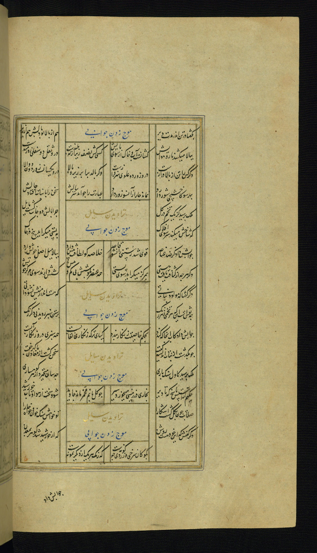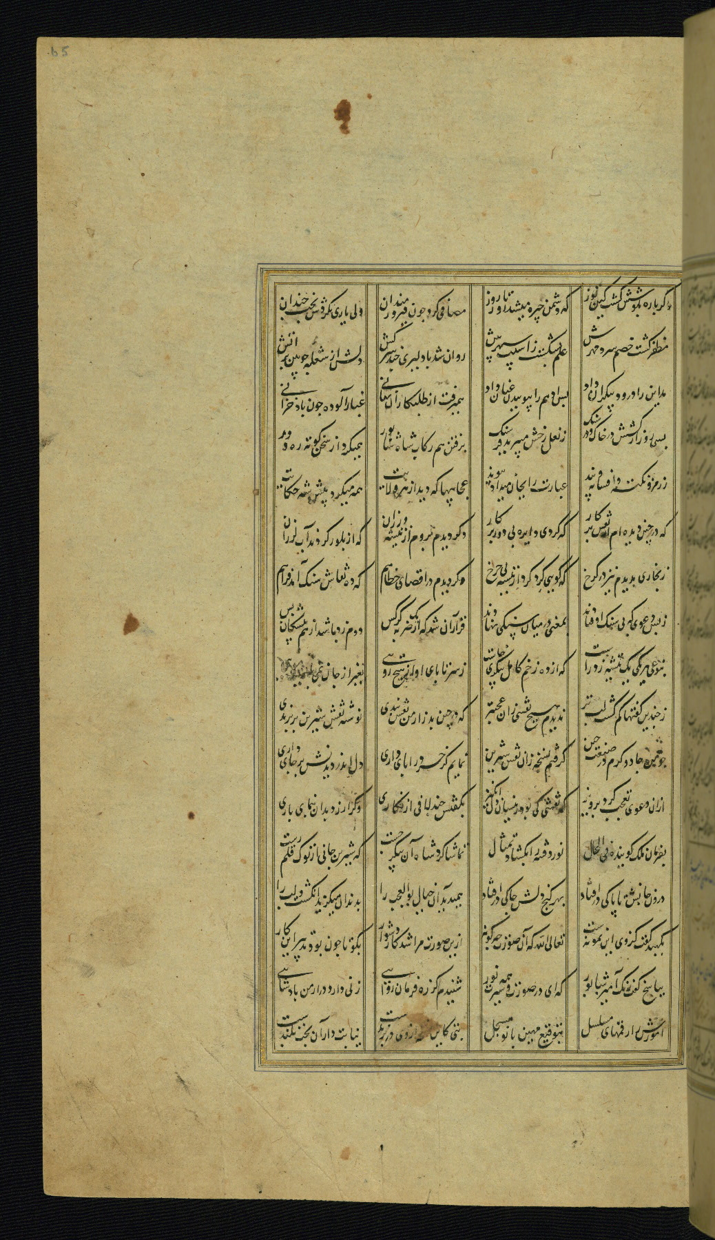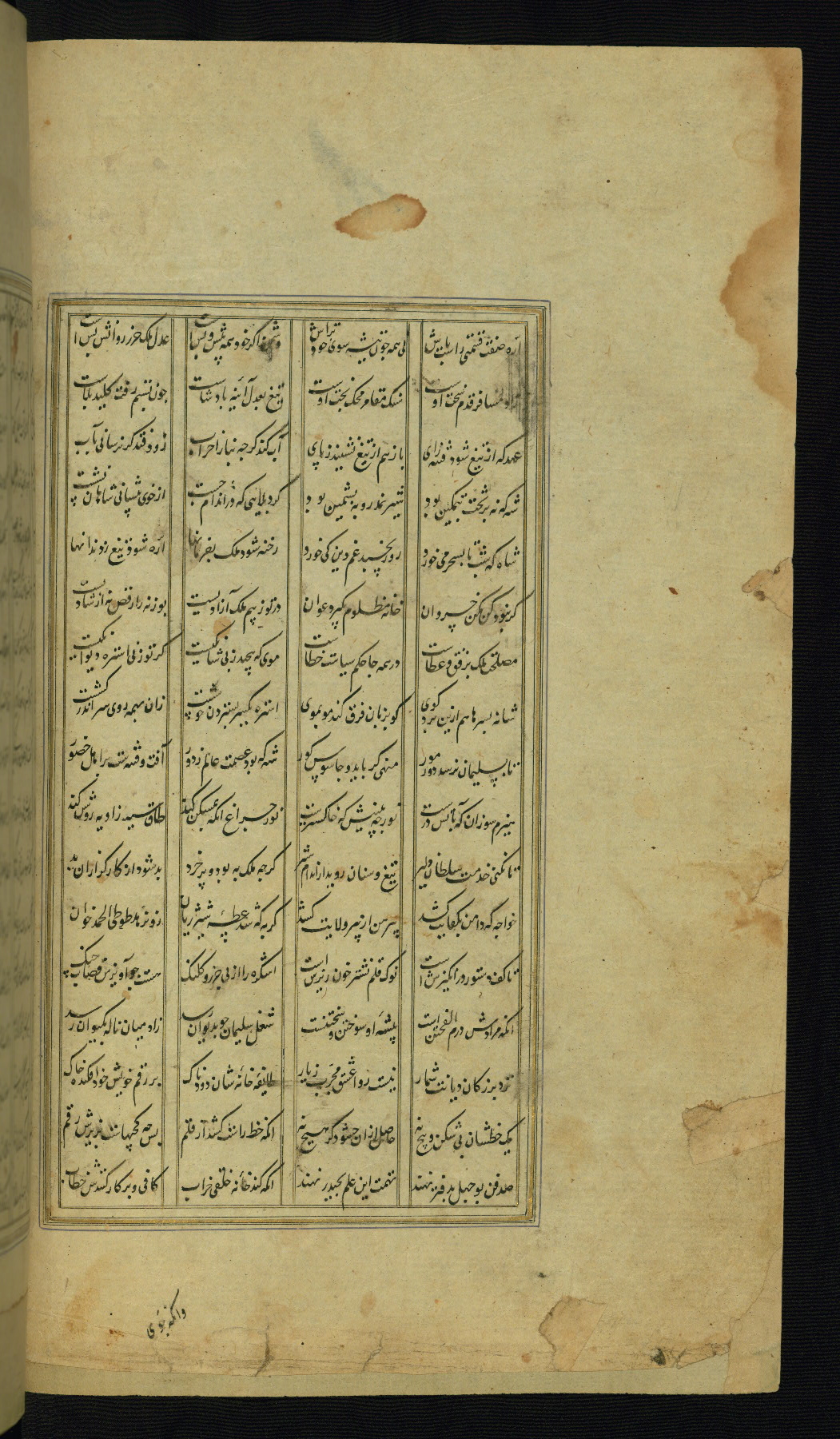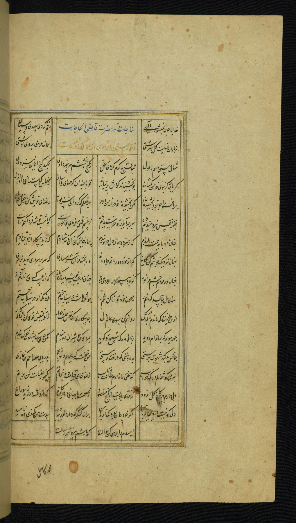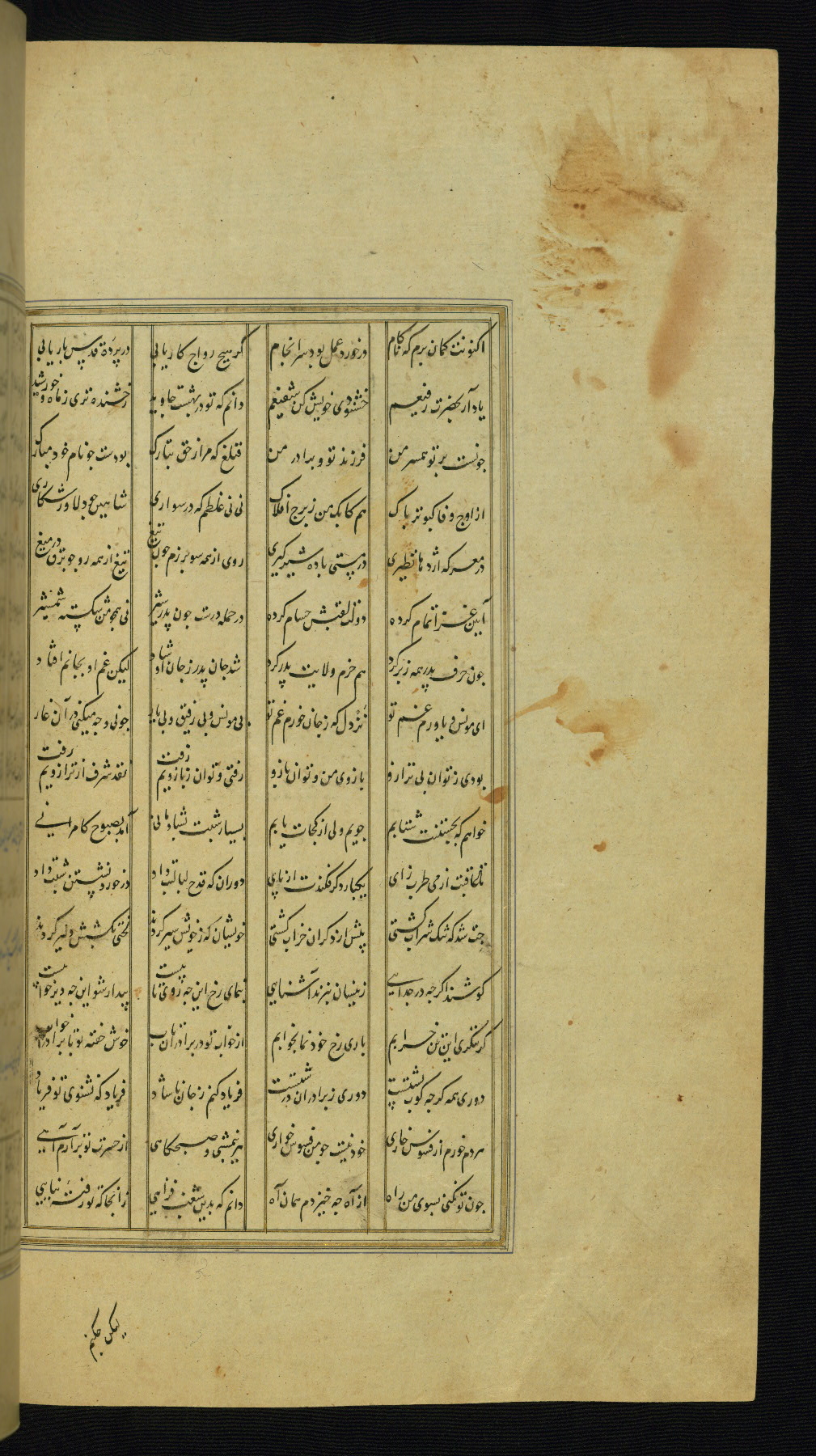 This is an illustrated and illuminated Safavid copy of the Khamsah (quintet) of Amīr Khusraw Dihlavī (d. 725 AH / 1325 CE), written by Pīr Ḥusayn al-Kātib al-Shīrāzī in 935 AH / 1529 CE. The codex opens with a double-page illuminated frontispiece with verses in honor of the poet Mir (Amir) Khusraw (fols. 1b-2a). There are four illuminated incipit pages introducing the individual poems, and thirteen paintings illustrate the text. The lacquer binding, which is not original to the manuscript, has a hunting scene on the upper and lower boards. The lower board is inscribed yā Shāh Najaf (oh, King of Najaf, i.e. ʿAlī) and is dated 1271 AH / 1854 CE.