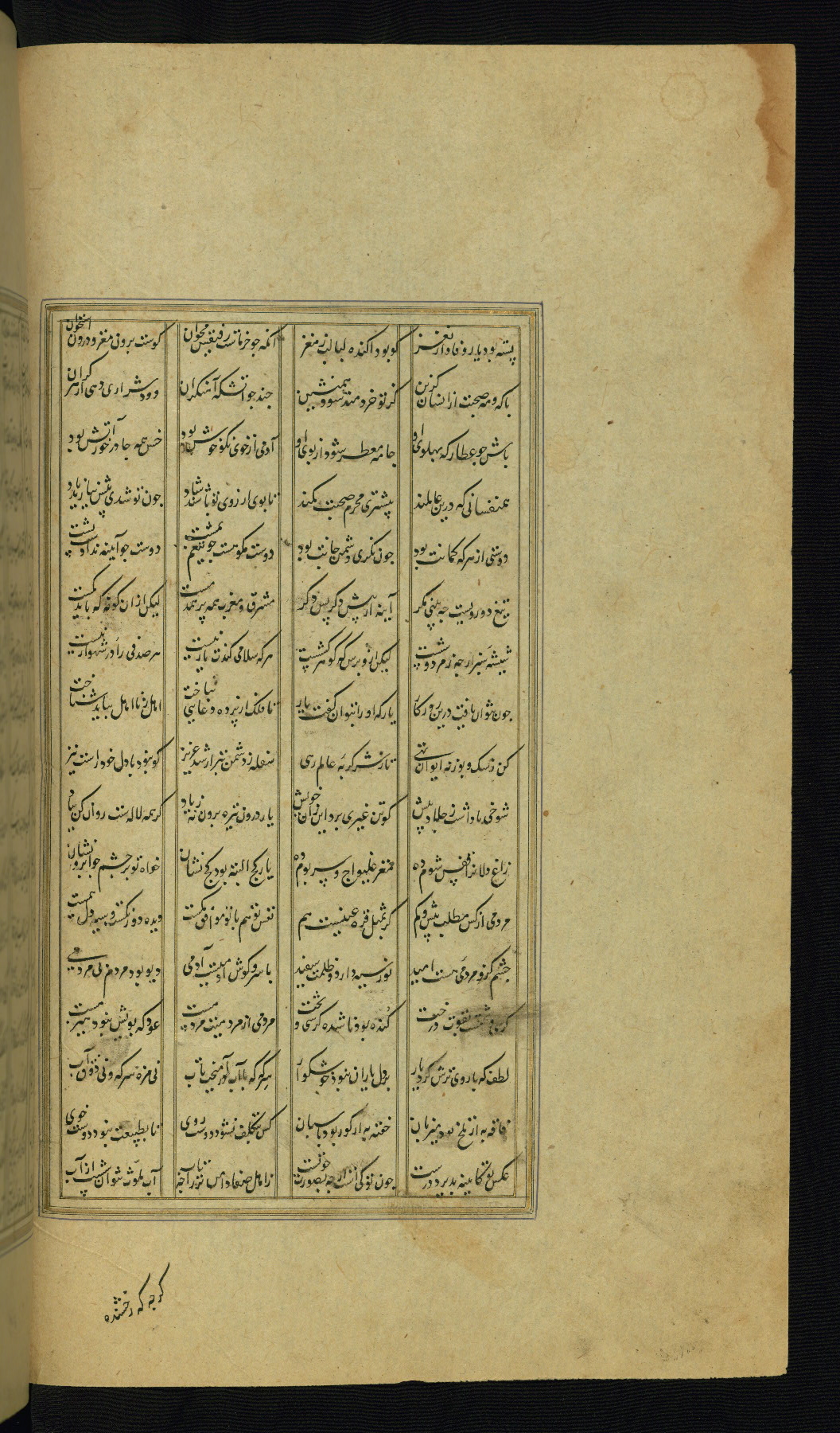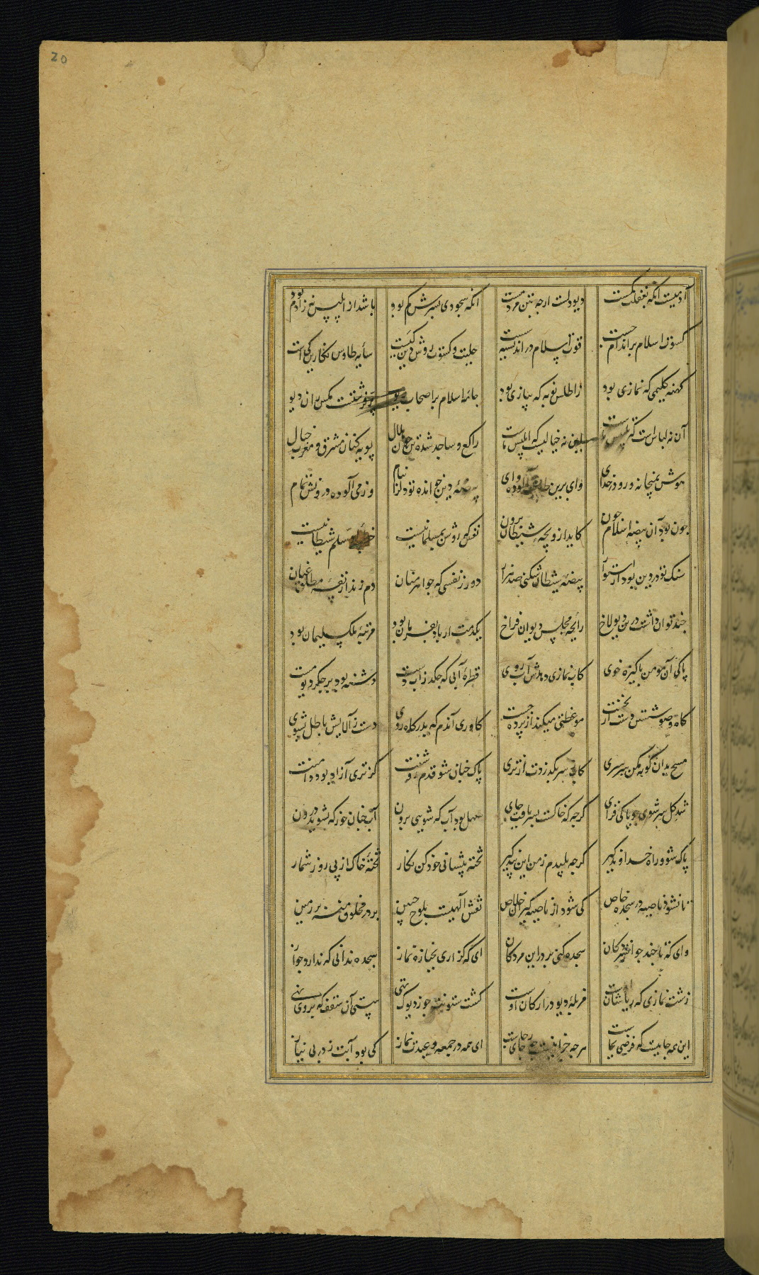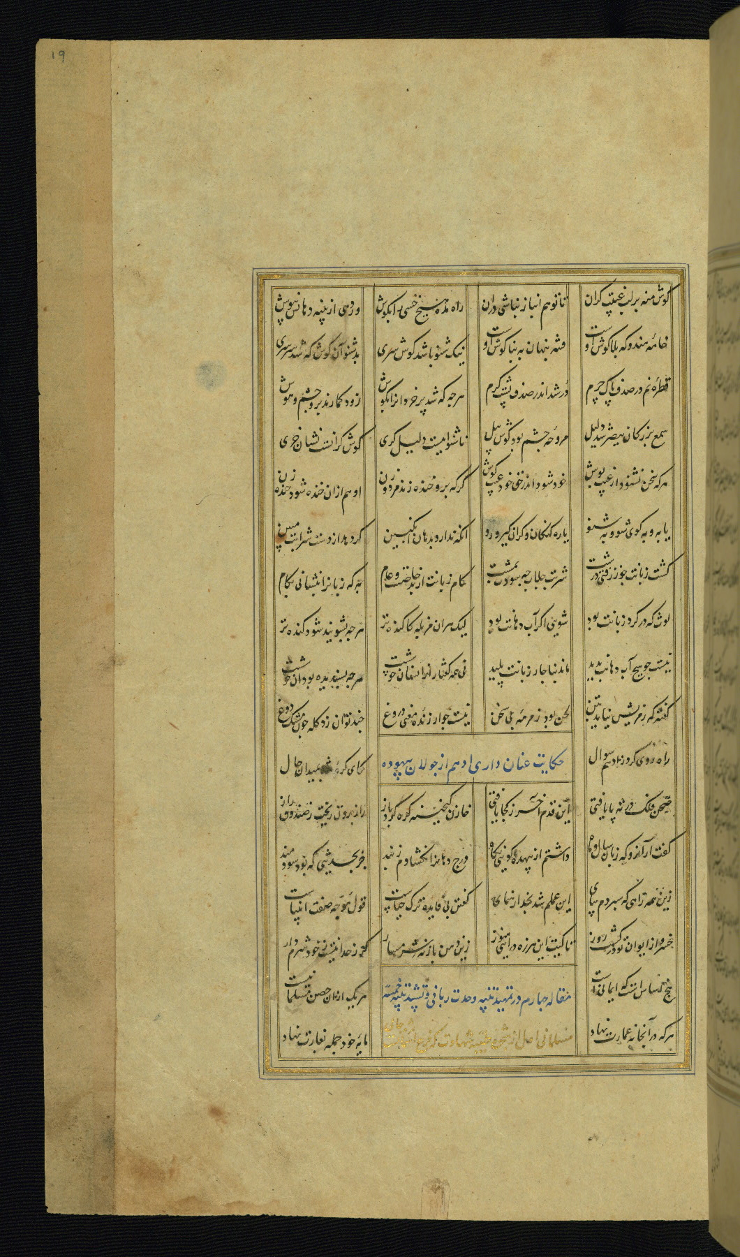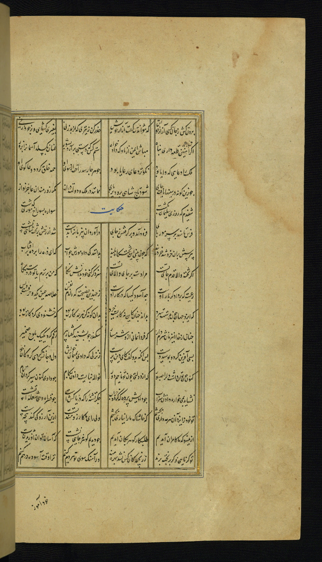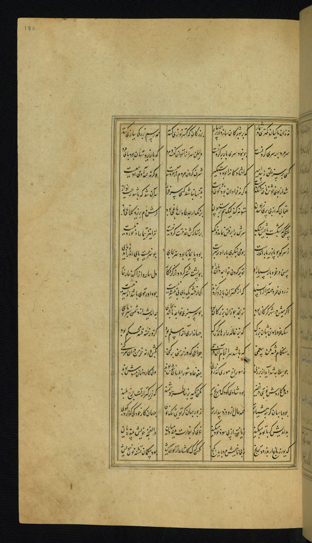 This is an illustrated and illuminated Safavid copy of the Khamsah (quintet) of Amīr Khusraw Dihlavī (d. 725 AH / 1325 CE), written by Pīr Ḥusayn al-Kātib al-Shīrāzī in 935 AH / 1529 CE. The codex opens with a double-page illuminated frontispiece with verses in honor of the poet Mir (Amir) Khusraw (fols. 1b-2a). There are four illuminated incipit pages introducing the individual poems, and thirteen paintings illustrate the text. The lacquer binding, which is not original to the manuscript, has a hunting scene on the upper and lower boards. The lower board is inscribed yā Shāh Najaf (oh, King of Najaf, i.e. ʿAlī) and is dated 1271 AH / 1854 CE.
