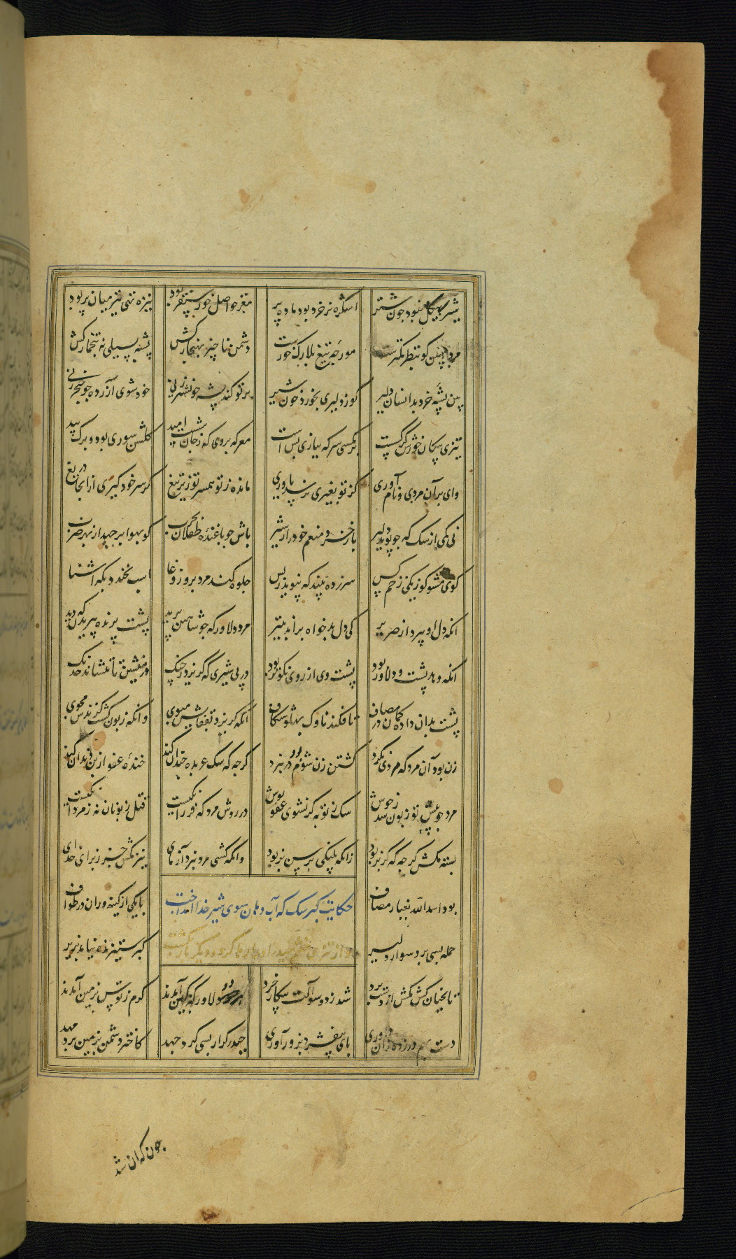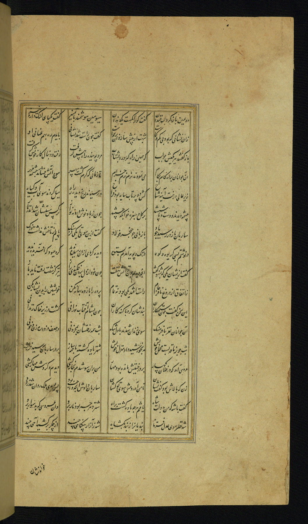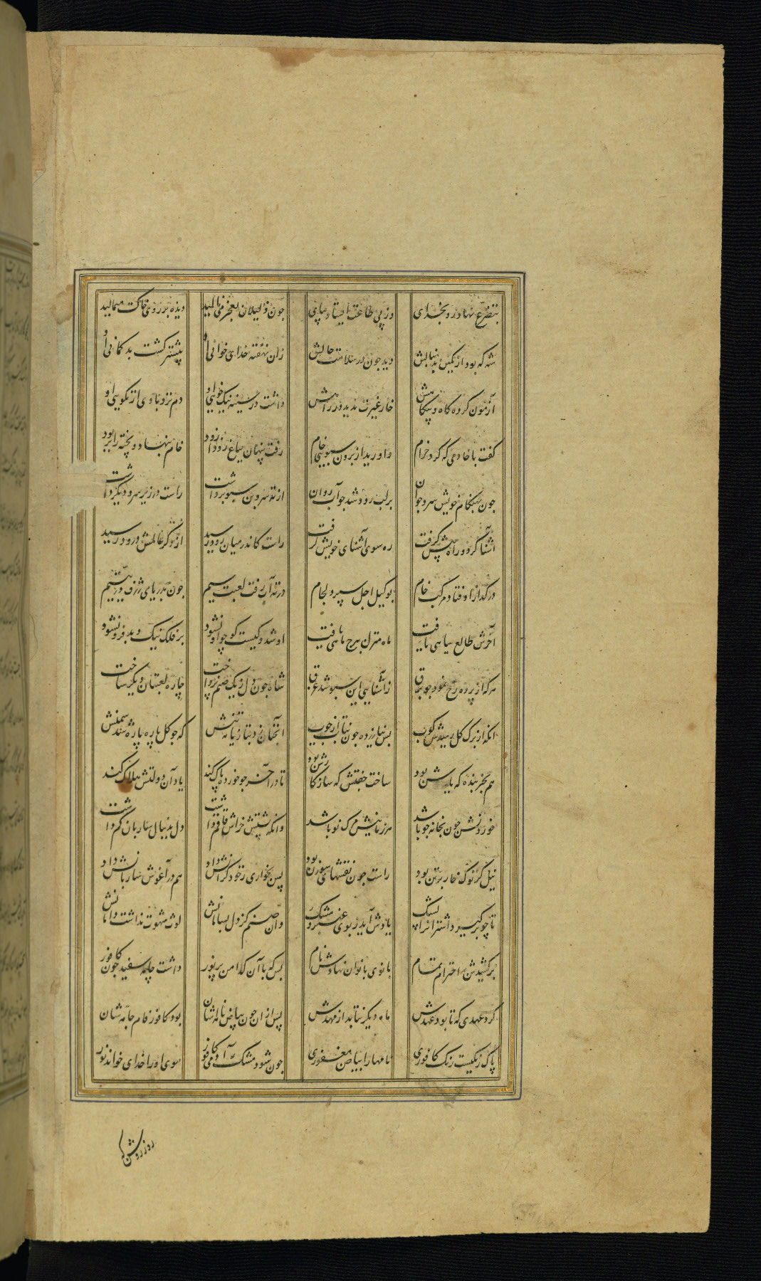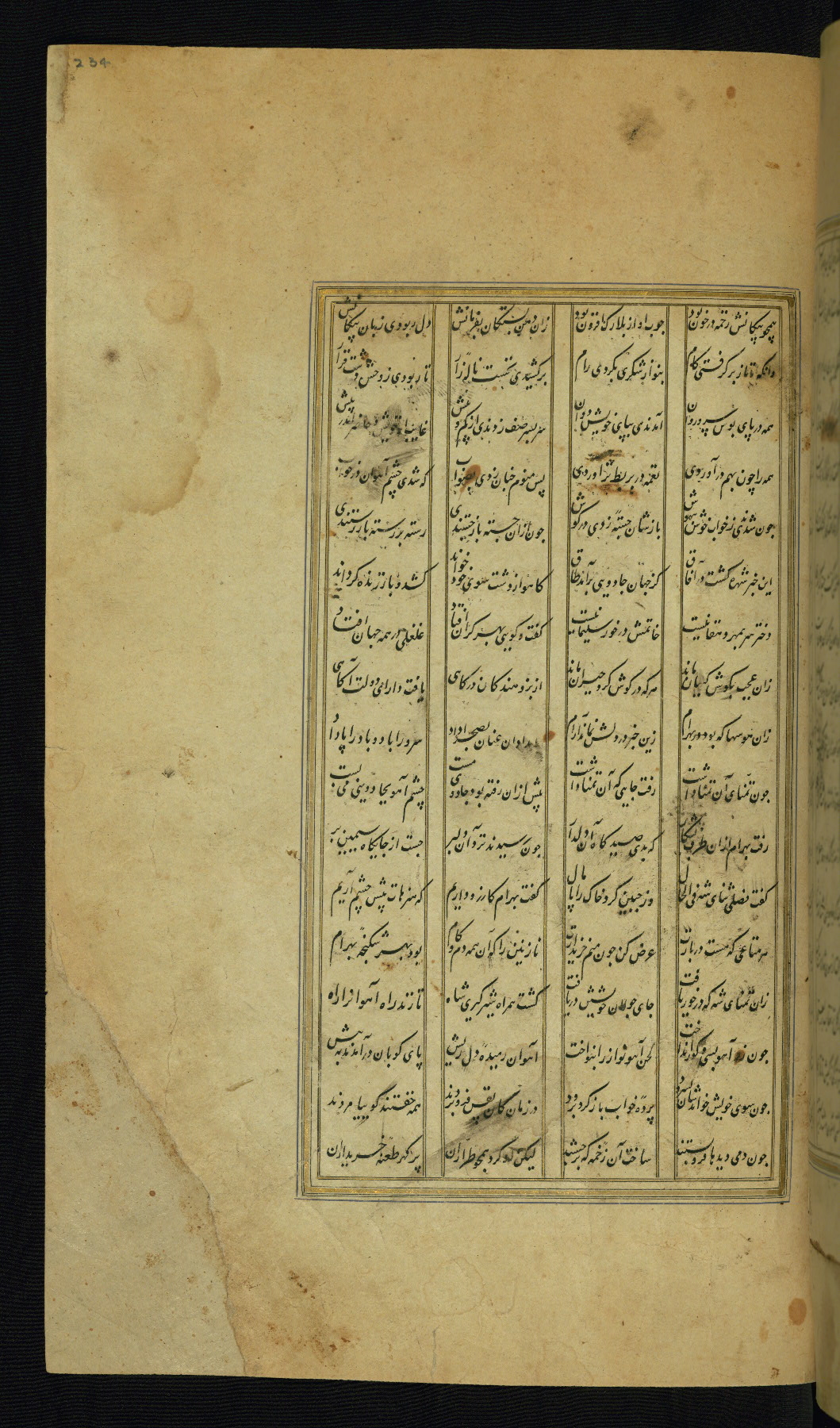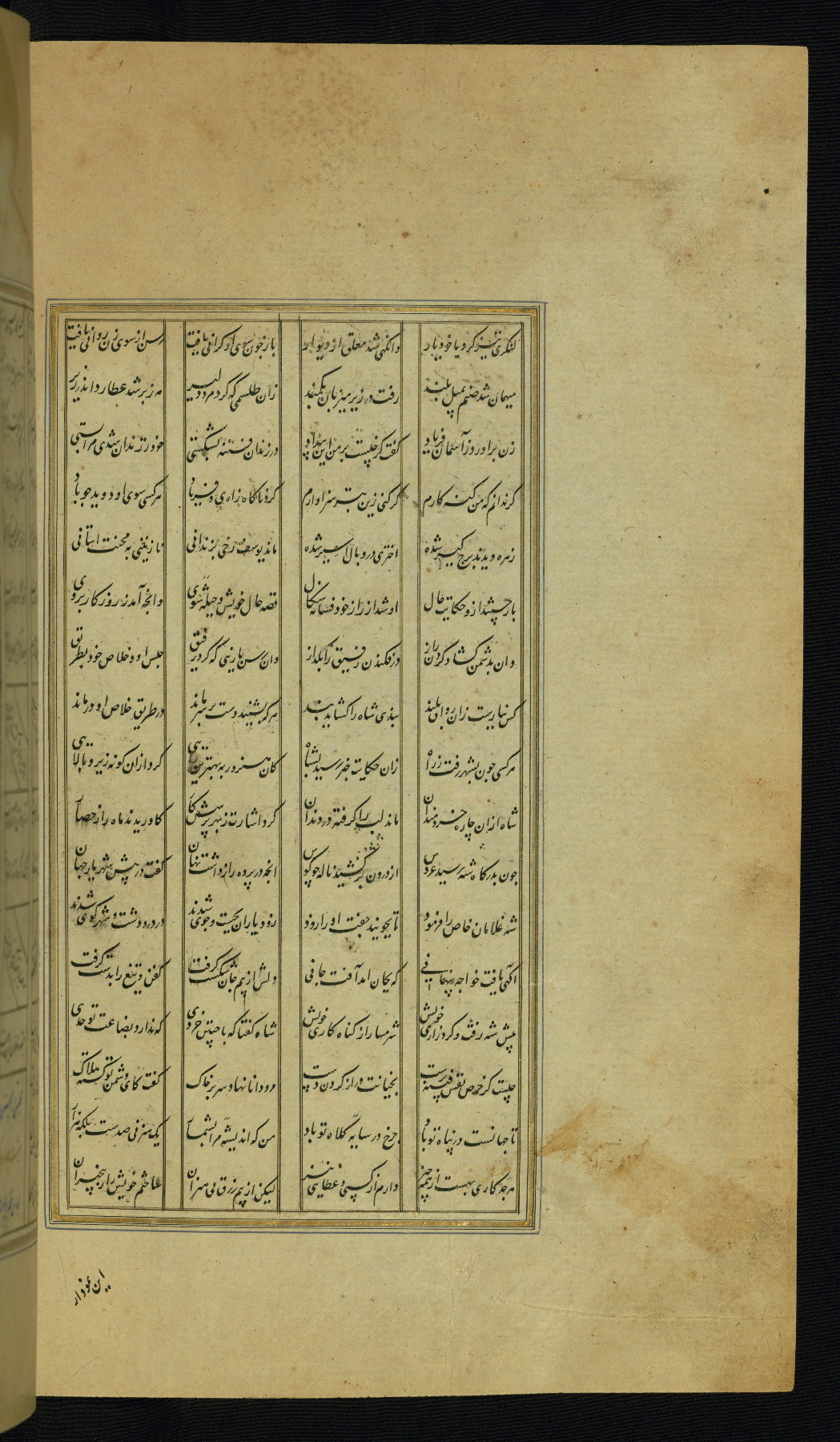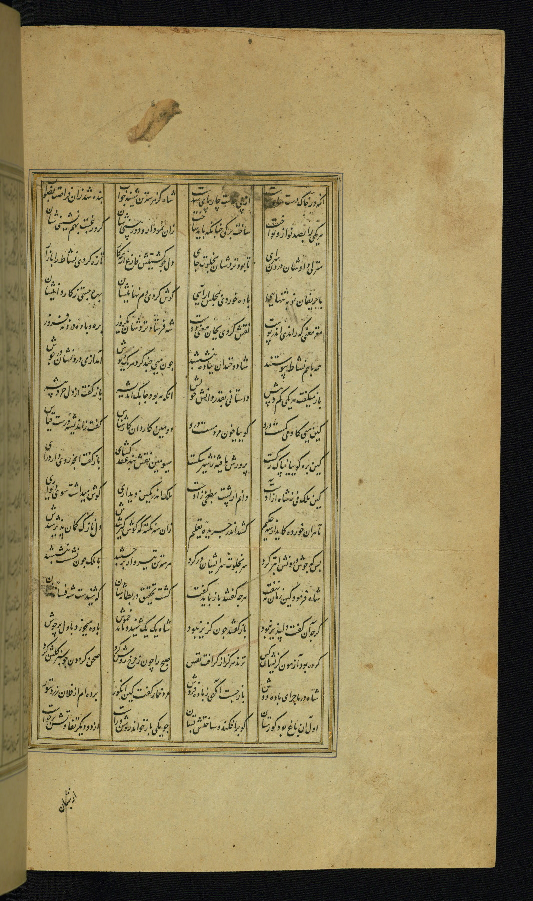This is an illustrated and illuminated Safavid copy of the Khamsah (quintet) of Amīr Khusraw Dihlavī (d. 725 AH / 1325 CE), written by Pīr Ḥusayn al-Kātib al-Shīrāzī in 935 AH / 1529 CE. The codex opens with a double-page illuminated frontispiece with verses in honor of the poet Mir (Amir) Khusraw (fols. 1b-2a). There are four illuminated incipit pages introducing the individual poems, and thirteen paintings illustrate the text. The lacquer binding, which is not original to the manuscript, has a hunting scene on the upper and lower boards. The lower board is inscribed yā Shāh Najaf (oh, King of Najaf, i.e. ʿAlī) and is dated 1271 AH / 1854 CE.