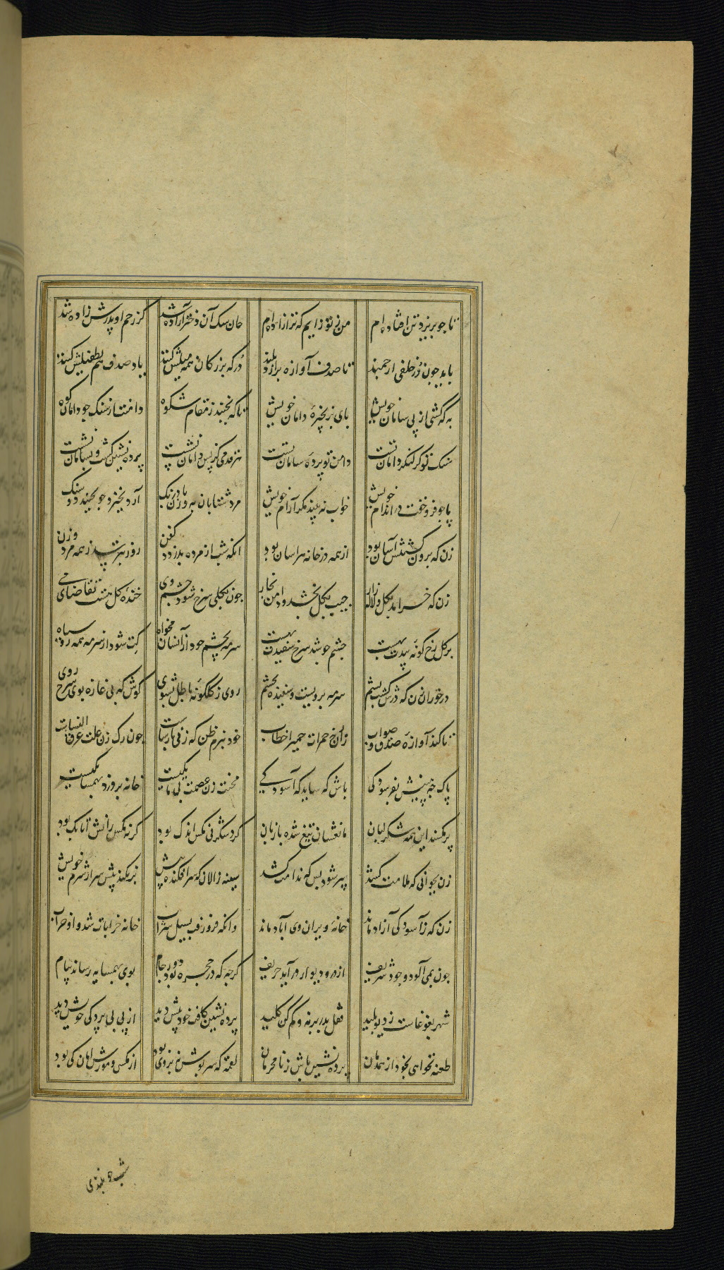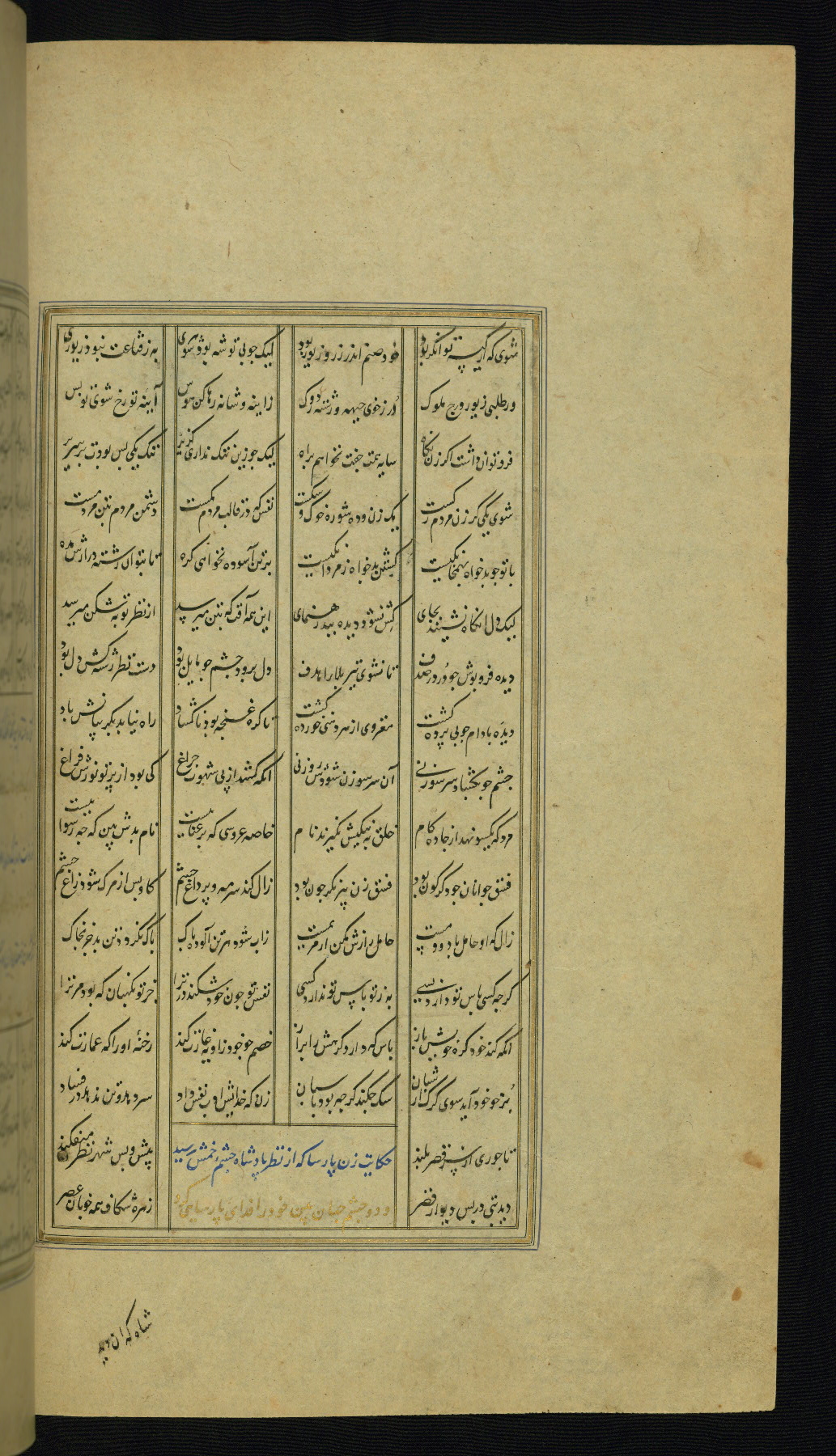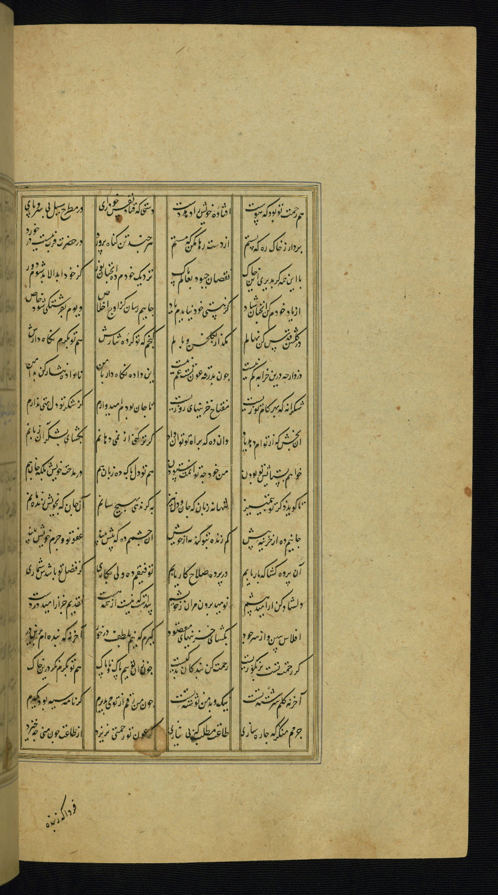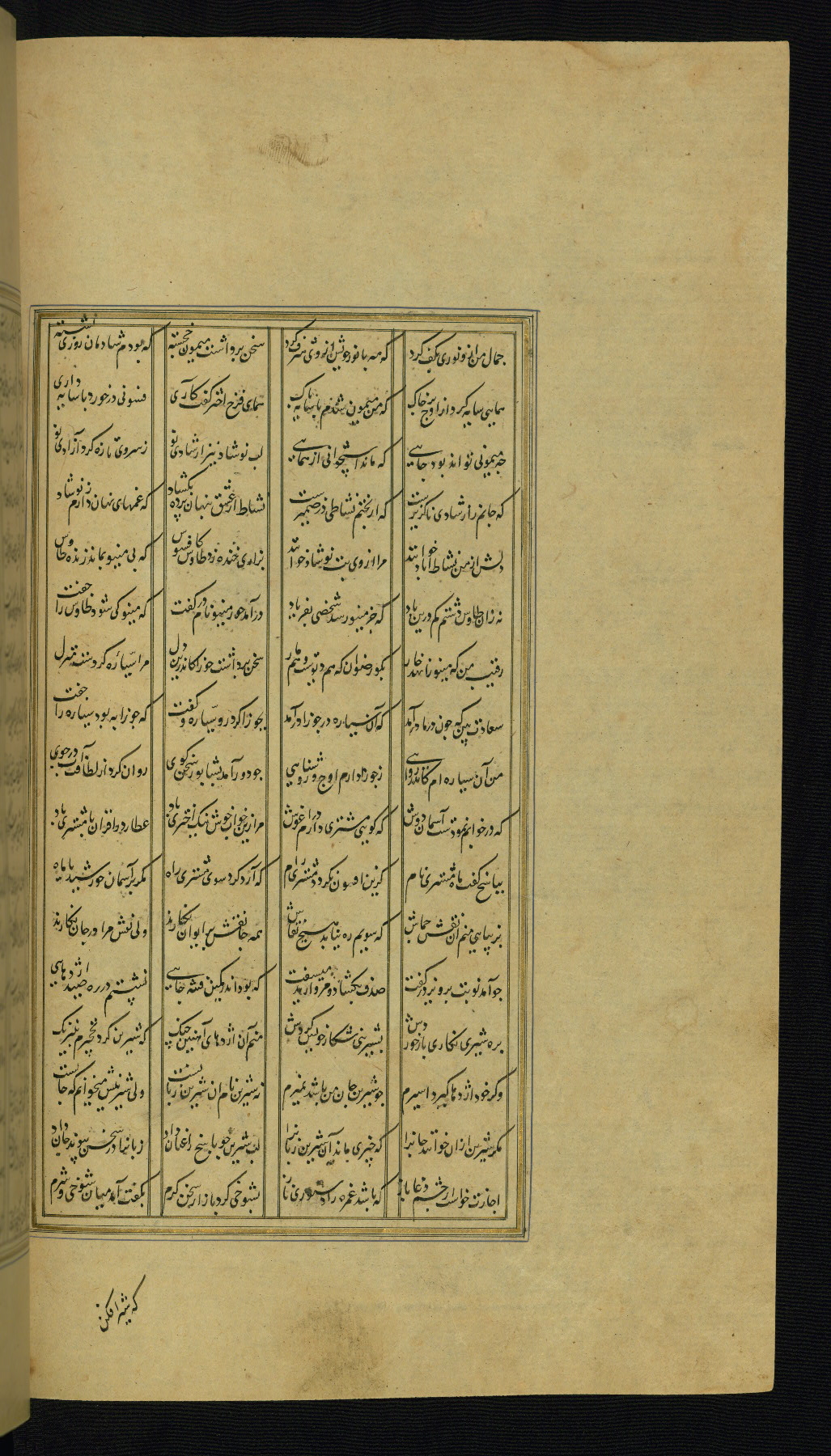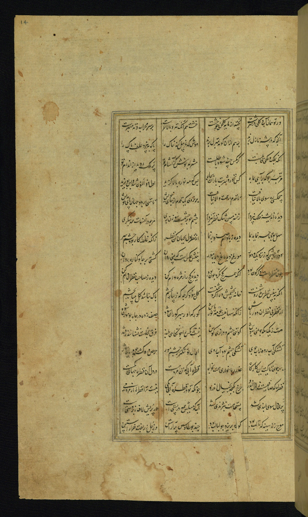This is an illustrated and illuminated Safavid copy of the Khamsah (quintet) of Amīr Khusraw Dihlavī (d. 725 AH / 1325 CE), written by Pīr Ḥusayn al-Kātib al-Shīrāzī in 935 AH / 1529 CE. The codex opens with a double-page illuminated frontispiece with verses in honor of the poet Mir (Amir) Khusraw (fols. 1b-2a). There are four illuminated incipit pages introducing the individual poems, and thirteen paintings illustrate the text. The lacquer binding, which is not original to the manuscript, has a hunting scene on the upper and lower boards. The lower board is inscribed yā Shāh Najaf (oh, King of Najaf, i.e. ʿAlī) and is dated 1271 AH / 1854 CE.
