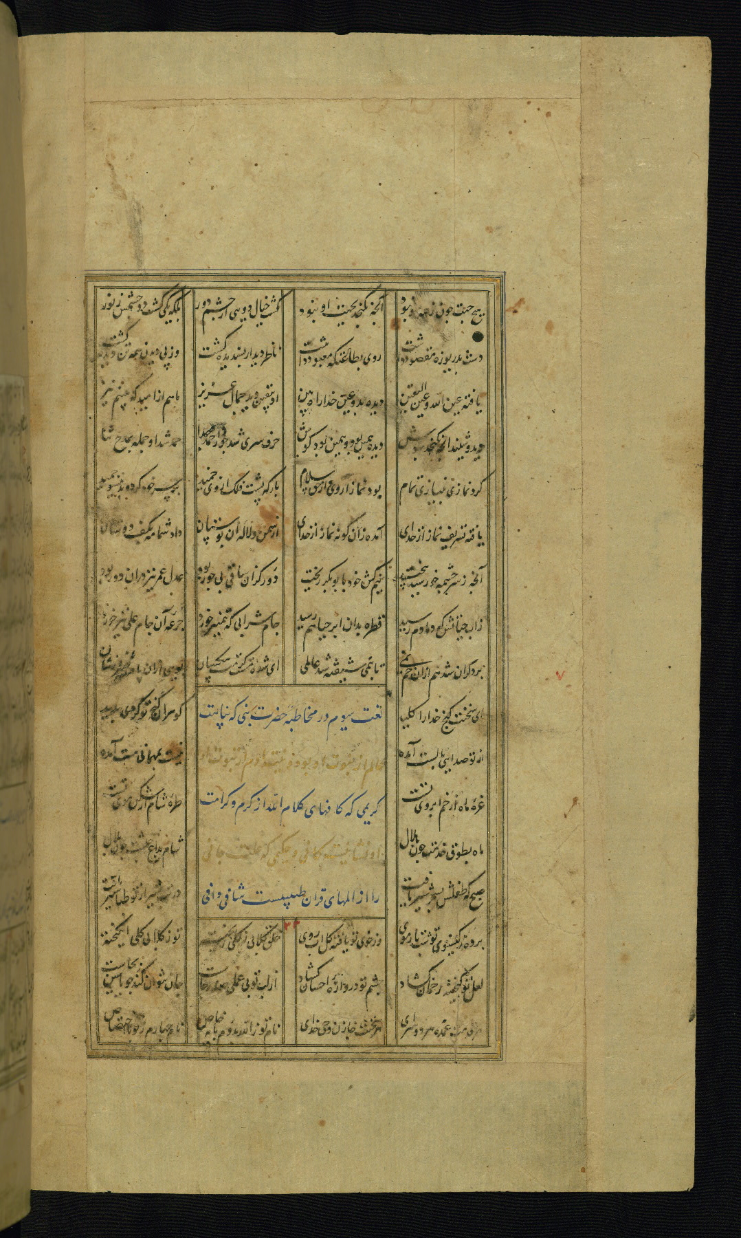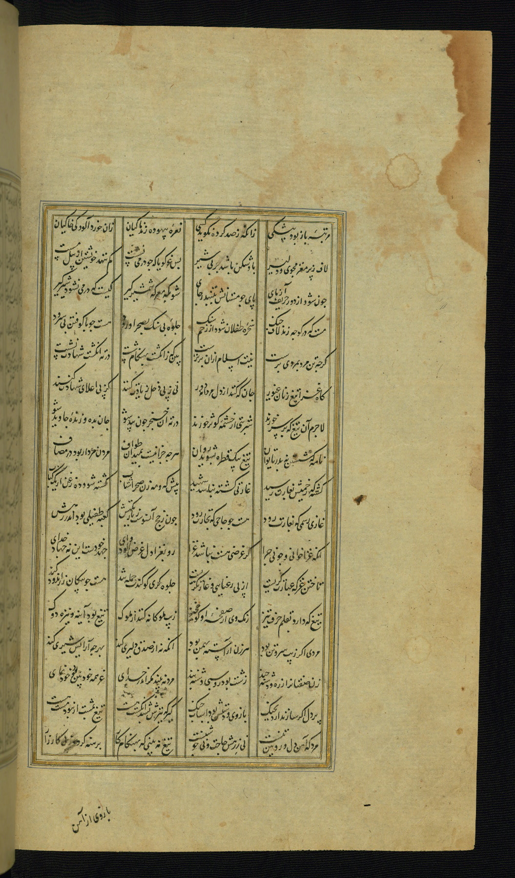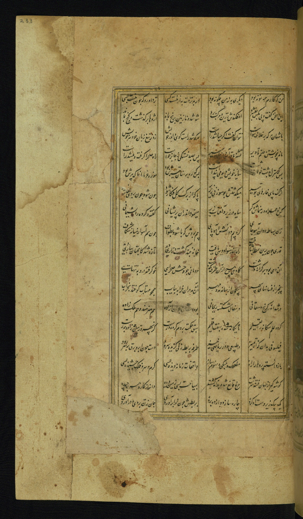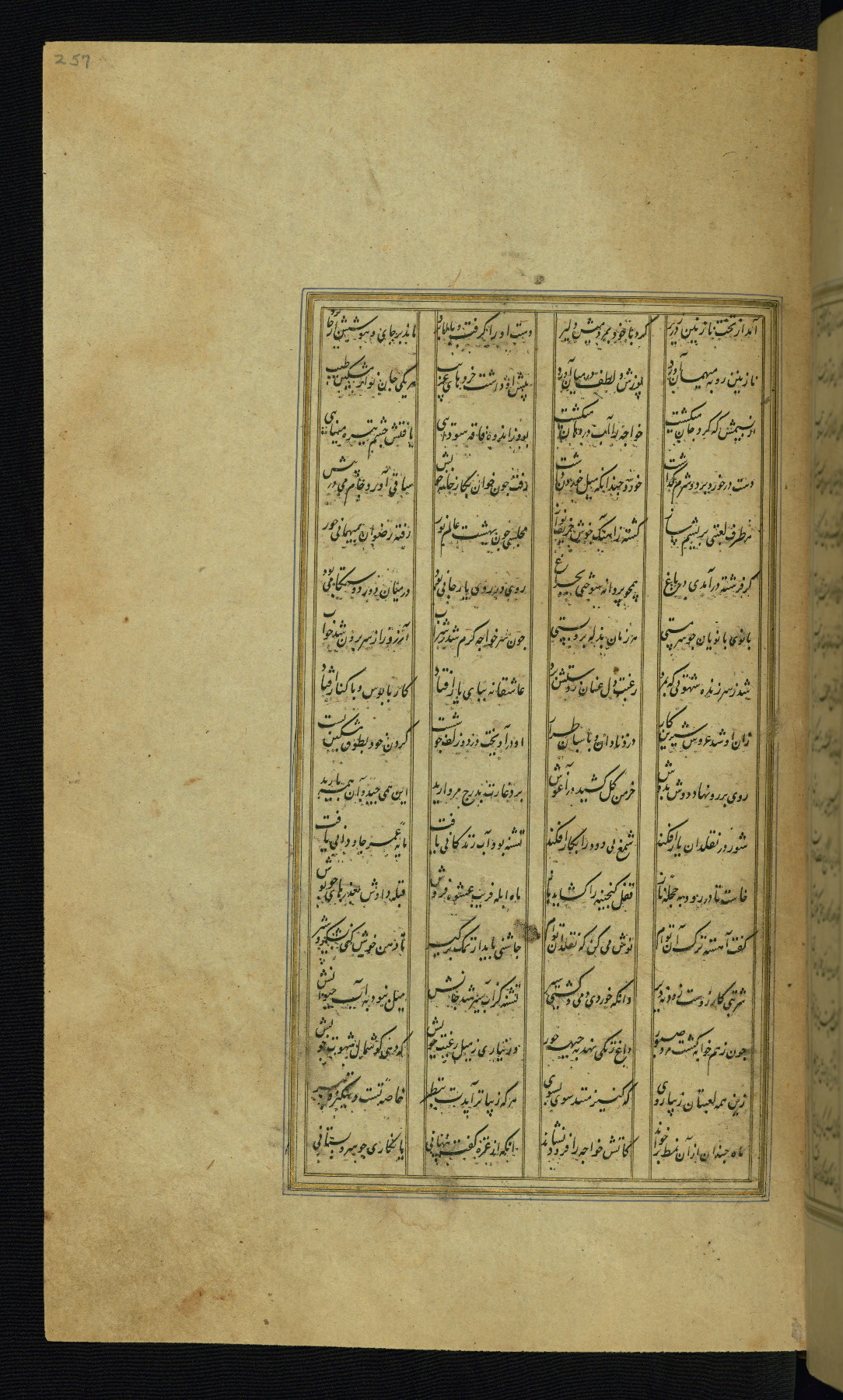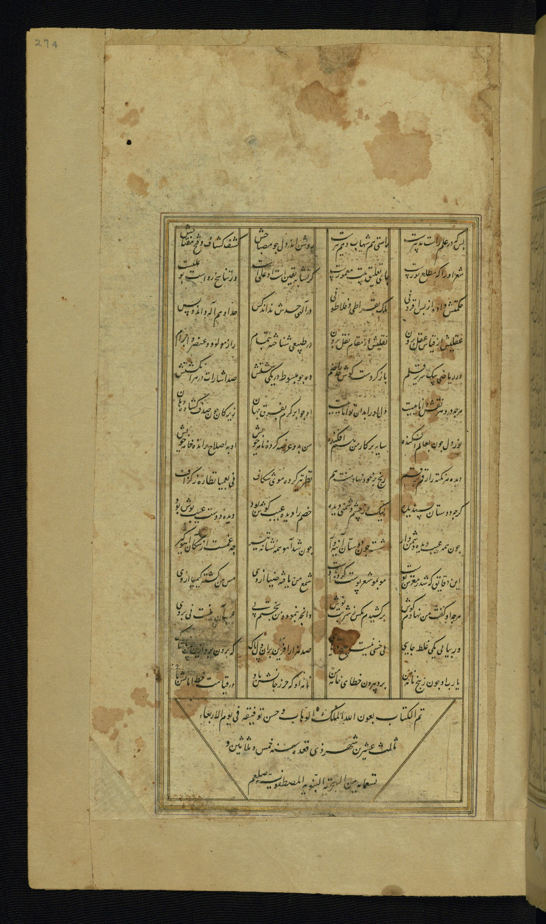 This is an illustrated and illuminated Safavid copy of the Khamsah (quintet) of Amīr Khusraw Dihlavī (d. 725 AH / 1325 CE), written by Pīr Ḥusayn al-Kātib al-Shīrāzī in 935 AH / 1529 CE. The codex opens with a double-page illuminated frontispiece with verses in honor of the poet Mir (Amir) Khusraw (fols. 1b-2a). There are four illuminated incipit pages introducing the individual poems, and thirteen paintings illustrate the text. The lacquer binding, which is not original to the manuscript, has a hunting scene on the upper and lower boards. The lower board is inscribed yā Shāh Najaf (oh, King of Najaf, i.e. ʿAlī) and is dated 1271 AH / 1854 CE.