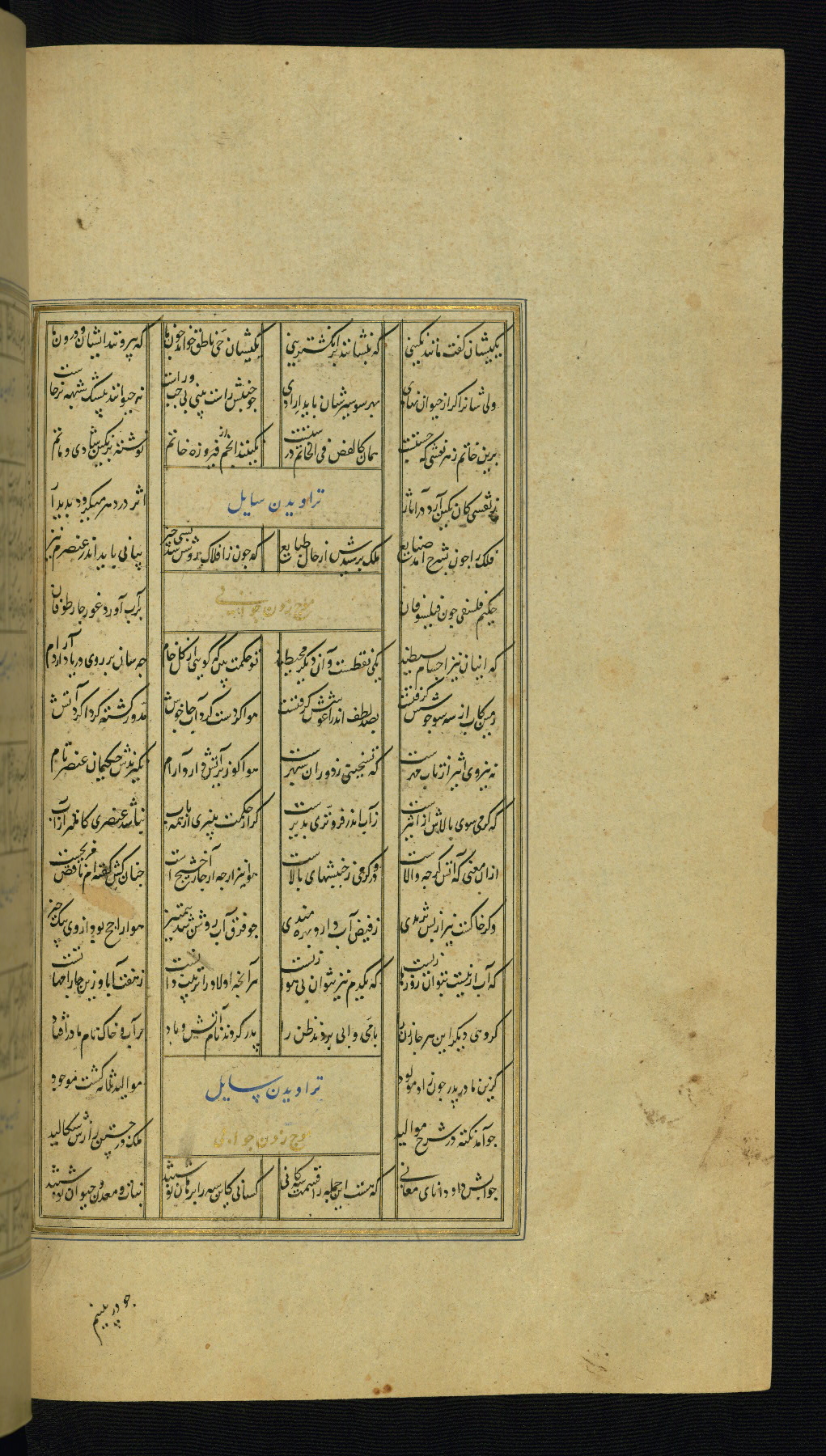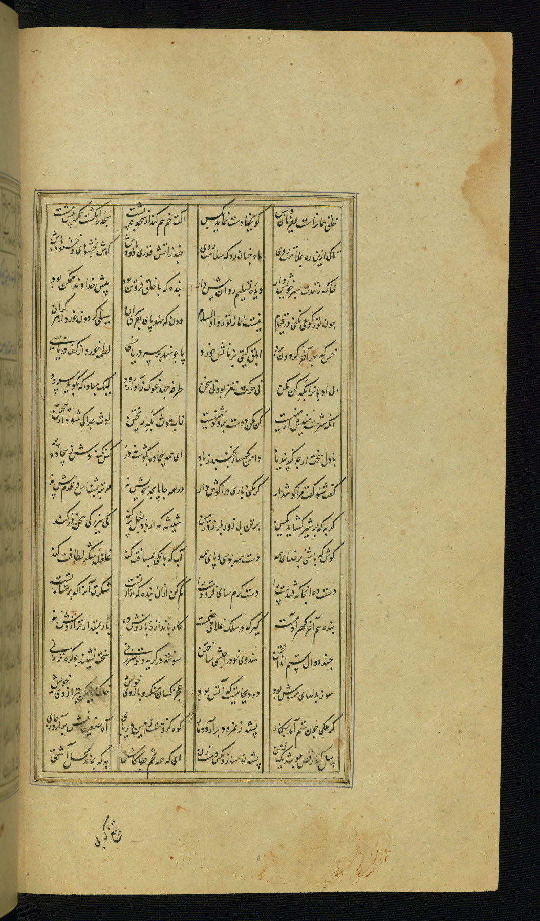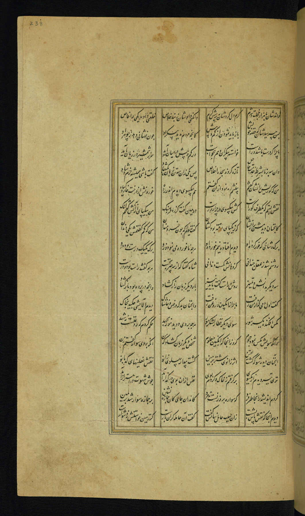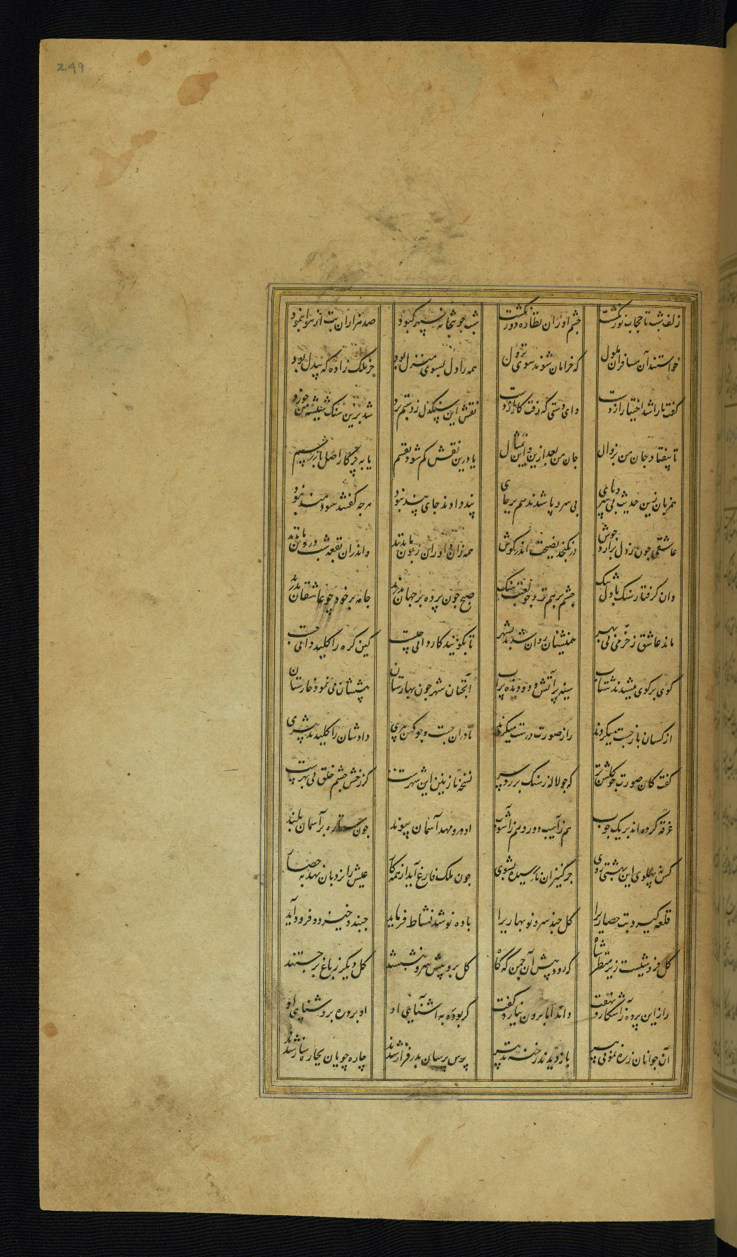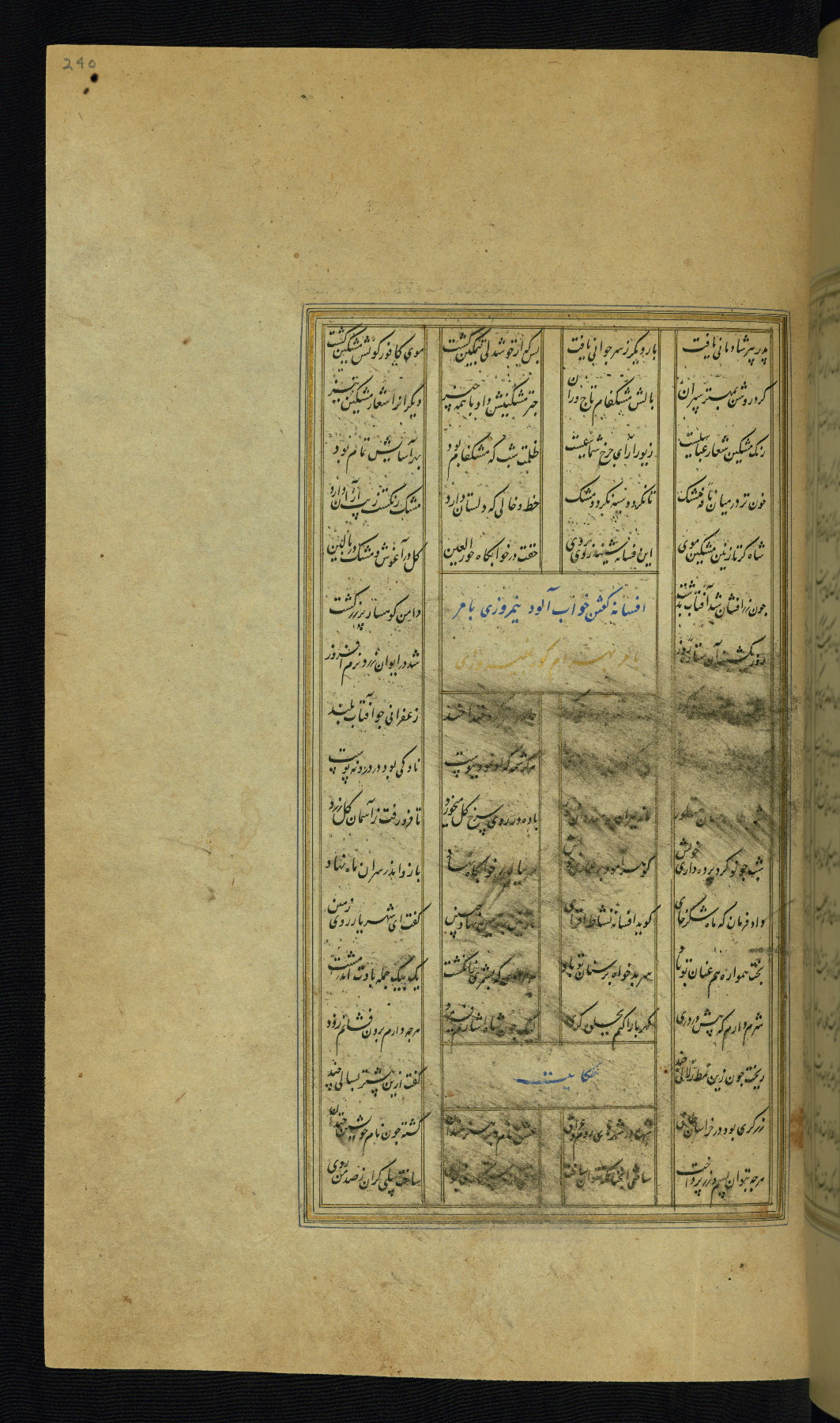 This is an illustrated and illuminated Safavid copy of the Khamsah (quintet) of Amīr Khusraw Dihlavī (d. 725 AH / 1325 CE), written by Pīr Ḥusayn al-Kātib al-Shīrāzī in 935 AH / 1529 CE. The codex opens with a double-page illuminated frontispiece with verses in honor of the poet Mir (Amir) Khusraw (fols. 1b-2a). There are four illuminated incipit pages introducing the individual poems, and thirteen paintings illustrate the text. The lacquer binding, which is not original to the manuscript, has a hunting scene on the upper and lower boards. The lower board is inscribed yā Shāh Najaf (oh, King of Najaf, i.e. ʿAlī) and is dated 1271 AH / 1854 CE.