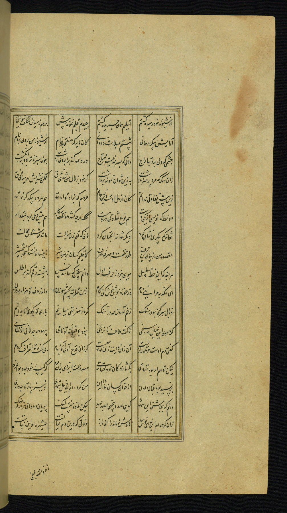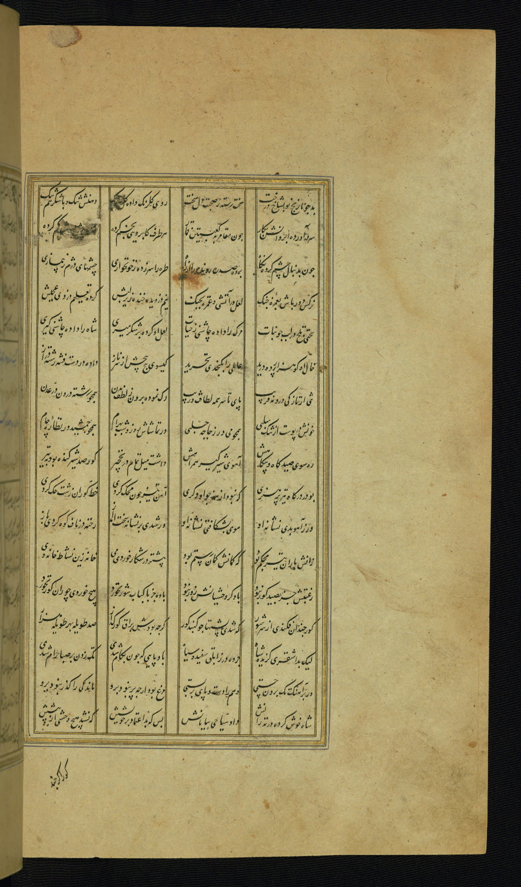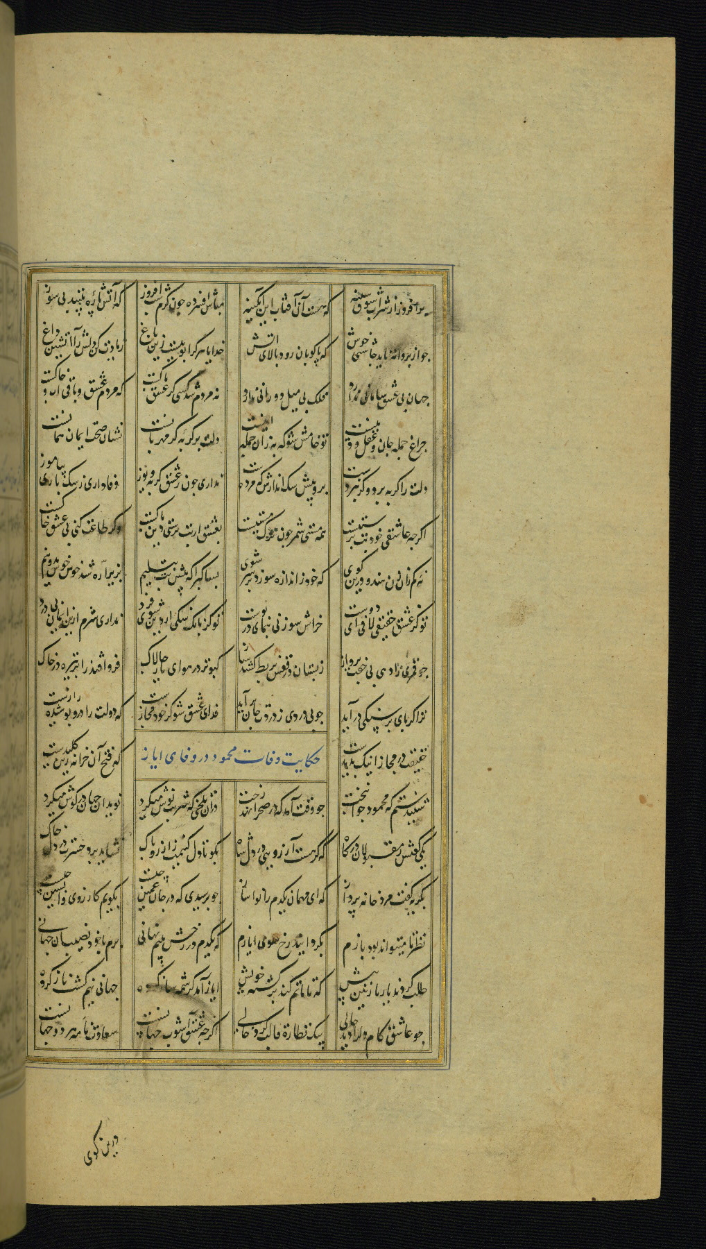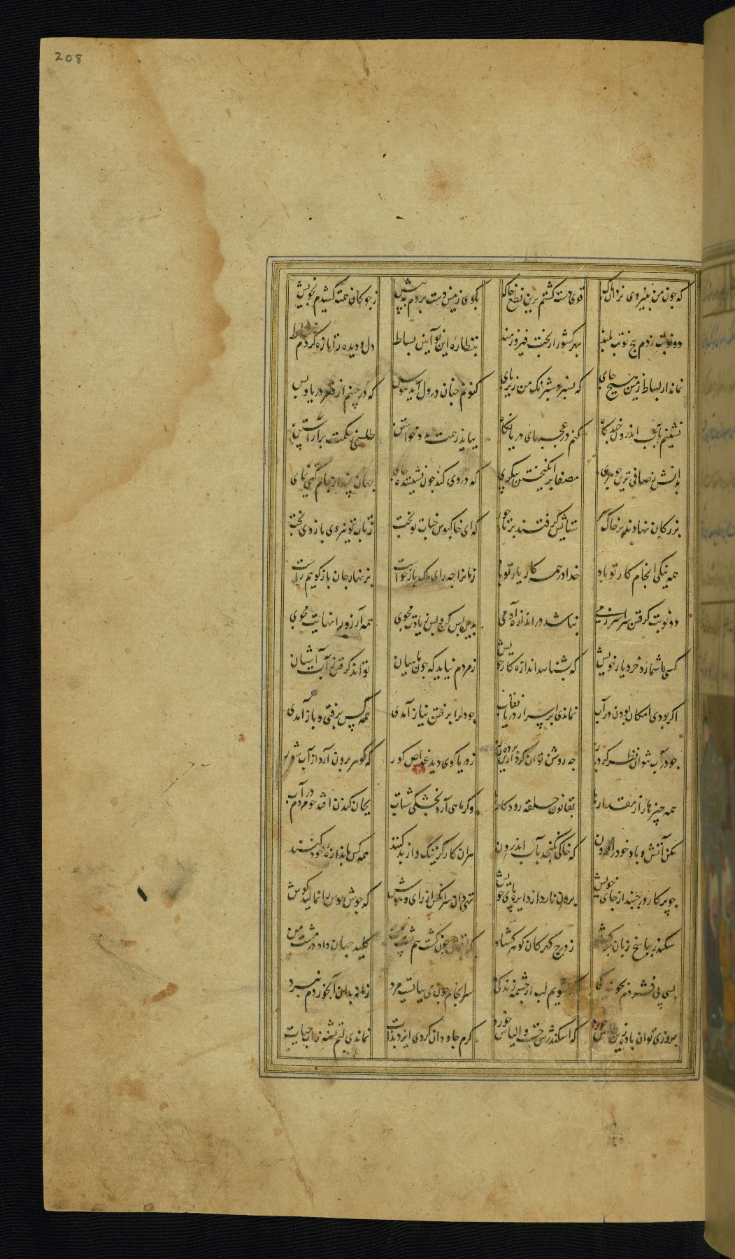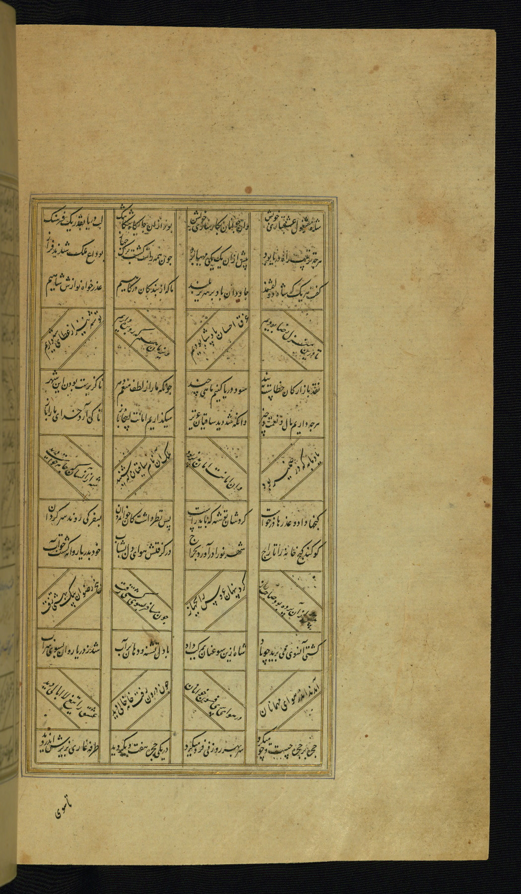 This is an illustrated and illuminated Safavid copy of the Khamsah (quintet) of Amīr Khusraw Dihlavī (d. 725 AH / 1325 CE), written by Pīr Ḥusayn al-Kātib al-Shīrāzī in 935 AH / 1529 CE. The codex opens with a double-page illuminated frontispiece with verses in honor of the poet Mir (Amir) Khusraw (fols. 1b-2a). There are four illuminated incipit pages introducing the individual poems, and thirteen paintings illustrate the text. The lacquer binding, which is not original to the manuscript, has a hunting scene on the upper and lower boards. The lower board is inscribed yā Shāh Najaf (oh, King of Najaf, i.e. ʿAlī) and is dated 1271 AH / 1854 CE.
