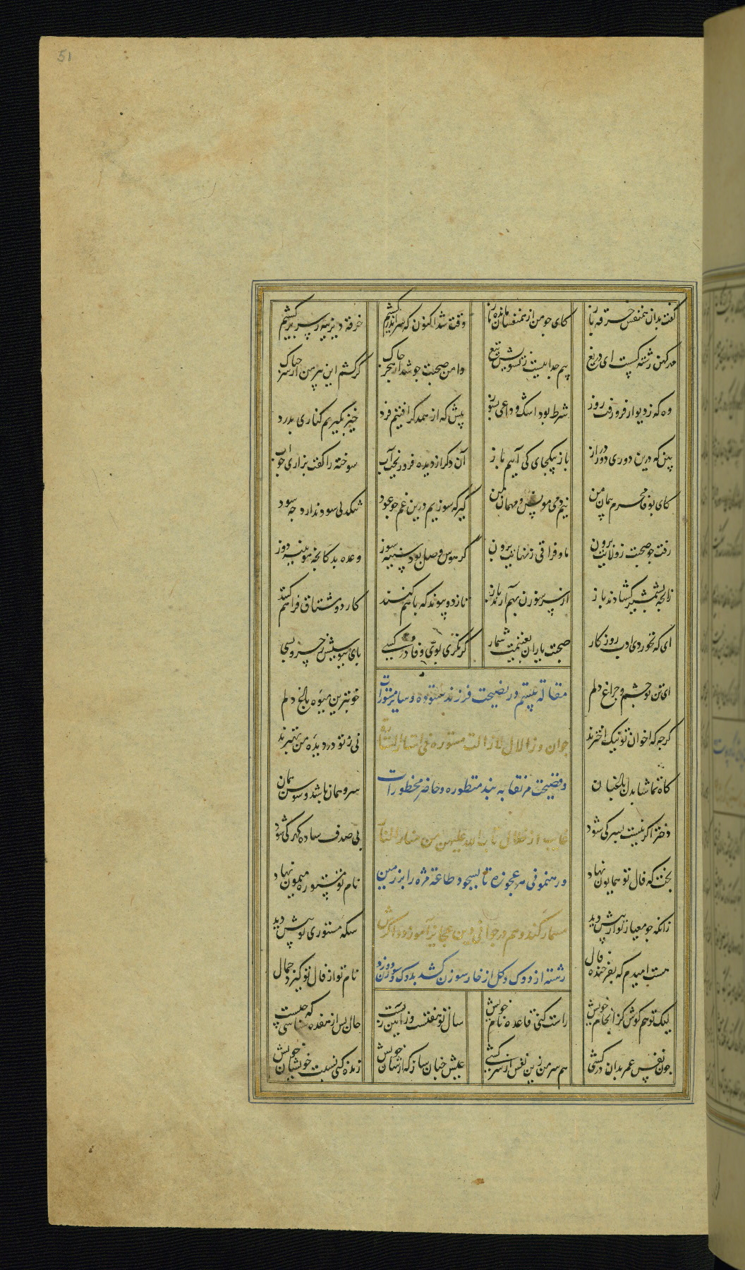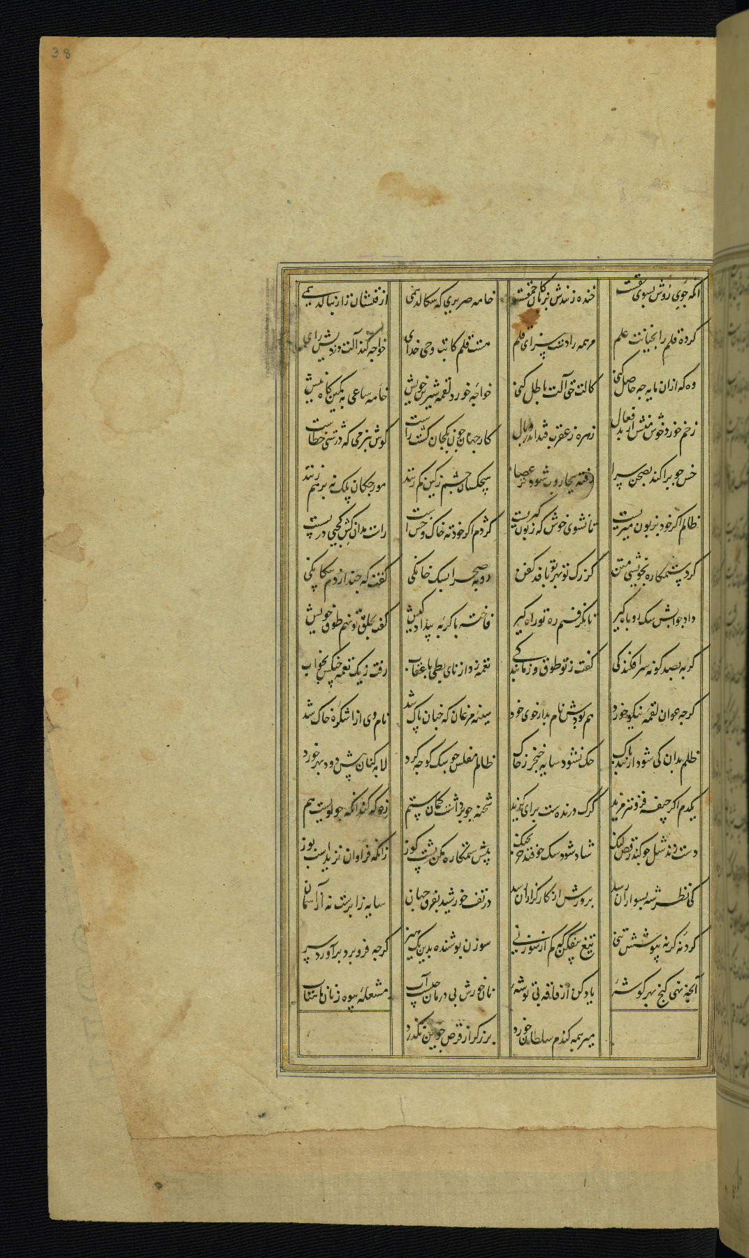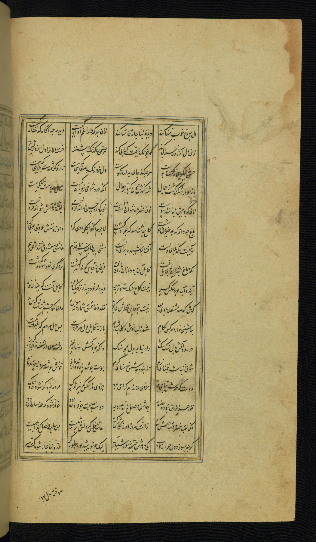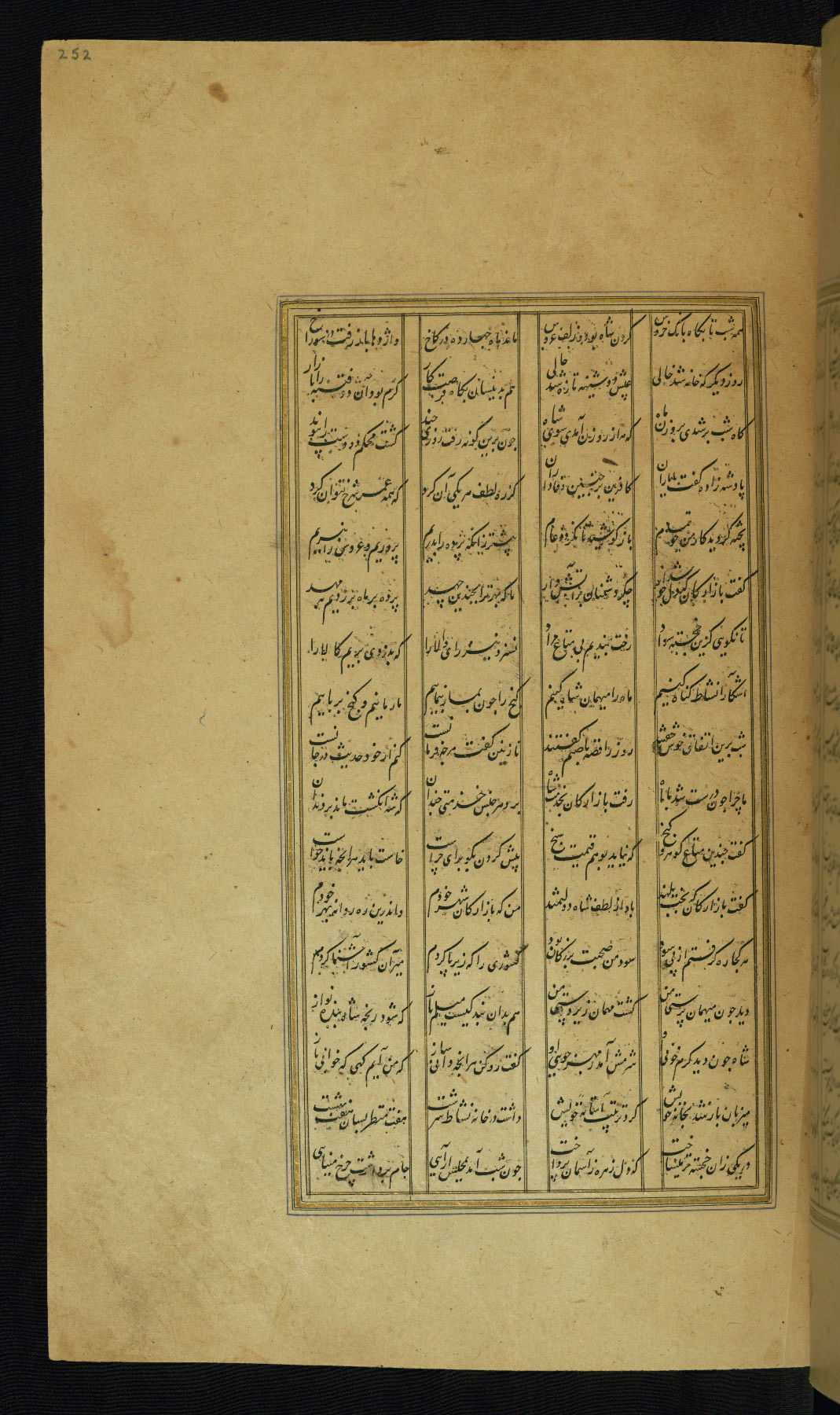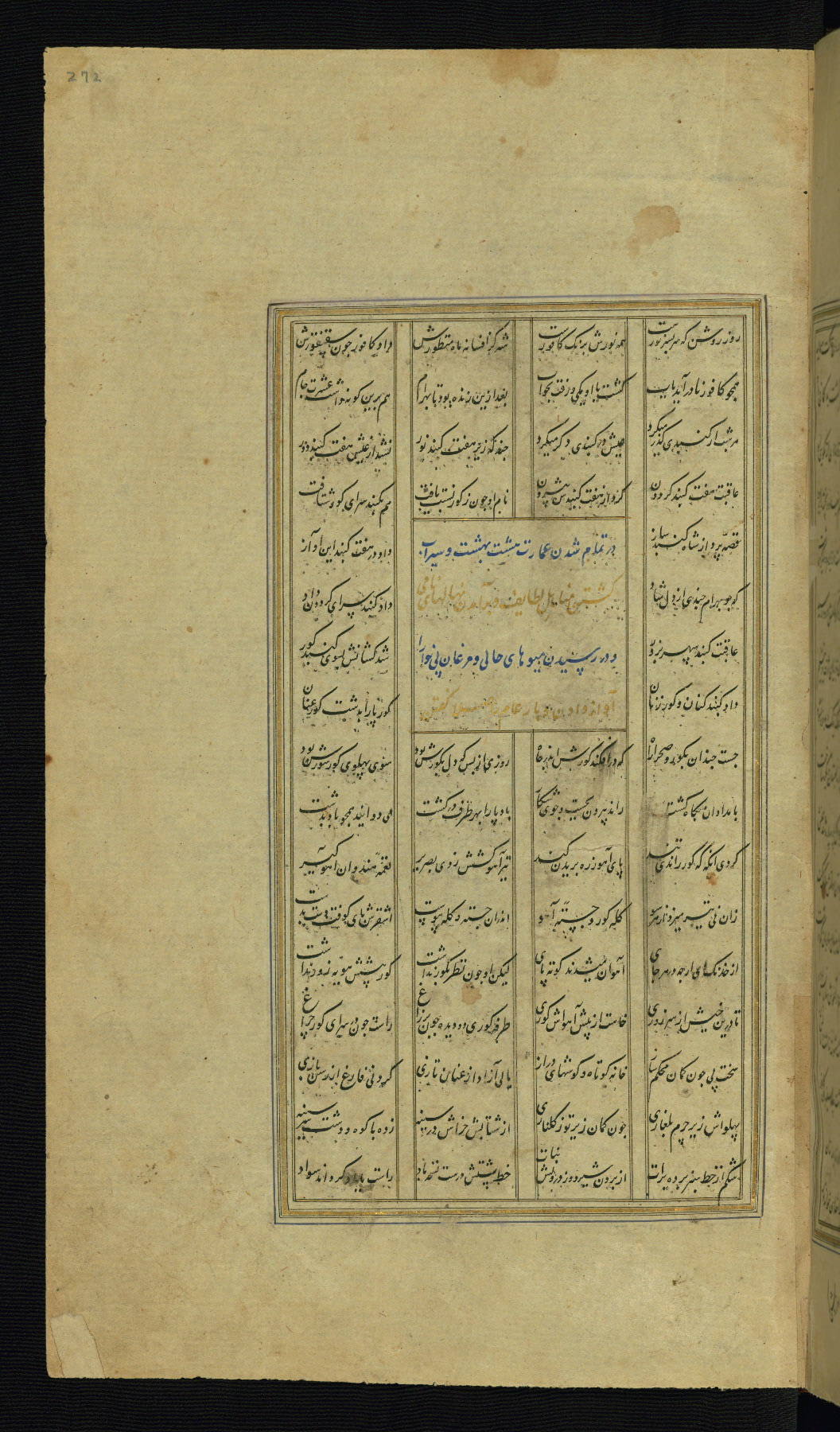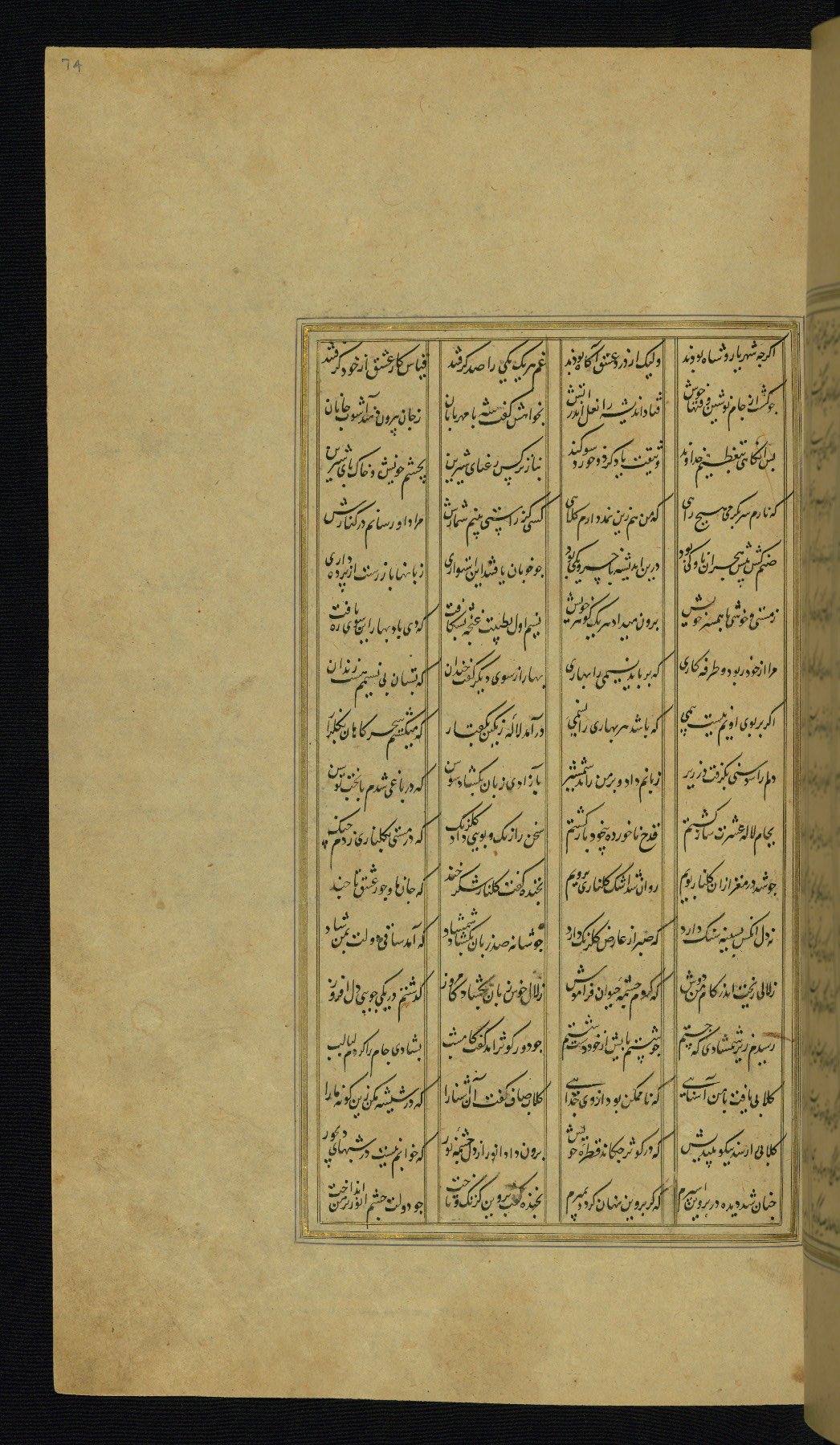 This is an illustrated and illuminated Safavid copy of the Khamsah (quintet) of Amīr Khusraw Dihlavī (d. 725 AH / 1325 CE), written by Pīr Ḥusayn al-Kātib al-Shīrāzī in 935 AH / 1529 CE. The codex opens with a double-page illuminated frontispiece with verses in honor of the poet Mir (Amir) Khusraw (fols. 1b-2a). There are four illuminated incipit pages introducing the individual poems, and thirteen paintings illustrate the text. The lacquer binding, which is not original to the manuscript, has a hunting scene on the upper and lower boards. The lower board is inscribed yā Shāh Najaf (oh, King of Najaf, i.e. ʿAlī) and is dated 1271 AH / 1854 CE.