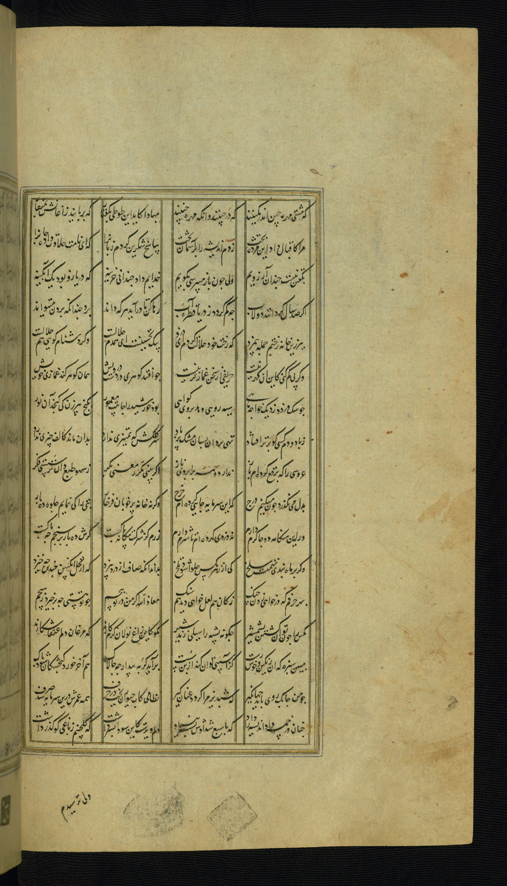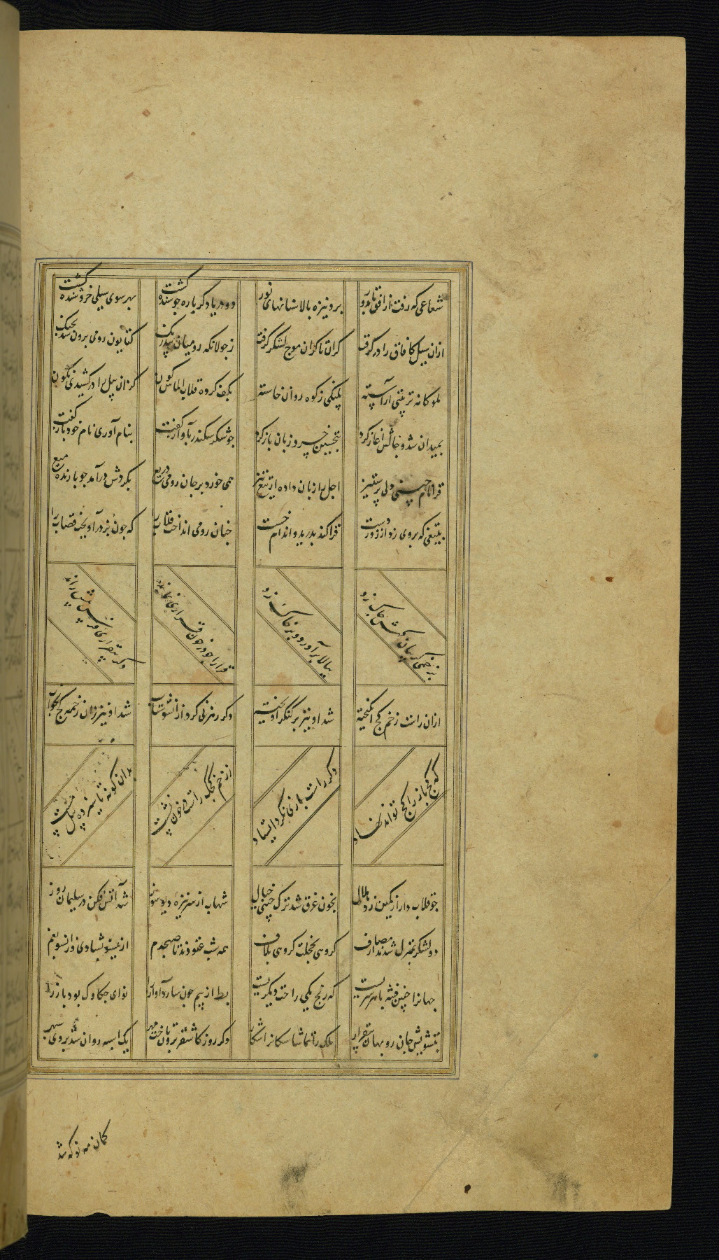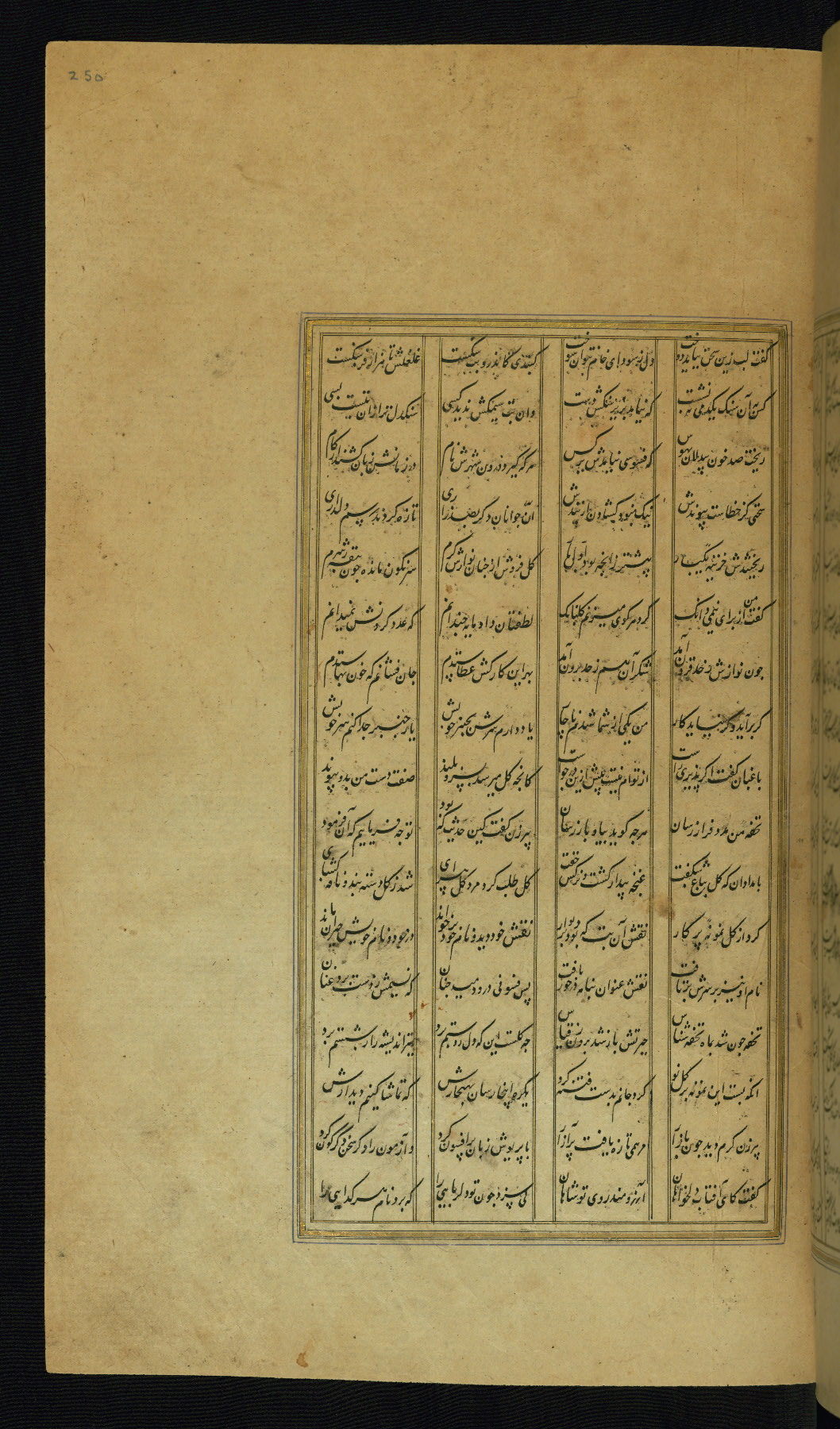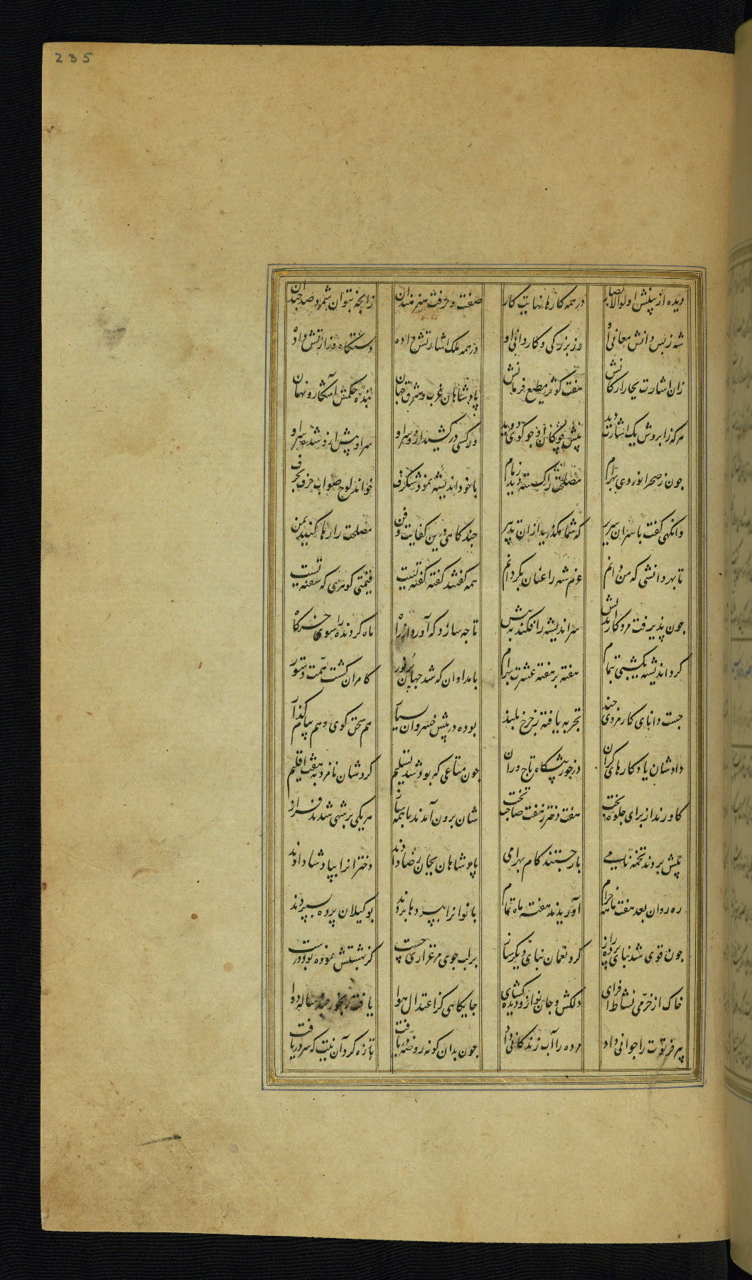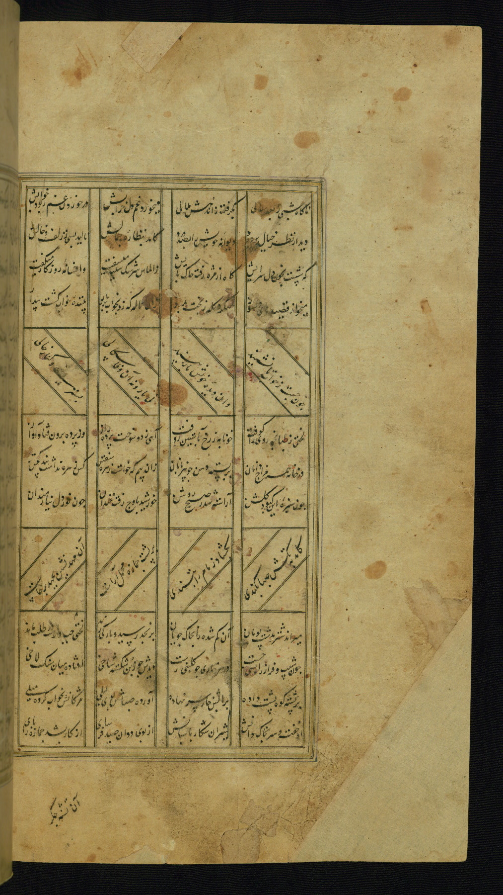 This is an illustrated and illuminated Safavid copy of the Khamsah (quintet) of Amīr Khusraw Dihlavī (d. 725 AH / 1325 CE), written by Pīr Ḥusayn al-Kātib al-Shīrāzī in 935 AH / 1529 CE. The codex opens with a double-page illuminated frontispiece with verses in honor of the poet Mir (Amir) Khusraw (fols. 1b-2a). There are four illuminated incipit pages introducing the individual poems, and thirteen paintings illustrate the text. The lacquer binding, which is not original to the manuscript, has a hunting scene on the upper and lower boards. The lower board is inscribed yā Shāh Najaf (oh, King of Najaf, i.e. ʿAlī) and is dated 1271 AH / 1854 CE.