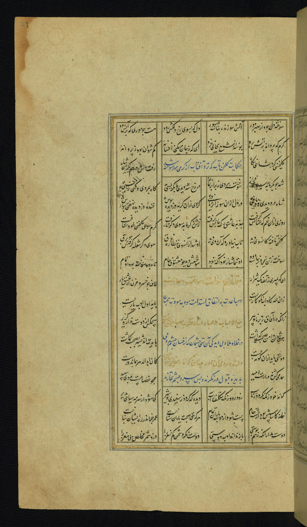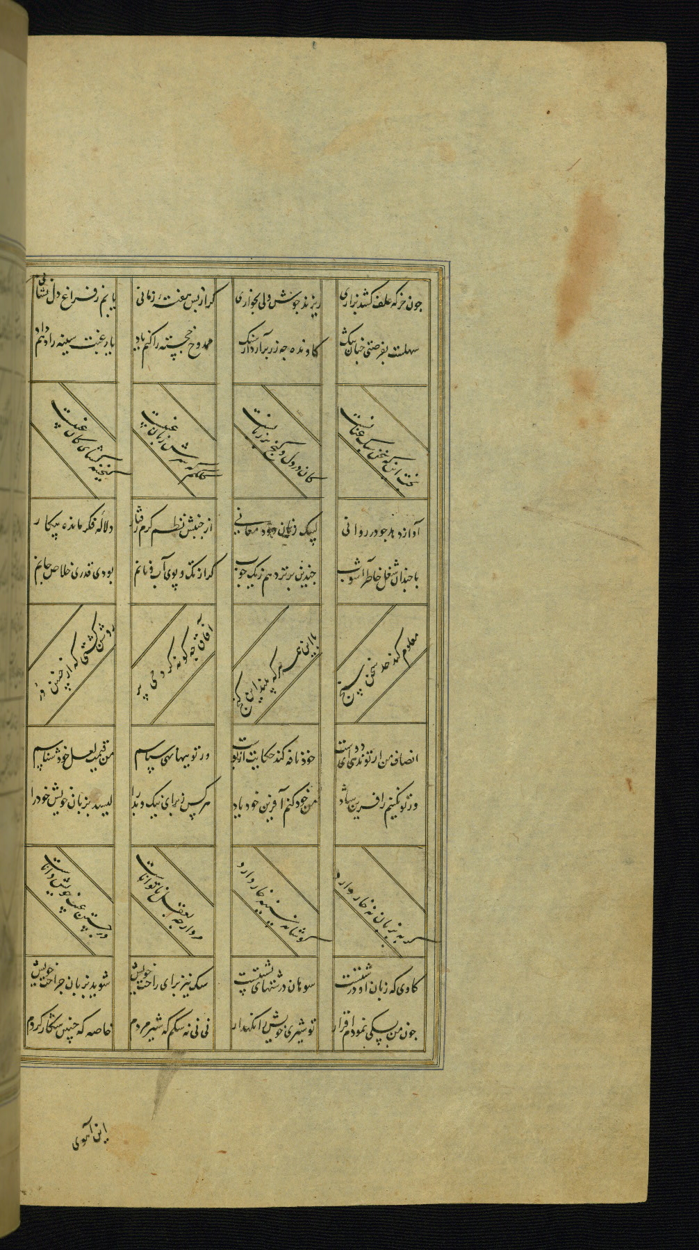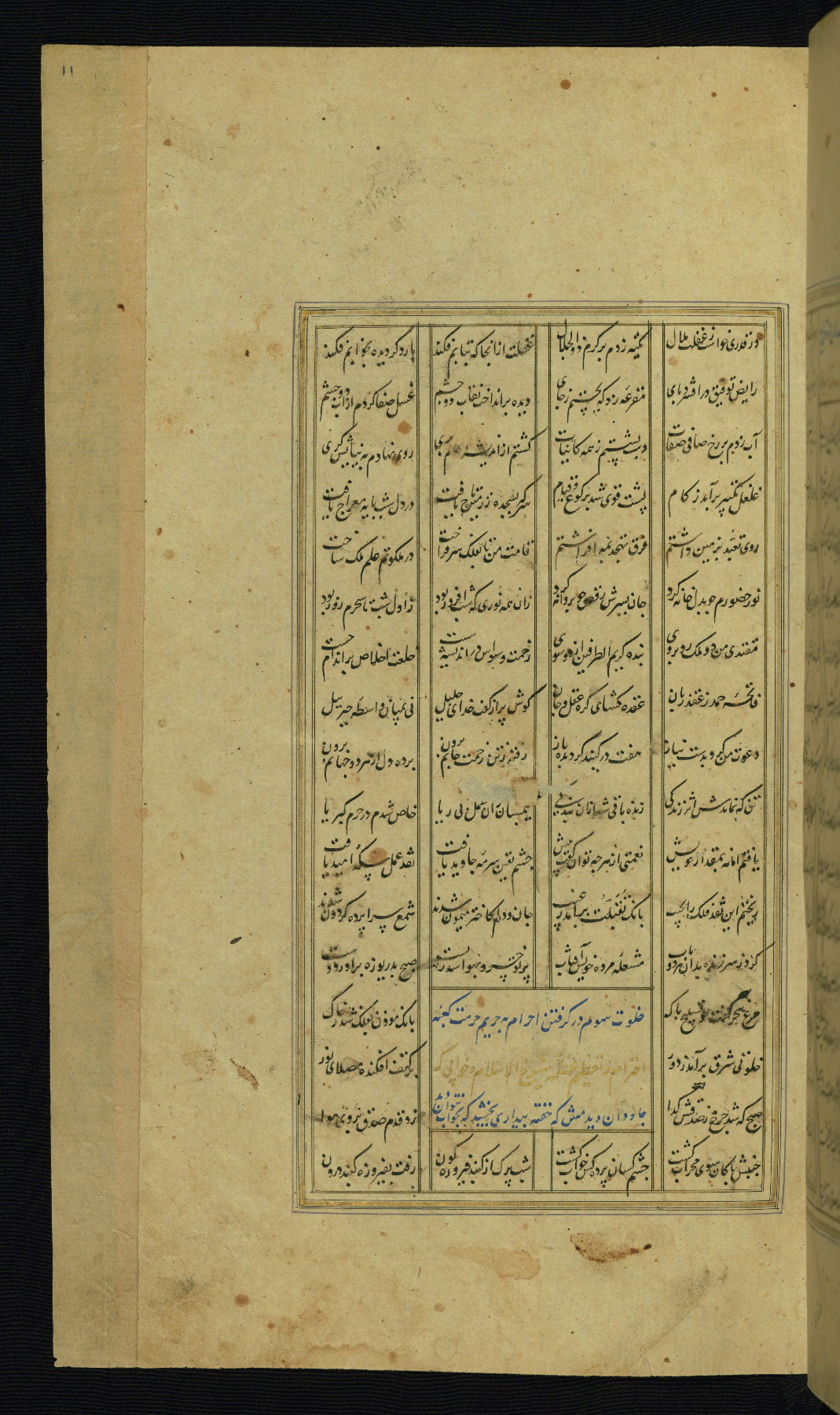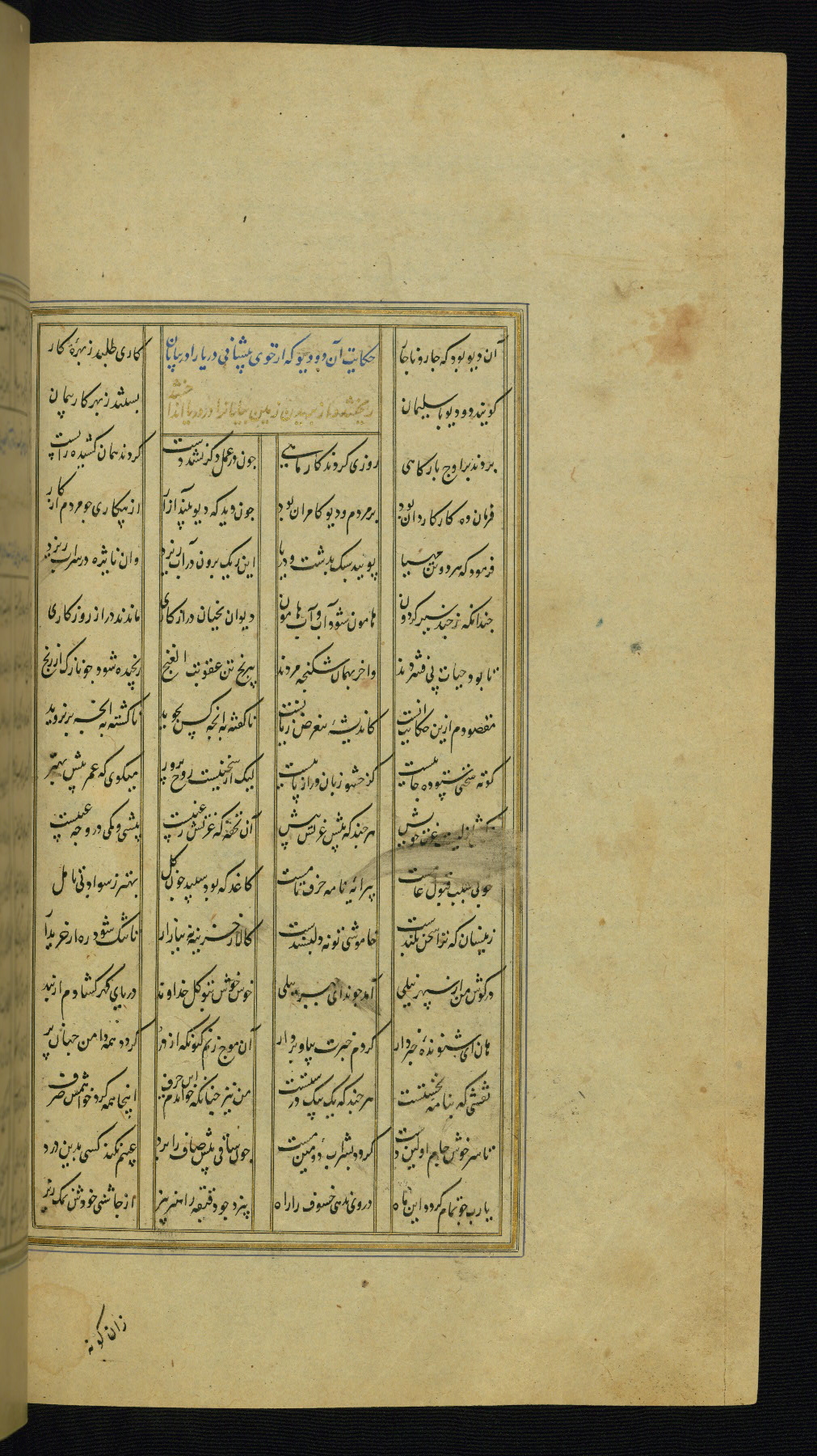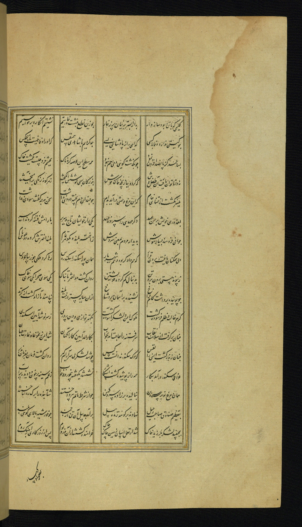 This is an illustrated and illuminated Safavid copy of the Khamsah (quintet) of Amīr Khusraw Dihlavī (d. 725 AH / 1325 CE), written by Pīr Ḥusayn al-Kātib al-Shīrāzī in 935 AH / 1529 CE. The codex opens with a double-page illuminated frontispiece with verses in honor of the poet Mir (Amir) Khusraw (fols. 1b-2a). There are four illuminated incipit pages introducing the individual poems, and thirteen paintings illustrate the text. The lacquer binding, which is not original to the manuscript, has a hunting scene on the upper and lower boards. The lower board is inscribed yā Shāh Najaf (oh, King of Najaf, i.e. ʿAlī) and is dated 1271 AH / 1854 CE.