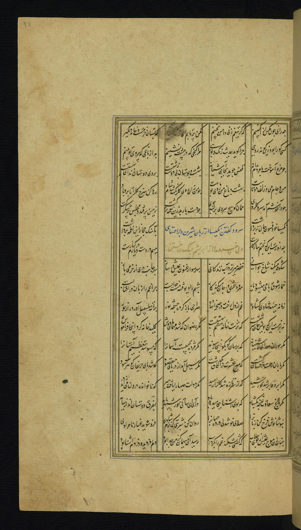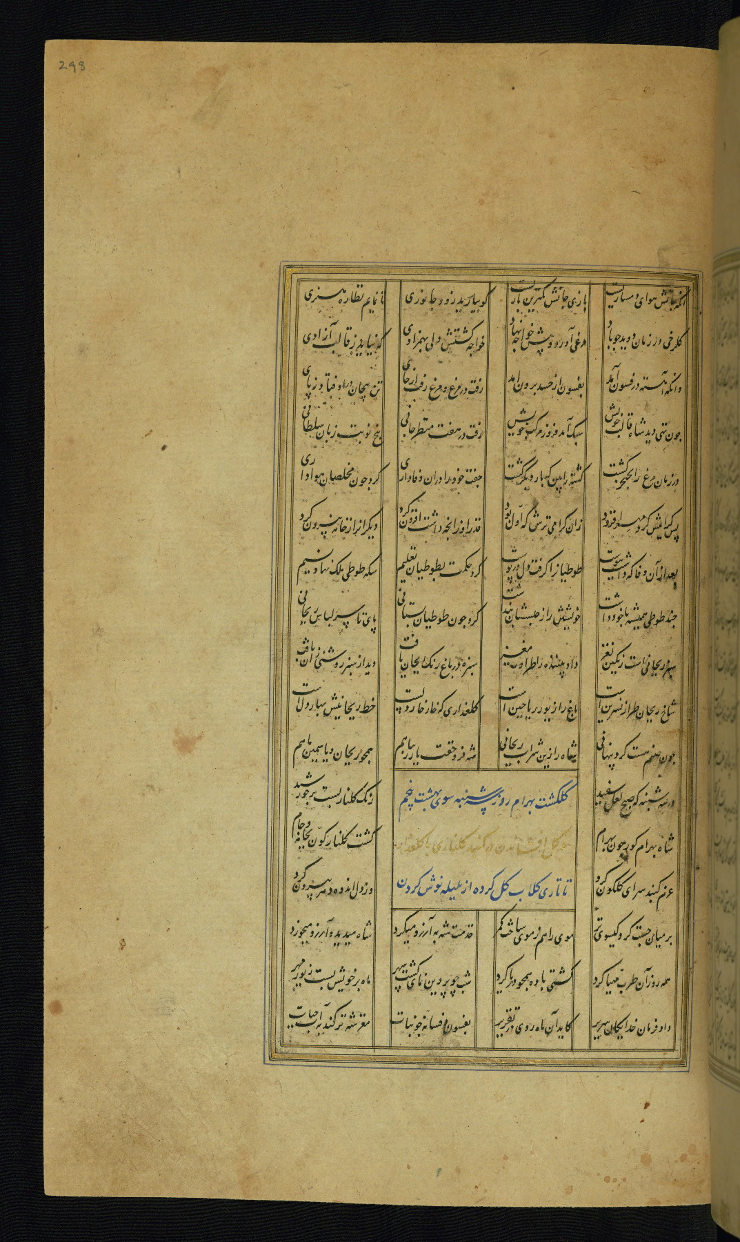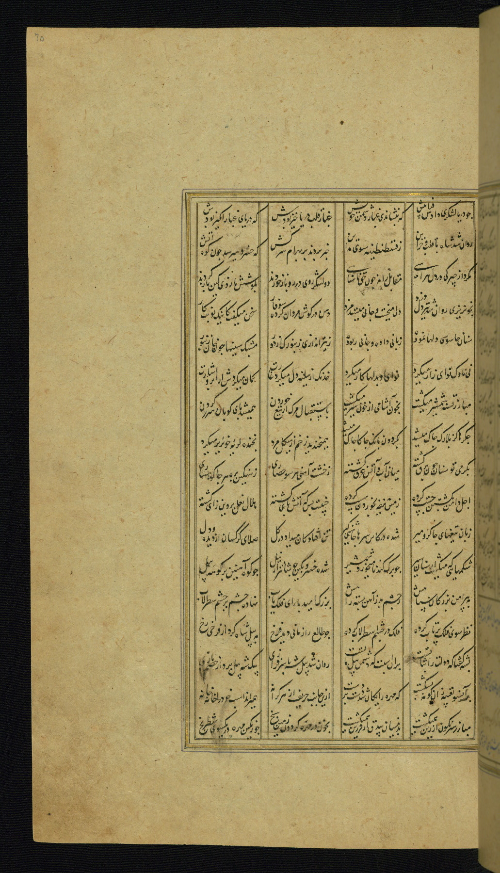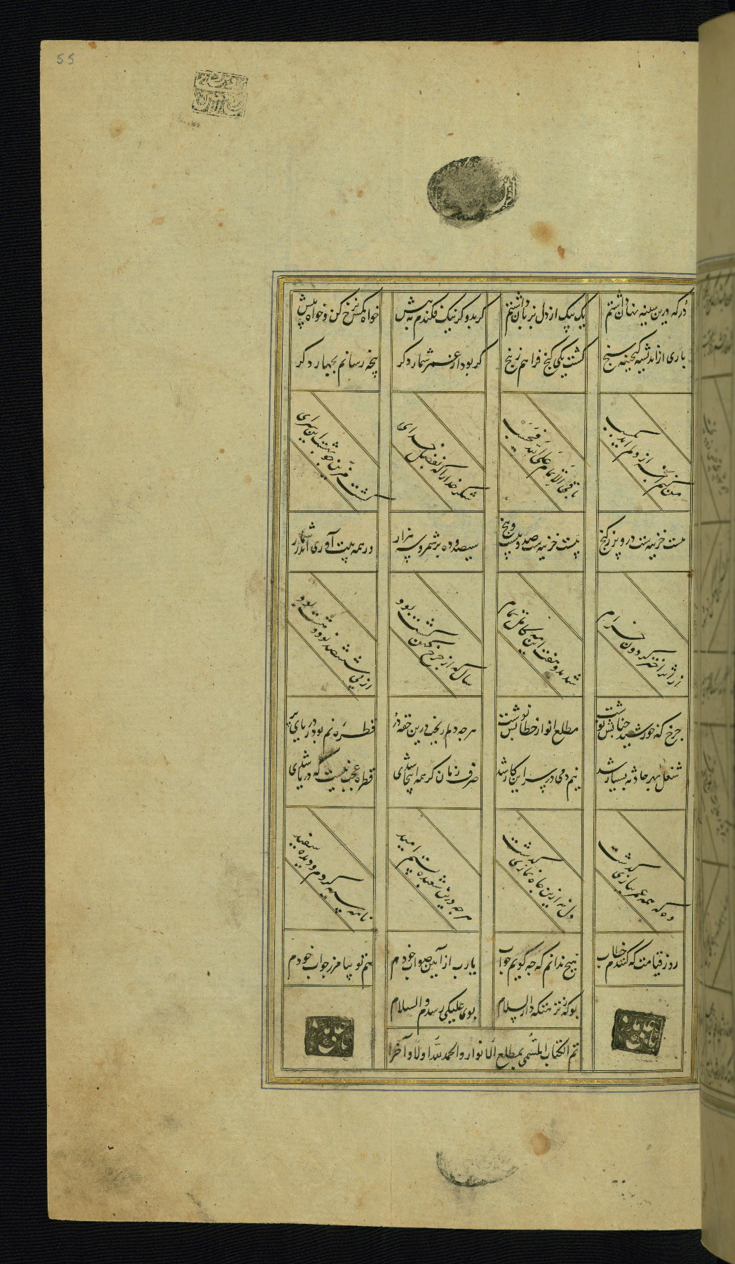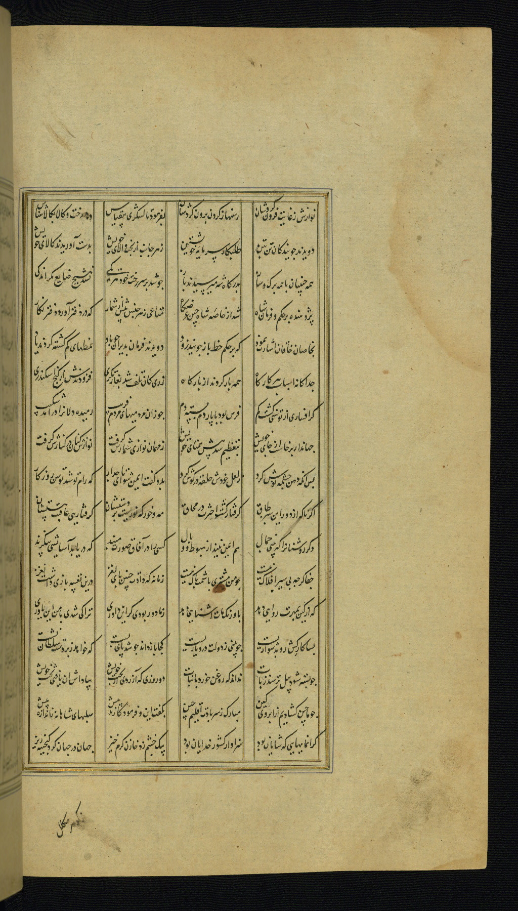 This is an illustrated and illuminated Safavid copy of the Khamsah (quintet) of Amīr Khusraw Dihlavī (d. 725 AH / 1325 CE), written by Pīr Ḥusayn al-Kātib al-Shīrāzī in 935 AH / 1529 CE. The codex opens with a double-page illuminated frontispiece with verses in honor of the poet Mir (Amir) Khusraw (fols. 1b-2a). There are four illuminated incipit pages introducing the individual poems, and thirteen paintings illustrate the text. The lacquer binding, which is not original to the manuscript, has a hunting scene on the upper and lower boards. The lower board is inscribed yā Shāh Najaf (oh, King of Najaf, i.e. ʿAlī) and is dated 1271 AH / 1854 CE.