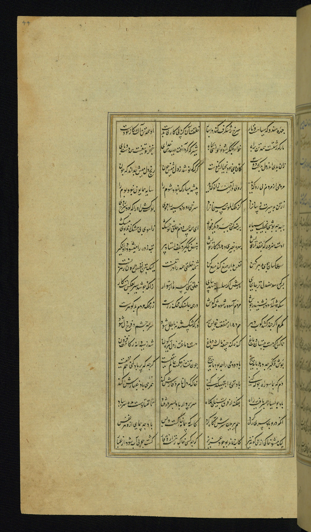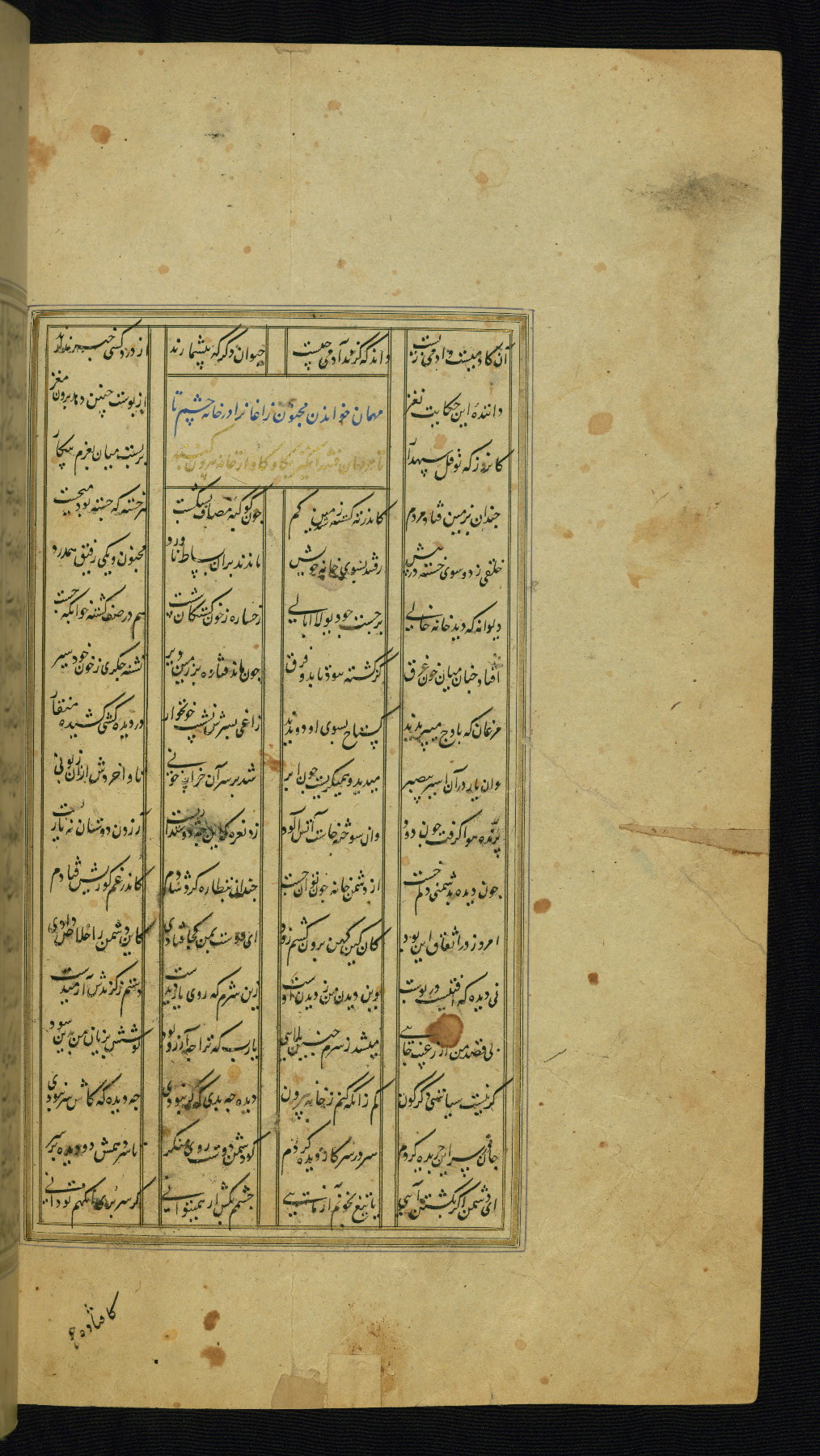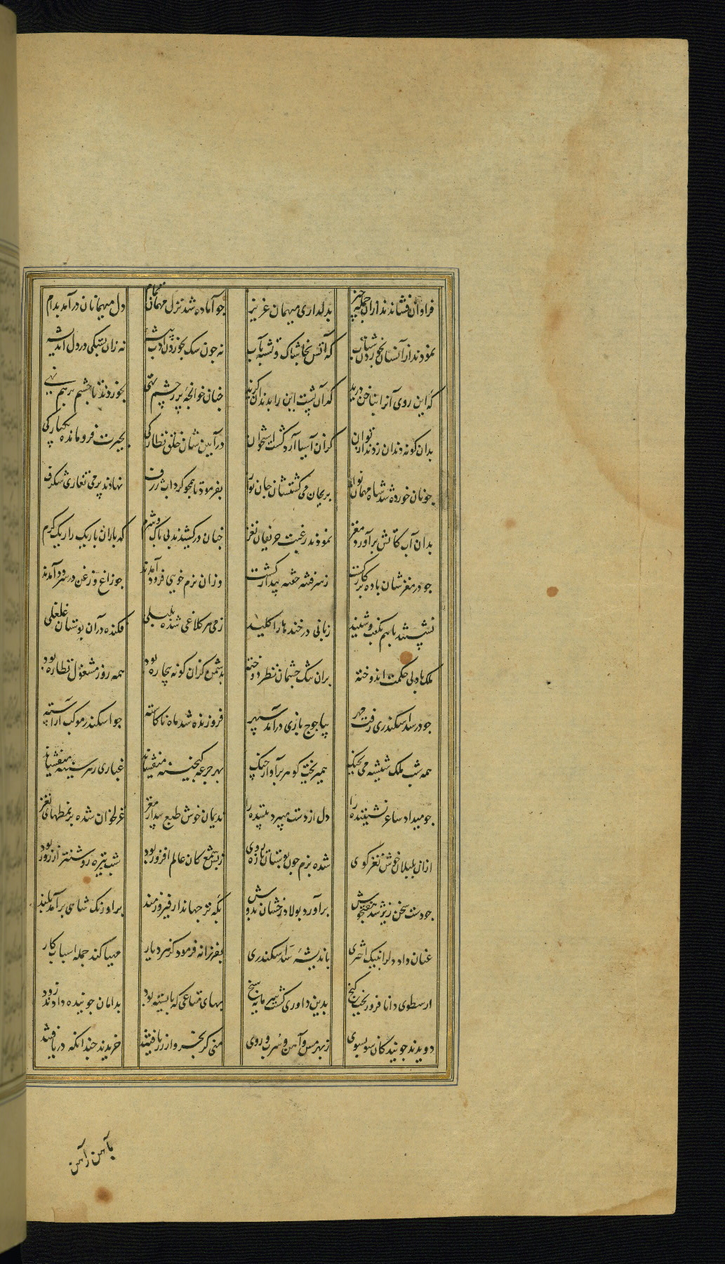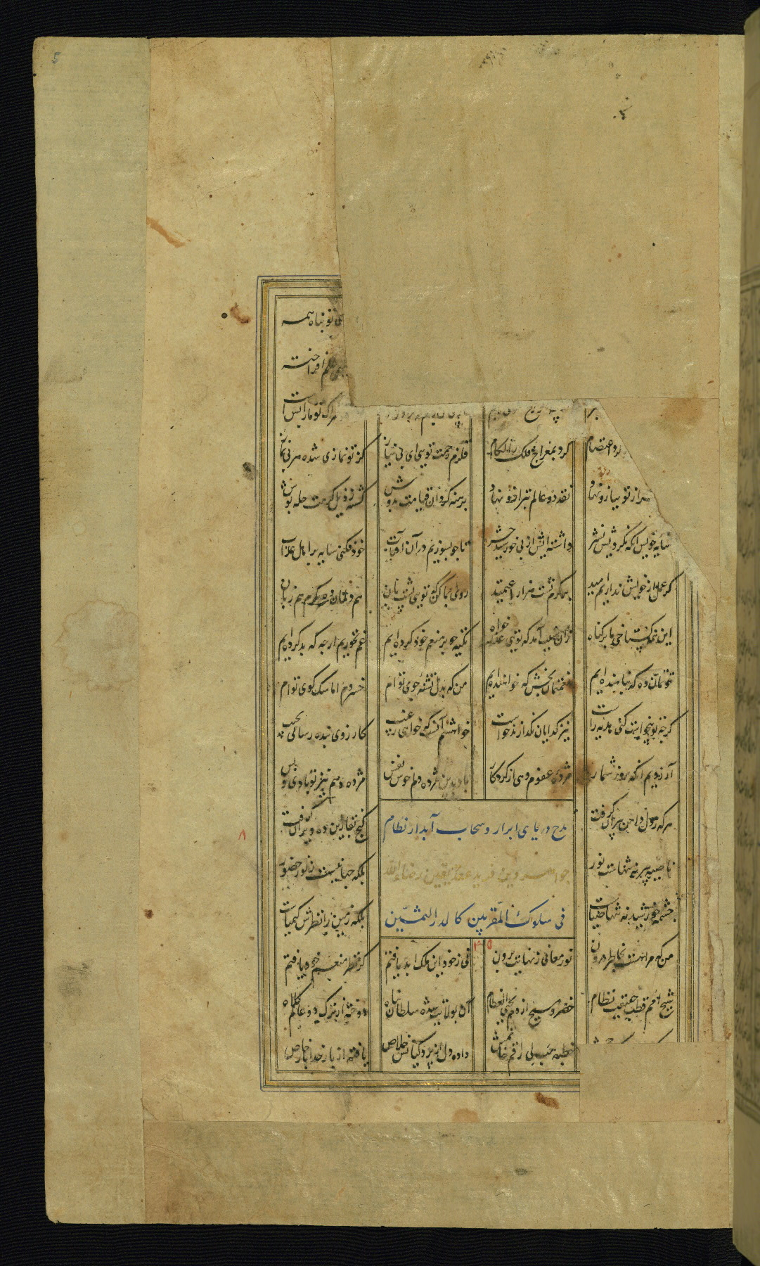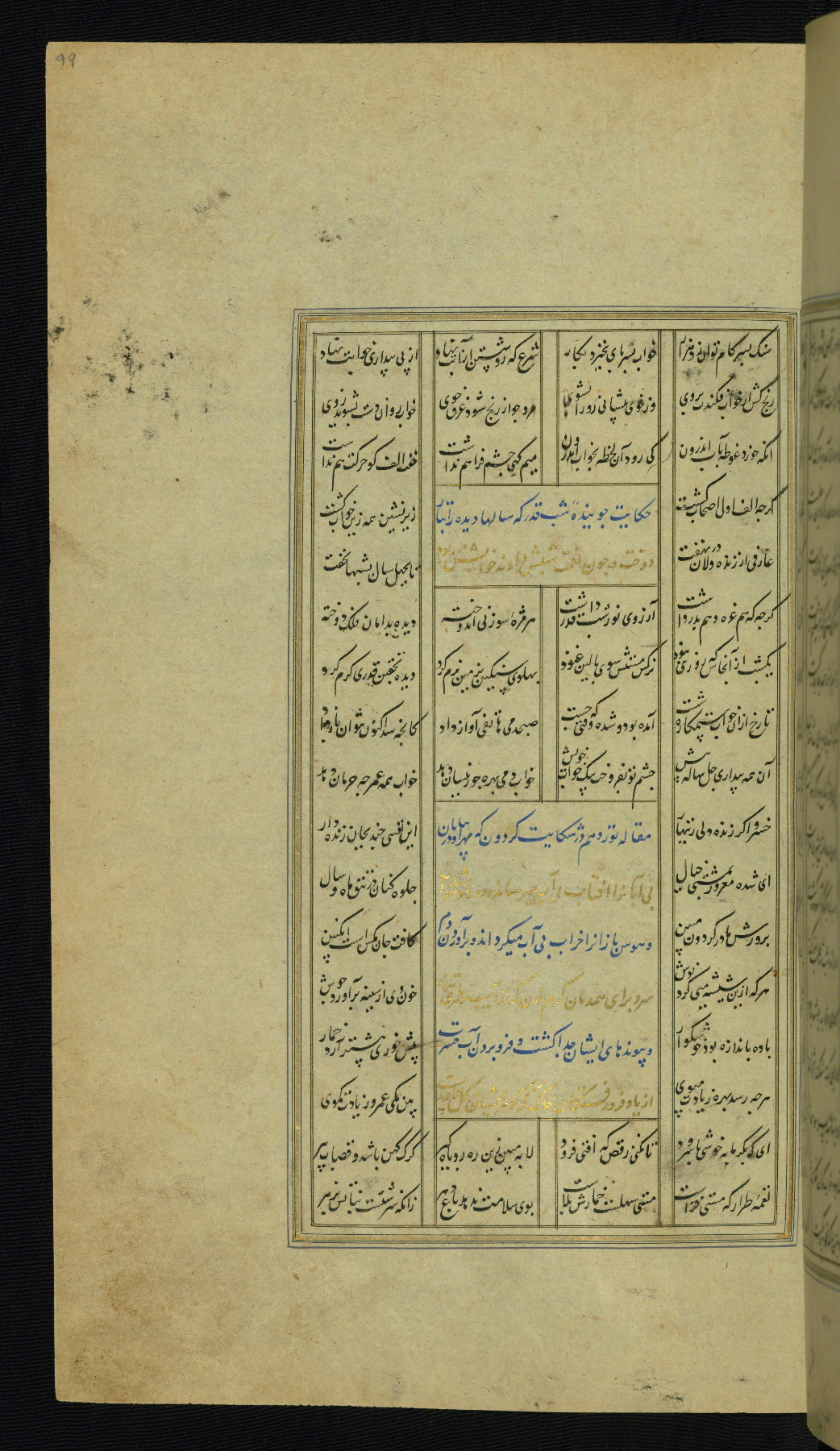This is an illustrated and illuminated Safavid copy of the Khamsah (quintet) of Amīr Khusraw Dihlavī (d. 725 AH / 1325 CE), written by Pīr Ḥusayn al-Kātib al-Shīrāzī in 935 AH / 1529 CE. The codex opens with a double-page illuminated frontispiece with verses in honor of the poet Mir (Amir) Khusraw (fols. 1b-2a). There are four illuminated incipit pages introducing the individual poems, and thirteen paintings illustrate the text. The lacquer binding, which is not original to the manuscript, has a hunting scene on the upper and lower boards. The lower board is inscribed yā Shāh Najaf (oh, King of Najaf, i.e. ʿAlī) and is dated 1271 AH / 1854 CE.