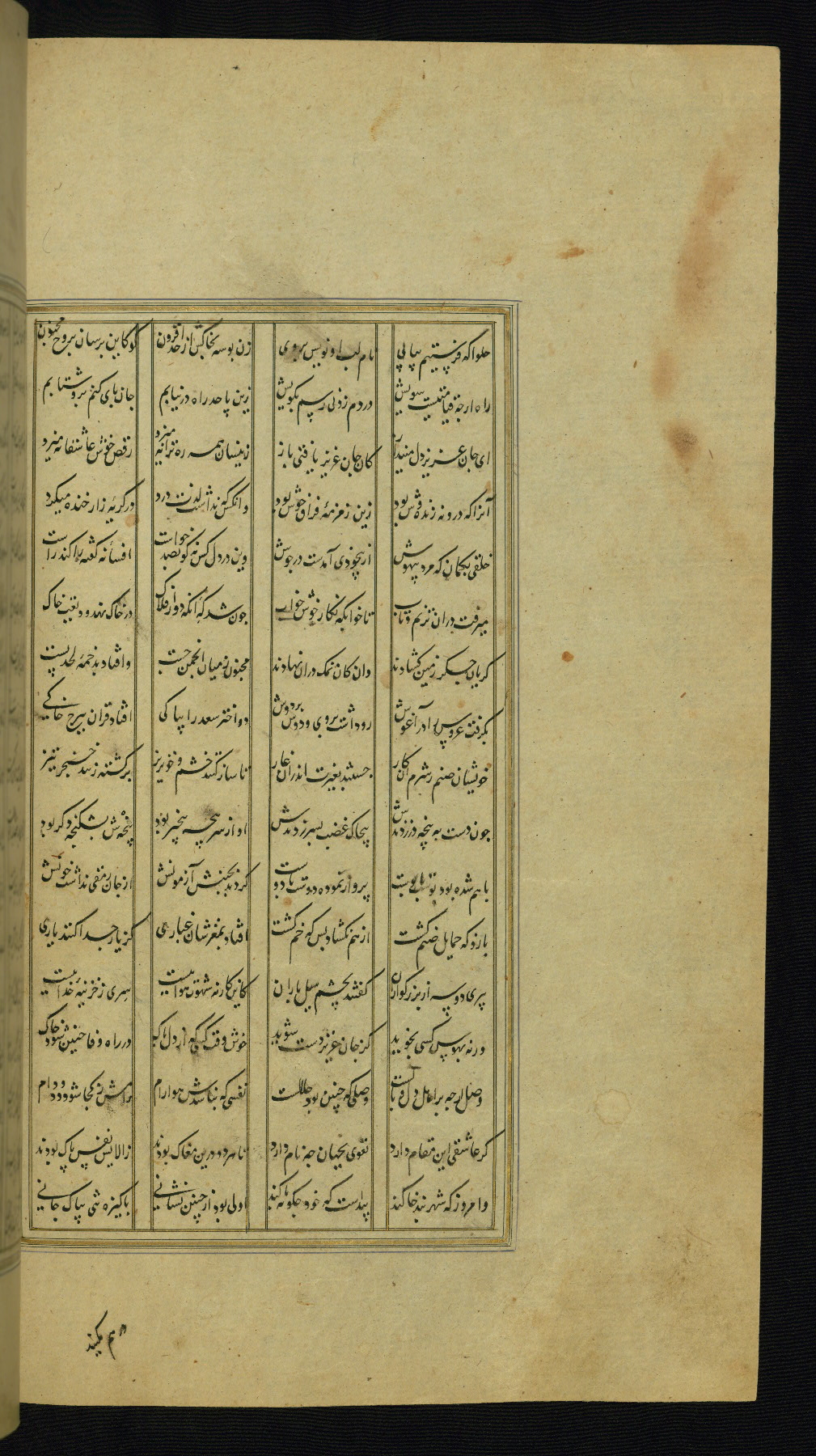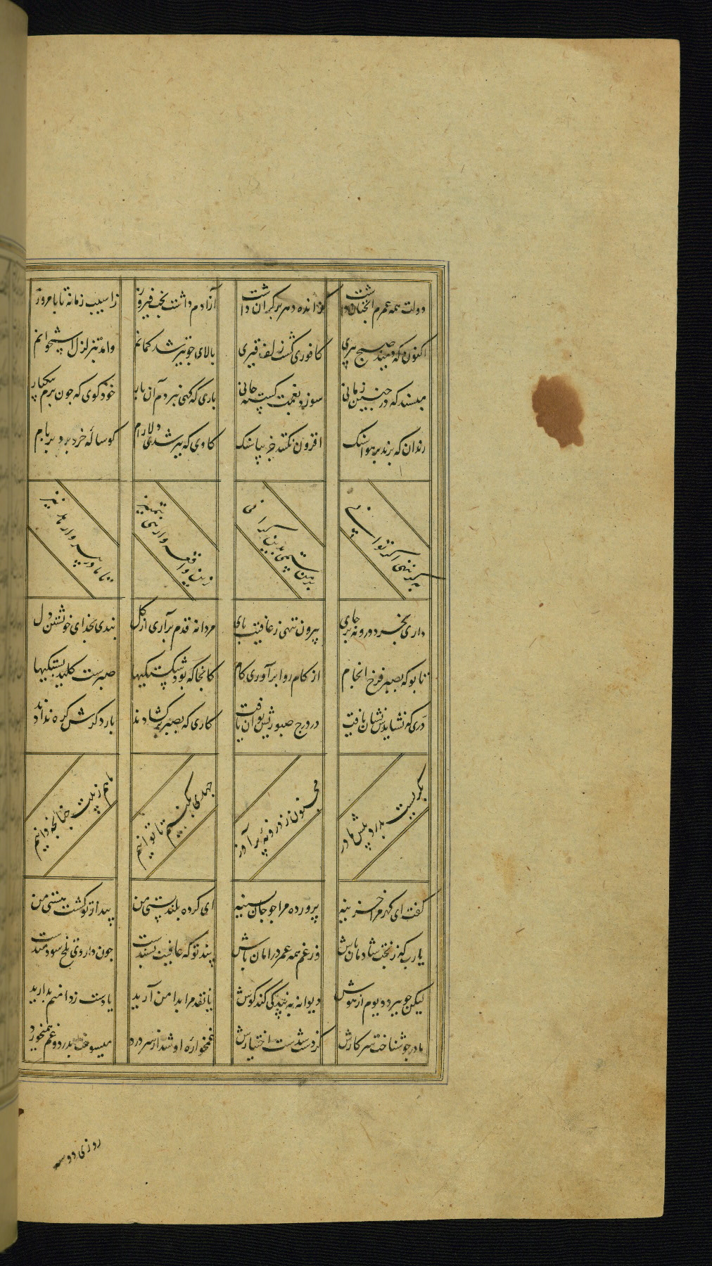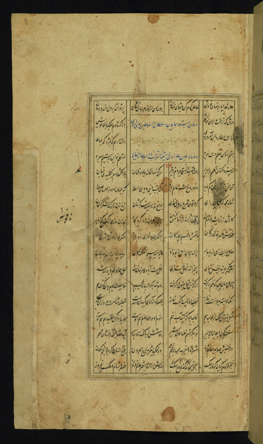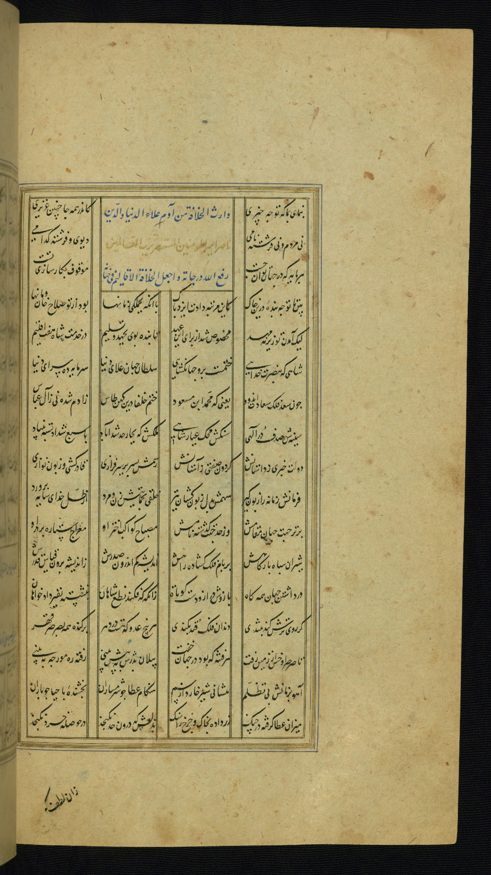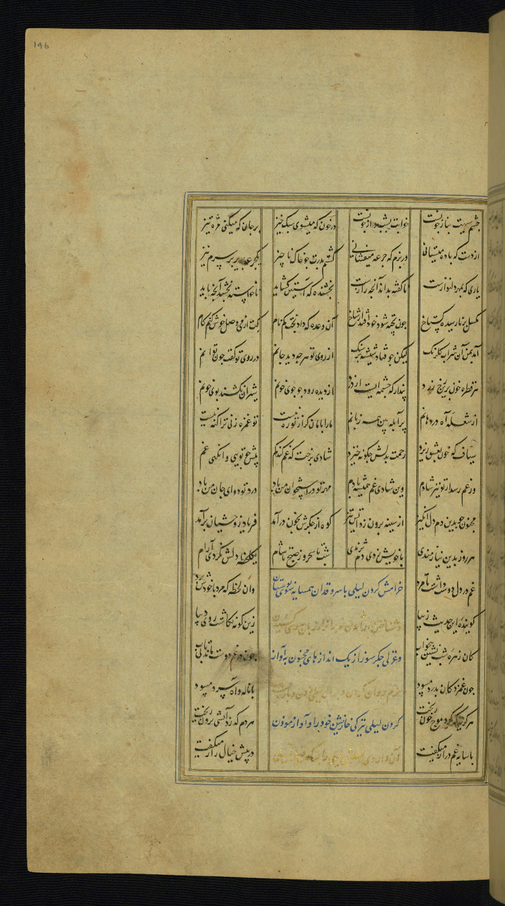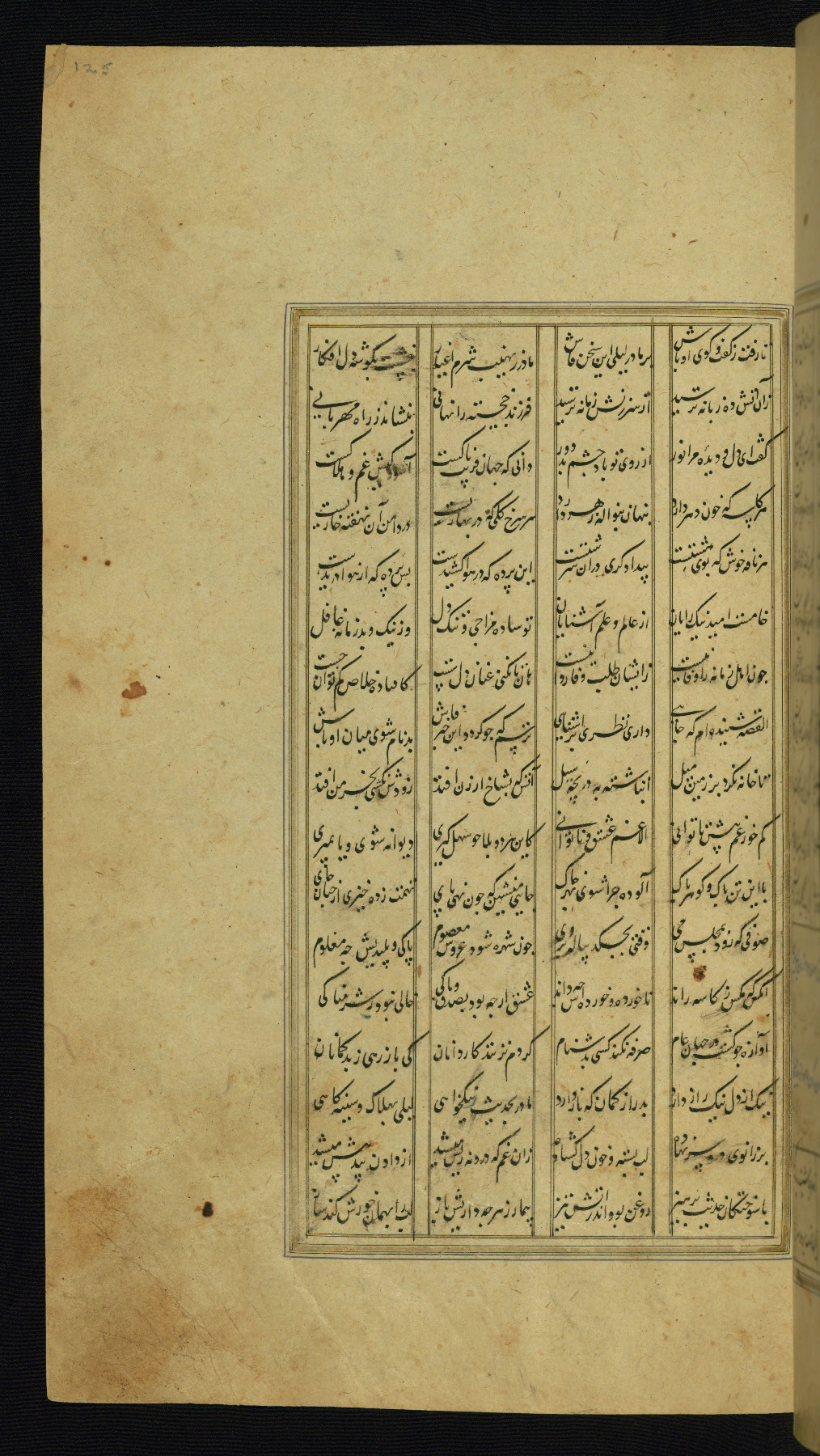 This is an illustrated and illuminated Safavid copy of the Khamsah (quintet) of Amīr Khusraw Dihlavī (d. 725 AH / 1325 CE), written by Pīr Ḥusayn al-Kātib al-Shīrāzī in 935 AH / 1529 CE. The codex opens with a double-page illuminated frontispiece with verses in honor of the poet Mir (Amir) Khusraw (fols. 1b-2a). There are four illuminated incipit pages introducing the individual poems, and thirteen paintings illustrate the text. The lacquer binding, which is not original to the manuscript, has a hunting scene on the upper and lower boards. The lower board is inscribed yā Shāh Najaf (oh, King of Najaf, i.e. ʿAlī) and is dated 1271 AH / 1854 CE.