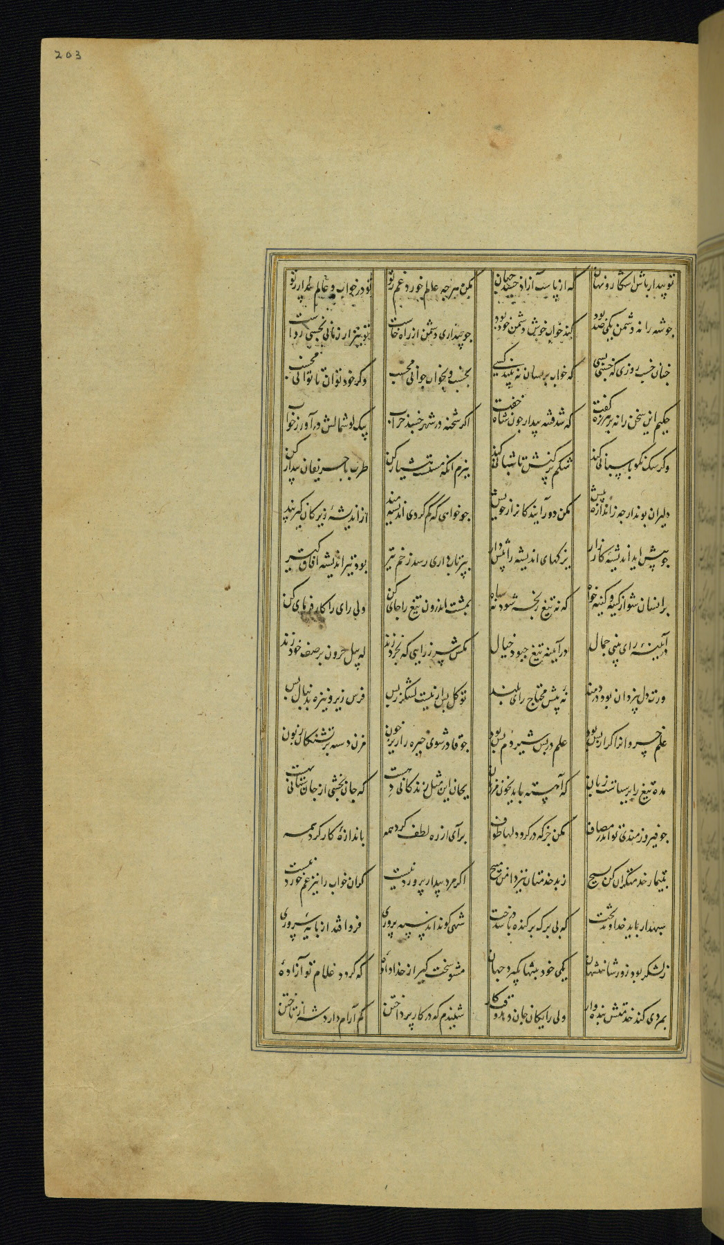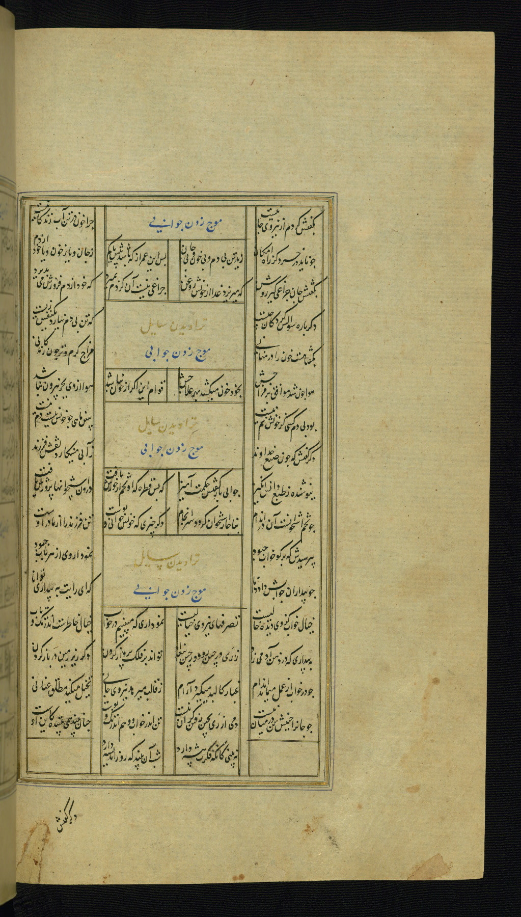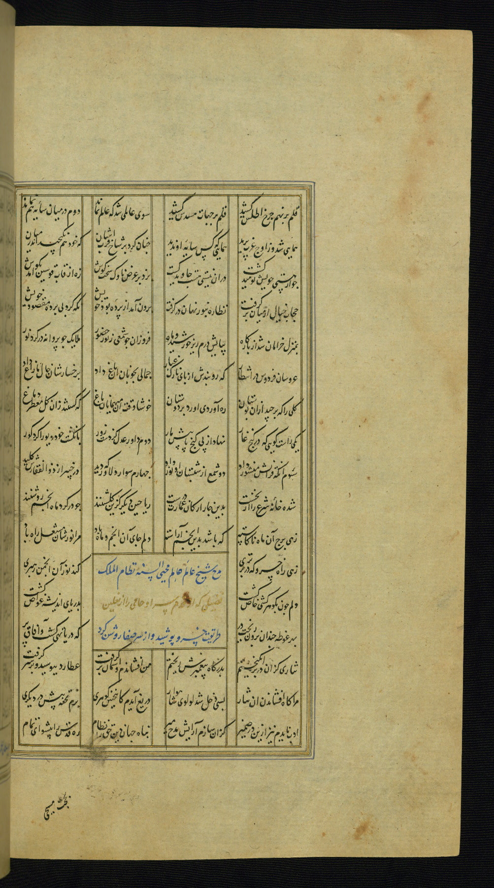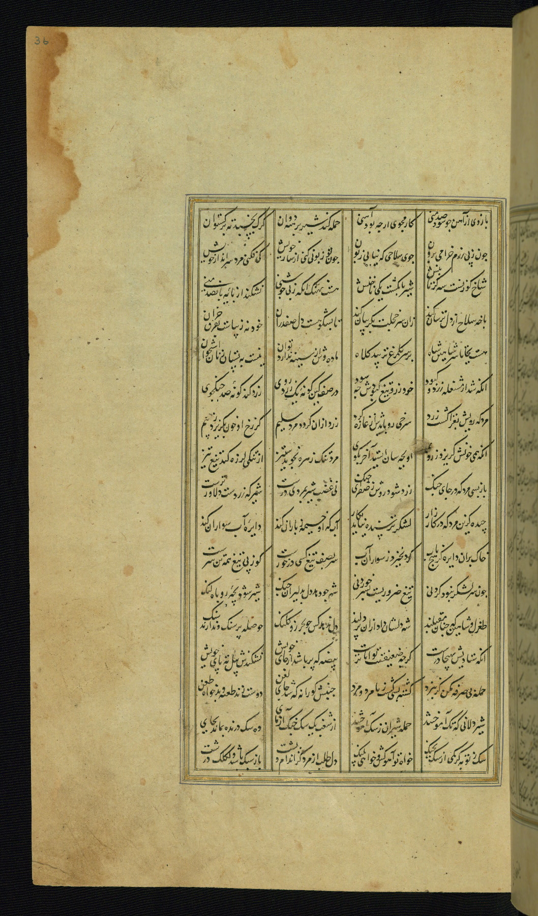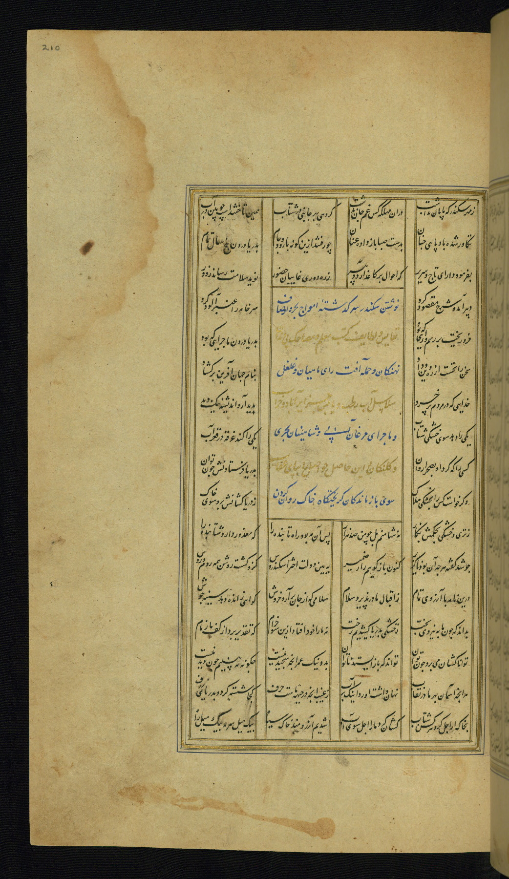 This is an illustrated and illuminated Safavid copy of the Khamsah (quintet) of Amīr Khusraw Dihlavī (d. 725 AH / 1325 CE), written by Pīr Ḥusayn al-Kātib al-Shīrāzī in 935 AH / 1529 CE. The codex opens with a double-page illuminated frontispiece with verses in honor of the poet Mir (Amir) Khusraw (fols. 1b-2a). There are four illuminated incipit pages introducing the individual poems, and thirteen paintings illustrate the text. The lacquer binding, which is not original to the manuscript, has a hunting scene on the upper and lower boards. The lower board is inscribed yā Shāh Najaf (oh, King of Najaf, i.e. ʿAlī) and is dated 1271 AH / 1854 CE.