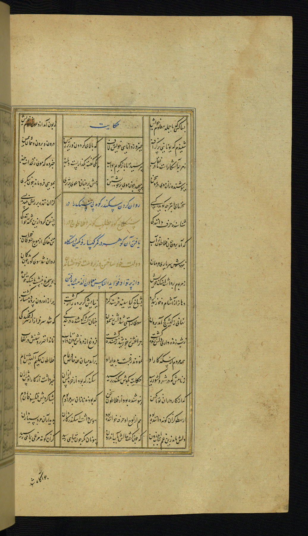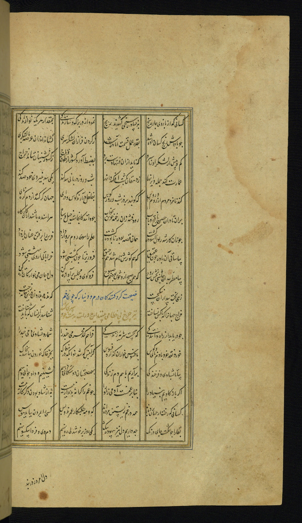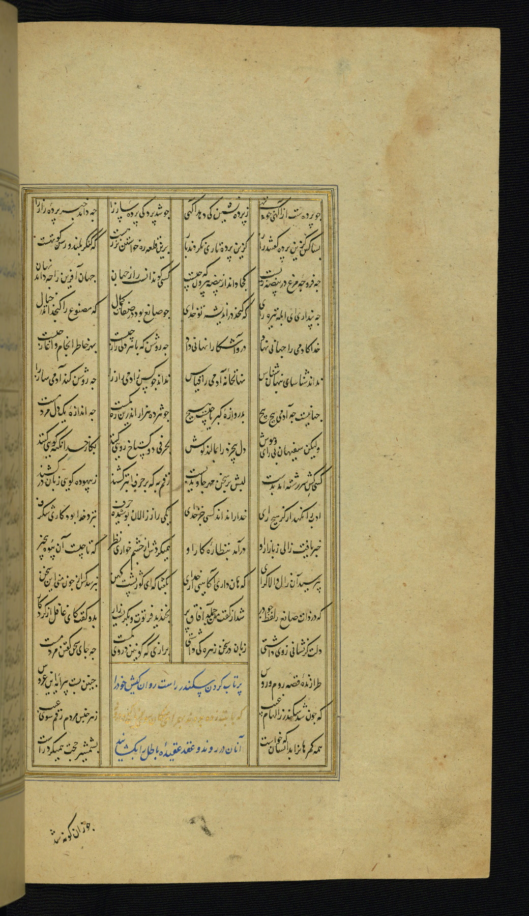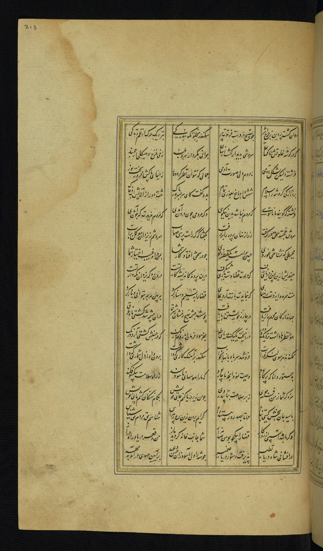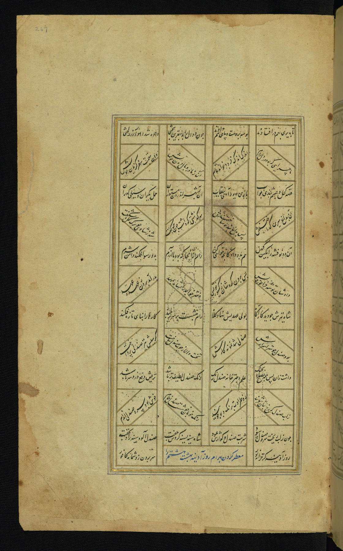 This is an illustrated and illuminated Safavid copy of the Khamsah (quintet) of Amīr Khusraw Dihlavī (d. 725 AH / 1325 CE), written by Pīr Ḥusayn al-Kātib al-Shīrāzī in 935 AH / 1529 CE. The codex opens with a double-page illuminated frontispiece with verses in honor of the poet Mir (Amir) Khusraw (fols. 1b-2a). There are four illuminated incipit pages introducing the individual poems, and thirteen paintings illustrate the text. The lacquer binding, which is not original to the manuscript, has a hunting scene on the upper and lower boards. The lower board is inscribed yā Shāh Najaf (oh, King of Najaf, i.e. ʿAlī) and is dated 1271 AH / 1854 CE.