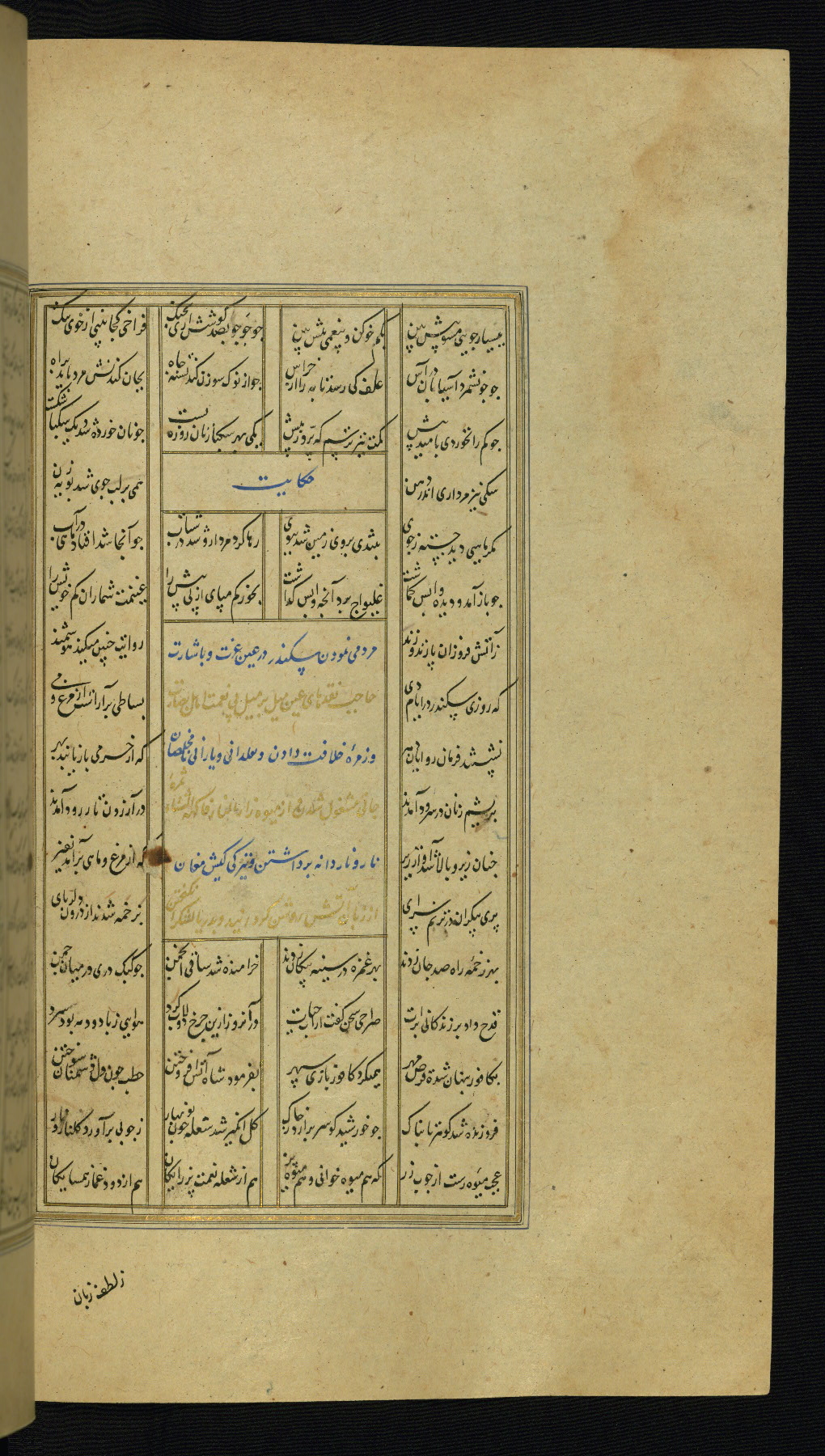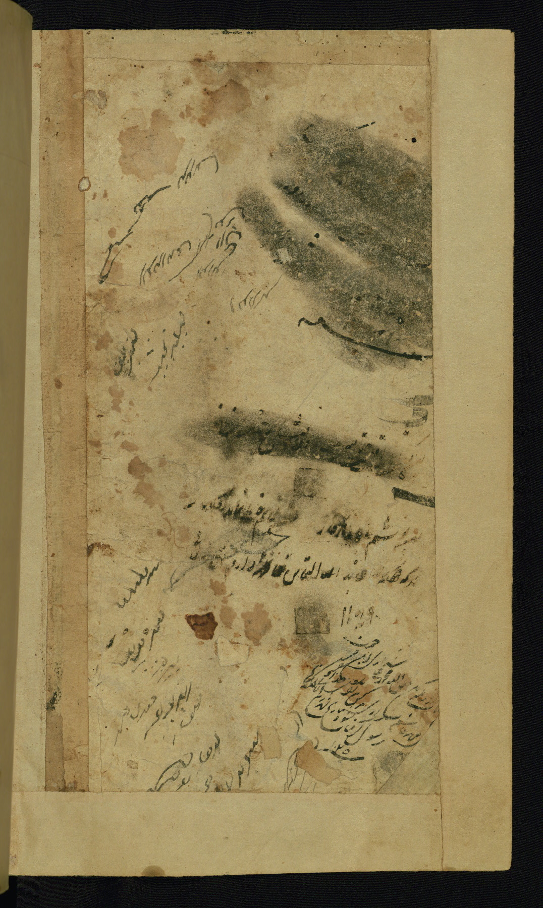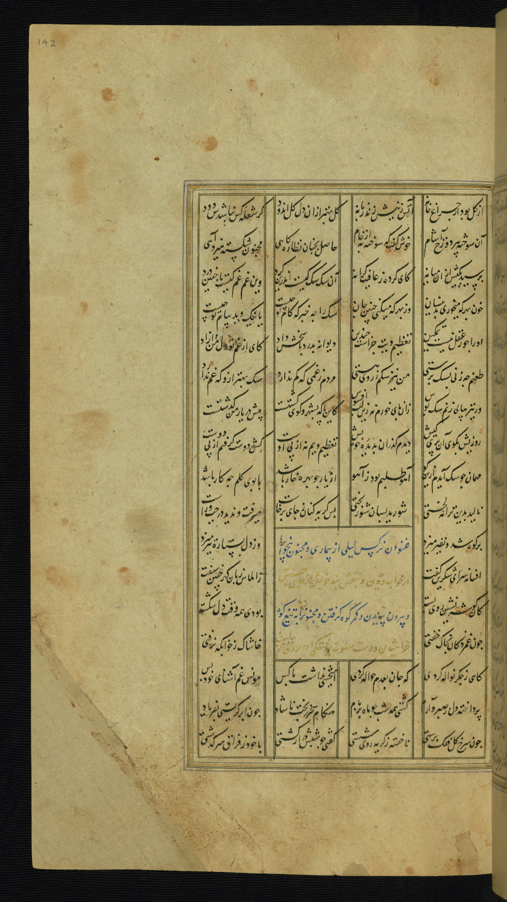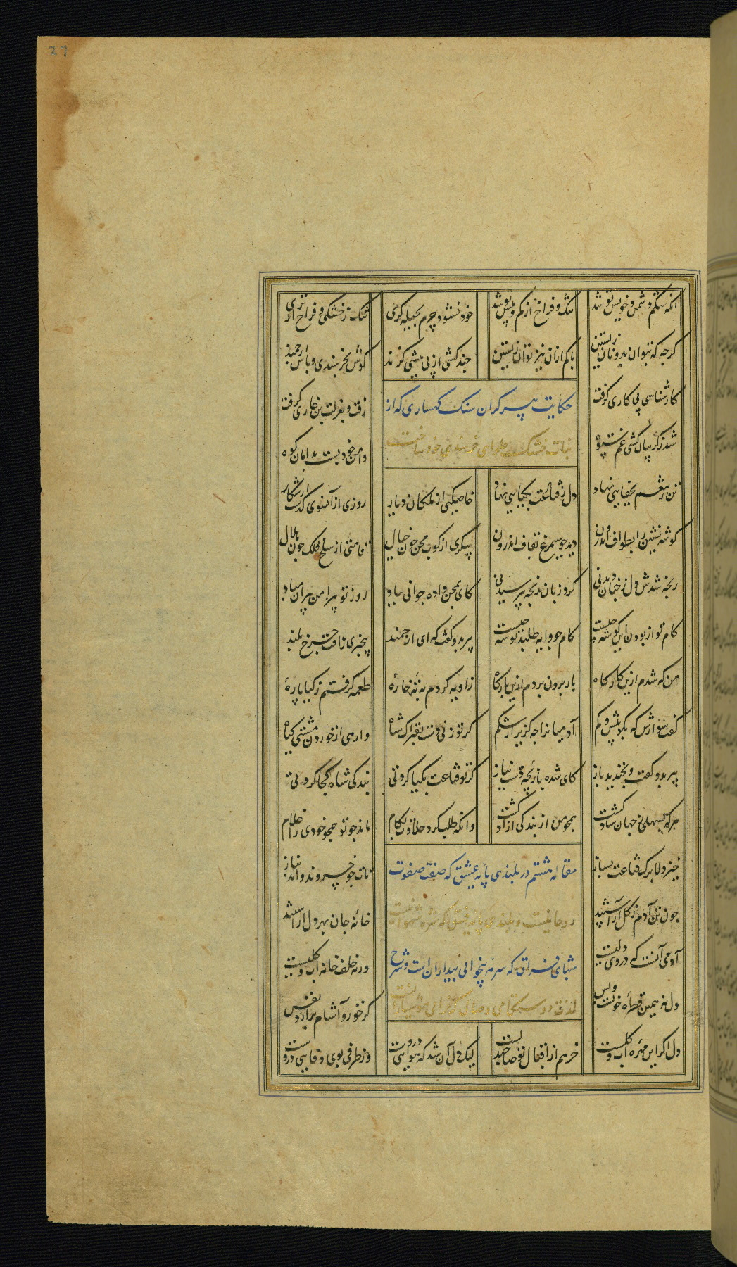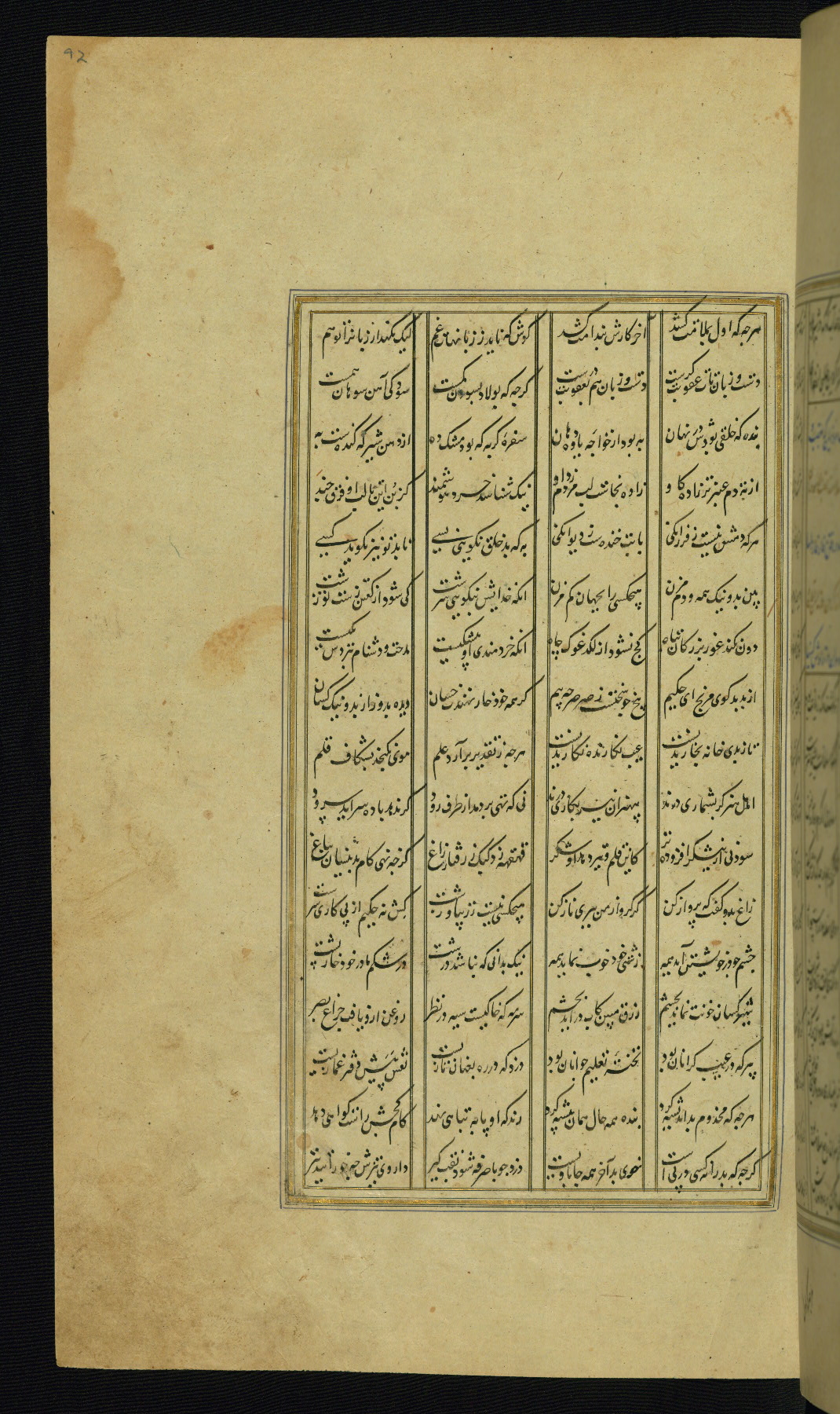 This is an illustrated and illuminated Safavid copy of the Khamsah (quintet) of Amīr Khusraw Dihlavī (d. 725 AH / 1325 CE), written by Pīr Ḥusayn al-Kātib al-Shīrāzī in 935 AH / 1529 CE. The codex opens with a double-page illuminated frontispiece with verses in honor of the poet Mir (Amir) Khusraw (fols. 1b-2a). There are four illuminated incipit pages introducing the individual poems, and thirteen paintings illustrate the text. The lacquer binding, which is not original to the manuscript, has a hunting scene on the upper and lower boards. The lower board is inscribed yā Shāh Najaf (oh, King of Najaf, i.e. ʿAlī) and is dated 1271 AH / 1854 CE.
