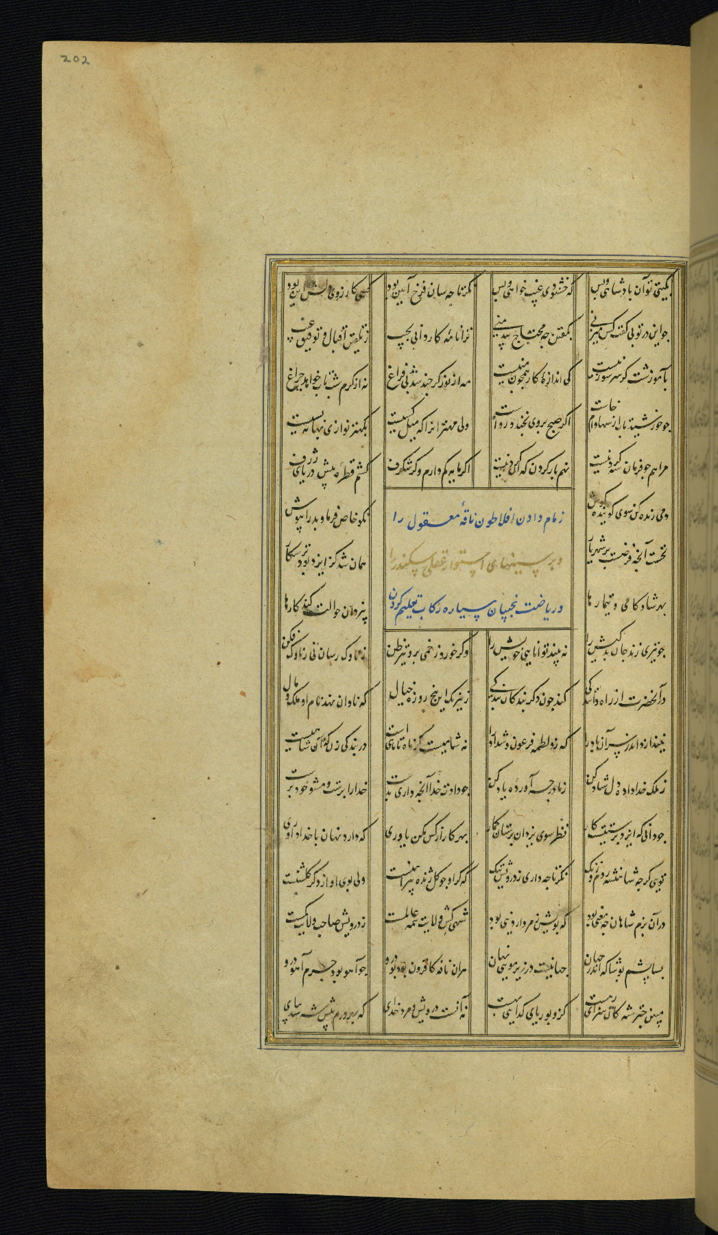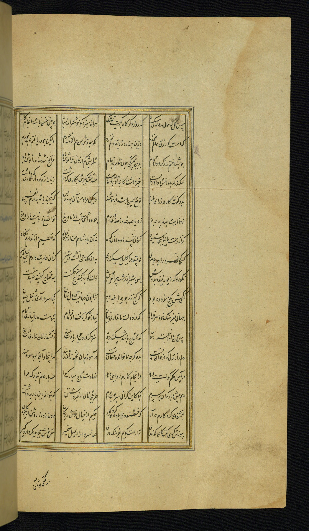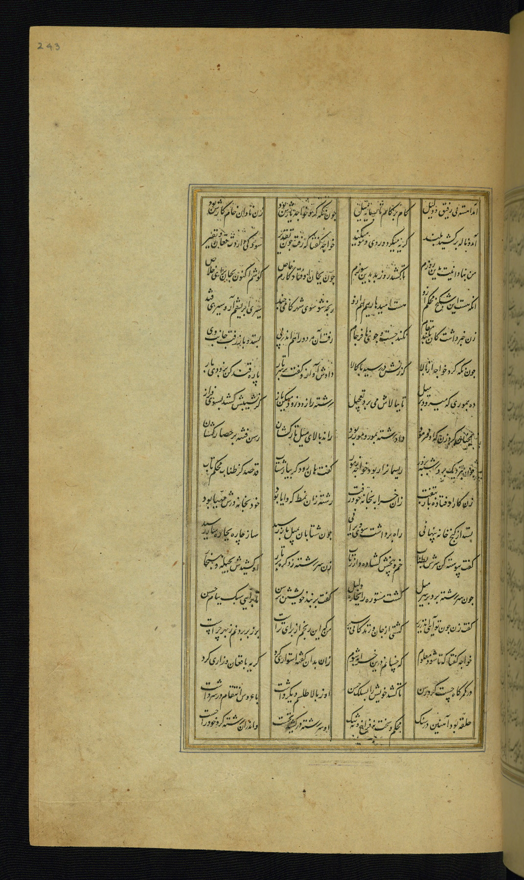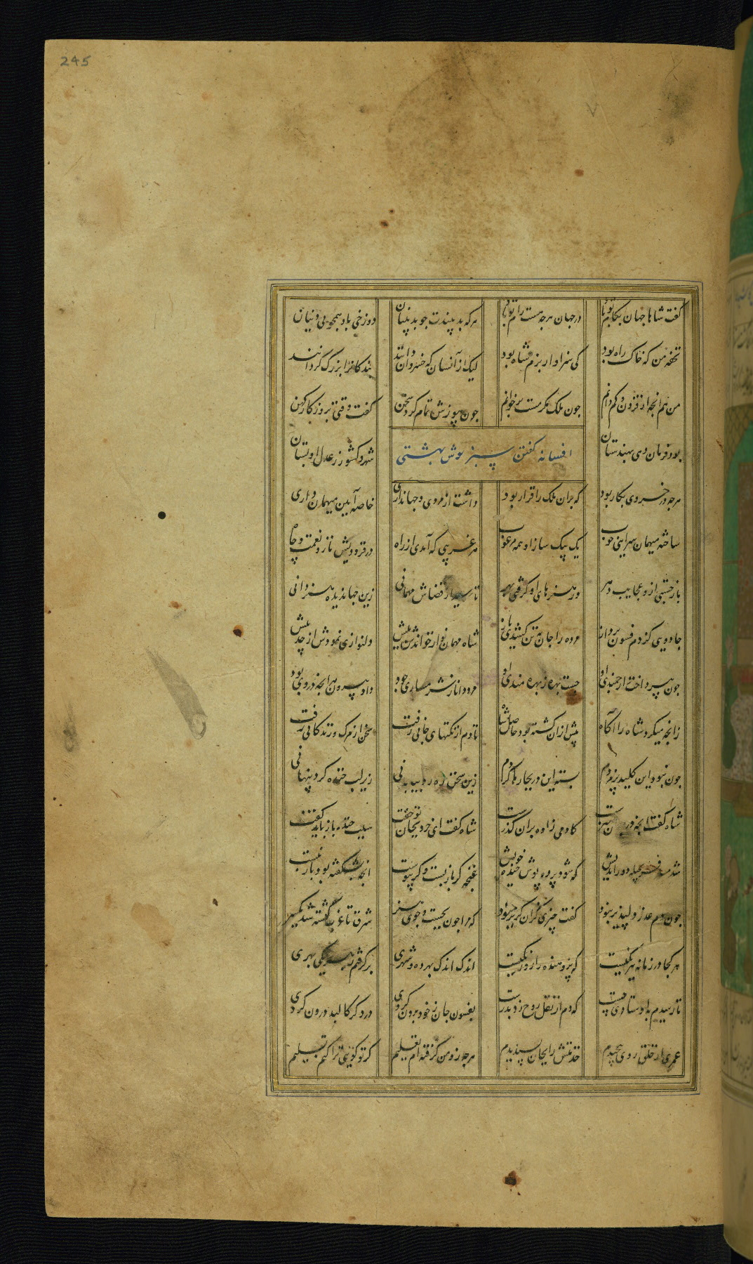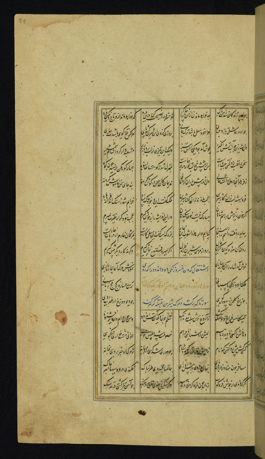 This is an illustrated and illuminated Safavid copy of the Khamsah (quintet) of Amīr Khusraw Dihlavī (d. 725 AH / 1325 CE), written by Pīr Ḥusayn al-Kātib al-Shīrāzī in 935 AH / 1529 CE. The codex opens with a double-page illuminated frontispiece with verses in honor of the poet Mir (Amir) Khusraw (fols. 1b-2a). There are four illuminated incipit pages introducing the individual poems, and thirteen paintings illustrate the text. The lacquer binding, which is not original to the manuscript, has a hunting scene on the upper and lower boards. The lower board is inscribed yā Shāh Najaf (oh, King of Najaf, i.e. ʿAlī) and is dated 1271 AH / 1854 CE.