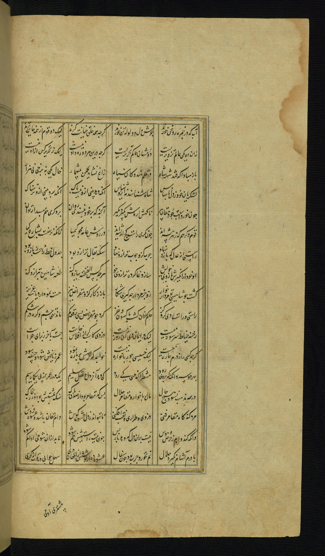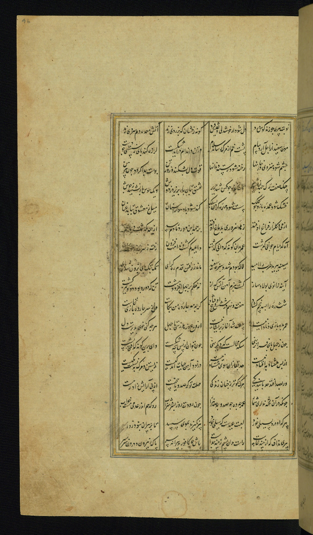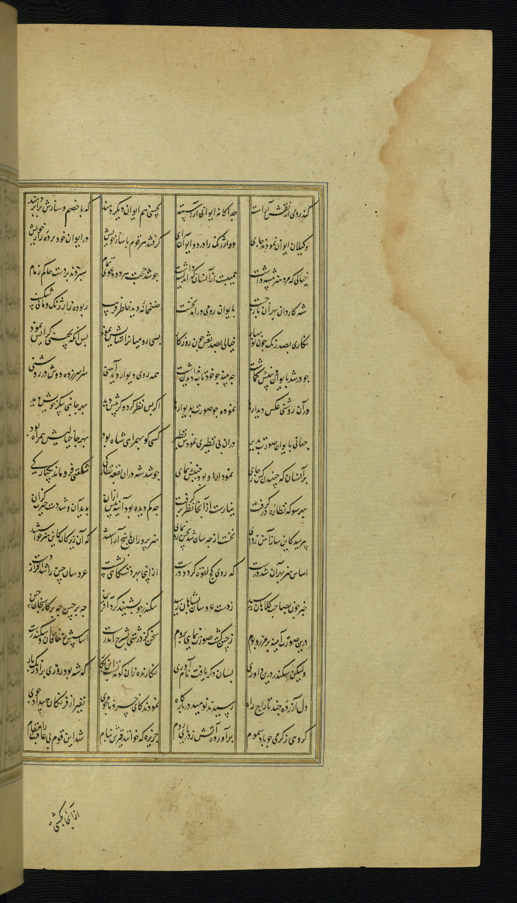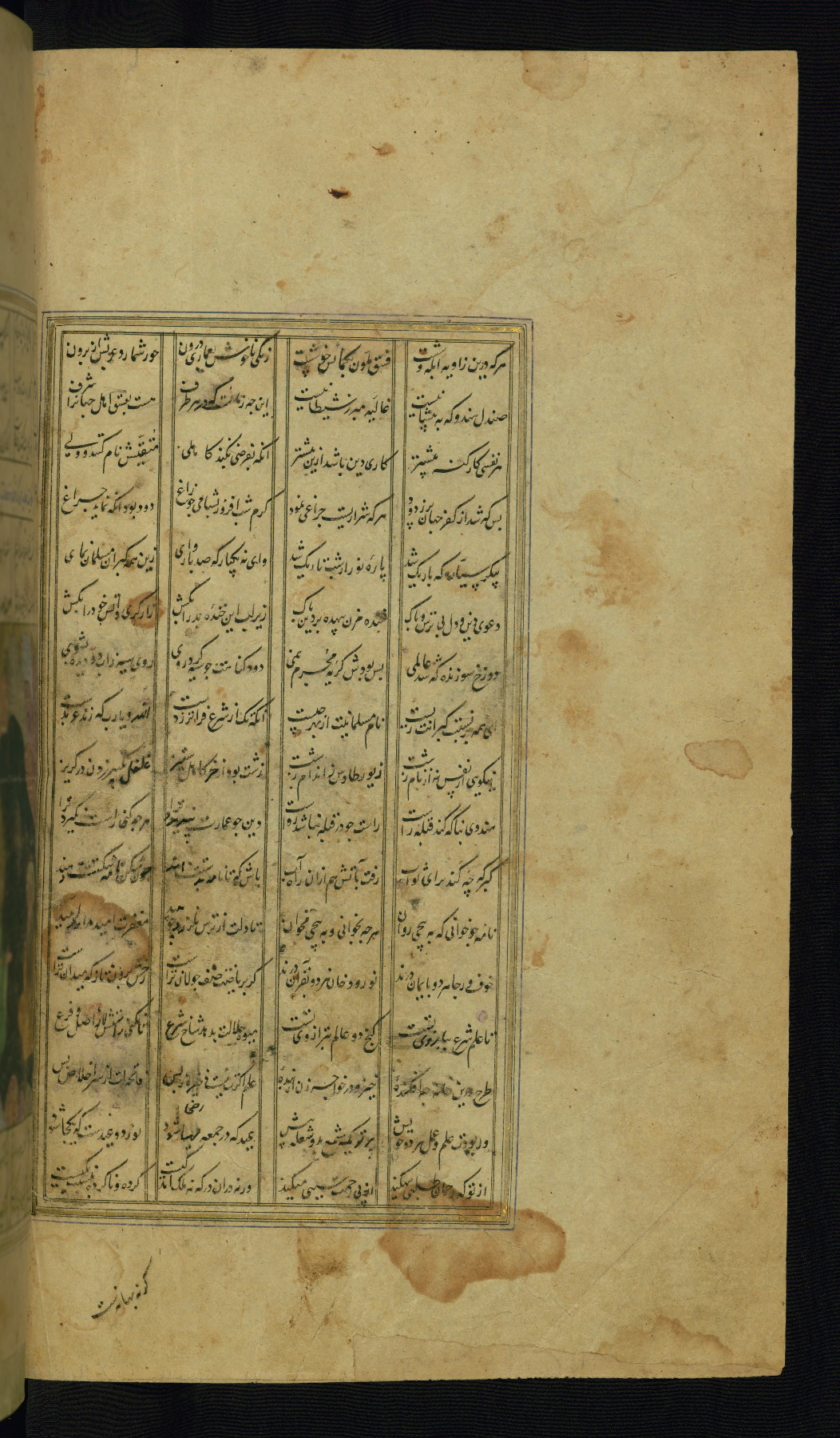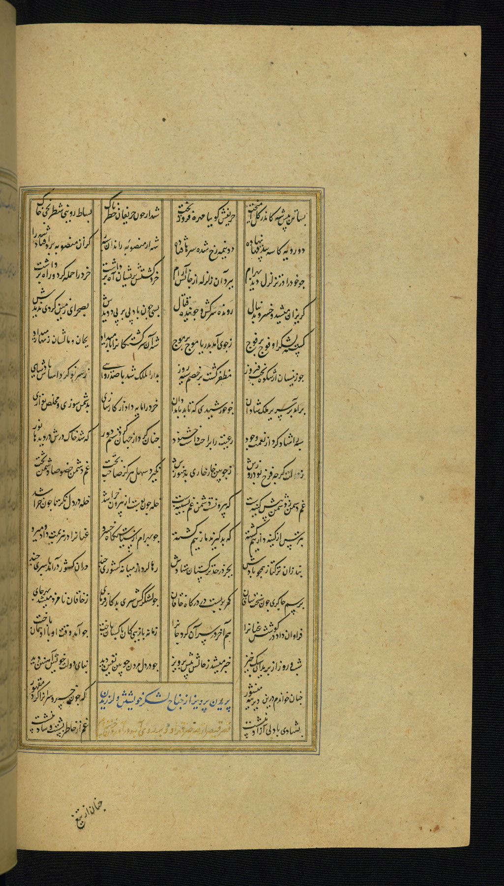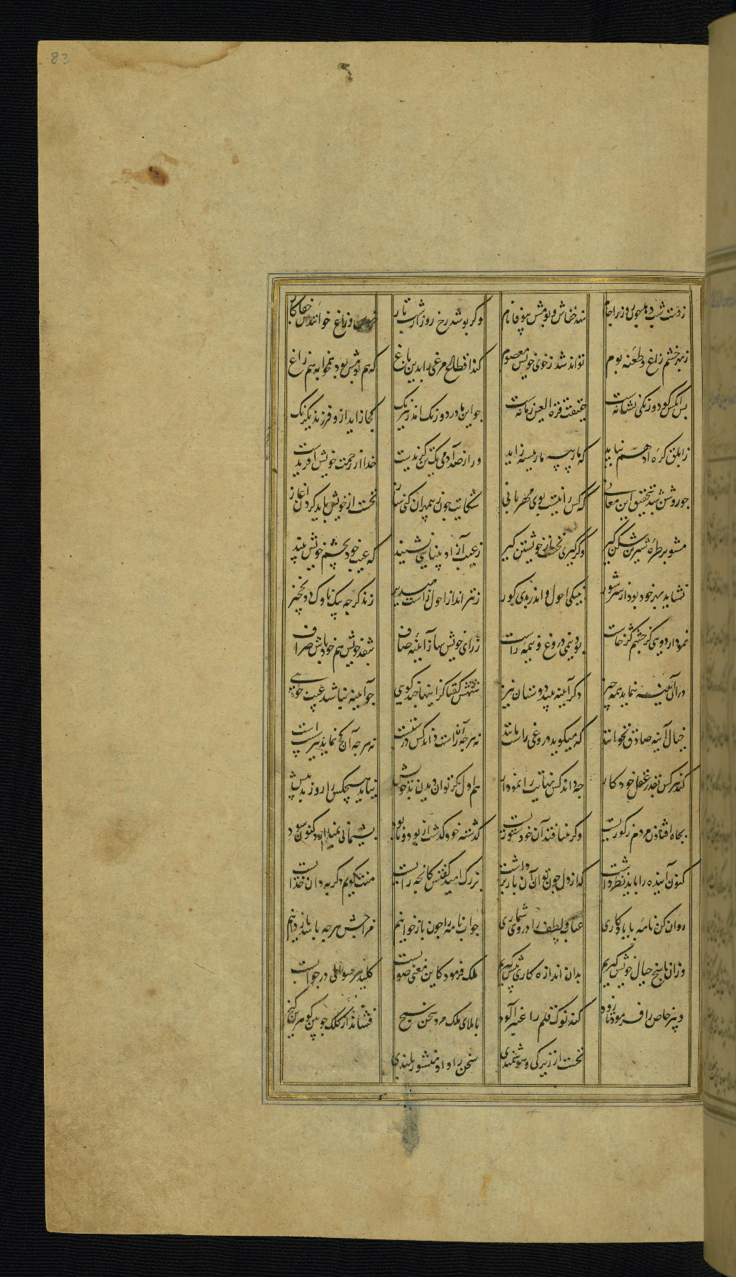 This is an illustrated and illuminated Safavid copy of the Khamsah (quintet) of Amīr Khusraw Dihlavī (d. 725 AH / 1325 CE), written by Pīr Ḥusayn al-Kātib al-Shīrāzī in 935 AH / 1529 CE. The codex opens with a double-page illuminated frontispiece with verses in honor of the poet Mir (Amir) Khusraw (fols. 1b-2a). There are four illuminated incipit pages introducing the individual poems, and thirteen paintings illustrate the text. The lacquer binding, which is not original to the manuscript, has a hunting scene on the upper and lower boards. The lower board is inscribed yā Shāh Najaf (oh, King of Najaf, i.e. ʿAlī) and is dated 1271 AH / 1854 CE.