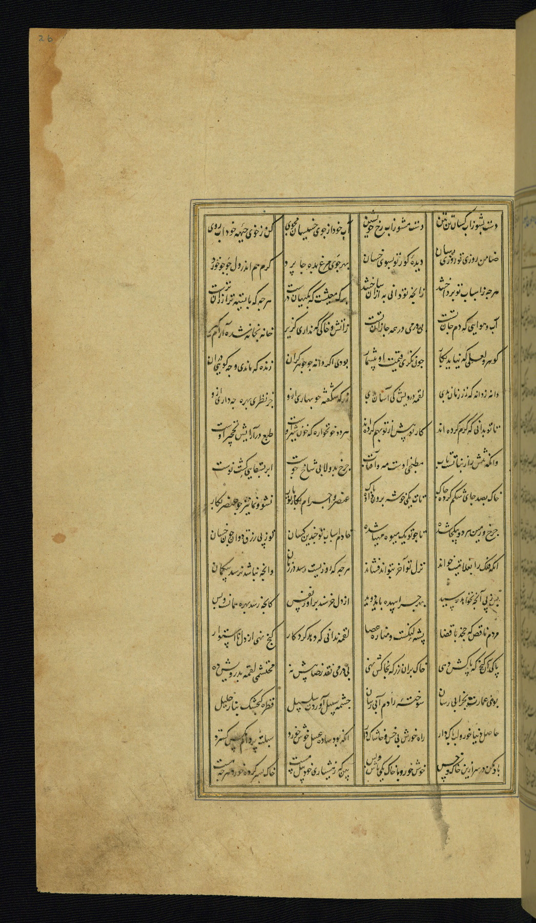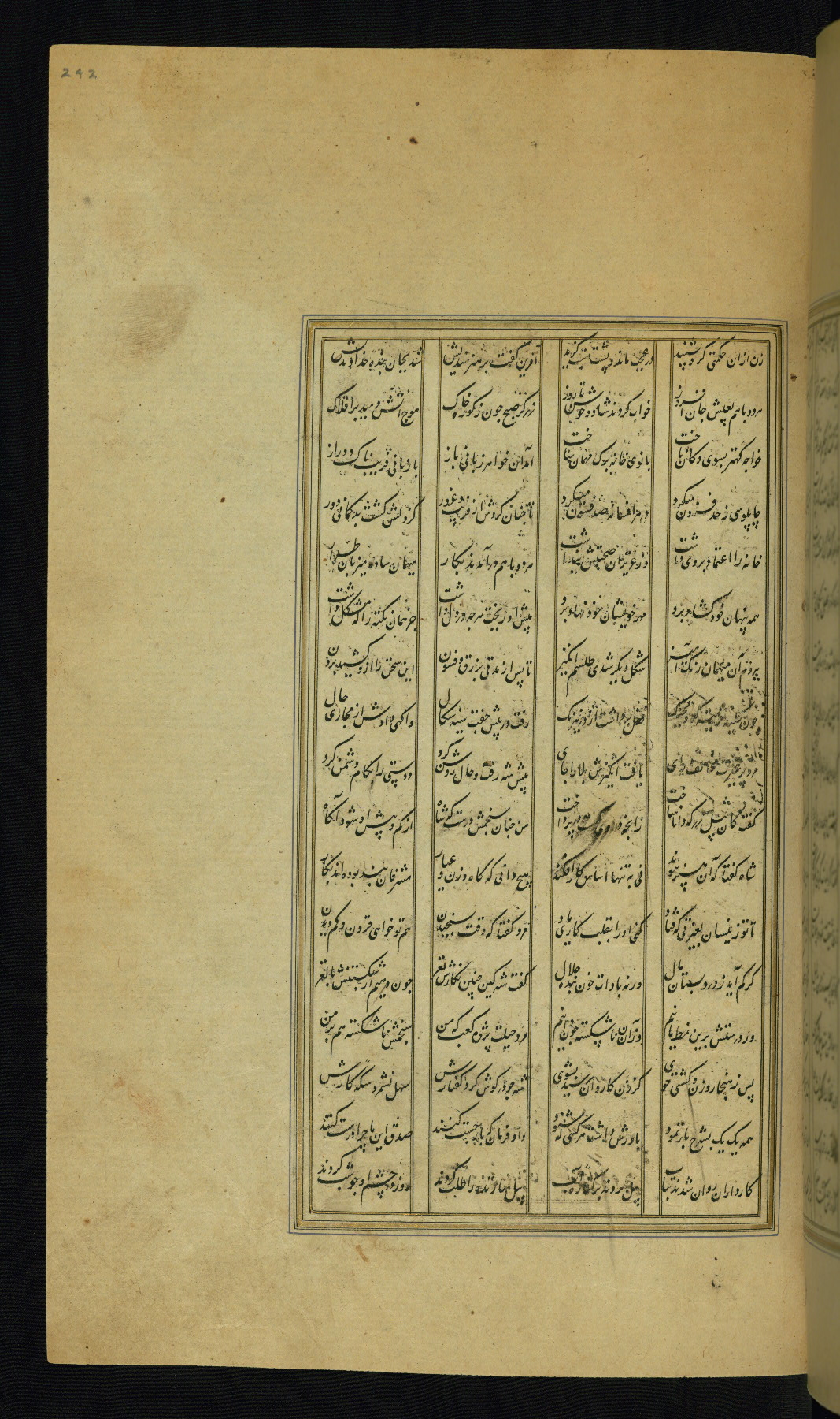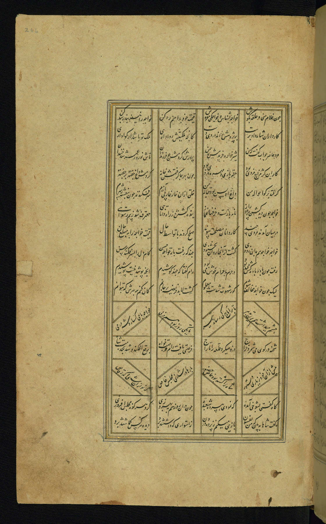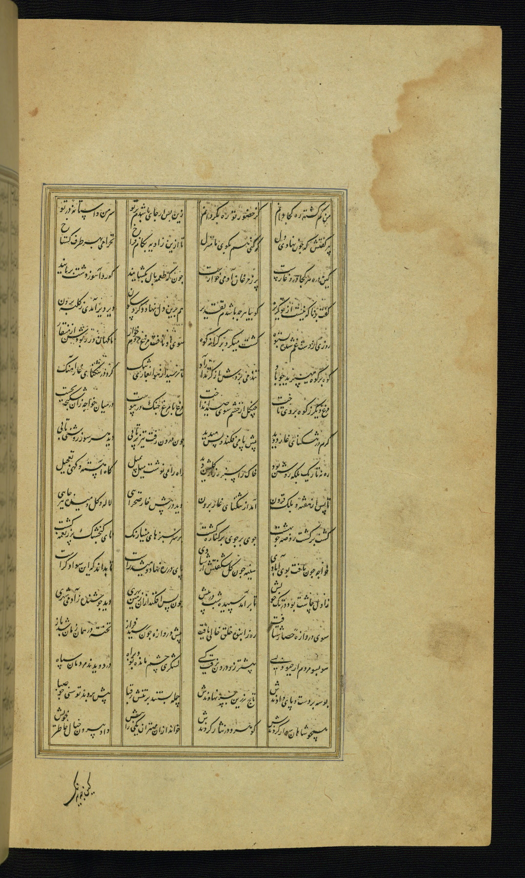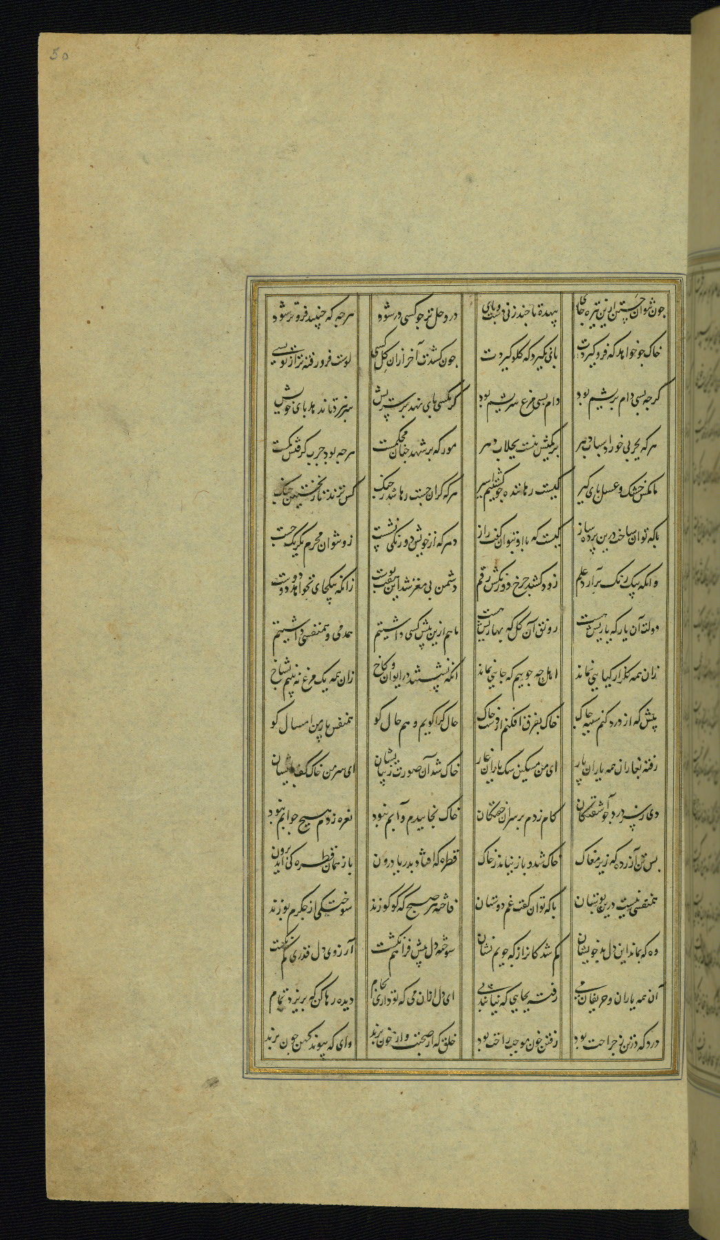 This is an illustrated and illuminated Safavid copy of the Khamsah (quintet) of Amīr Khusraw Dihlavī (d. 725 AH / 1325 CE), written by Pīr Ḥusayn al-Kātib al-Shīrāzī in 935 AH / 1529 CE. The codex opens with a double-page illuminated frontispiece with verses in honor of the poet Mir (Amir) Khusraw (fols. 1b-2a). There are four illuminated incipit pages introducing the individual poems, and thirteen paintings illustrate the text. The lacquer binding, which is not original to the manuscript, has a hunting scene on the upper and lower boards. The lower board is inscribed yā Shāh Najaf (oh, King of Najaf, i.e. ʿAlī) and is dated 1271 AH / 1854 CE.