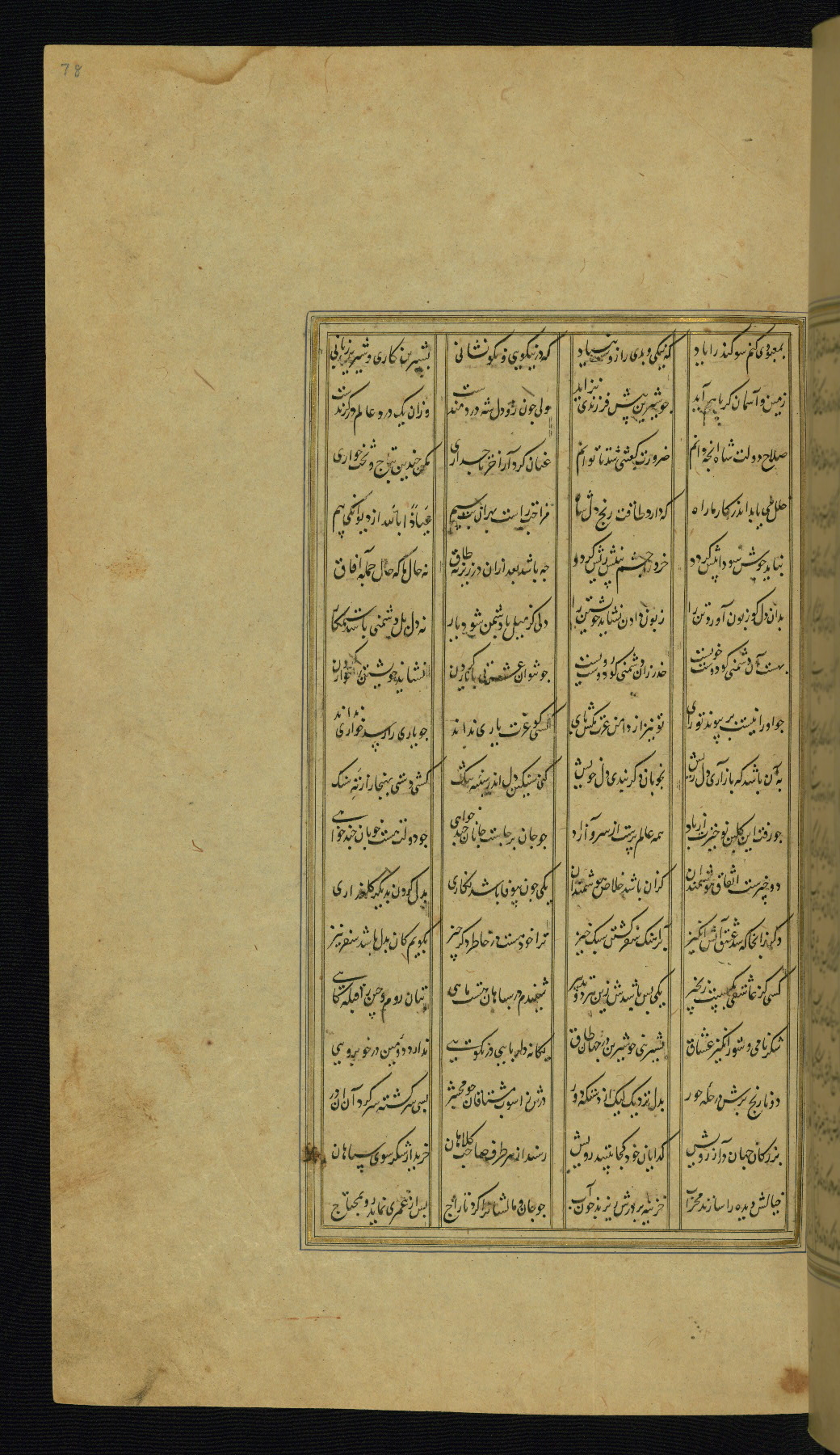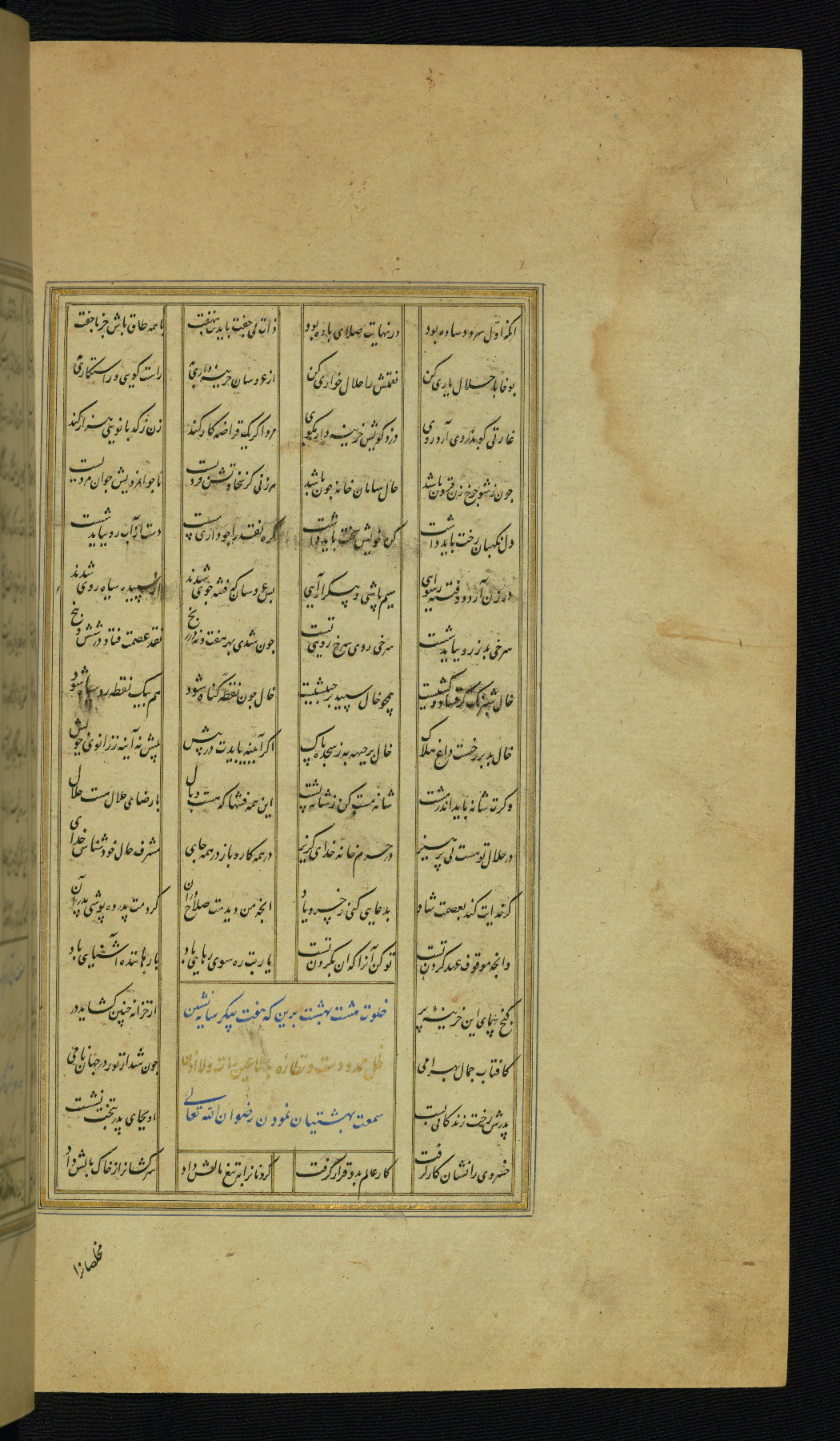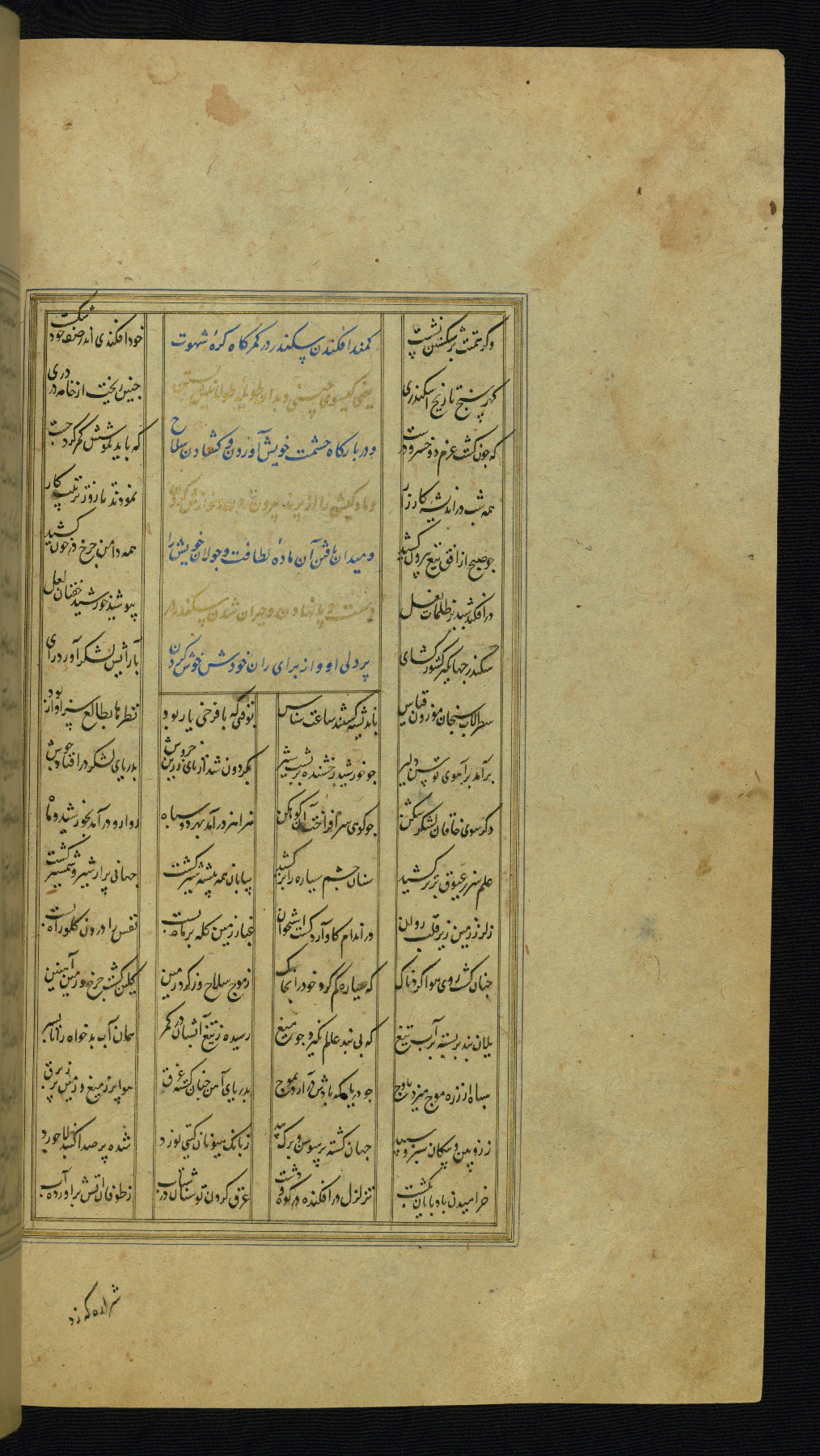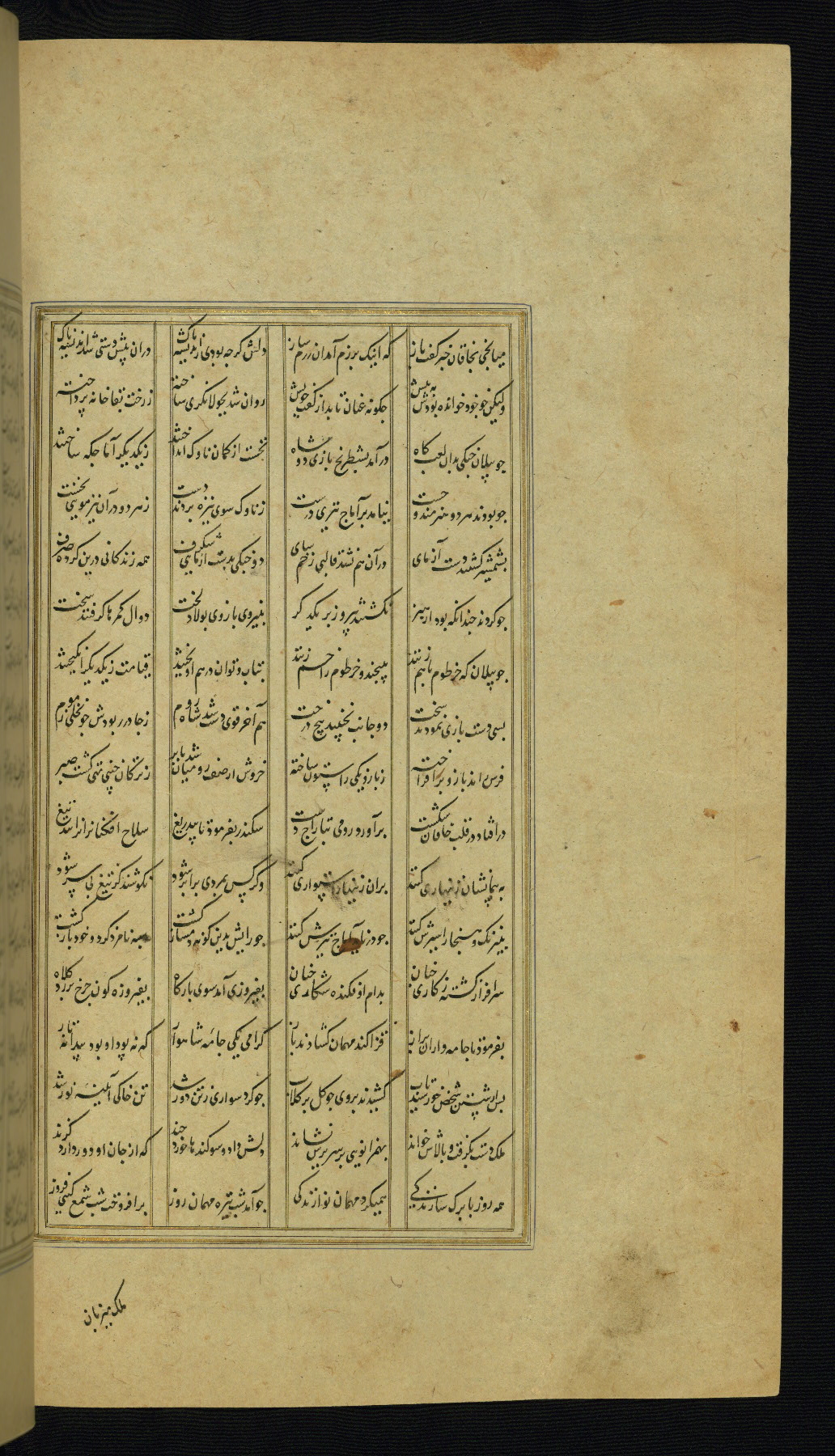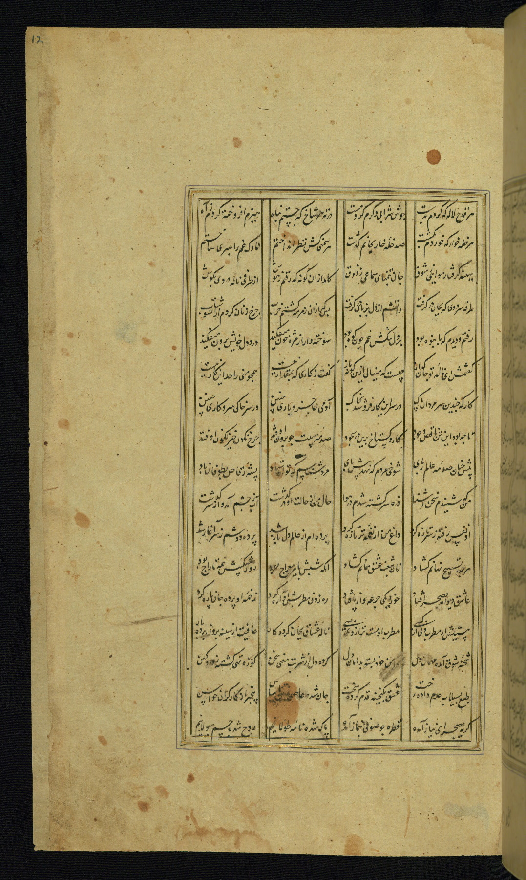 This is an illustrated and illuminated Safavid copy of the Khamsah (quintet) of Amīr Khusraw Dihlavī (d. 725 AH / 1325 CE), written by Pīr Ḥusayn al-Kātib al-Shīrāzī in 935 AH / 1529 CE. The codex opens with a double-page illuminated frontispiece with verses in honor of the poet Mir (Amir) Khusraw (fols. 1b-2a). There are four illuminated incipit pages introducing the individual poems, and thirteen paintings illustrate the text. The lacquer binding, which is not original to the manuscript, has a hunting scene on the upper and lower boards. The lower board is inscribed yā Shāh Najaf (oh, King of Najaf, i.e. ʿAlī) and is dated 1271 AH / 1854 CE.