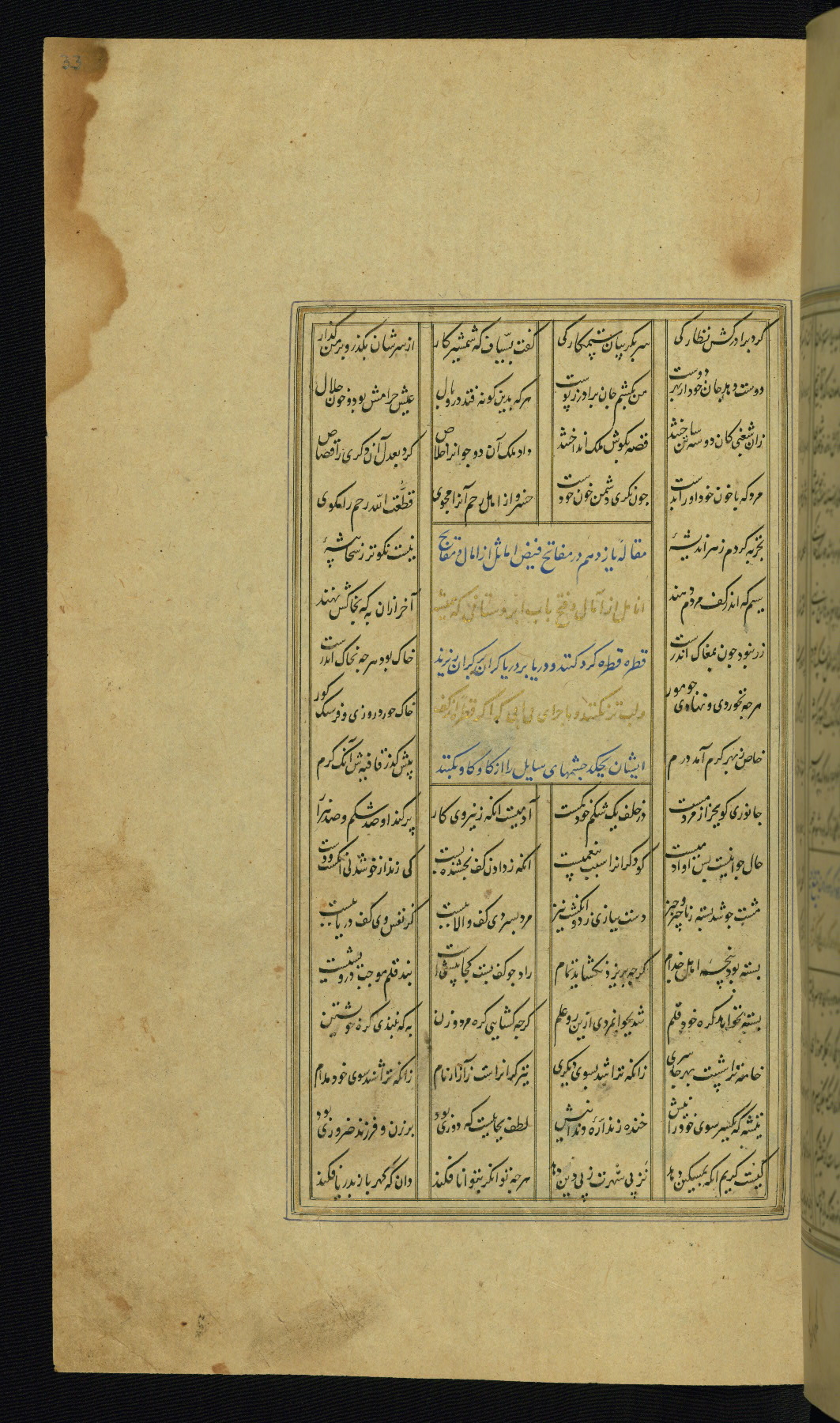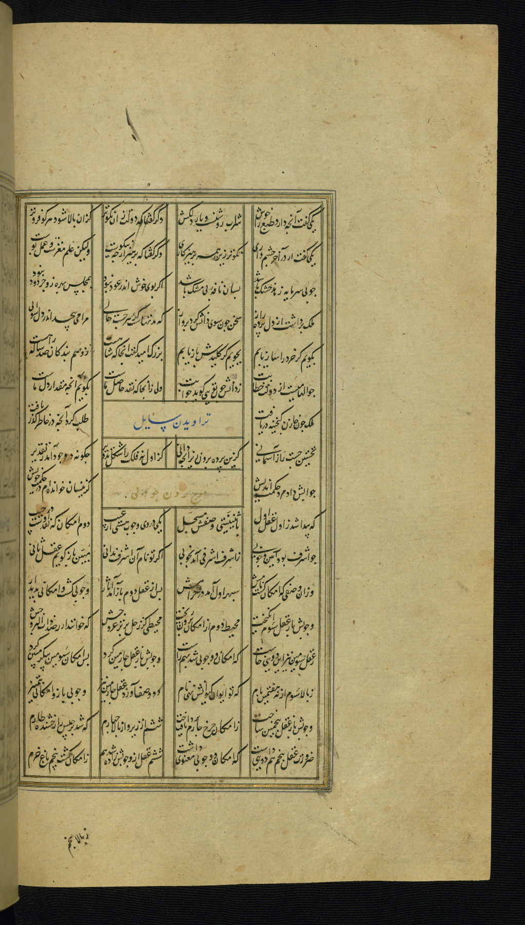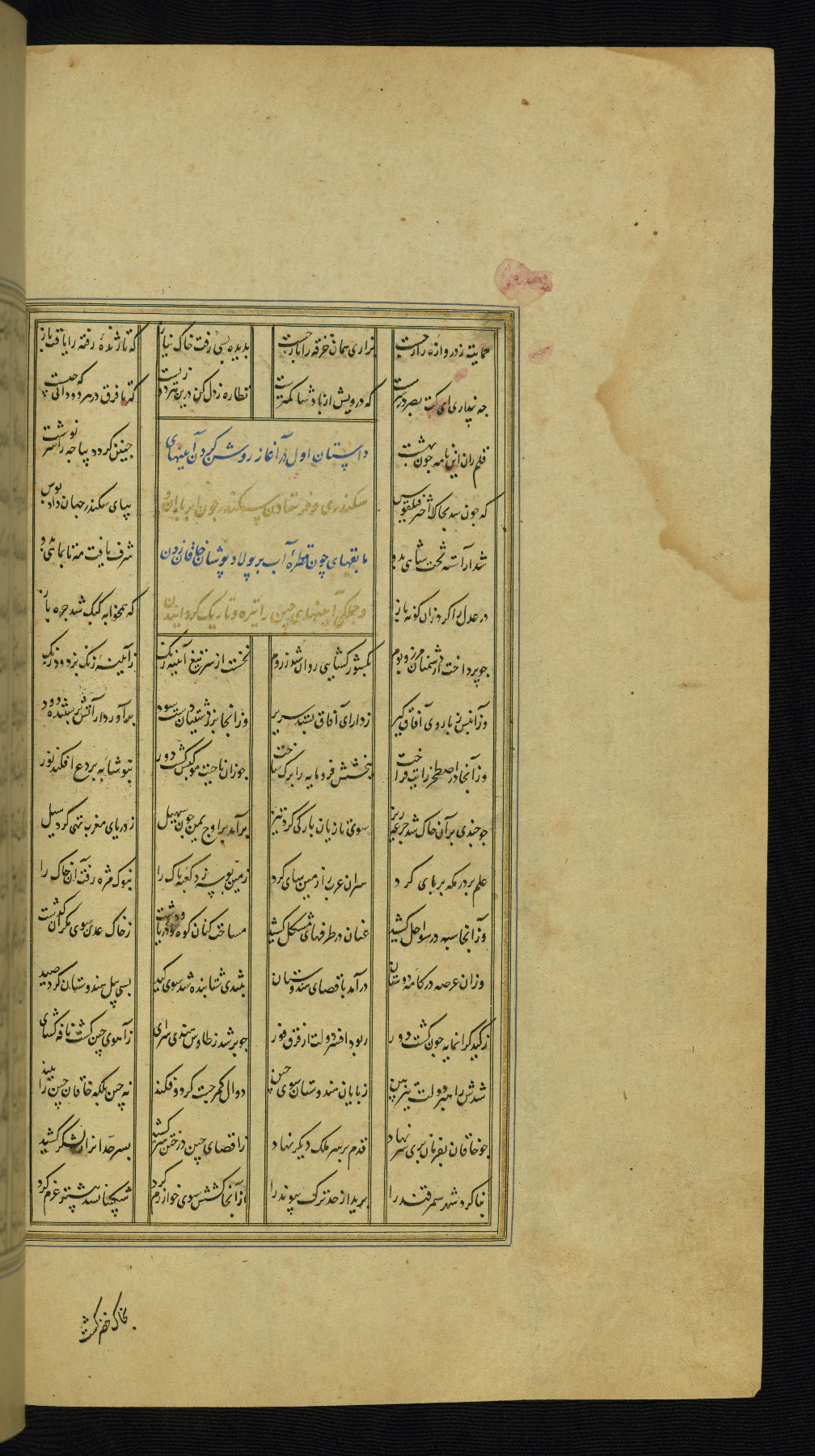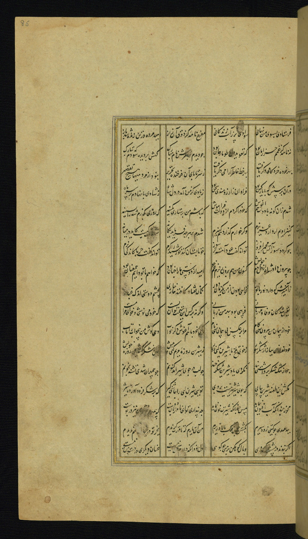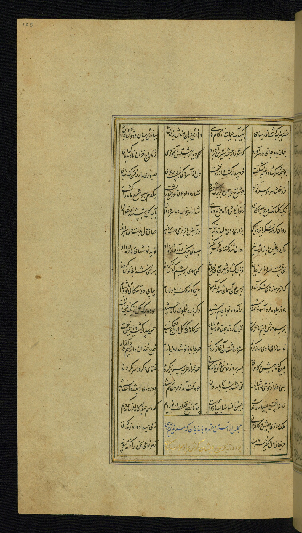 This is an illustrated and illuminated Safavid copy of the Khamsah (quintet) of Amīr Khusraw Dihlavī (d. 725 AH / 1325 CE), written by Pīr Ḥusayn al-Kātib al-Shīrāzī in 935 AH / 1529 CE. The codex opens with a double-page illuminated frontispiece with verses in honor of the poet Mir (Amir) Khusraw (fols. 1b-2a). There are four illuminated incipit pages introducing the individual poems, and thirteen paintings illustrate the text. The lacquer binding, which is not original to the manuscript, has a hunting scene on the upper and lower boards. The lower board is inscribed yā Shāh Najaf (oh, King of Najaf, i.e. ʿAlī) and is dated 1271 AH / 1854 CE.