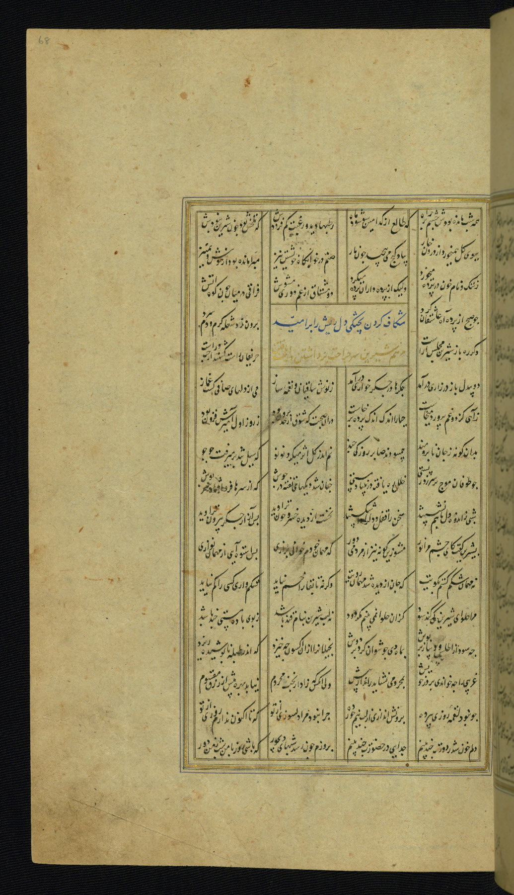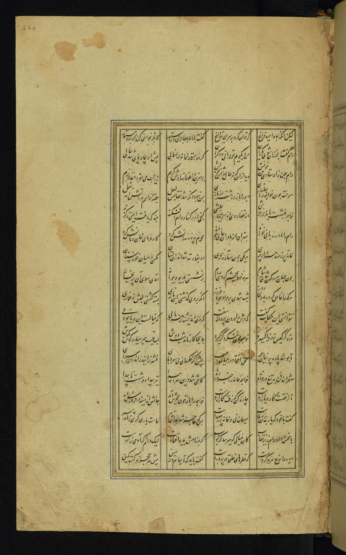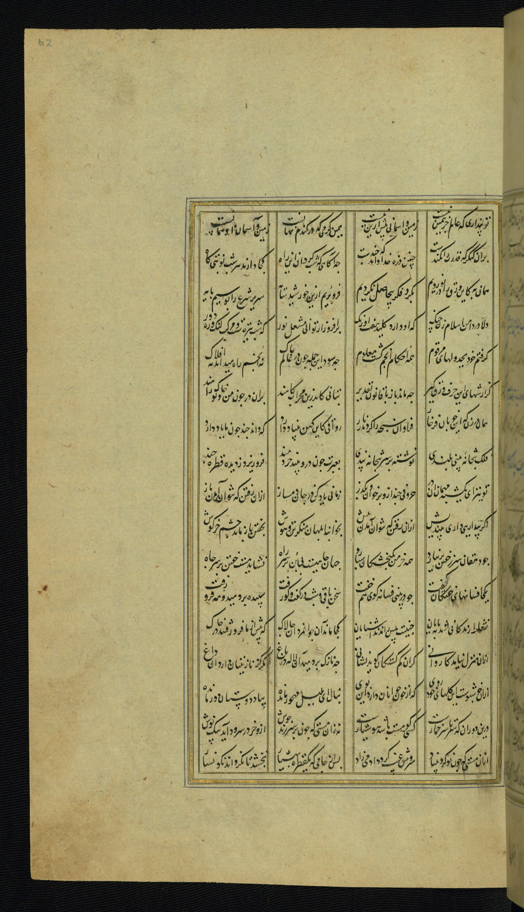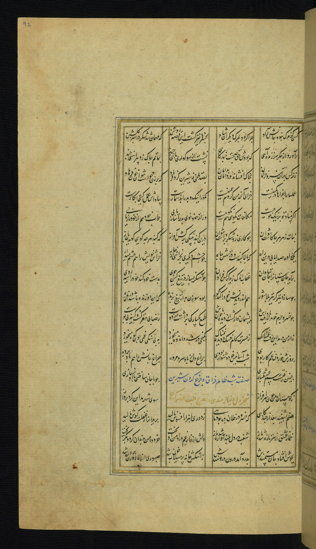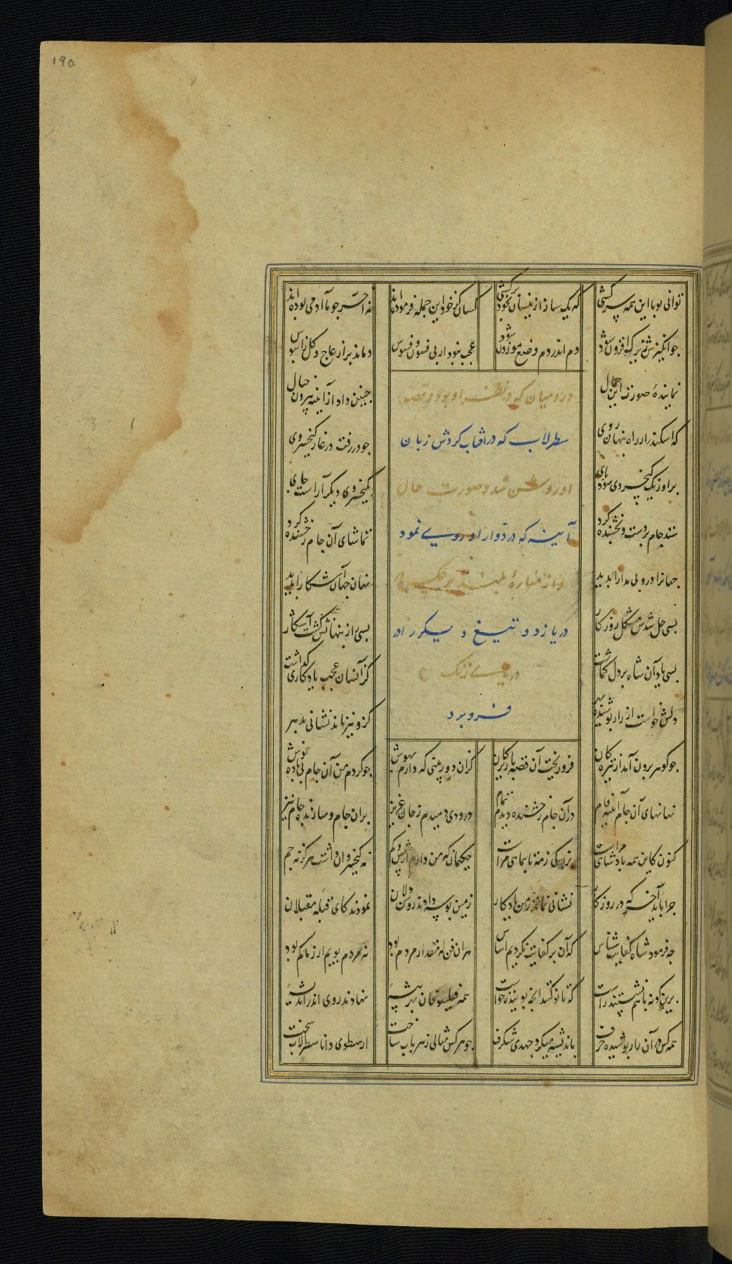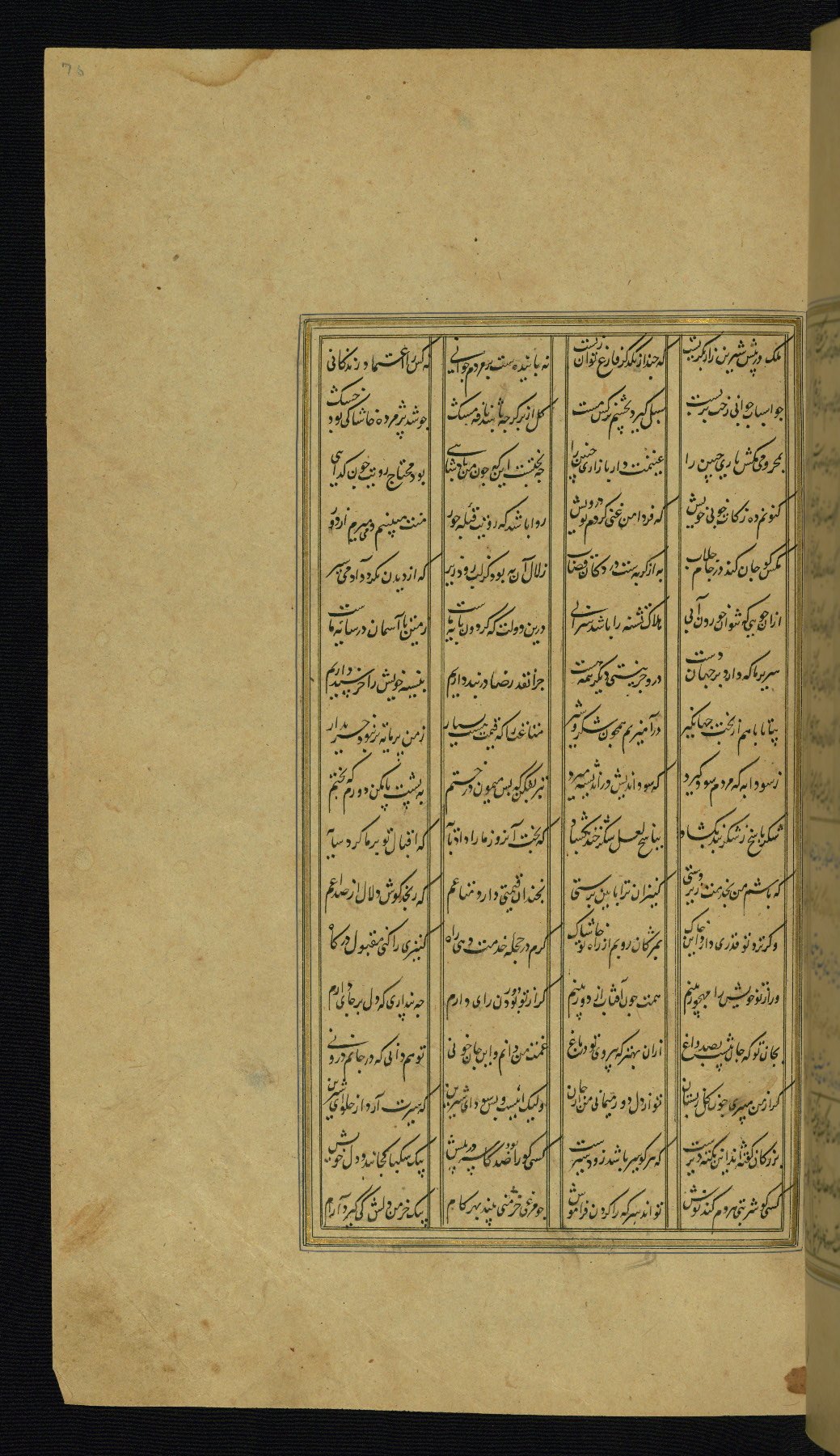This is an illustrated and illuminated Safavid copy of the Khamsah (quintet) of Amīr Khusraw Dihlavī (d. 725 AH / 1325 CE), written by Pīr Ḥusayn al-Kātib al-Shīrāzī in 935 AH / 1529 CE. The codex opens with a double-page illuminated frontispiece with verses in honor of the poet Mir (Amir) Khusraw (fols. 1b-2a). There are four illuminated incipit pages introducing the individual poems, and thirteen paintings illustrate the text. The lacquer binding, which is not original to the manuscript, has a hunting scene on the upper and lower boards. The lower board is inscribed yā Shāh Najaf (oh, King of Najaf, i.e. ʿAlī) and is dated 1271 AH / 1854 CE.