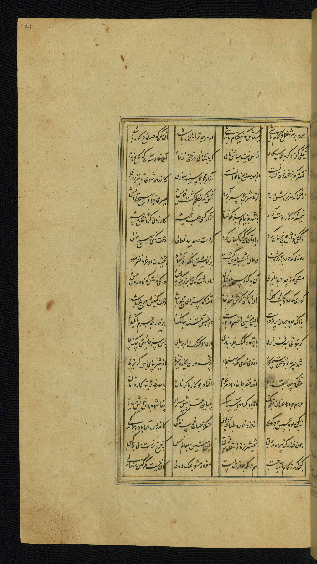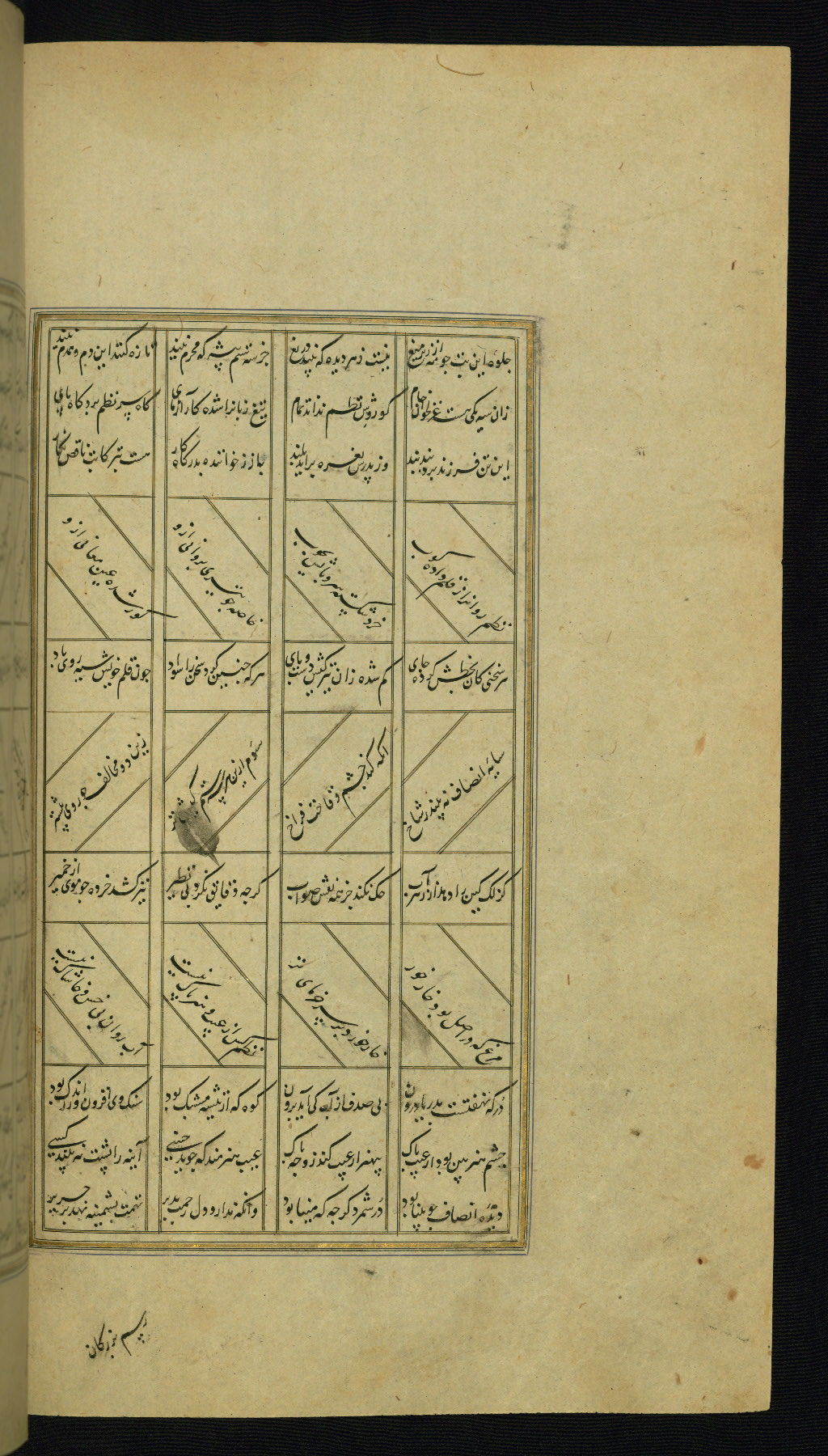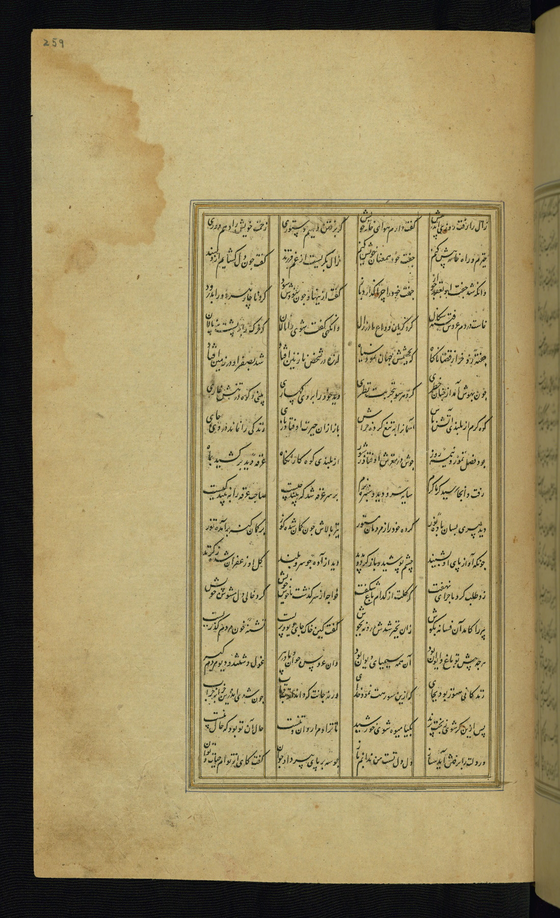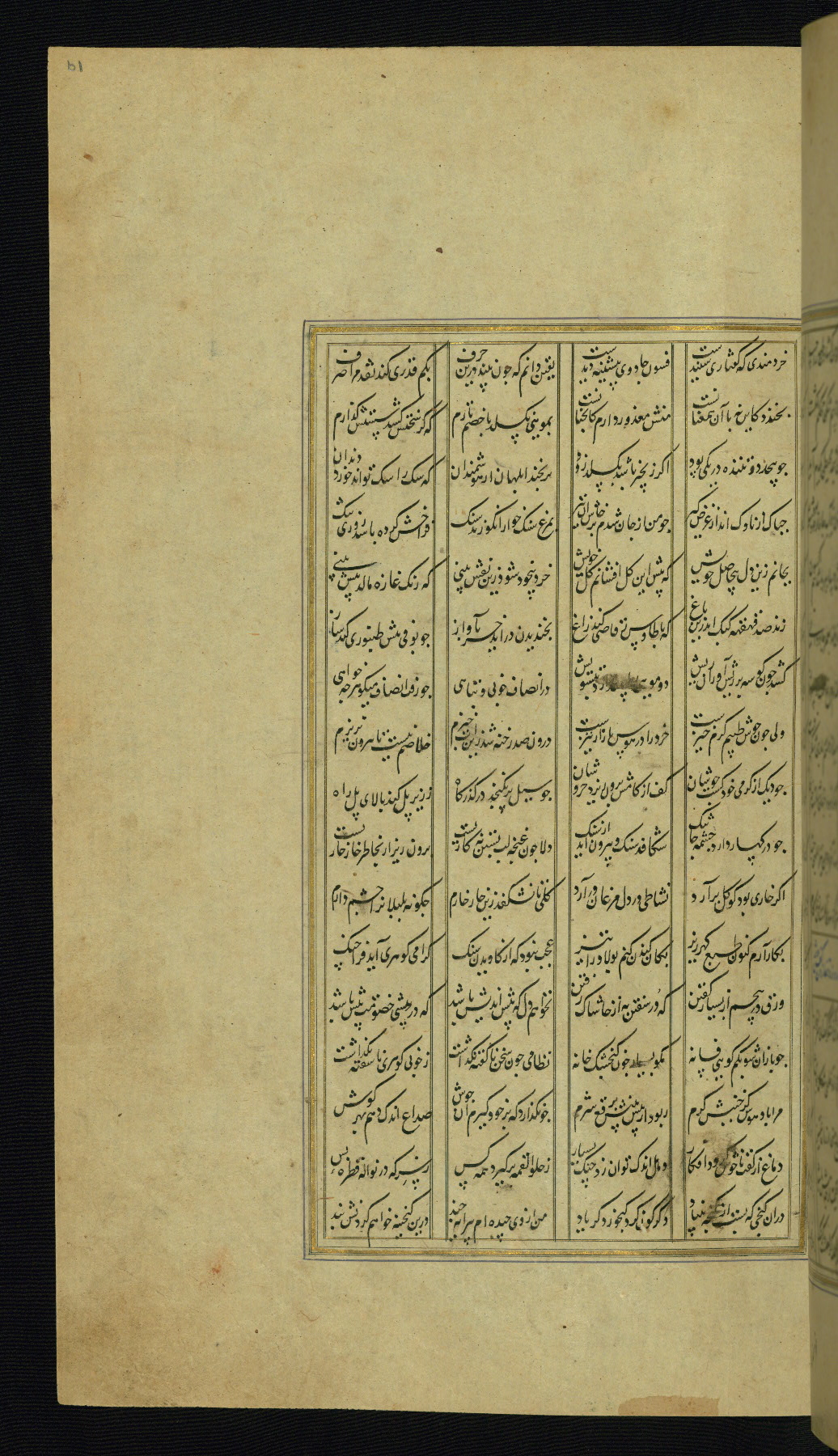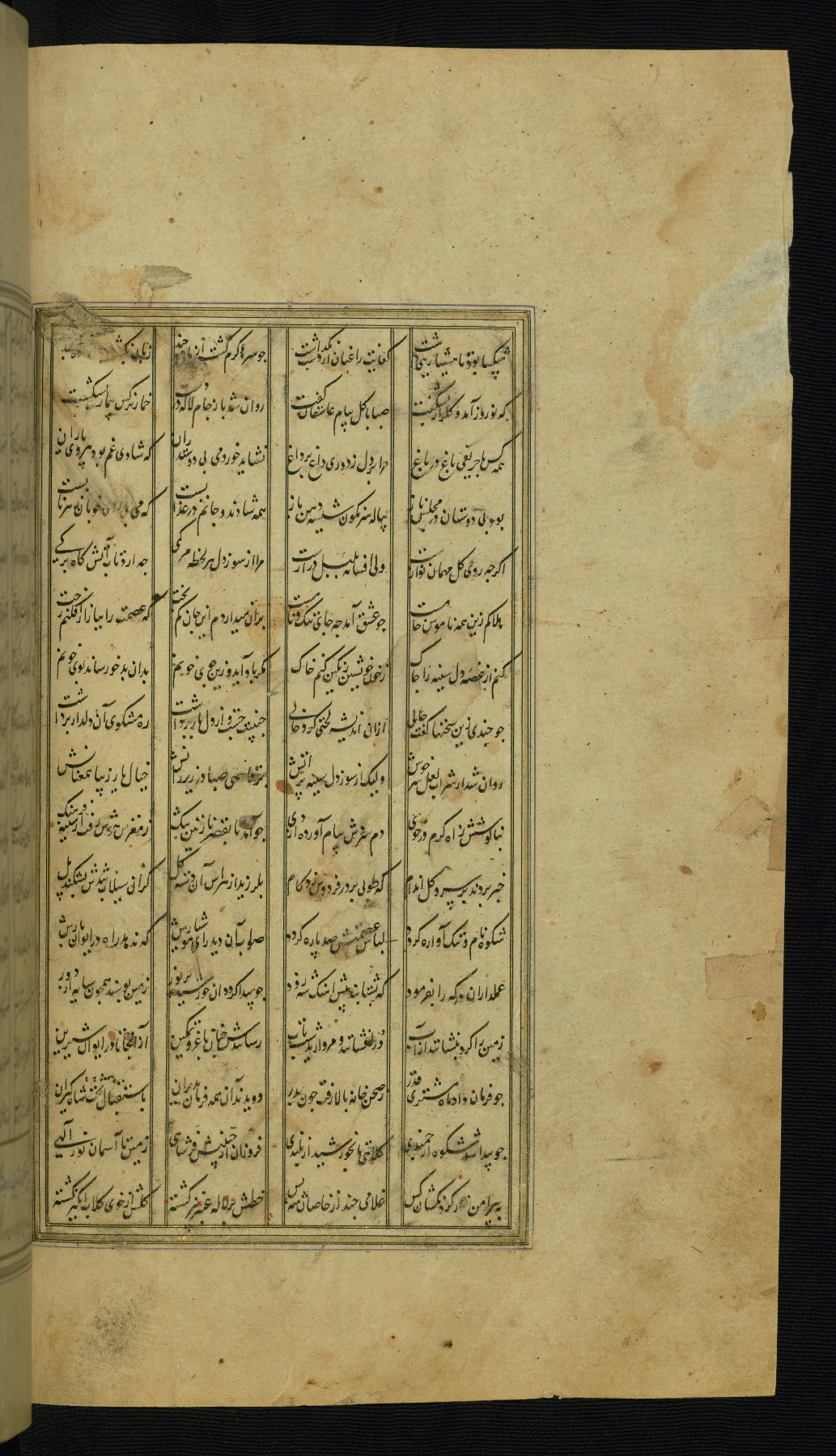 This is an illustrated and illuminated Safavid copy of the Khamsah (quintet) of Amīr Khusraw Dihlavī (d. 725 AH / 1325 CE), written by Pīr Ḥusayn al-Kātib al-Shīrāzī in 935 AH / 1529 CE. The codex opens with a double-page illuminated frontispiece with verses in honor of the poet Mir (Amir) Khusraw (fols. 1b-2a). There are four illuminated incipit pages introducing the individual poems, and thirteen paintings illustrate the text. The lacquer binding, which is not original to the manuscript, has a hunting scene on the upper and lower boards. The lower board is inscribed yā Shāh Najaf (oh, King of Najaf, i.e. ʿAlī) and is dated 1271 AH / 1854 CE.