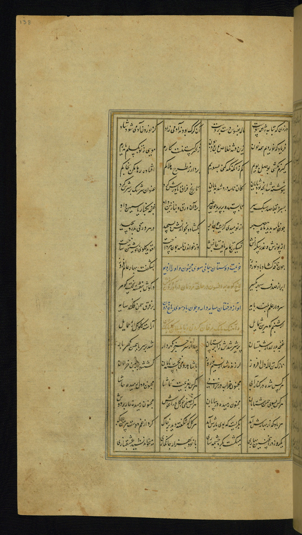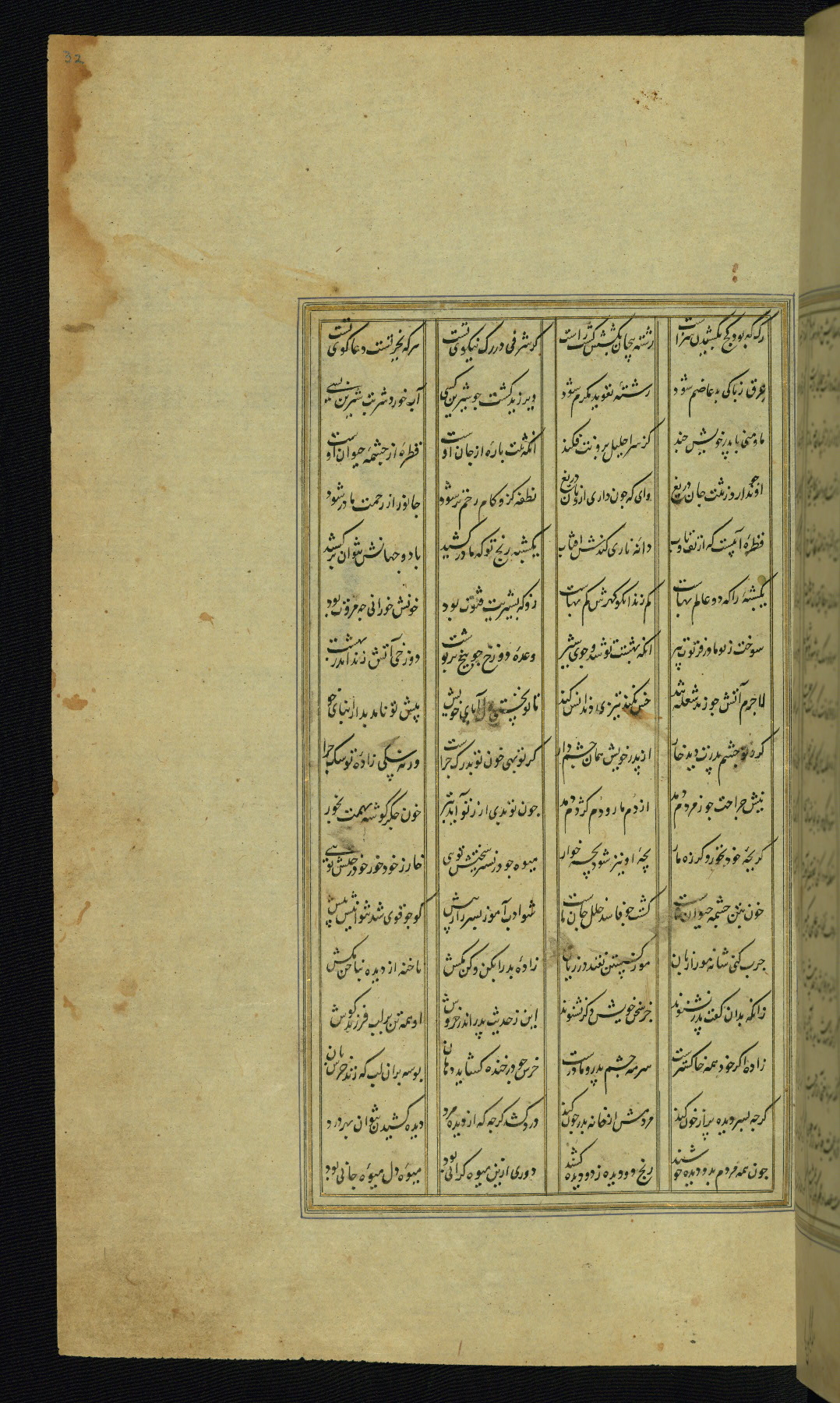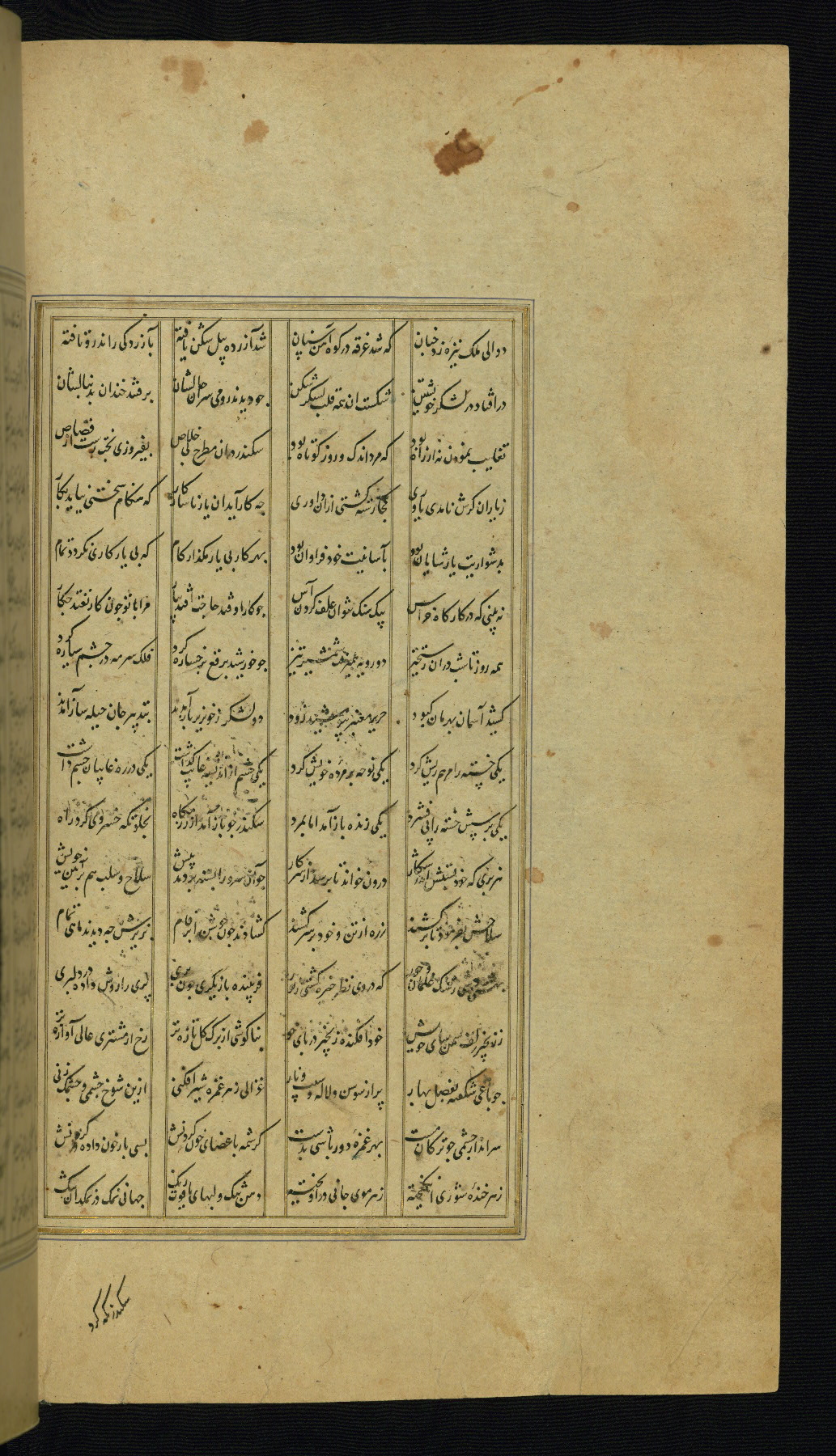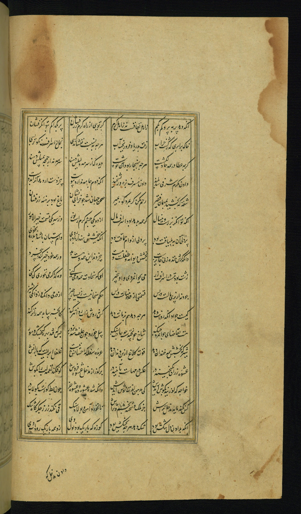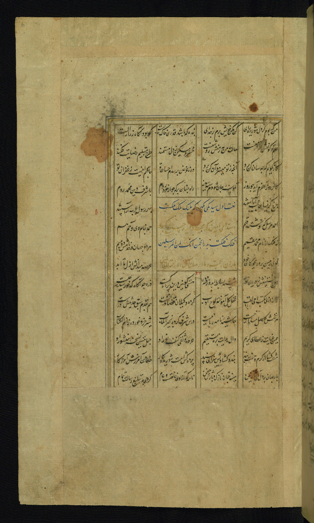 This is an illustrated and illuminated Safavid copy of the Khamsah (quintet) of Amīr Khusraw Dihlavī (d. 725 AH / 1325 CE), written by Pīr Ḥusayn al-Kātib al-Shīrāzī in 935 AH / 1529 CE. The codex opens with a double-page illuminated frontispiece with verses in honor of the poet Mir (Amir) Khusraw (fols. 1b-2a). There are four illuminated incipit pages introducing the individual poems, and thirteen paintings illustrate the text. The lacquer binding, which is not original to the manuscript, has a hunting scene on the upper and lower boards. The lower board is inscribed yā Shāh Najaf (oh, King of Najaf, i.e. ʿAlī) and is dated 1271 AH / 1854 CE.