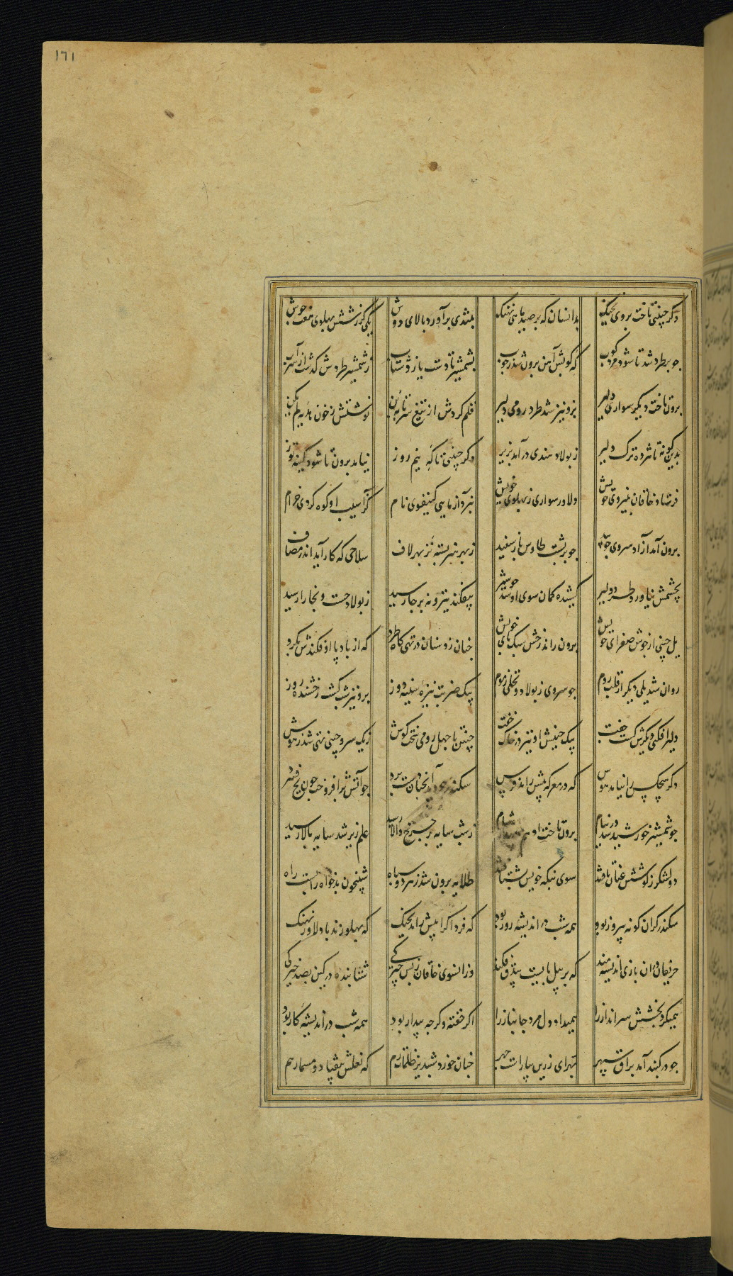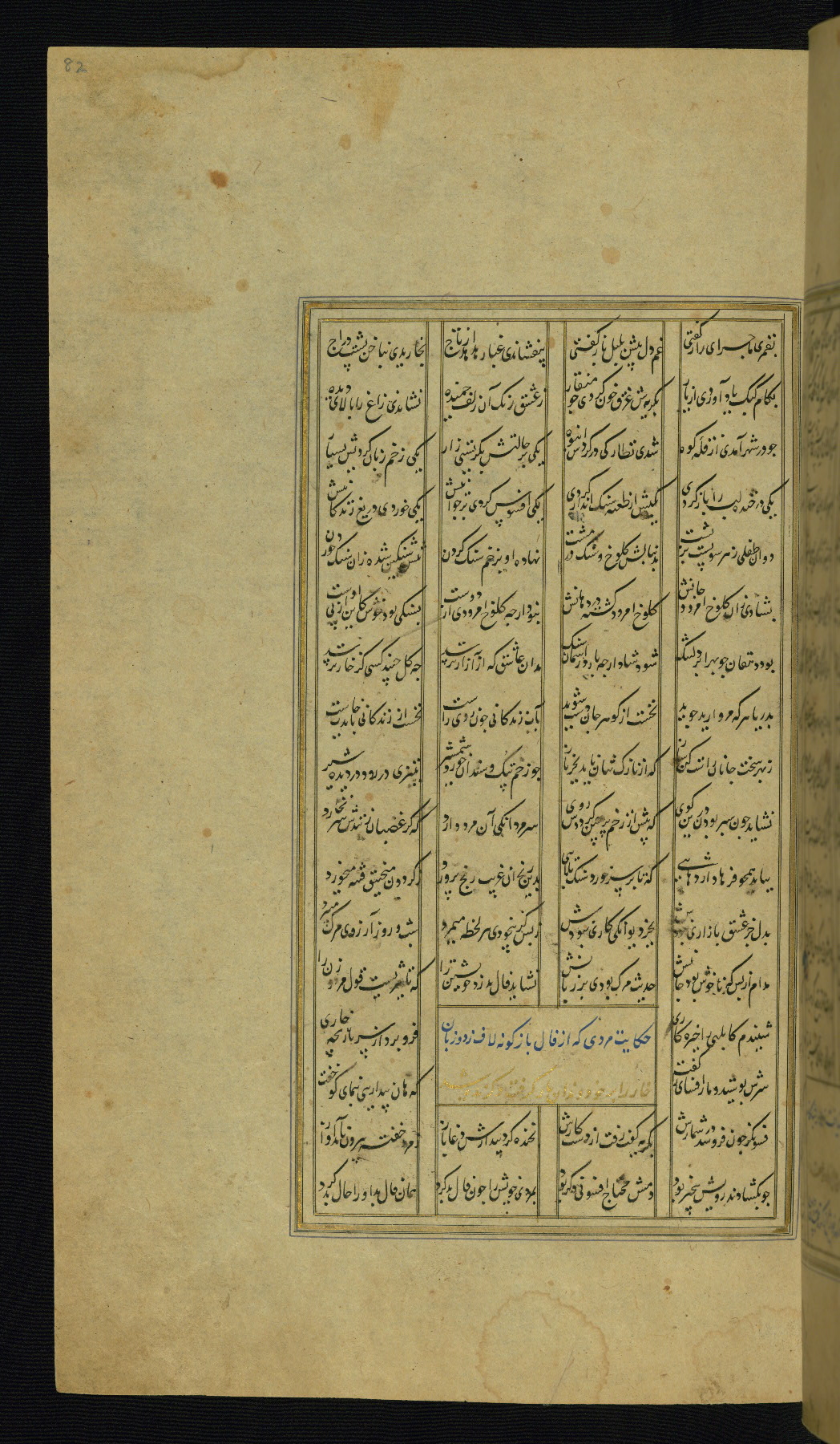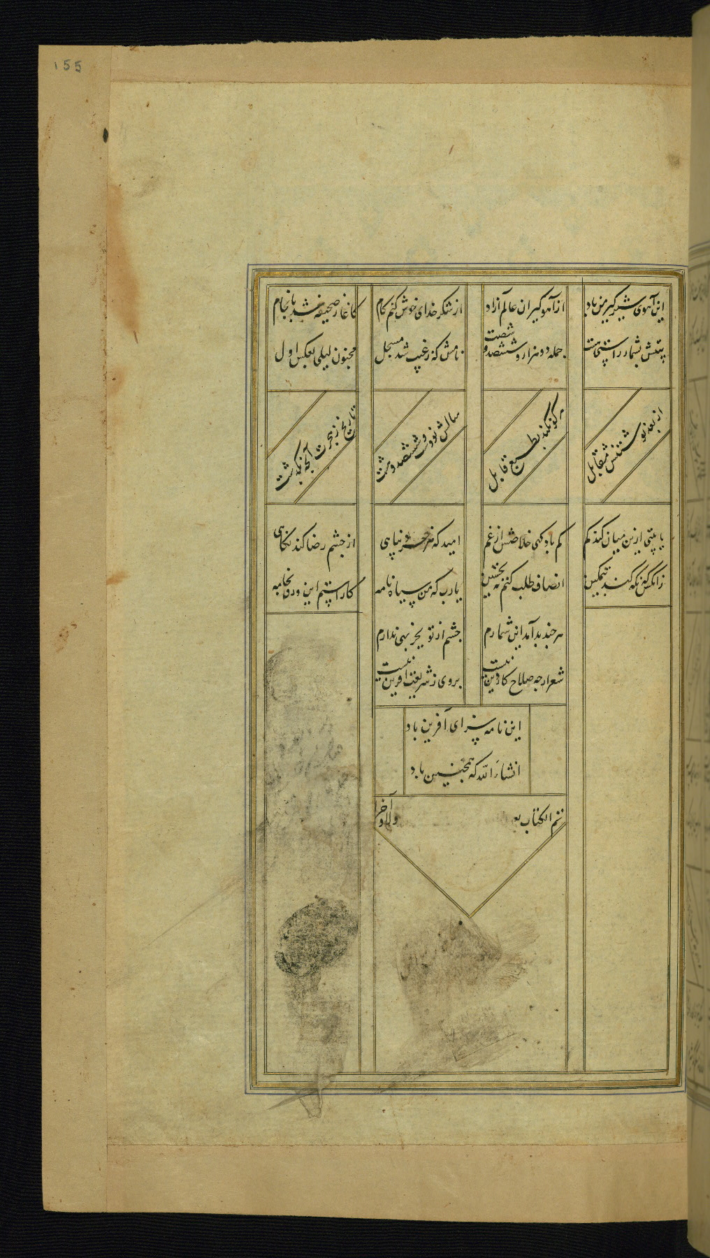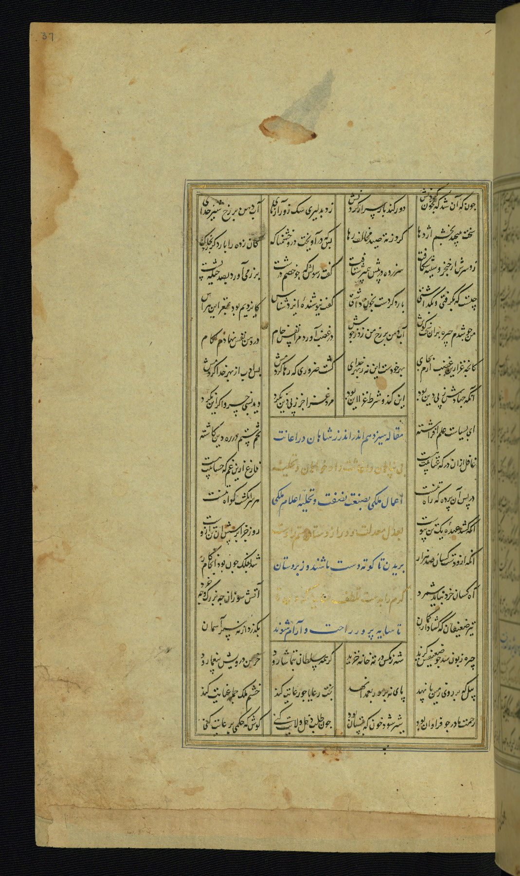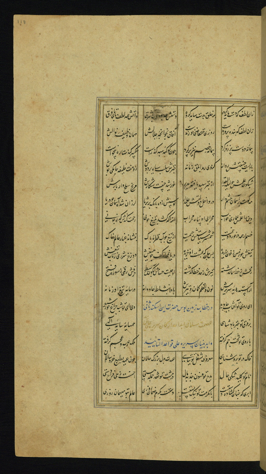 This is an illustrated and illuminated Safavid copy of the Khamsah (quintet) of Amīr Khusraw Dihlavī (d. 725 AH / 1325 CE), written by Pīr Ḥusayn al-Kātib al-Shīrāzī in 935 AH / 1529 CE. The codex opens with a double-page illuminated frontispiece with verses in honor of the poet Mir (Amir) Khusraw (fols. 1b-2a). There are four illuminated incipit pages introducing the individual poems, and thirteen paintings illustrate the text. The lacquer binding, which is not original to the manuscript, has a hunting scene on the upper and lower boards. The lower board is inscribed yā Shāh Najaf (oh, King of Najaf, i.e. ʿAlī) and is dated 1271 AH / 1854 CE.