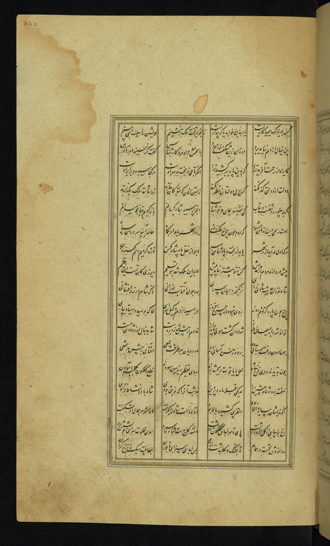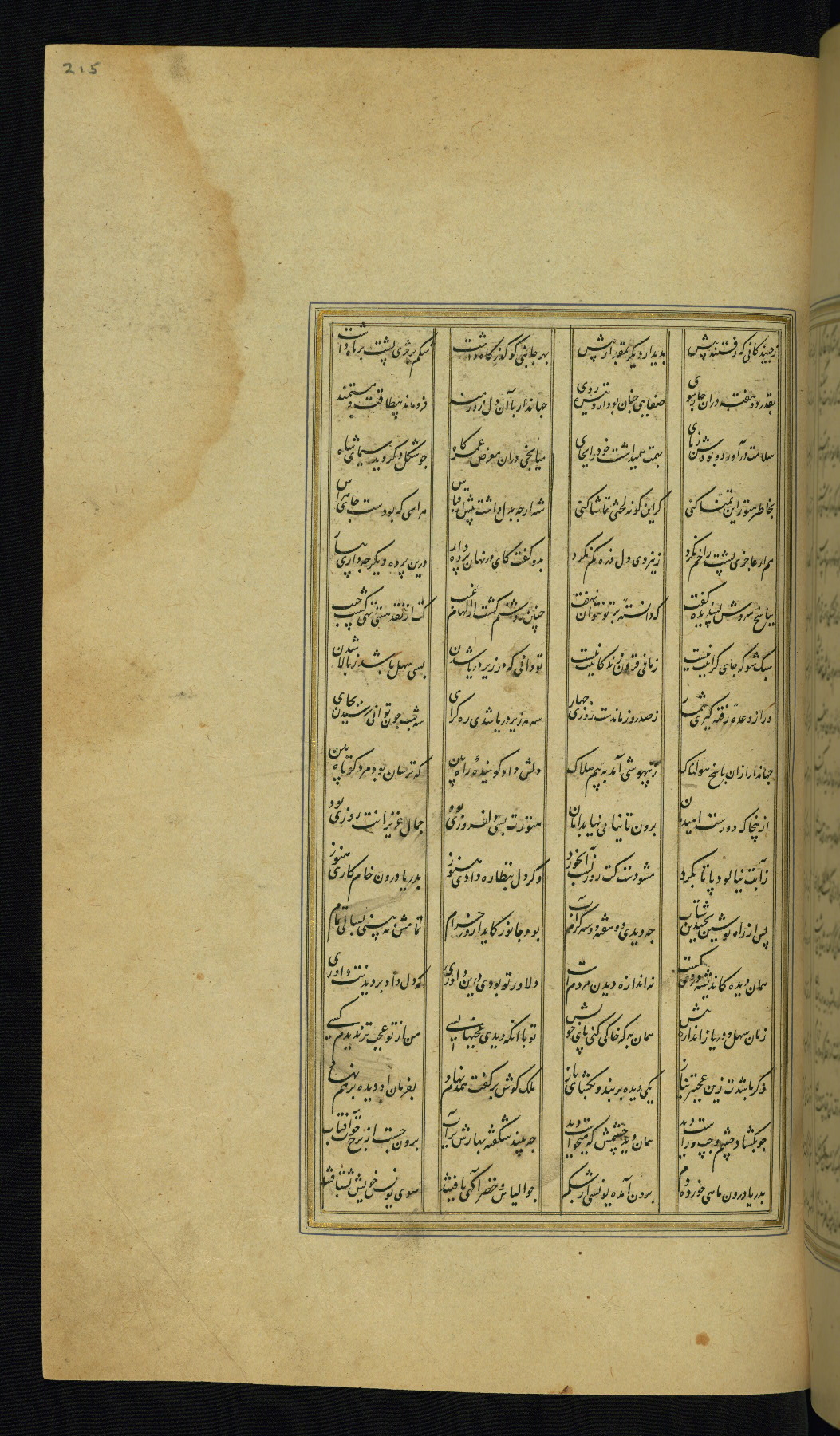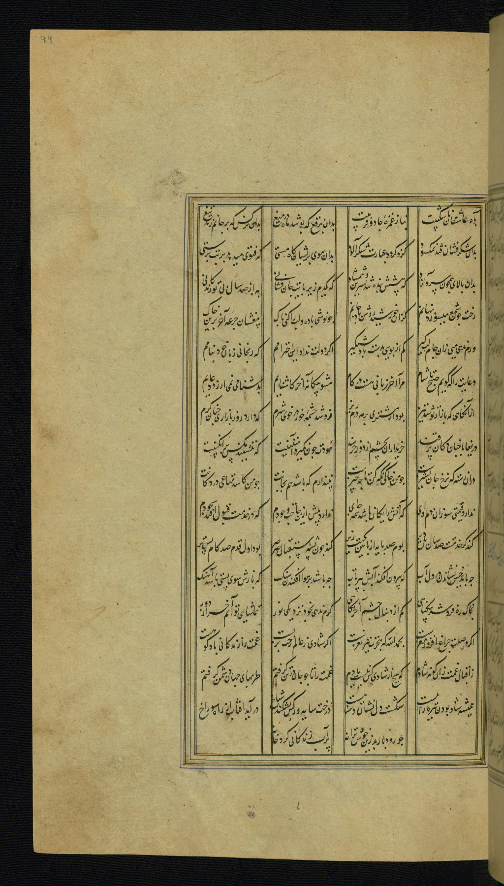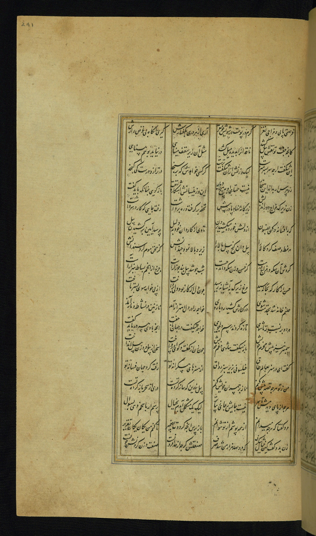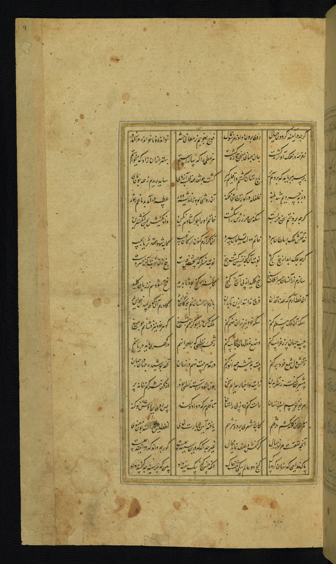 This is an illustrated and illuminated Safavid copy of the Khamsah (quintet) of Amīr Khusraw Dihlavī (d. 725 AH / 1325 CE), written by Pīr Ḥusayn al-Kātib al-Shīrāzī in 935 AH / 1529 CE. The codex opens with a double-page illuminated frontispiece with verses in honor of the poet Mir (Amir) Khusraw (fols. 1b-2a). There are four illuminated incipit pages introducing the individual poems, and thirteen paintings illustrate the text. The lacquer binding, which is not original to the manuscript, has a hunting scene on the upper and lower boards. The lower board is inscribed yā Shāh Najaf (oh, King of Najaf, i.e. ʿAlī) and is dated 1271 AH / 1854 CE.