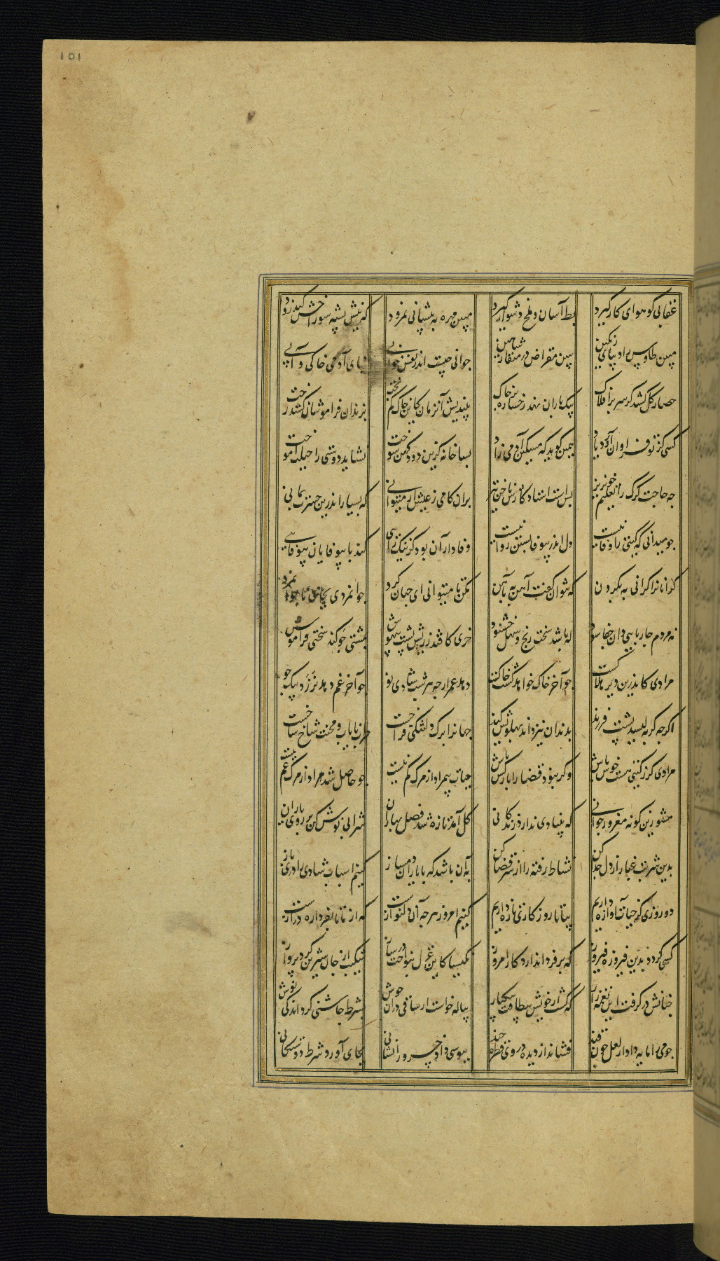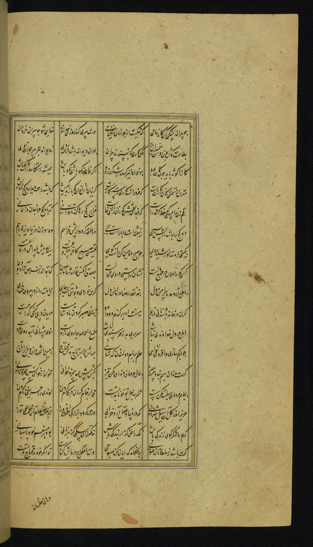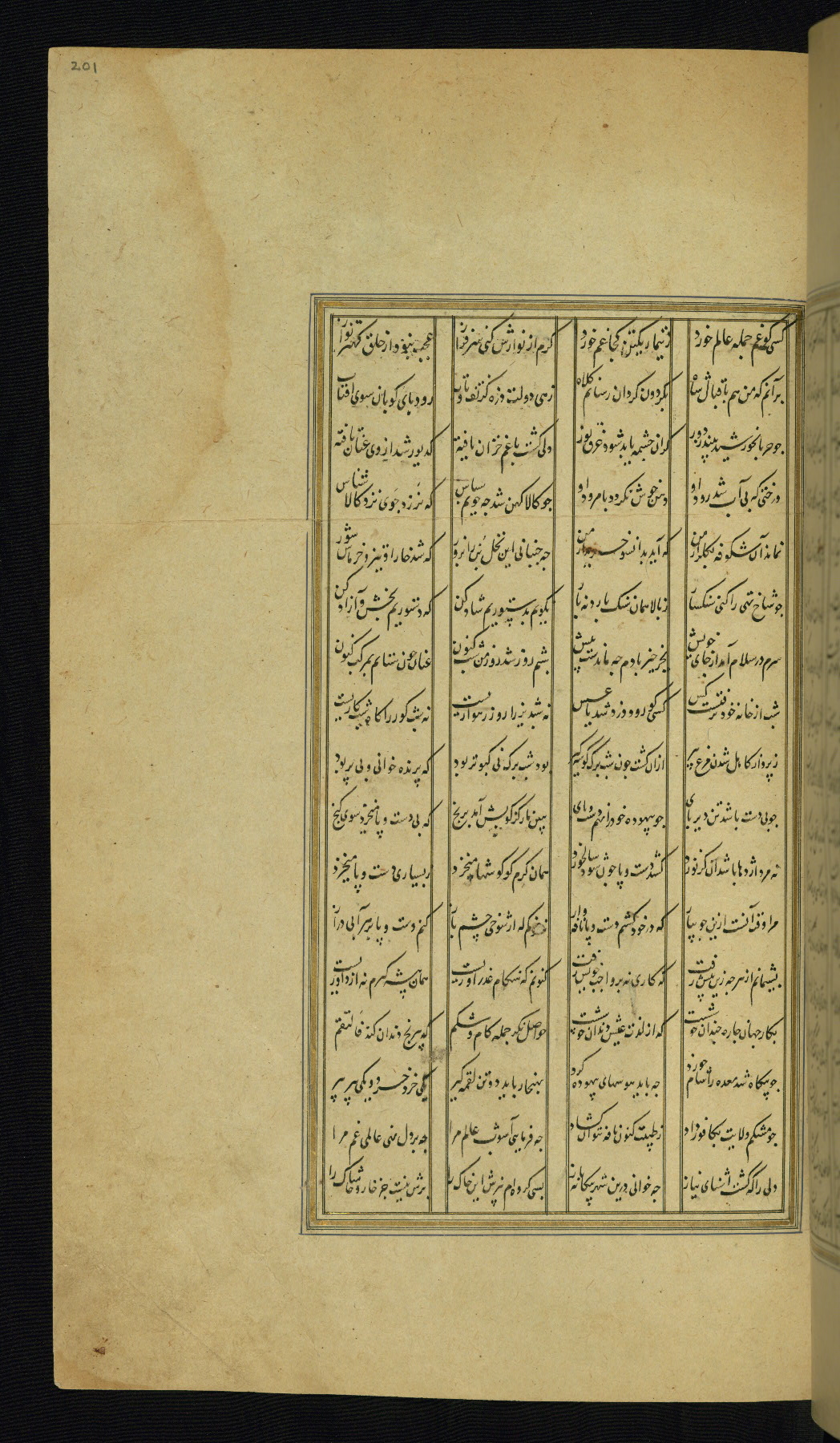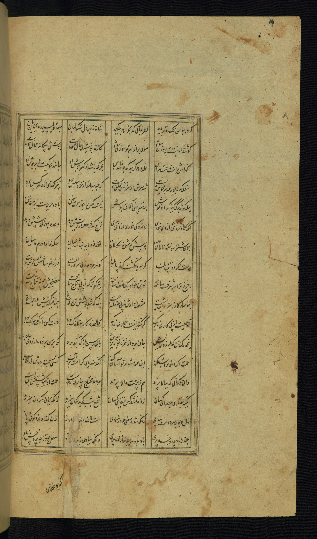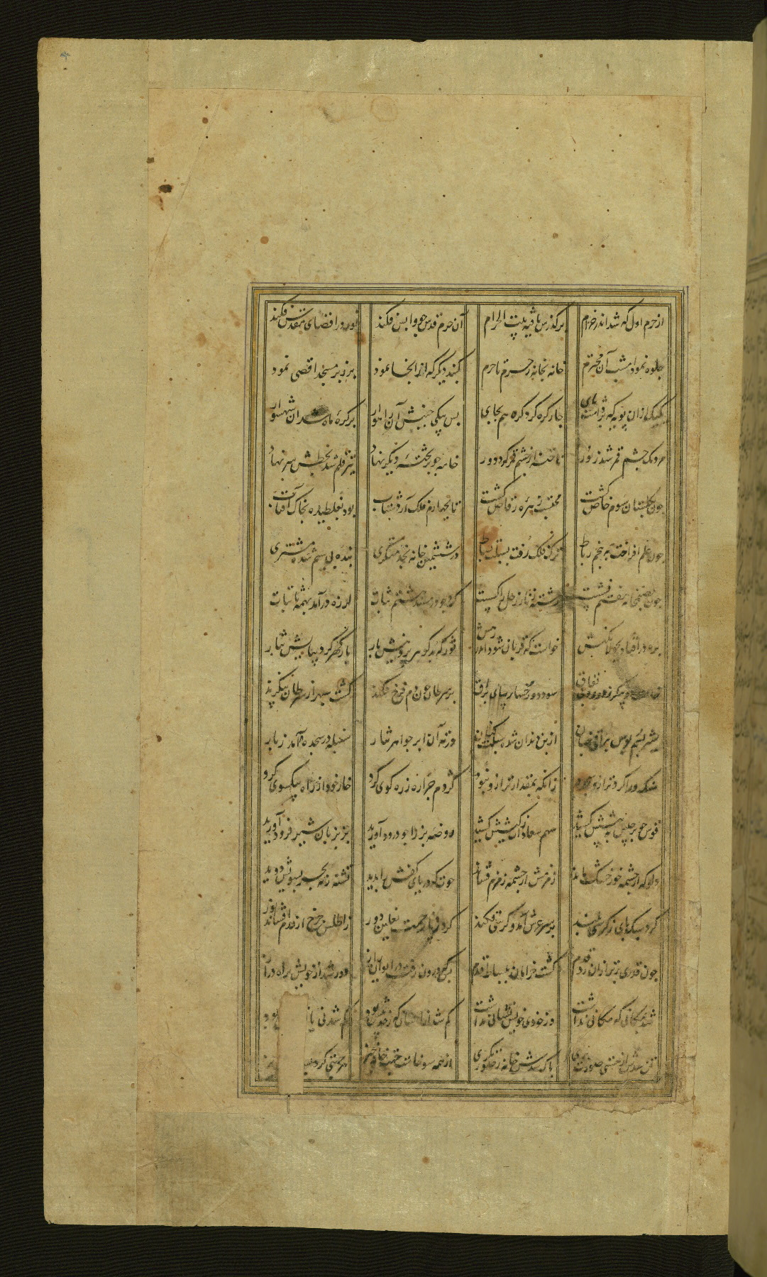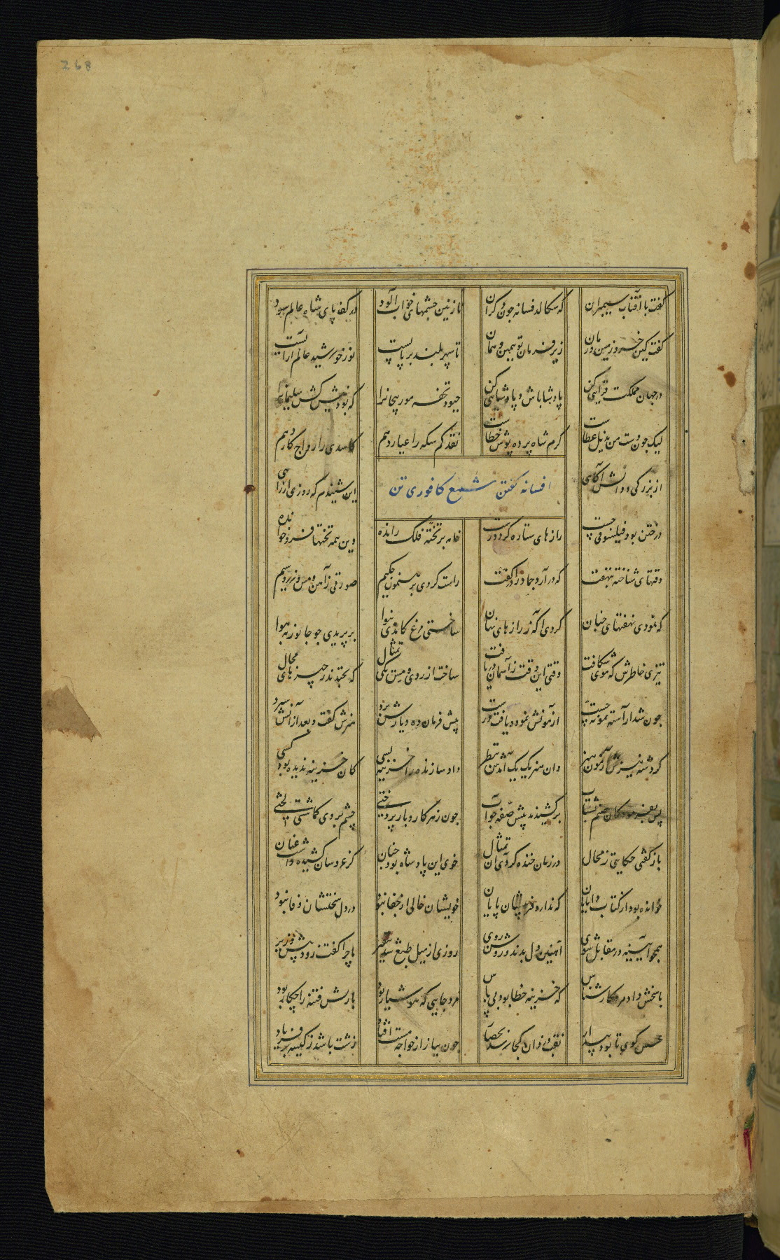 This is an illustrated and illuminated Safavid copy of the Khamsah (quintet) of Amīr Khusraw Dihlavī (d. 725 AH / 1325 CE), written by Pīr Ḥusayn al-Kātib al-Shīrāzī in 935 AH / 1529 CE. The codex opens with a double-page illuminated frontispiece with verses in honor of the poet Mir (Amir) Khusraw (fols. 1b-2a). There are four illuminated incipit pages introducing the individual poems, and thirteen paintings illustrate the text. The lacquer binding, which is not original to the manuscript, has a hunting scene on the upper and lower boards. The lower board is inscribed yā Shāh Najaf (oh, King of Najaf, i.e. ʿAlī) and is dated 1271 AH / 1854 CE.