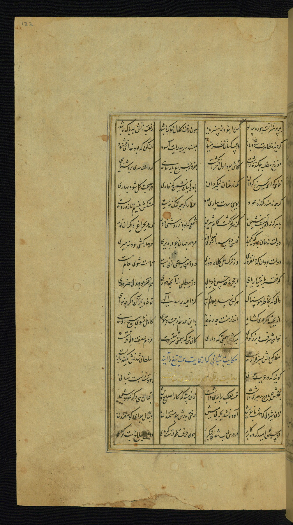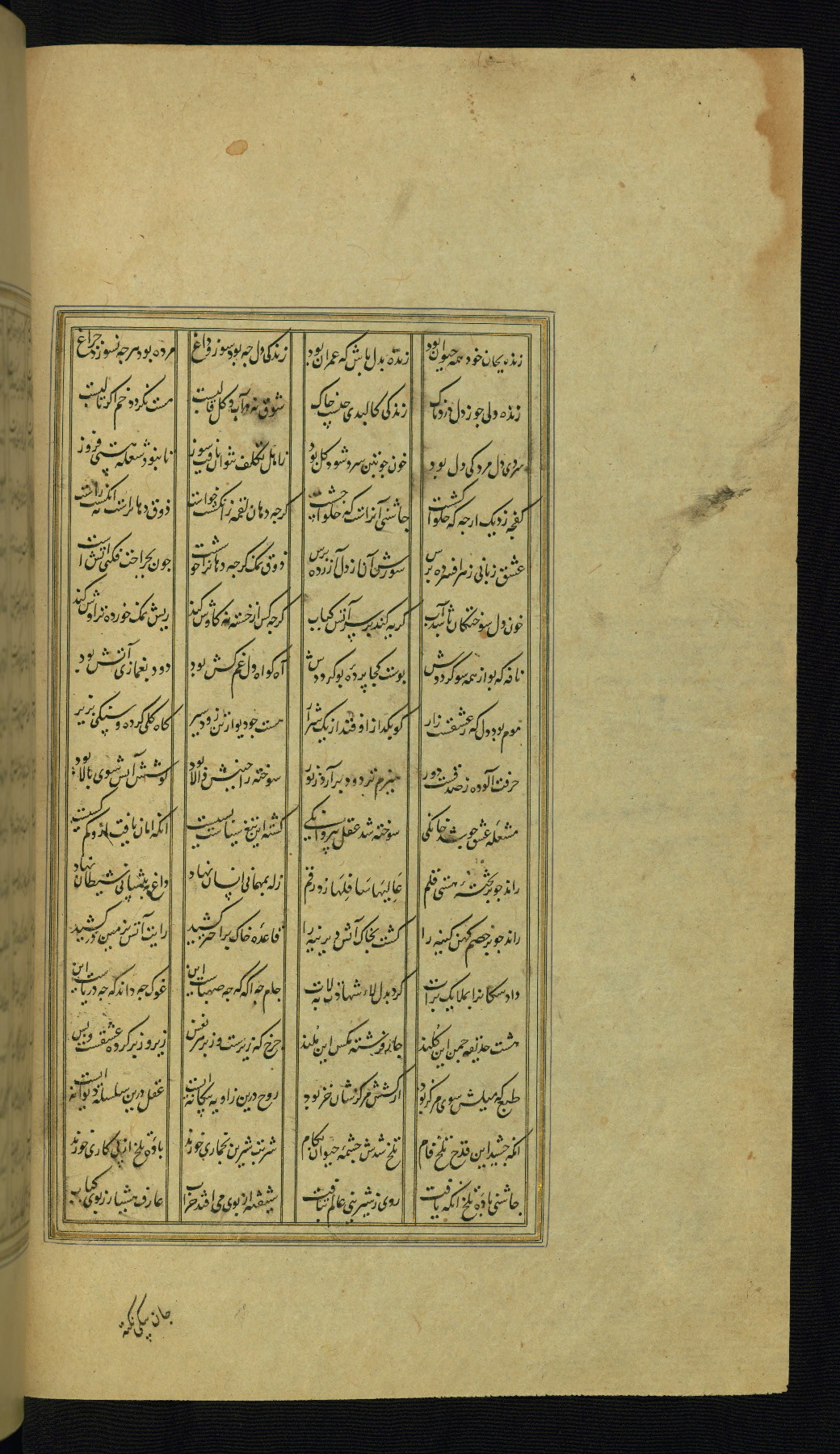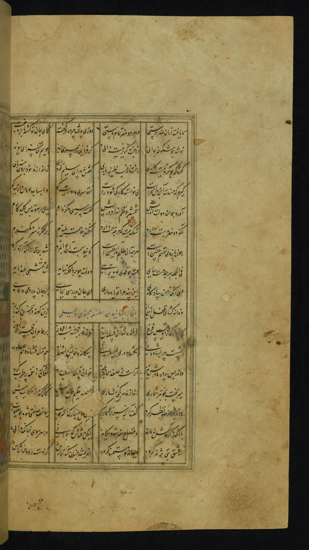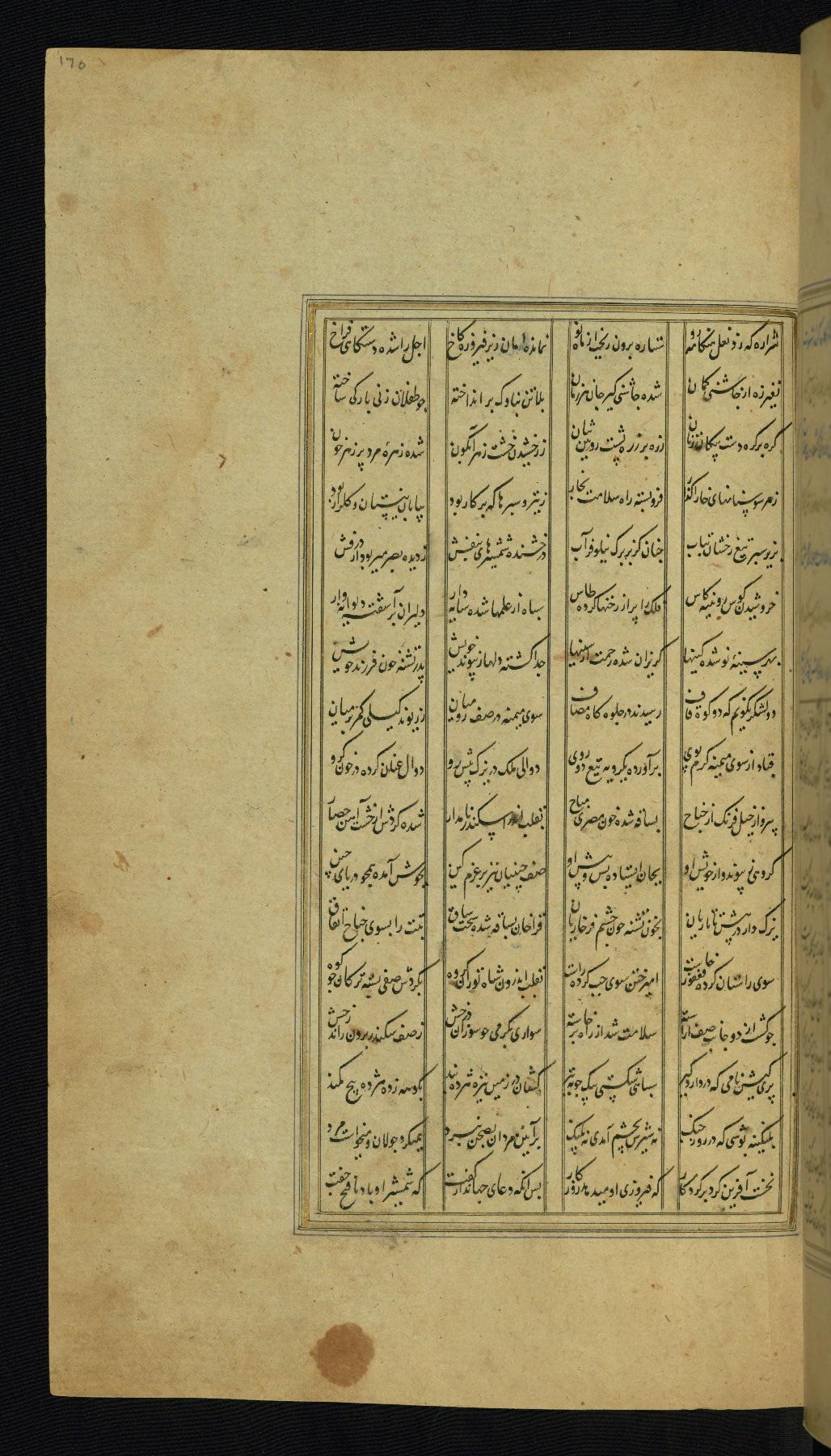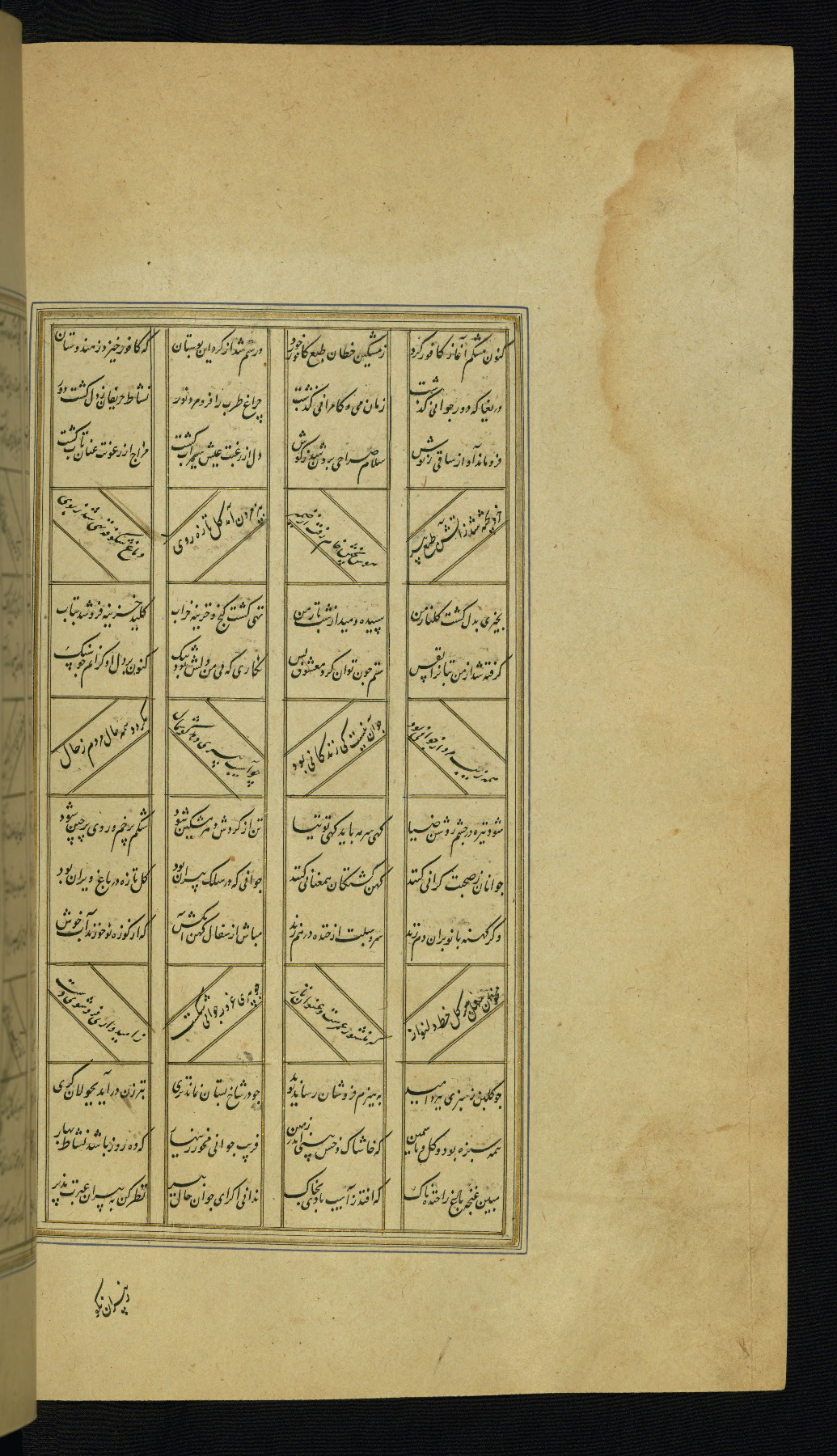 This is an illustrated and illuminated Safavid copy of the Khamsah (quintet) of Amīr Khusraw Dihlavī (d. 725 AH / 1325 CE), written by Pīr Ḥusayn al-Kātib al-Shīrāzī in 935 AH / 1529 CE. The codex opens with a double-page illuminated frontispiece with verses in honor of the poet Mir (Amir) Khusraw (fols. 1b-2a). There are four illuminated incipit pages introducing the individual poems, and thirteen paintings illustrate the text. The lacquer binding, which is not original to the manuscript, has a hunting scene on the upper and lower boards. The lower board is inscribed yā Shāh Najaf (oh, King of Najaf, i.e. ʿAlī) and is dated 1271 AH / 1854 CE.