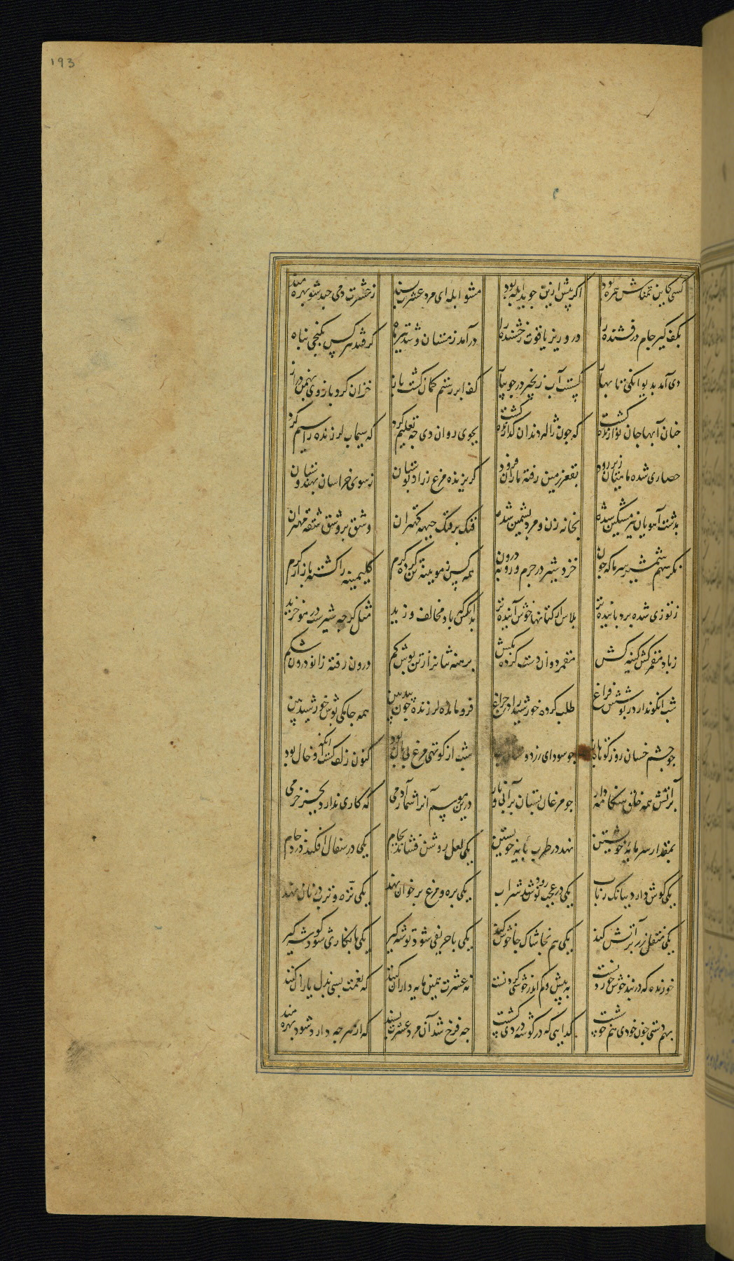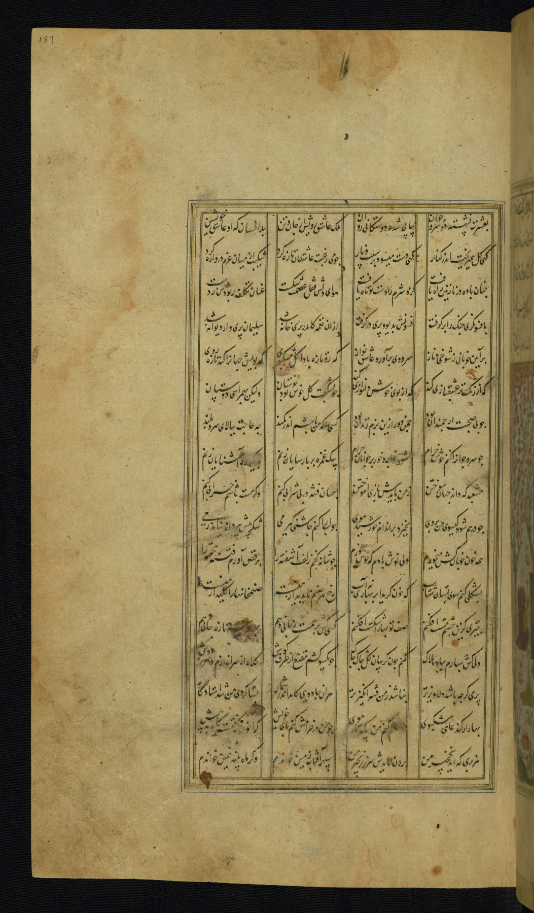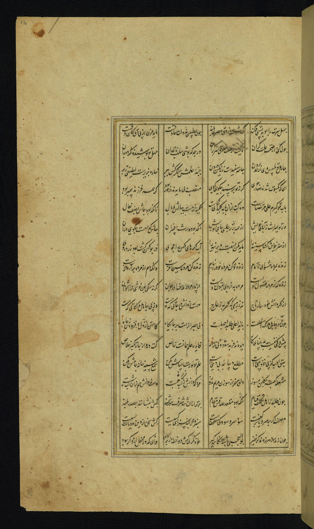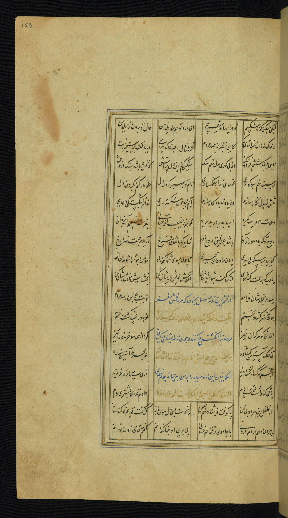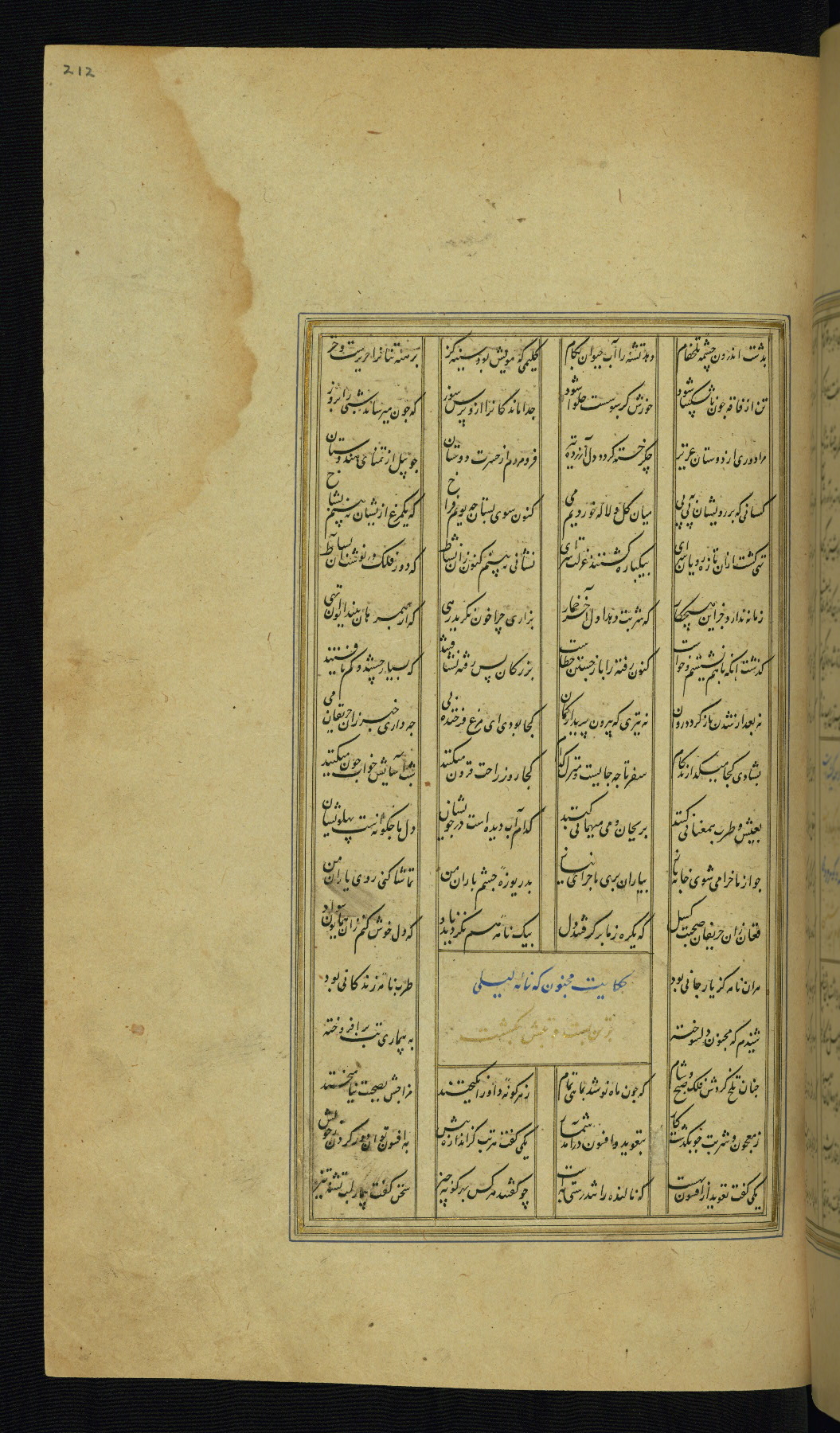 This is an illustrated and illuminated Safavid copy of the Khamsah (quintet) of Amīr Khusraw Dihlavī (d. 725 AH / 1325 CE), written by Pīr Ḥusayn al-Kātib al-Shīrāzī in 935 AH / 1529 CE. The codex opens with a double-page illuminated frontispiece with verses in honor of the poet Mir (Amir) Khusraw (fols. 1b-2a). There are four illuminated incipit pages introducing the individual poems, and thirteen paintings illustrate the text. The lacquer binding, which is not original to the manuscript, has a hunting scene on the upper and lower boards. The lower board is inscribed yā Shāh Najaf (oh, King of Najaf, i.e. ʿAlī) and is dated 1271 AH / 1854 CE.