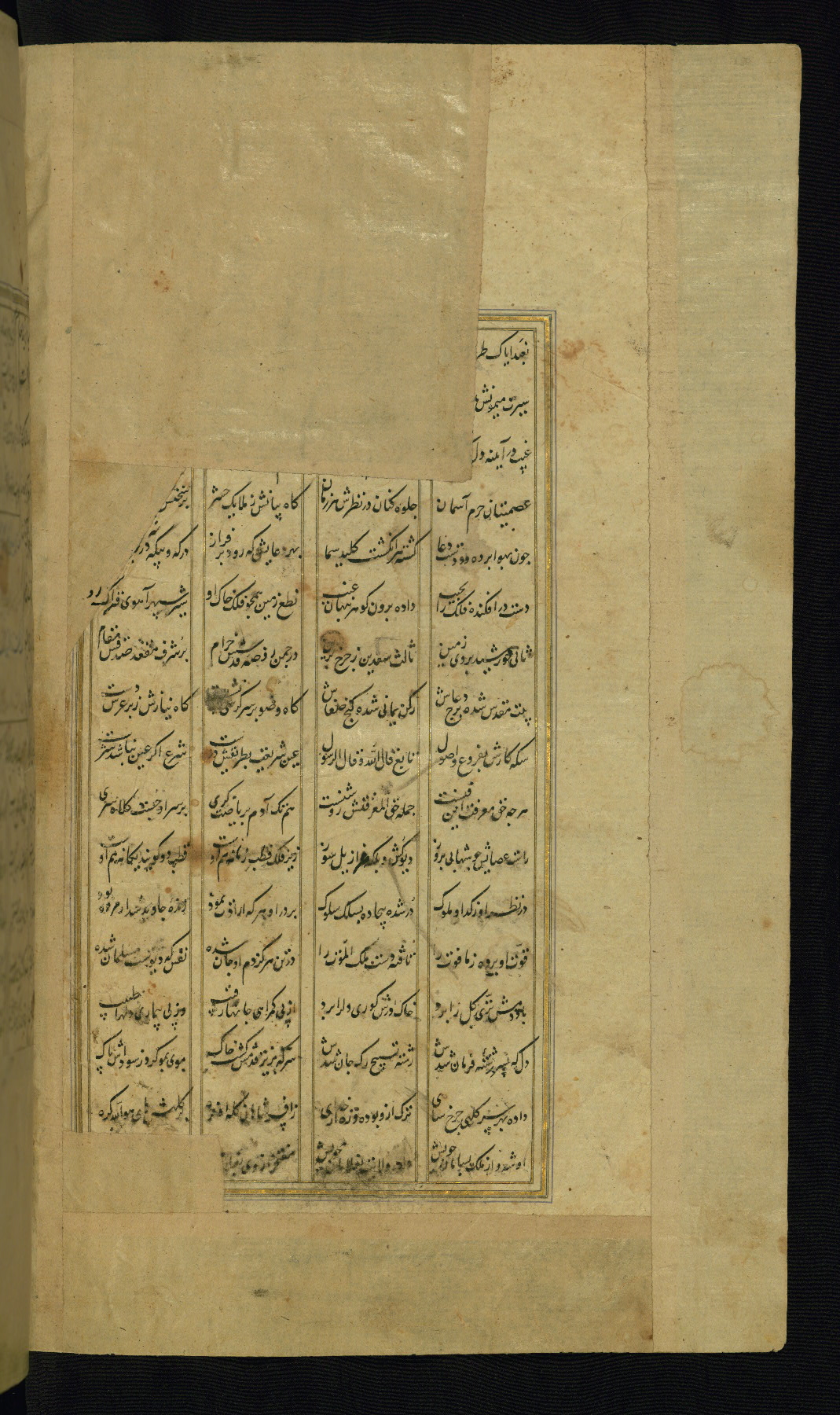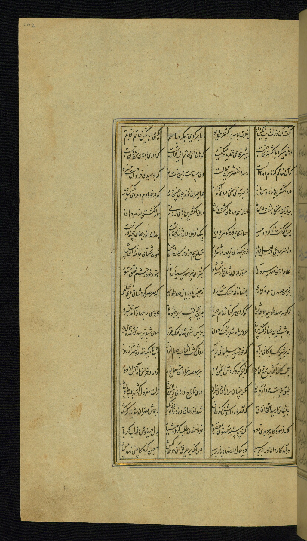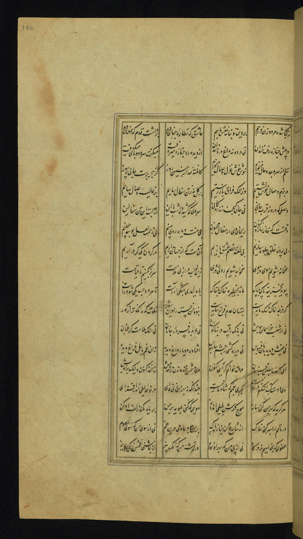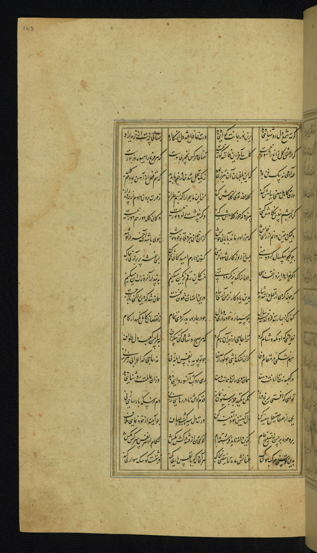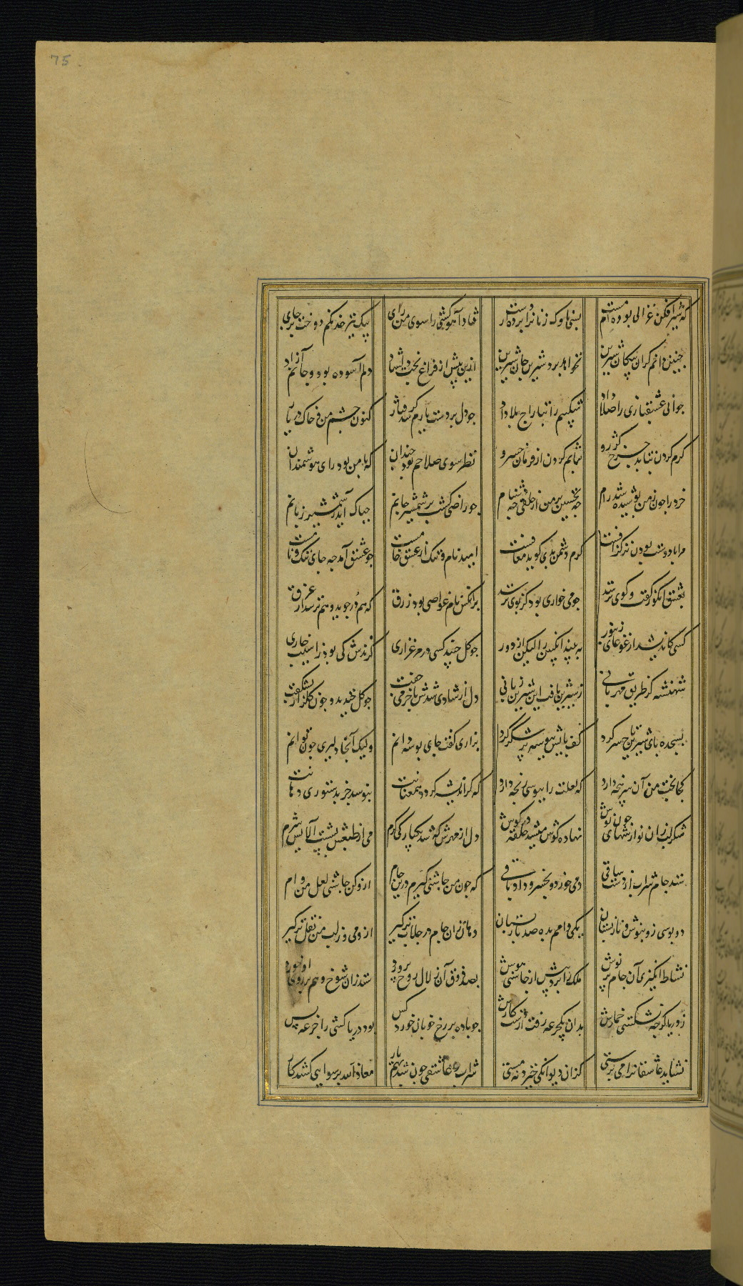 This is an illustrated and illuminated Safavid copy of the Khamsah (quintet) of Amīr Khusraw Dihlavī (d. 725 AH / 1325 CE), written by Pīr Ḥusayn al-Kātib al-Shīrāzī in 935 AH / 1529 CE. The codex opens with a double-page illuminated frontispiece with verses in honor of the poet Mir (Amir) Khusraw (fols. 1b-2a). There are four illuminated incipit pages introducing the individual poems, and thirteen paintings illustrate the text. The lacquer binding, which is not original to the manuscript, has a hunting scene on the upper and lower boards. The lower board is inscribed yā Shāh Najaf (oh, King of Najaf, i.e. ʿAlī) and is dated 1271 AH / 1854 CE.