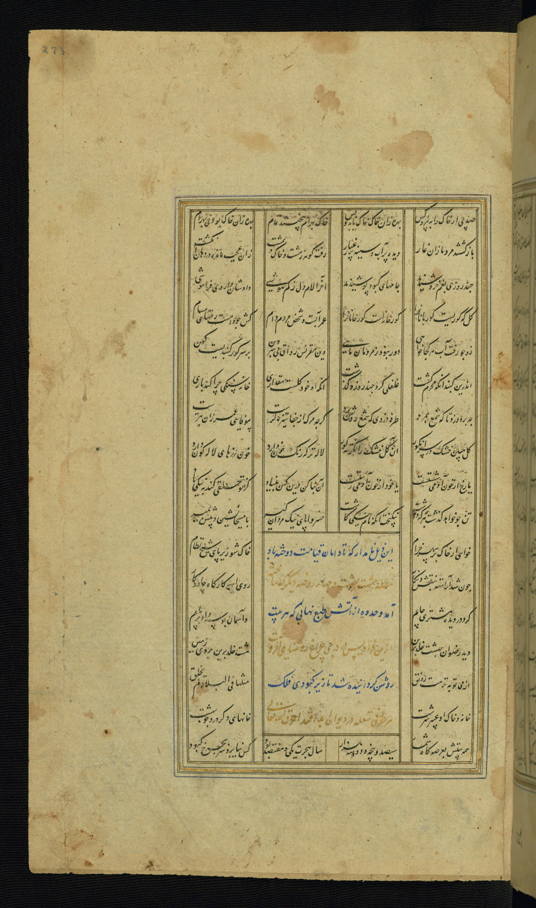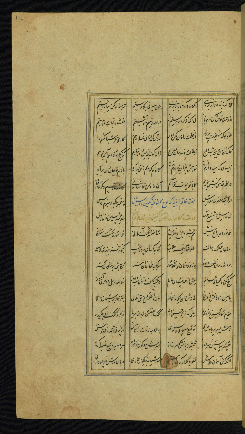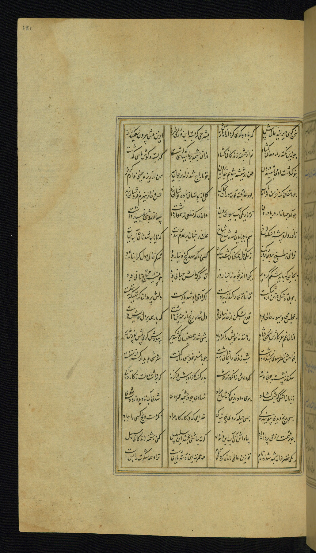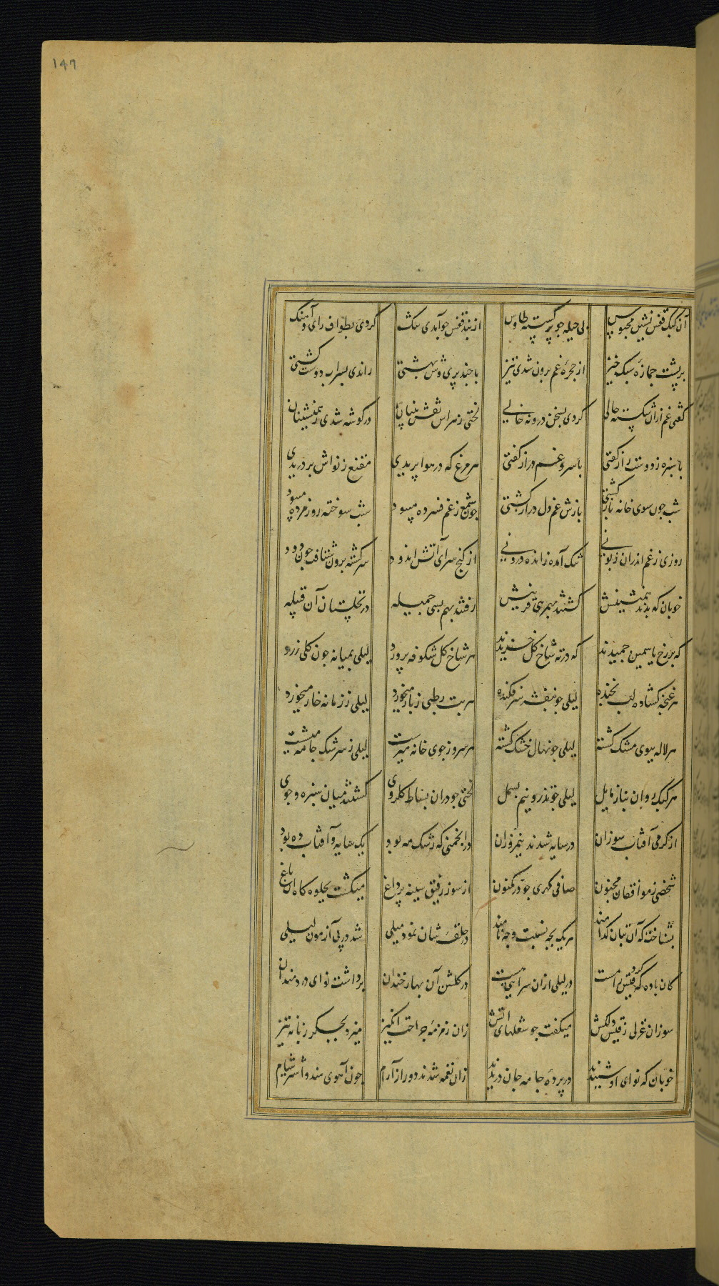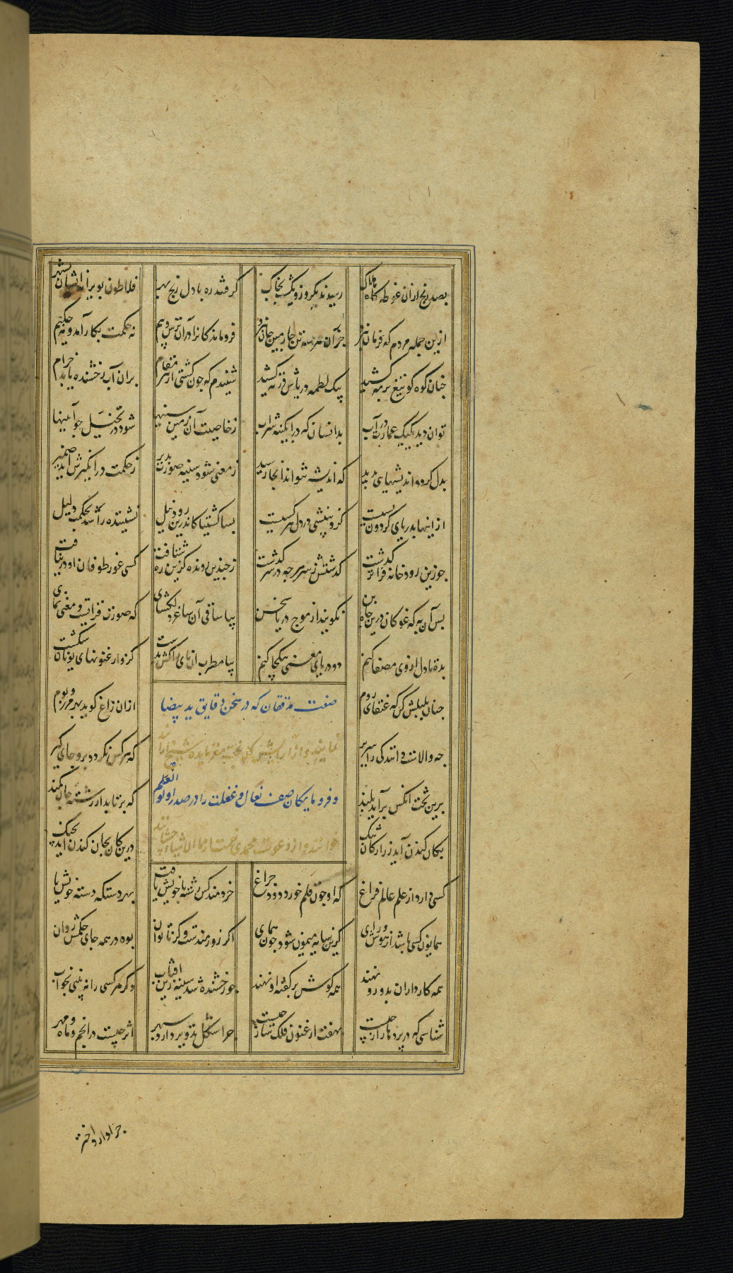 This is an illustrated and illuminated Safavid copy of the Khamsah (quintet) of Amīr Khusraw Dihlavī (d. 725 AH / 1325 CE), written by Pīr Ḥusayn al-Kātib al-Shīrāzī in 935 AH / 1529 CE. The codex opens with a double-page illuminated frontispiece with verses in honor of the poet Mir (Amir) Khusraw (fols. 1b-2a). There are four illuminated incipit pages introducing the individual poems, and thirteen paintings illustrate the text. The lacquer binding, which is not original to the manuscript, has a hunting scene on the upper and lower boards. The lower board is inscribed yā Shāh Najaf (oh, King of Najaf, i.e. ʿAlī) and is dated 1271 AH / 1854 CE.