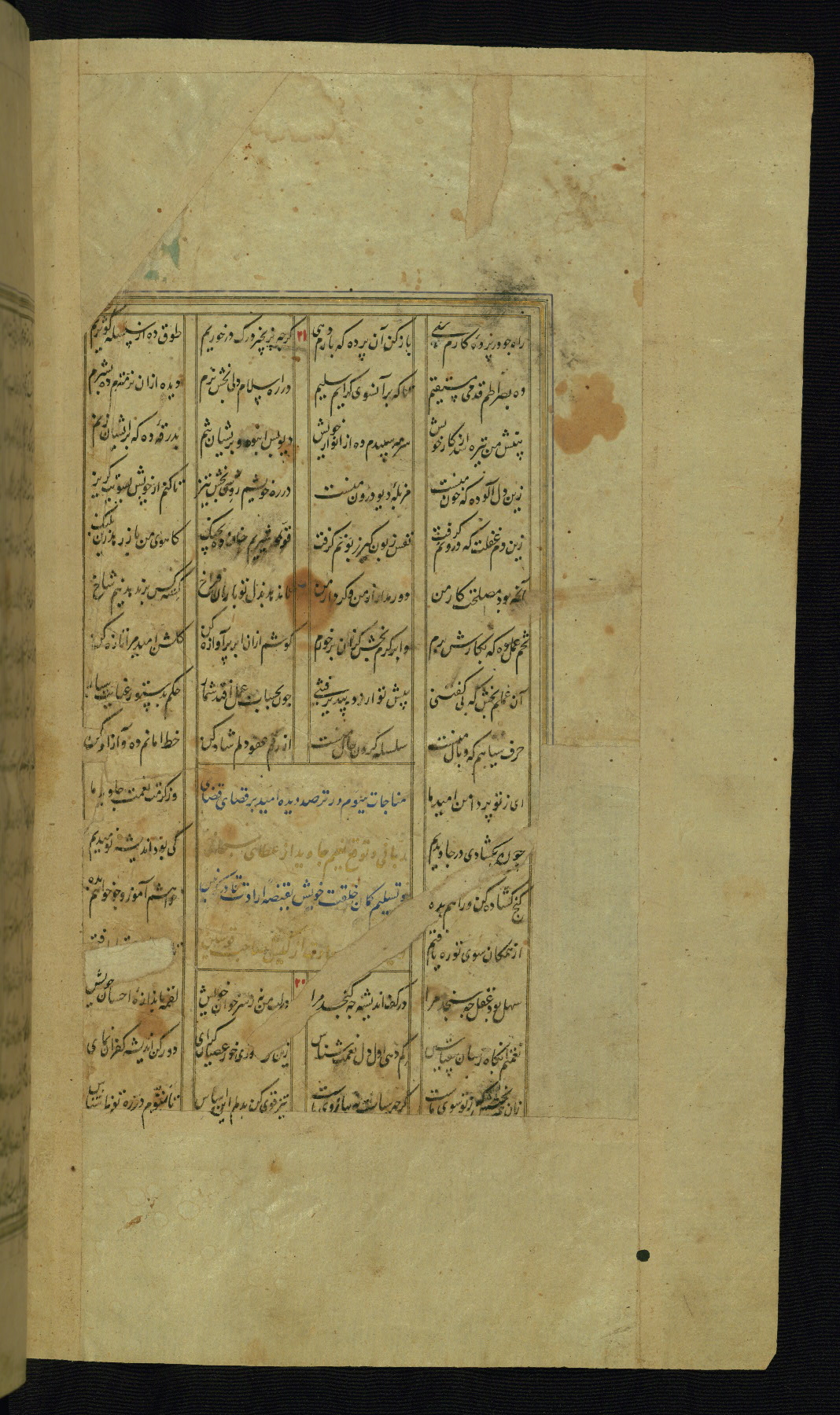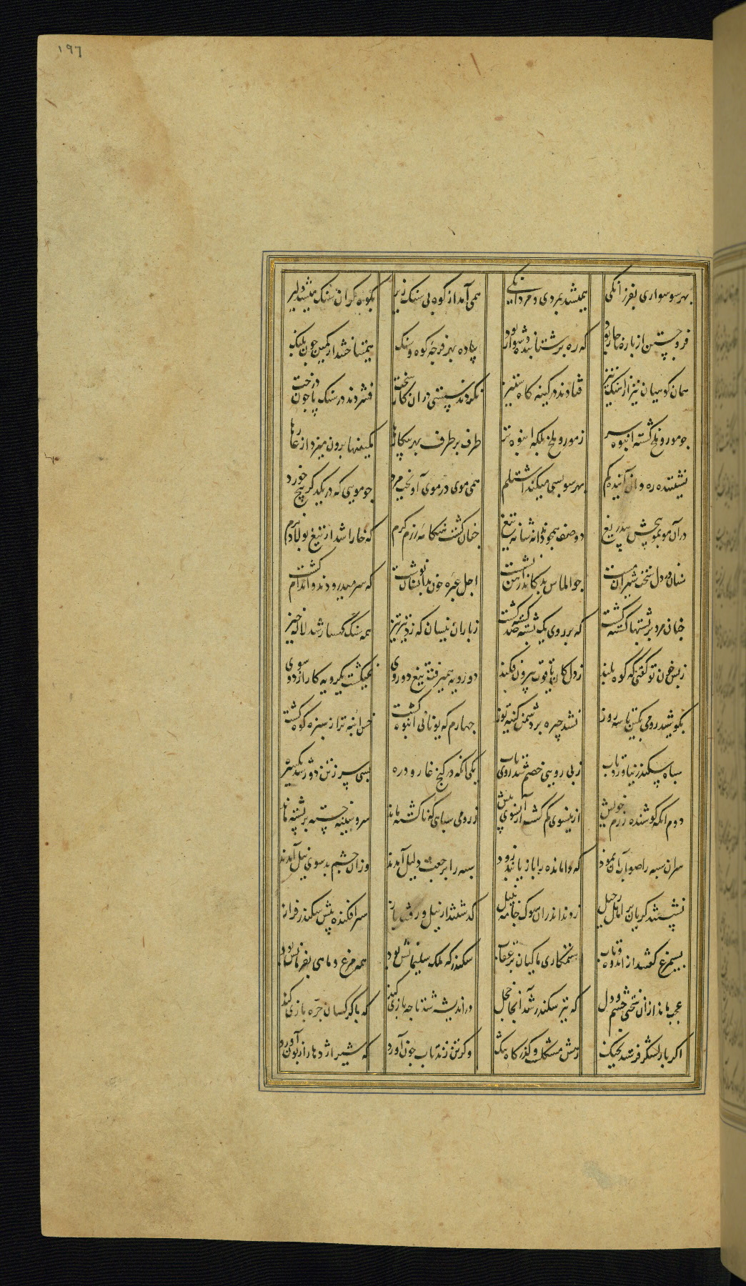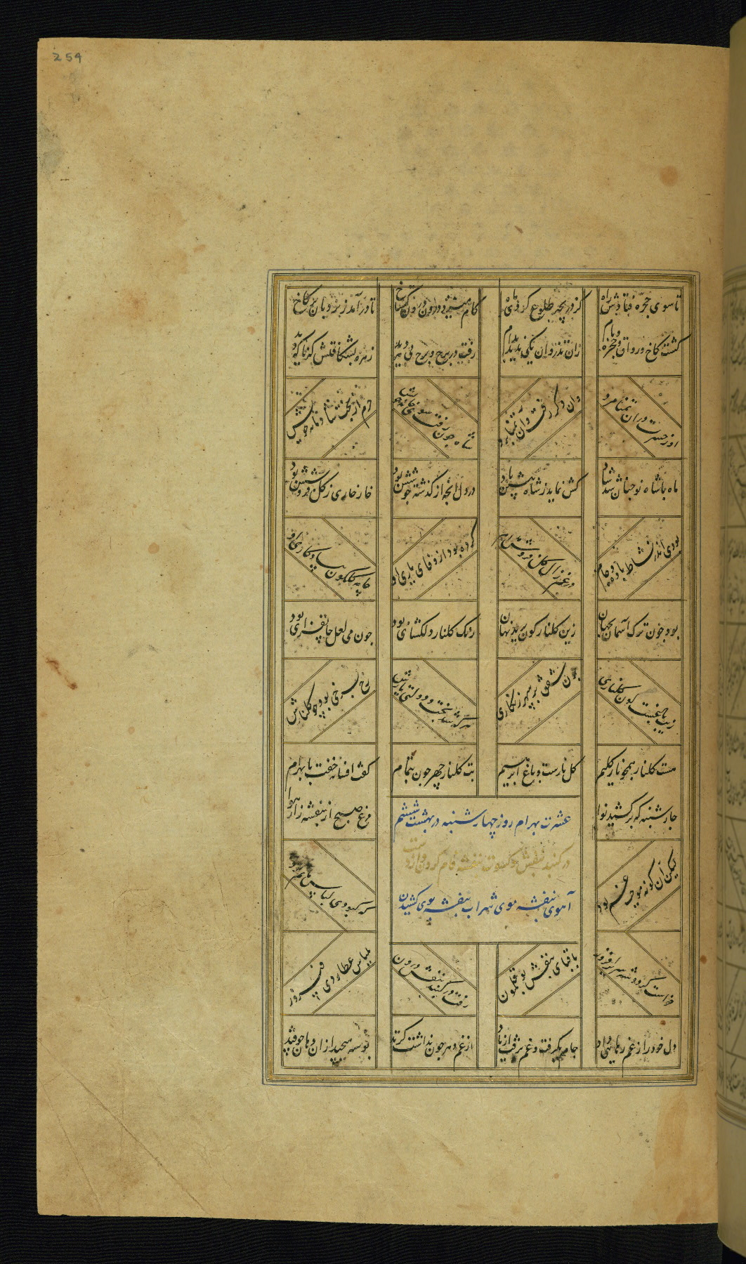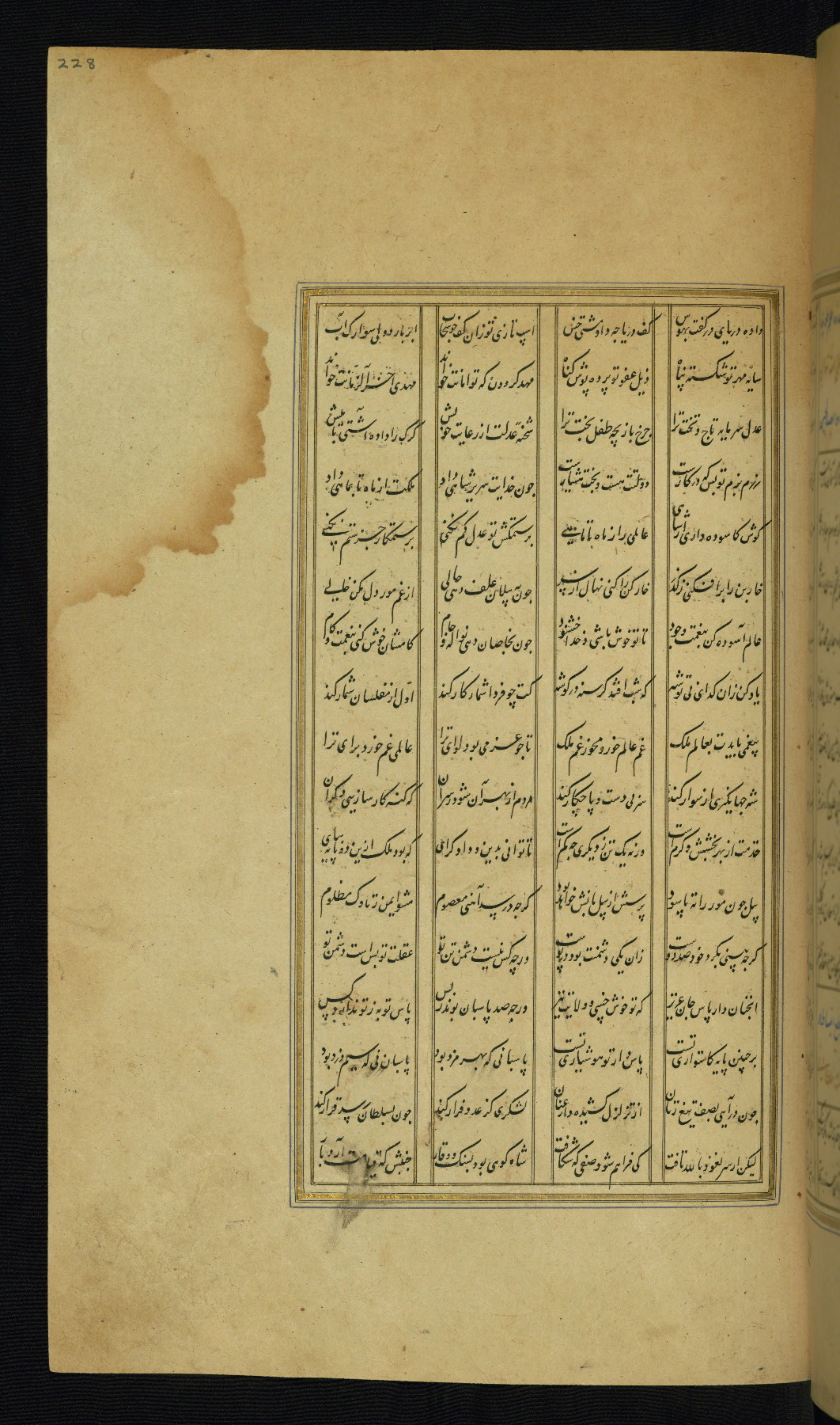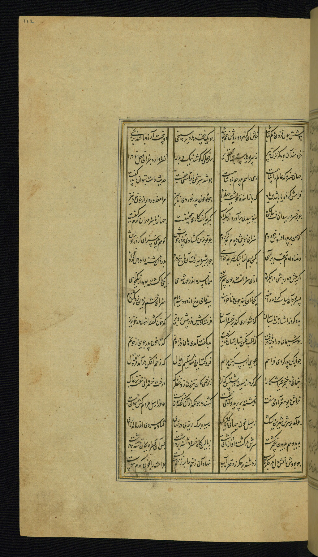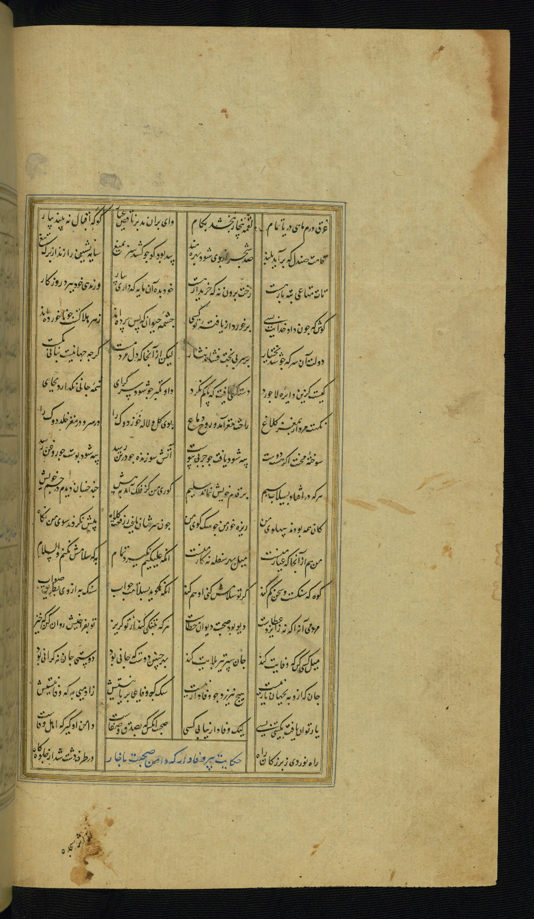 This is an illustrated and illuminated Safavid copy of the Khamsah (quintet) of Amīr Khusraw Dihlavī (d. 725 AH / 1325 CE), written by Pīr Ḥusayn al-Kātib al-Shīrāzī in 935 AH / 1529 CE. The codex opens with a double-page illuminated frontispiece with verses in honor of the poet Mir (Amir) Khusraw (fols. 1b-2a). There are four illuminated incipit pages introducing the individual poems, and thirteen paintings illustrate the text. The lacquer binding, which is not original to the manuscript, has a hunting scene on the upper and lower boards. The lower board is inscribed yā Shāh Najaf (oh, King of Najaf, i.e. ʿAlī) and is dated 1271 AH / 1854 CE.