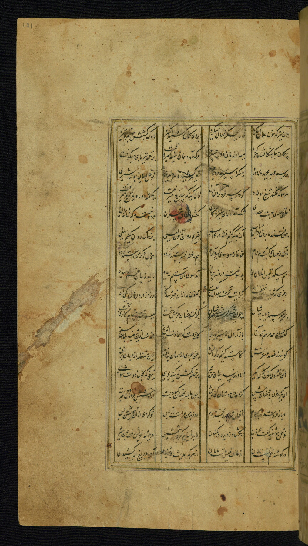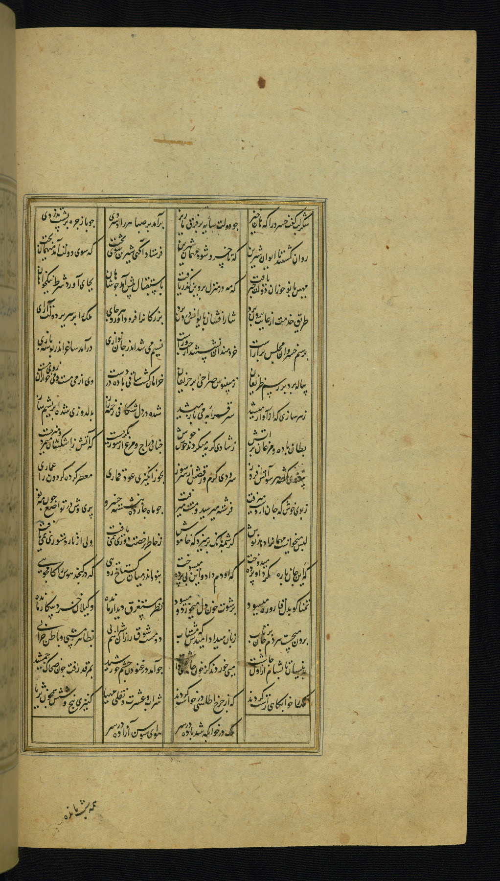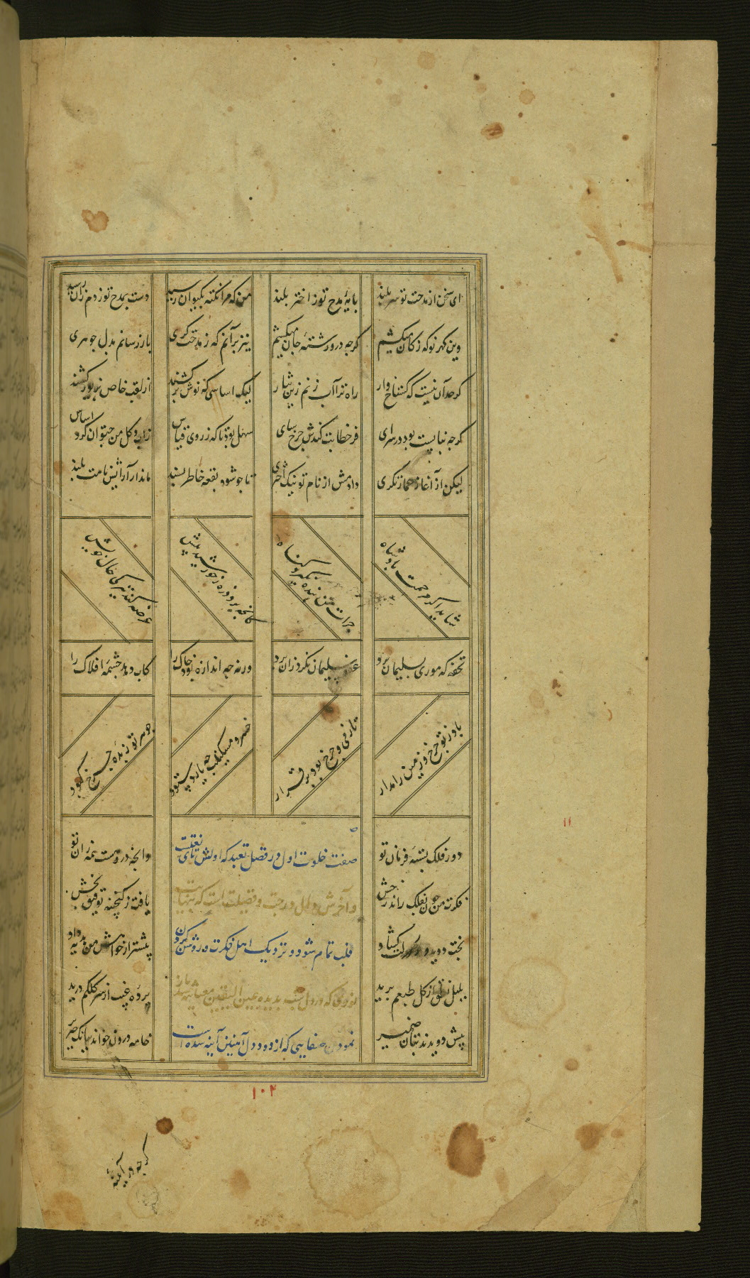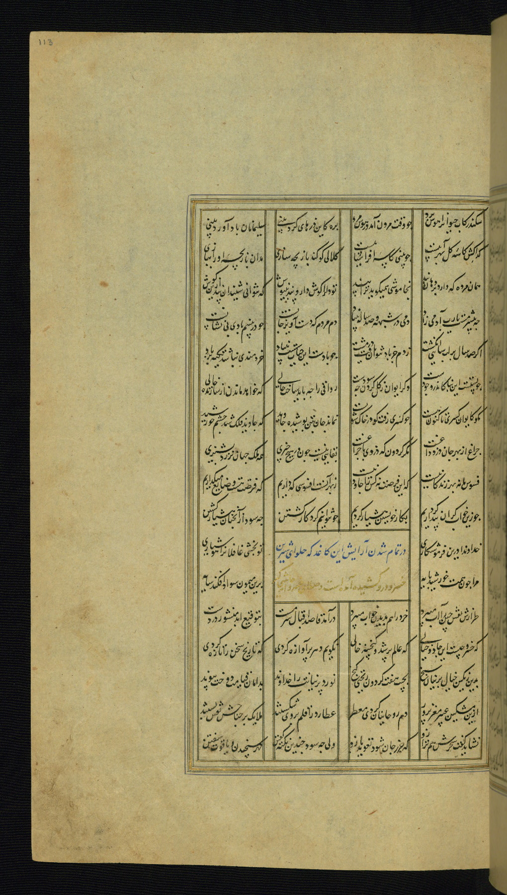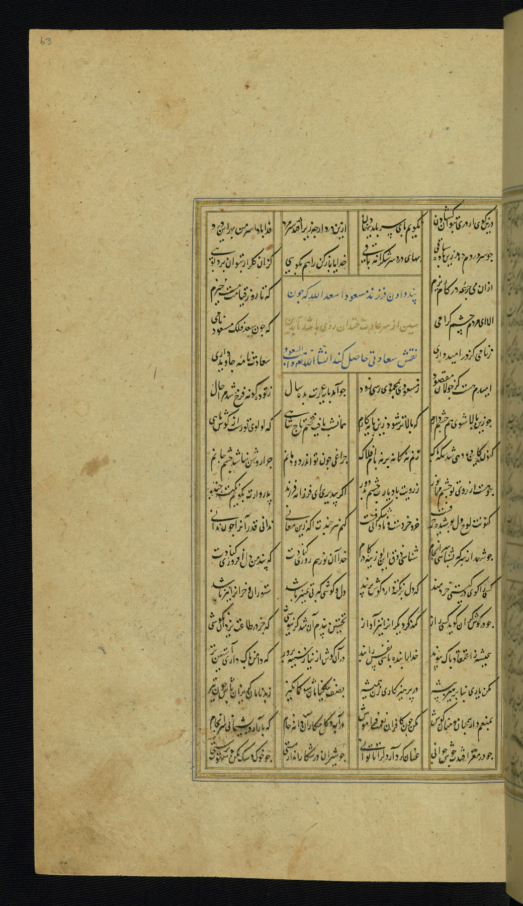 This is an illustrated and illuminated Safavid copy of the Khamsah (quintet) of Amīr Khusraw Dihlavī (d. 725 AH / 1325 CE), written by Pīr Ḥusayn al-Kātib al-Shīrāzī in 935 AH / 1529 CE. The codex opens with a double-page illuminated frontispiece with verses in honor of the poet Mir (Amir) Khusraw (fols. 1b-2a). There are four illuminated incipit pages introducing the individual poems, and thirteen paintings illustrate the text. The lacquer binding, which is not original to the manuscript, has a hunting scene on the upper and lower boards. The lower board is inscribed yā Shāh Najaf (oh, King of Najaf, i.e. ʿAlī) and is dated 1271 AH / 1854 CE.