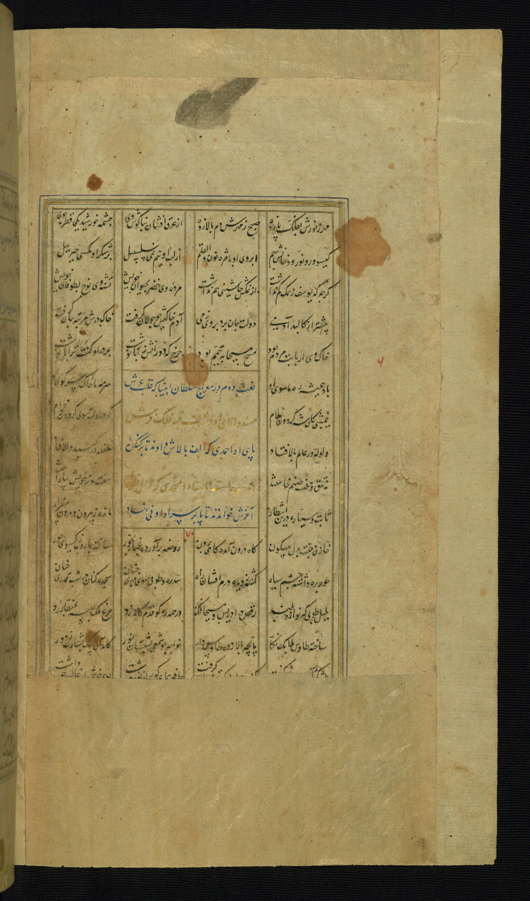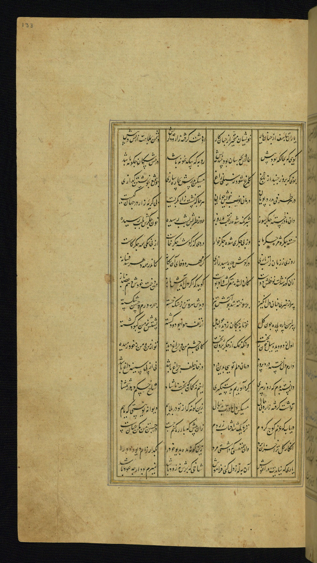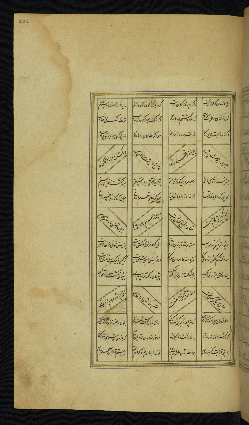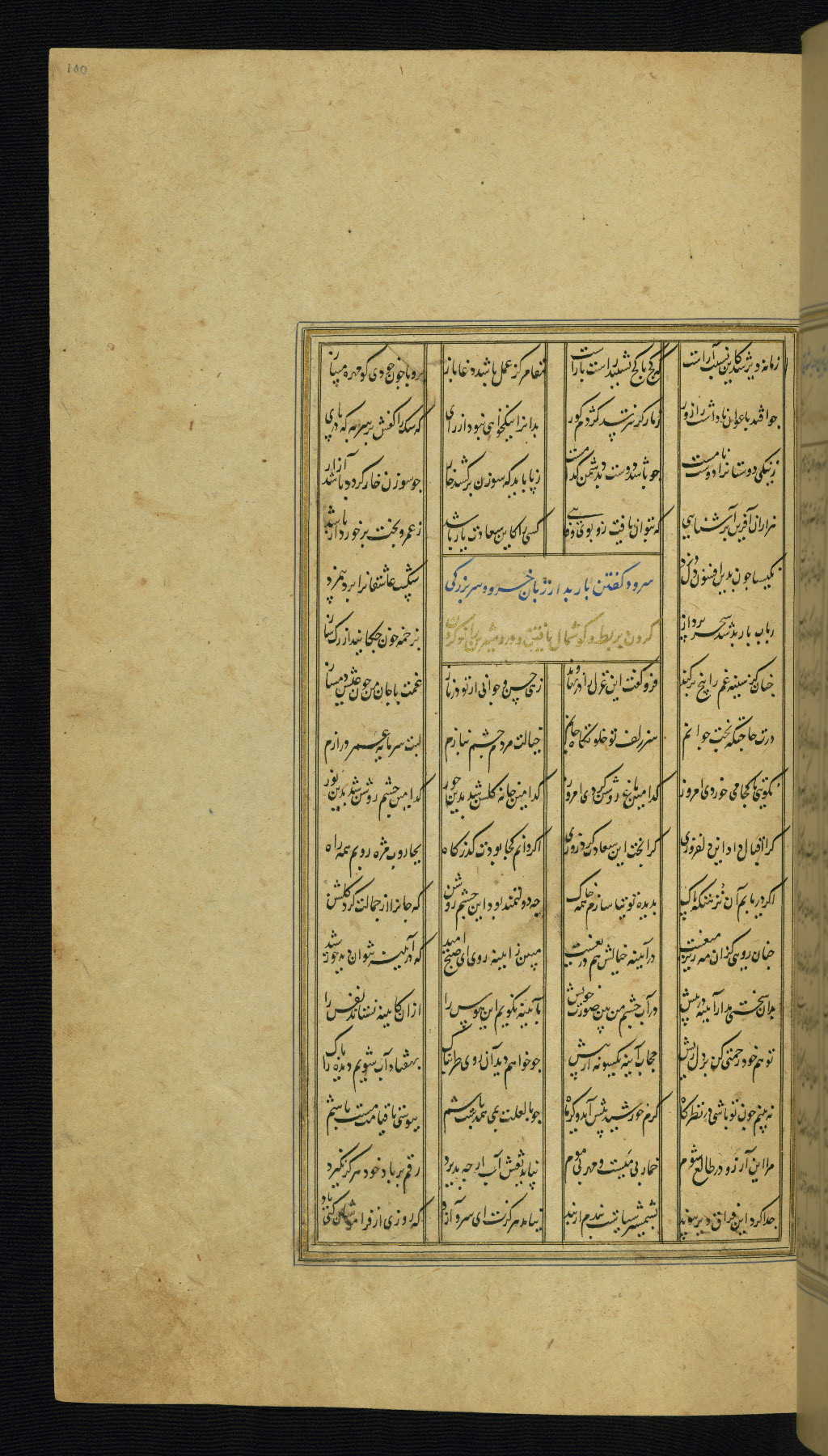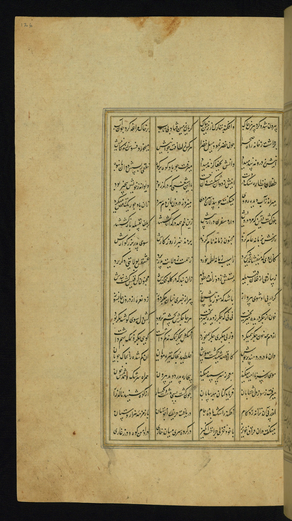 This is an illustrated and illuminated Safavid copy of the Khamsah (quintet) of Amīr Khusraw Dihlavī (d. 725 AH / 1325 CE), written by Pīr Ḥusayn al-Kātib al-Shīrāzī in 935 AH / 1529 CE. The codex opens with a double-page illuminated frontispiece with verses in honor of the poet Mir (Amir) Khusraw (fols. 1b-2a). There are four illuminated incipit pages introducing the individual poems, and thirteen paintings illustrate the text. The lacquer binding, which is not original to the manuscript, has a hunting scene on the upper and lower boards. The lower board is inscribed yā Shāh Najaf (oh, King of Najaf, i.e. ʿAlī) and is dated 1271 AH / 1854 CE.