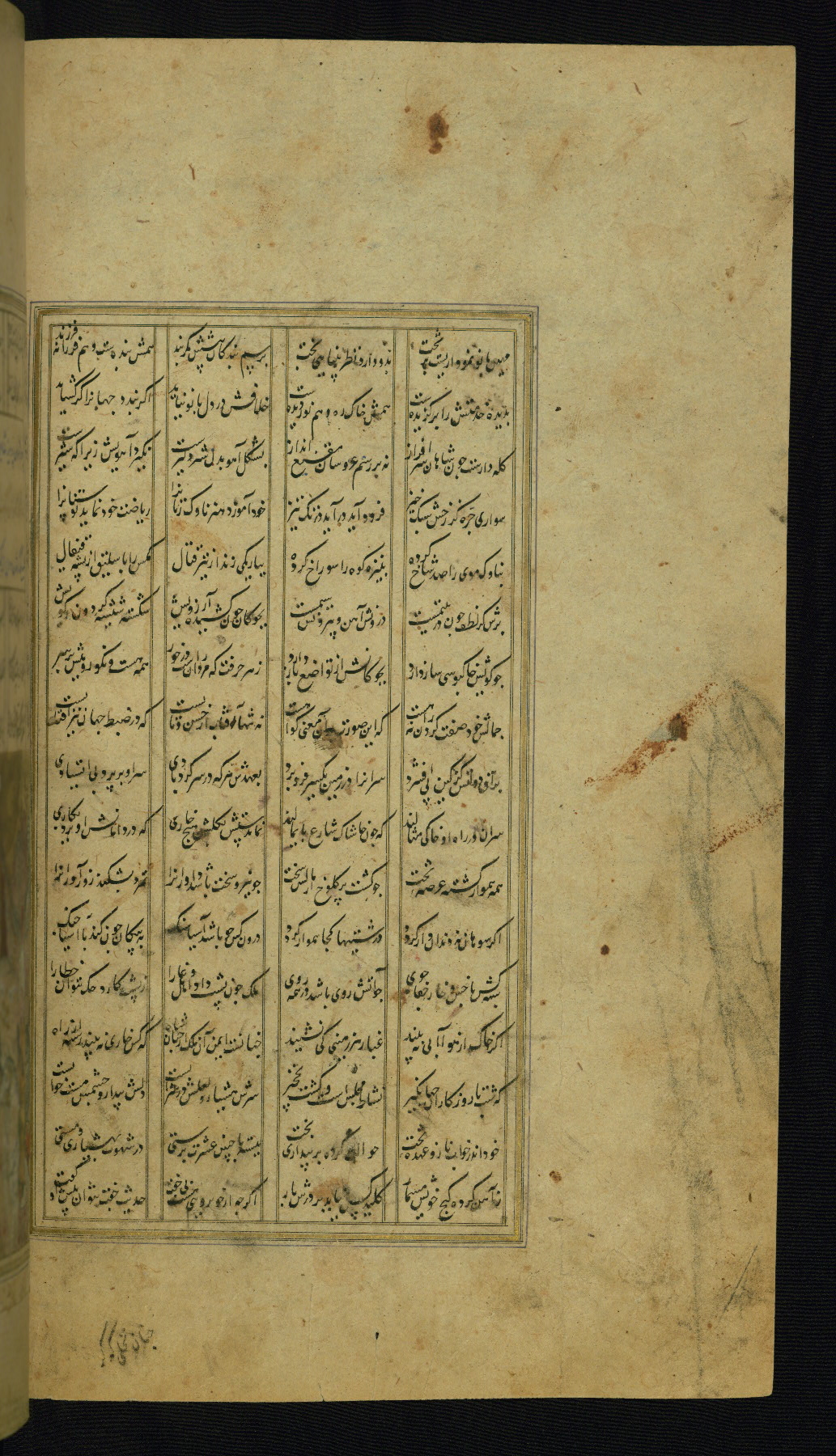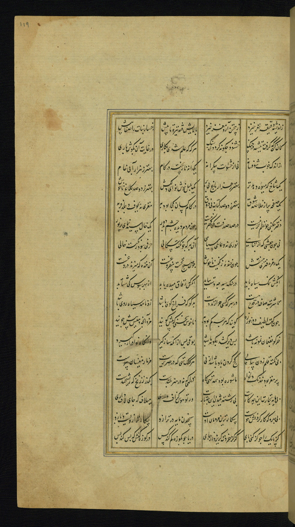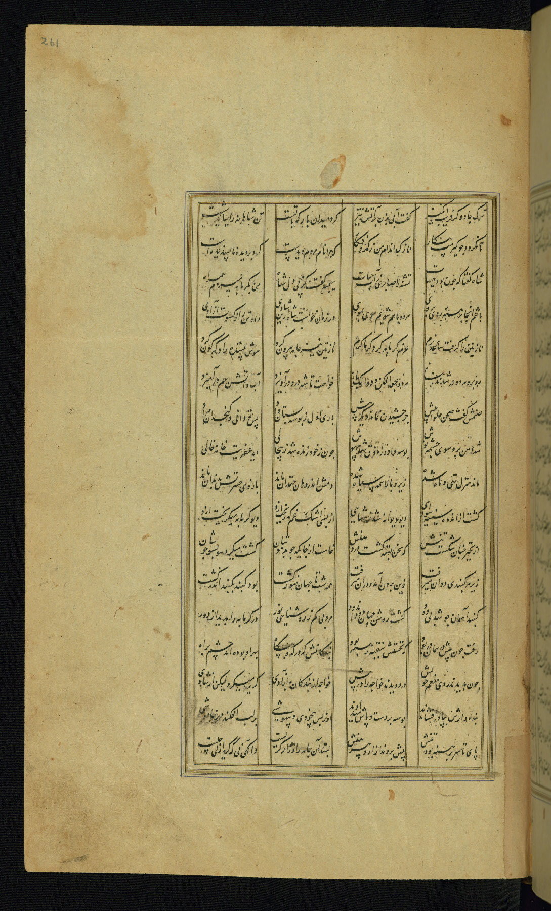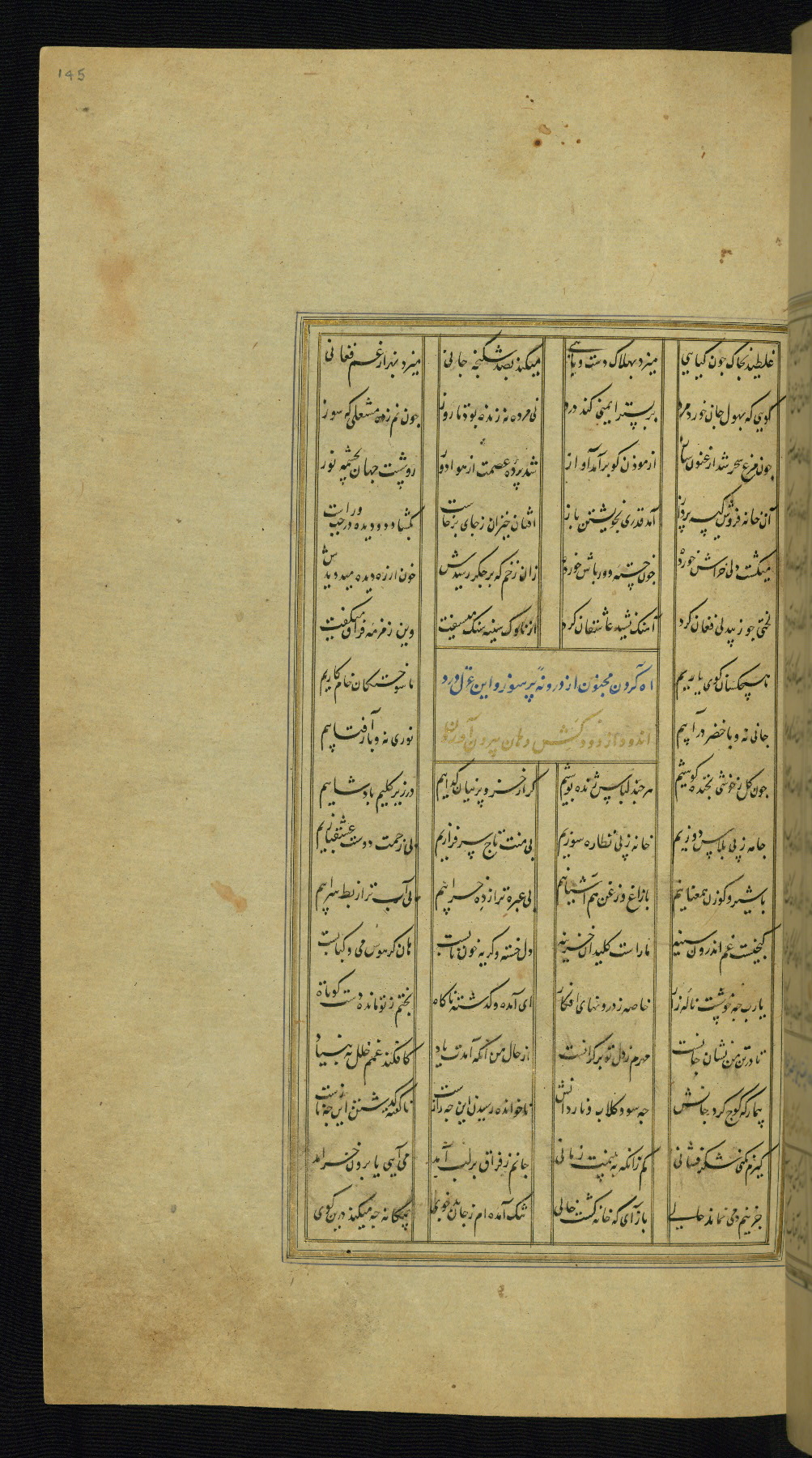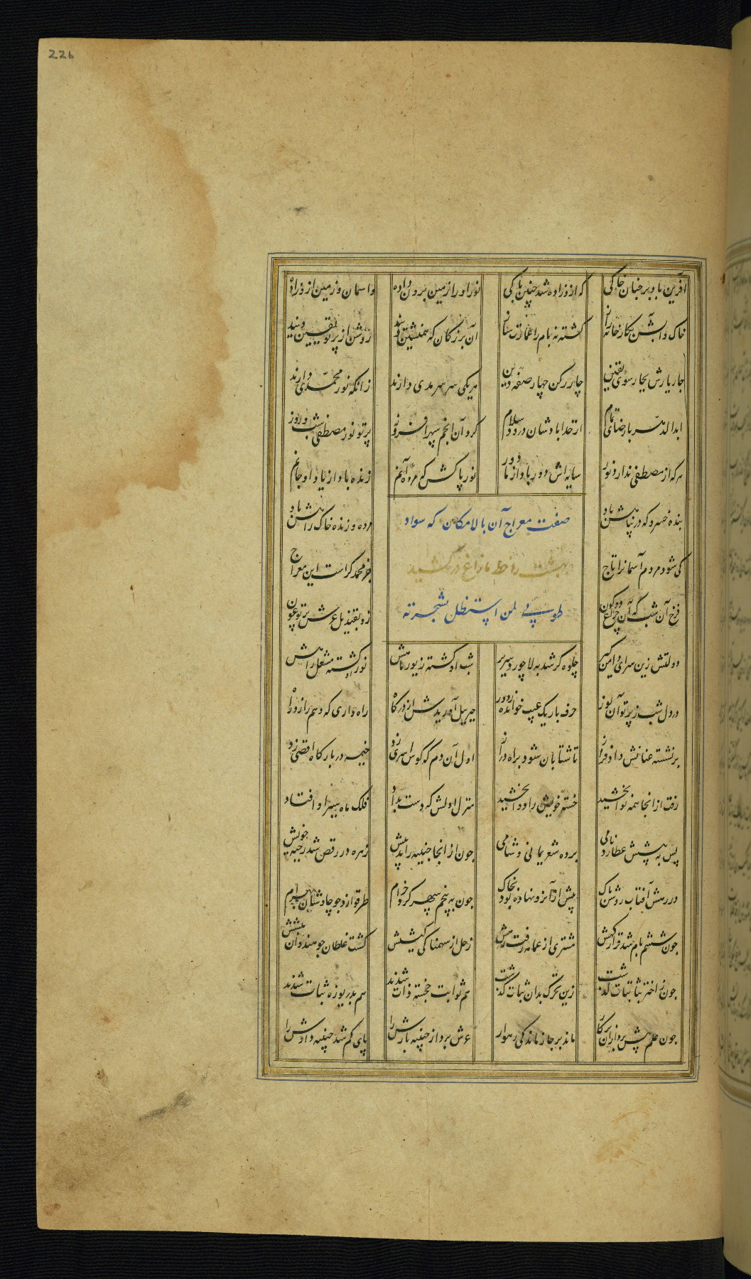 This is an illustrated and illuminated Safavid copy of the Khamsah (quintet) of Amīr Khusraw Dihlavī (d. 725 AH / 1325 CE), written by Pīr Ḥusayn al-Kātib al-Shīrāzī in 935 AH / 1529 CE. The codex opens with a double-page illuminated frontispiece with verses in honor of the poet Mir (Amir) Khusraw (fols. 1b-2a). There are four illuminated incipit pages introducing the individual poems, and thirteen paintings illustrate the text. The lacquer binding, which is not original to the manuscript, has a hunting scene on the upper and lower boards. The lower board is inscribed yā Shāh Najaf (oh, King of Najaf, i.e. ʿAlī) and is dated 1271 AH / 1854 CE.