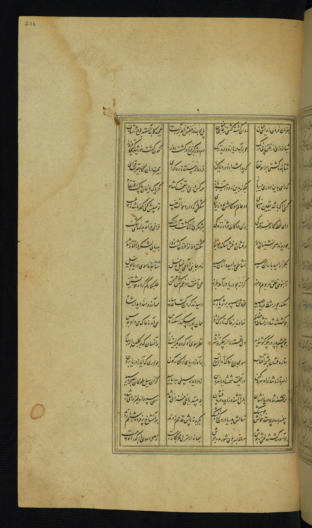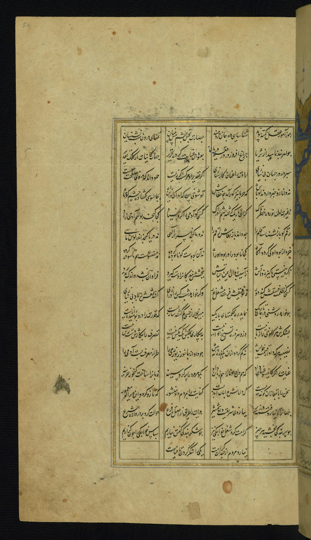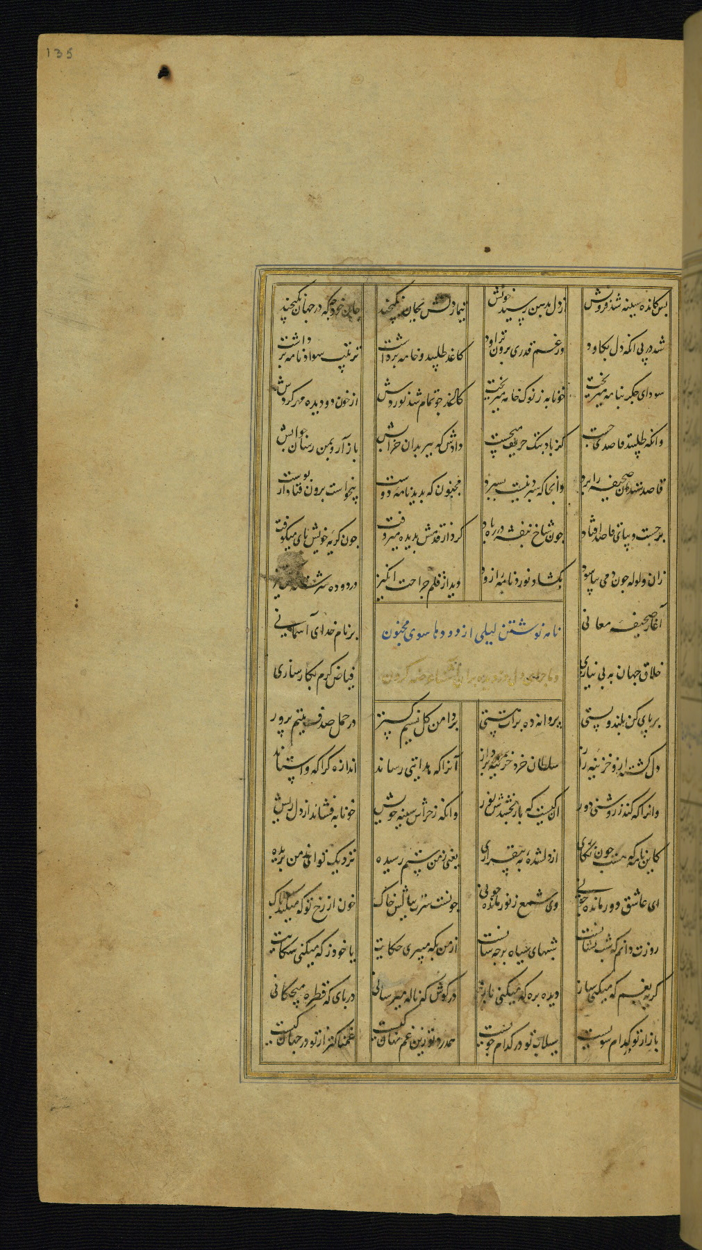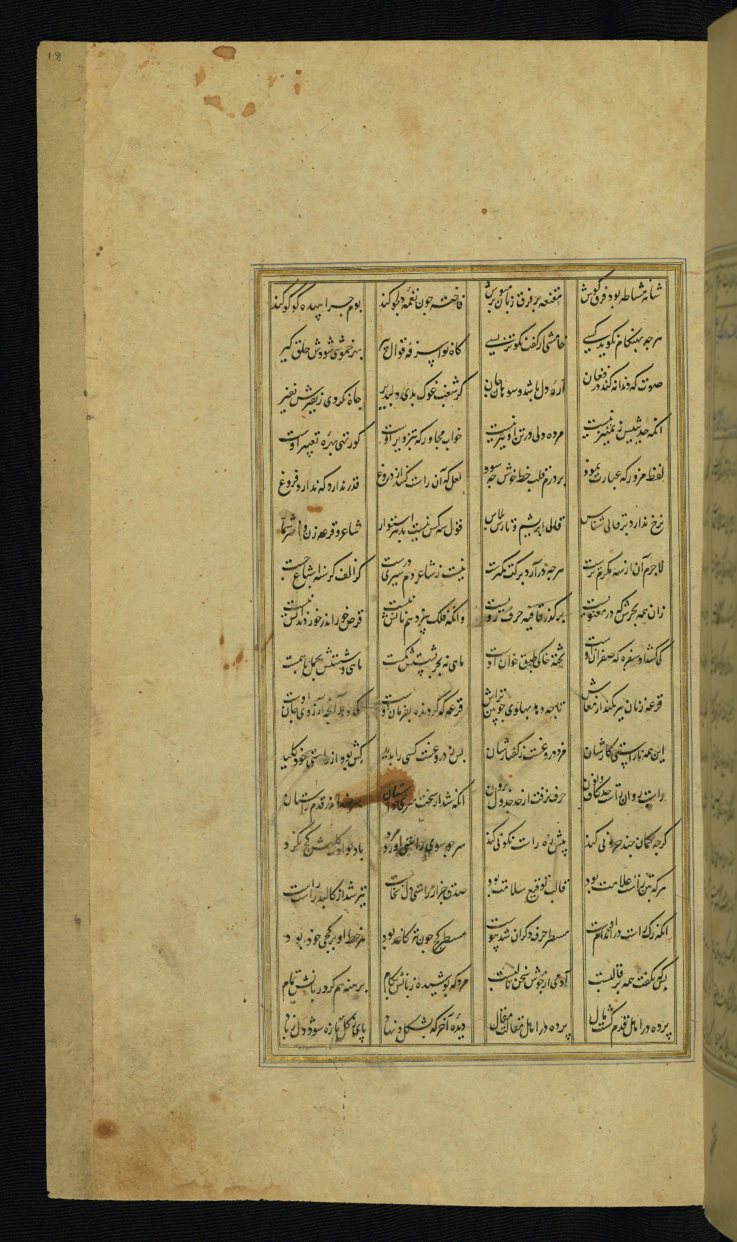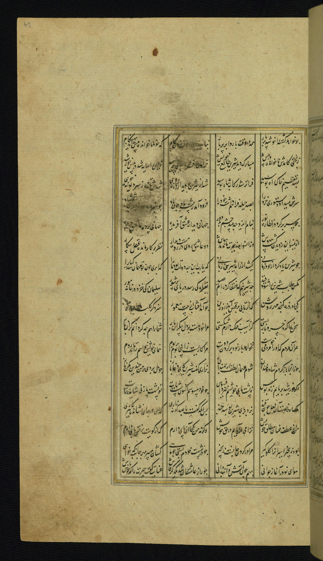 This is an illustrated and illuminated Safavid copy of the Khamsah (quintet) of Amīr Khusraw Dihlavī (d. 725 AH / 1325 CE), written by Pīr Ḥusayn al-Kātib al-Shīrāzī in 935 AH / 1529 CE. The codex opens with a double-page illuminated frontispiece with verses in honor of the poet Mir (Amir) Khusraw (fols. 1b-2a). There are four illuminated incipit pages introducing the individual poems, and thirteen paintings illustrate the text. The lacquer binding, which is not original to the manuscript, has a hunting scene on the upper and lower boards. The lower board is inscribed yā Shāh Najaf (oh, King of Najaf, i.e. ʿAlī) and is dated 1271 AH / 1854 CE.