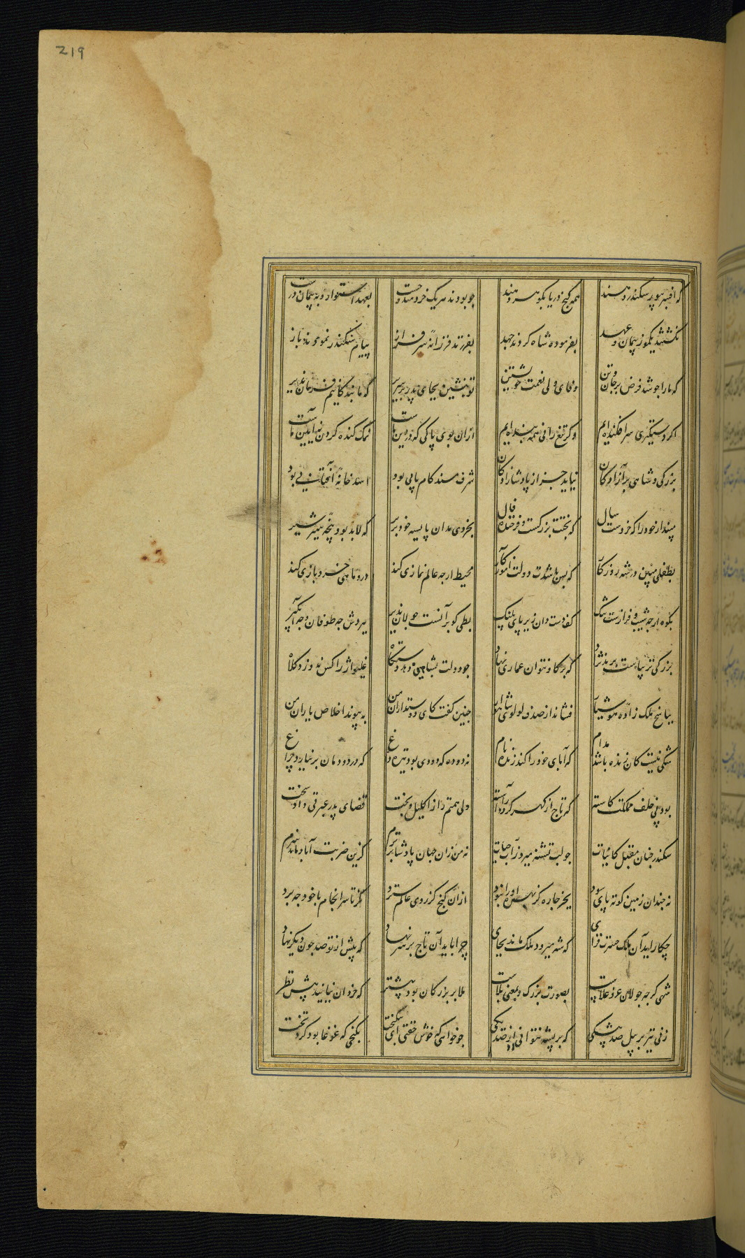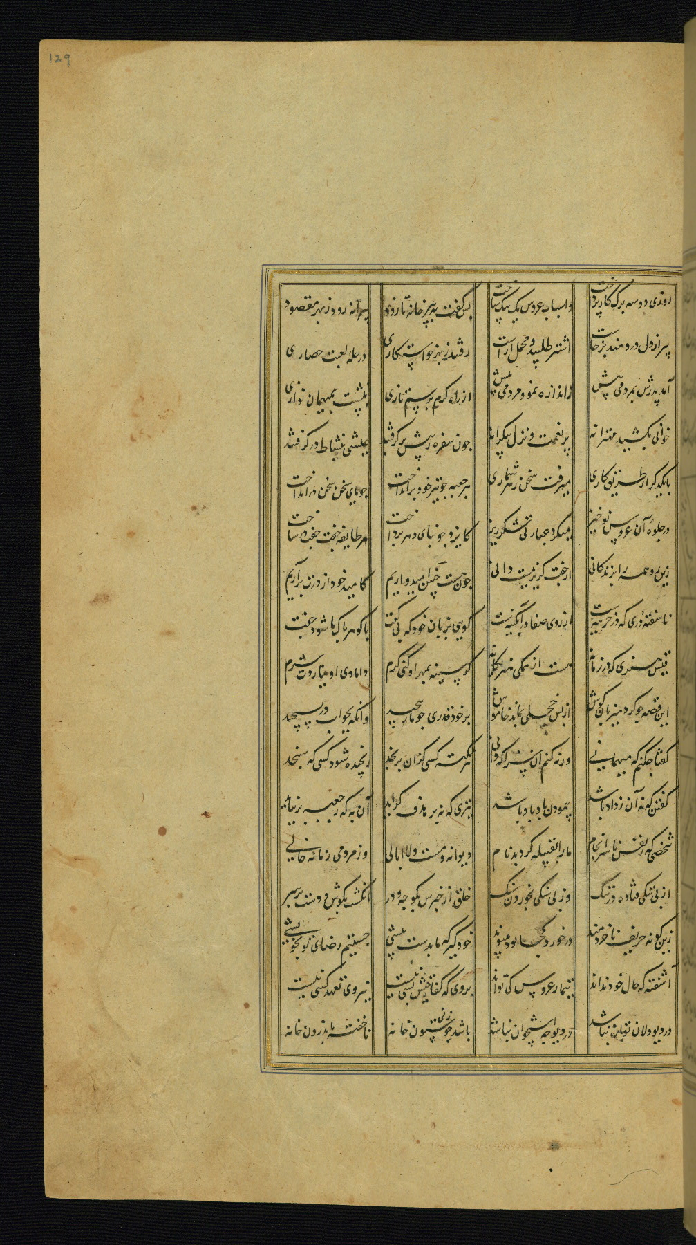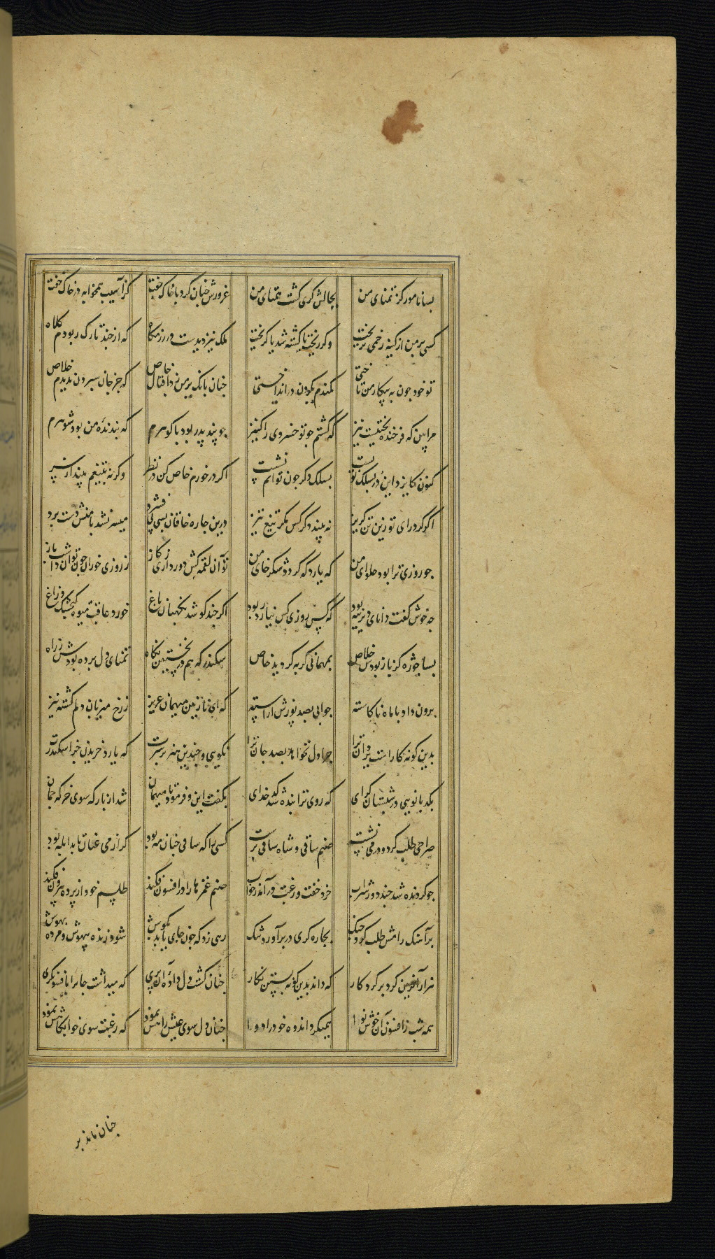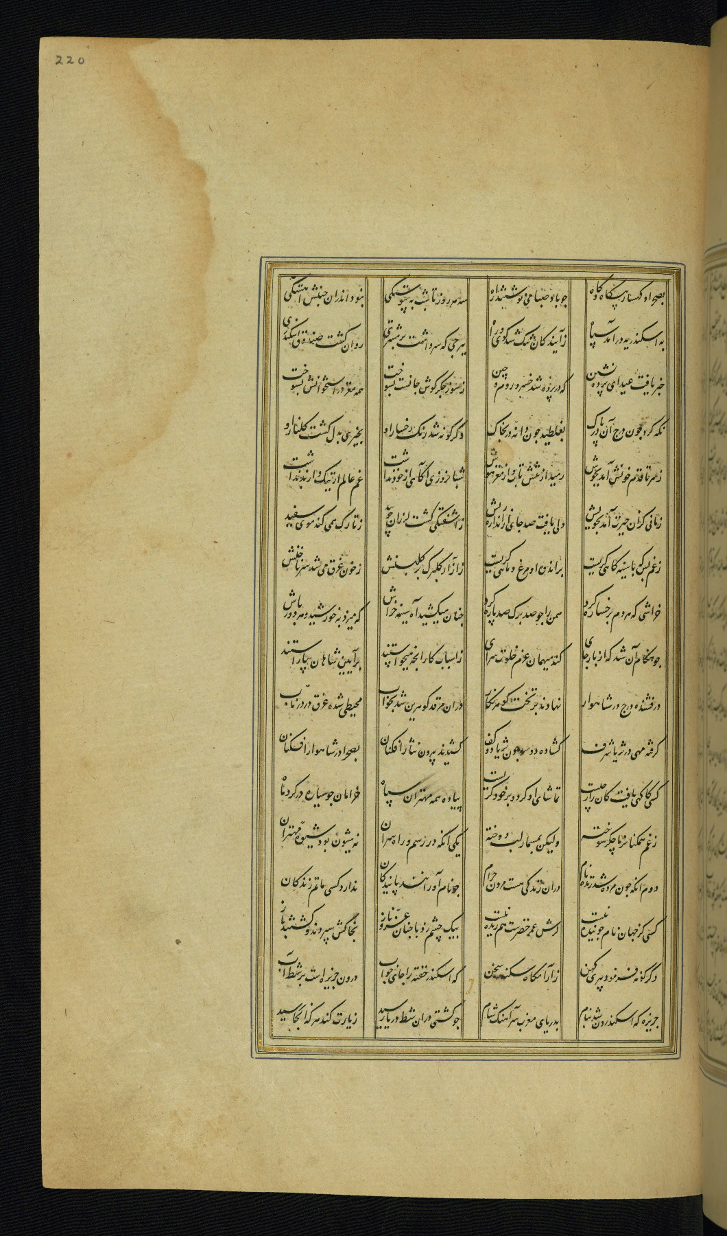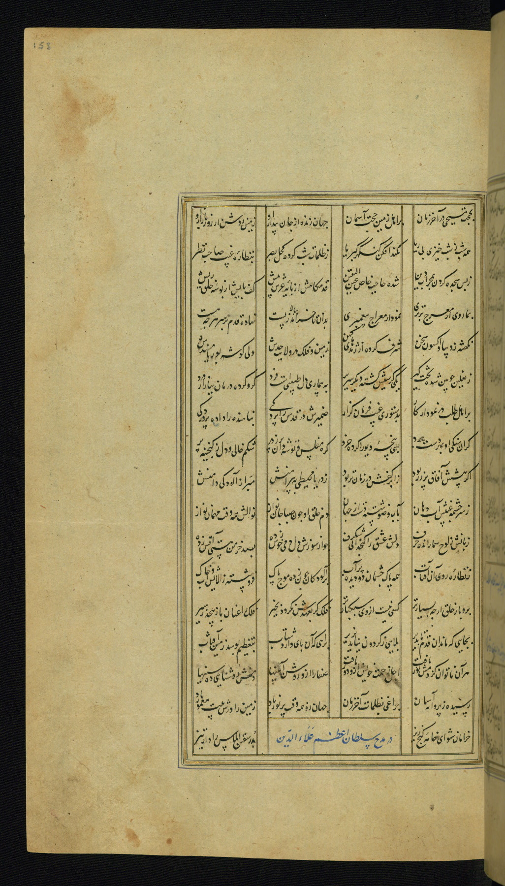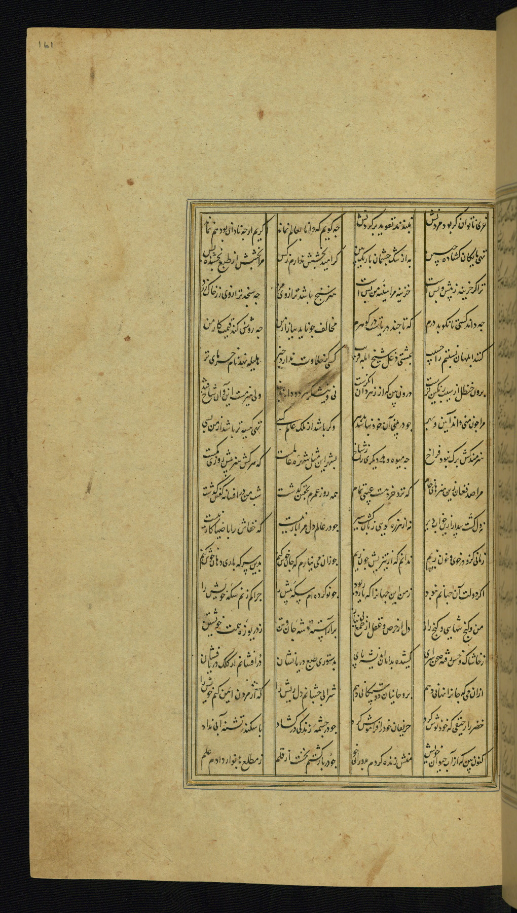 This is an illustrated and illuminated Safavid copy of the Khamsah (quintet) of Amīr Khusraw Dihlavī (d. 725 AH / 1325 CE), written by Pīr Ḥusayn al-Kātib al-Shīrāzī in 935 AH / 1529 CE. The codex opens with a double-page illuminated frontispiece with verses in honor of the poet Mir (Amir) Khusraw (fols. 1b-2a). There are four illuminated incipit pages introducing the individual poems, and thirteen paintings illustrate the text. The lacquer binding, which is not original to the manuscript, has a hunting scene on the upper and lower boards. The lower board is inscribed yā Shāh Najaf (oh, King of Najaf, i.e. ʿAlī) and is dated 1271 AH / 1854 CE.